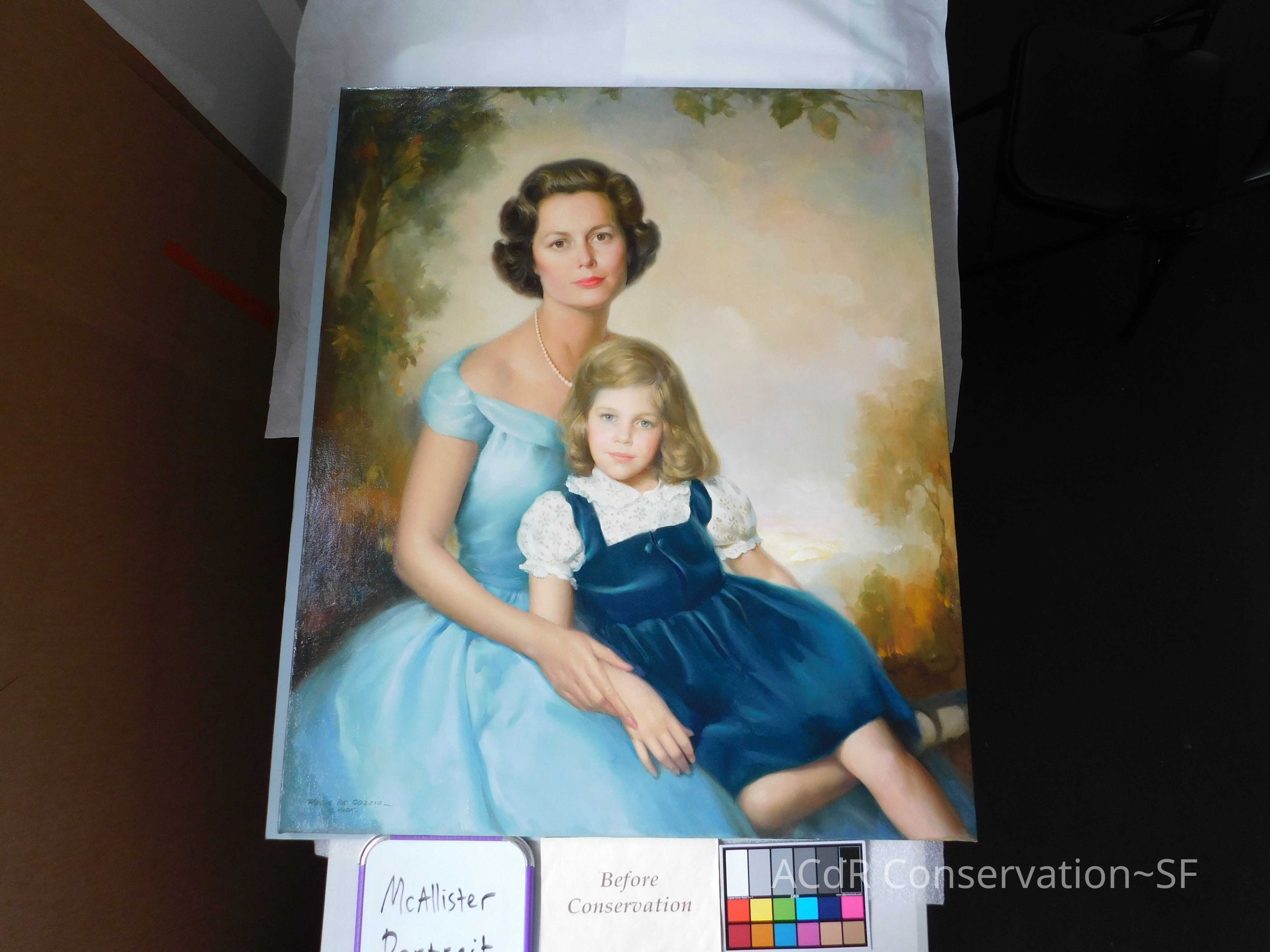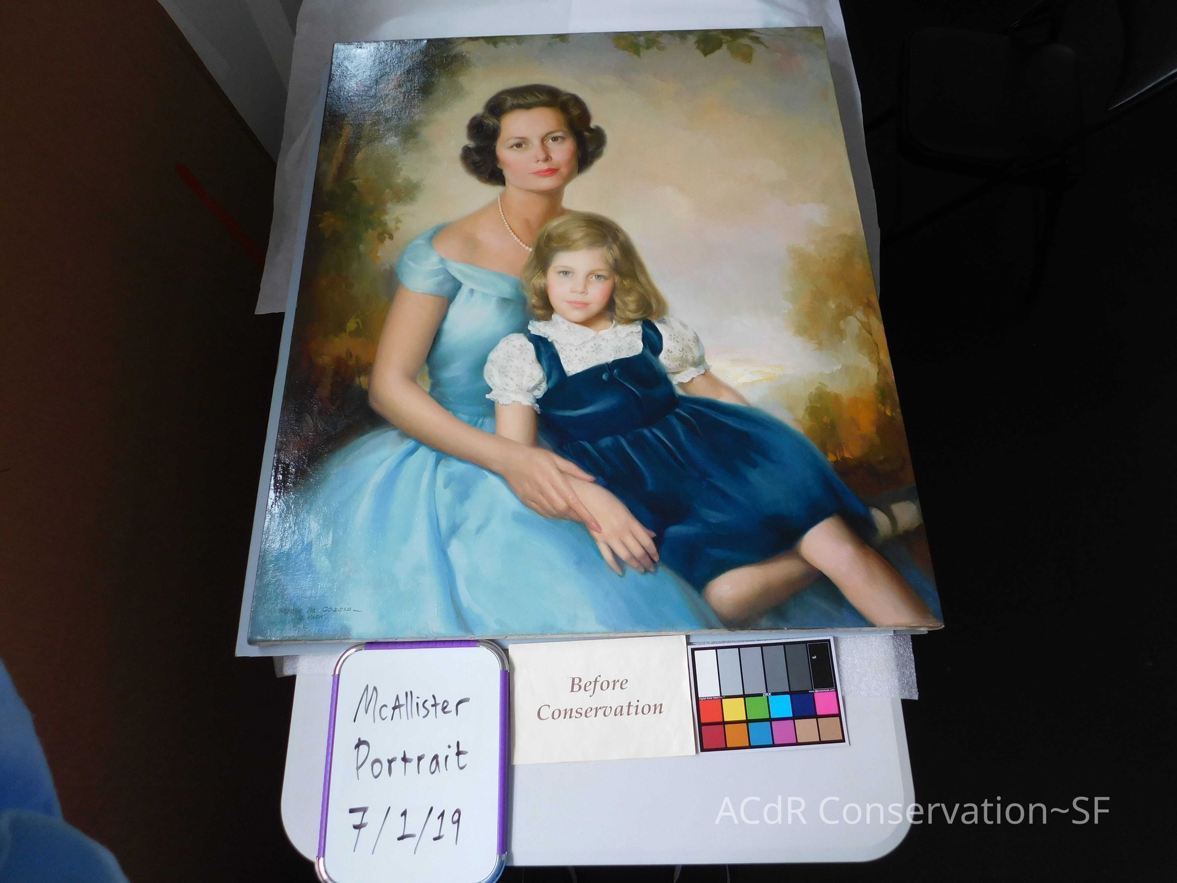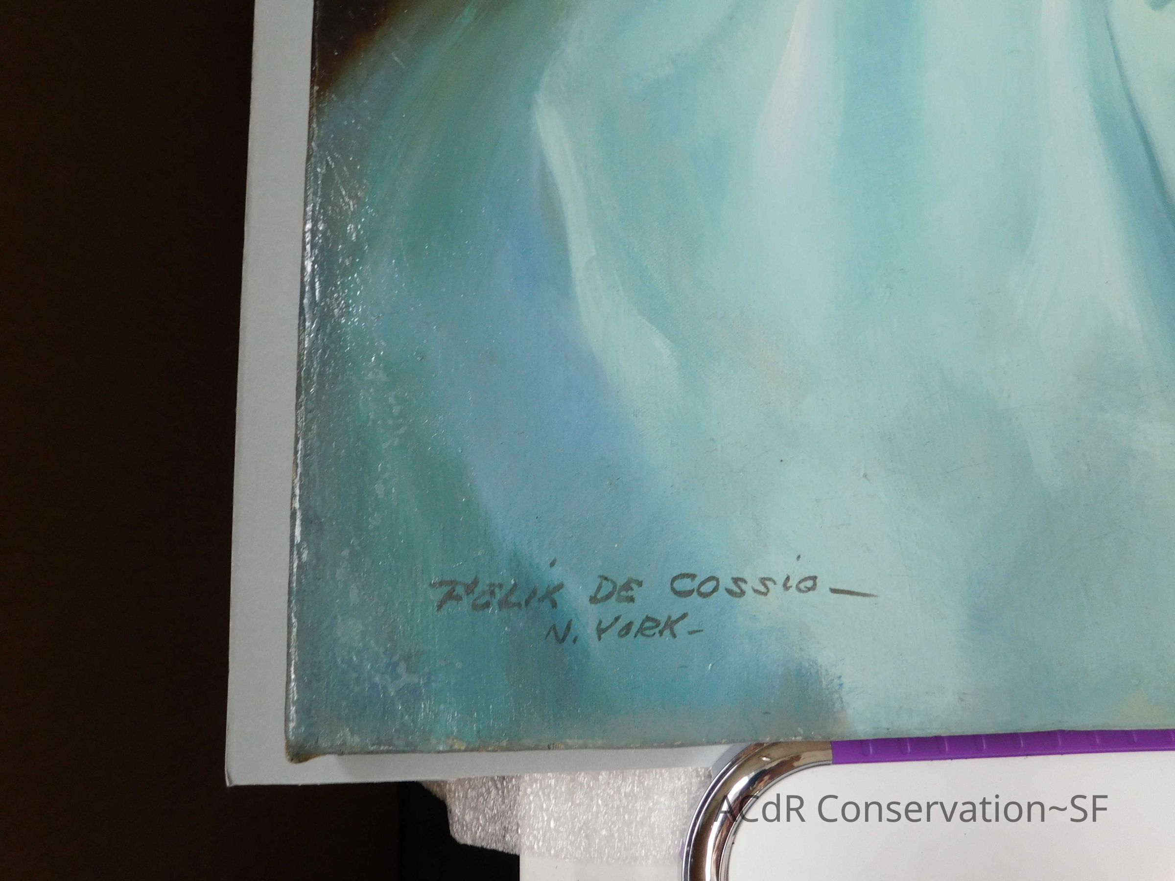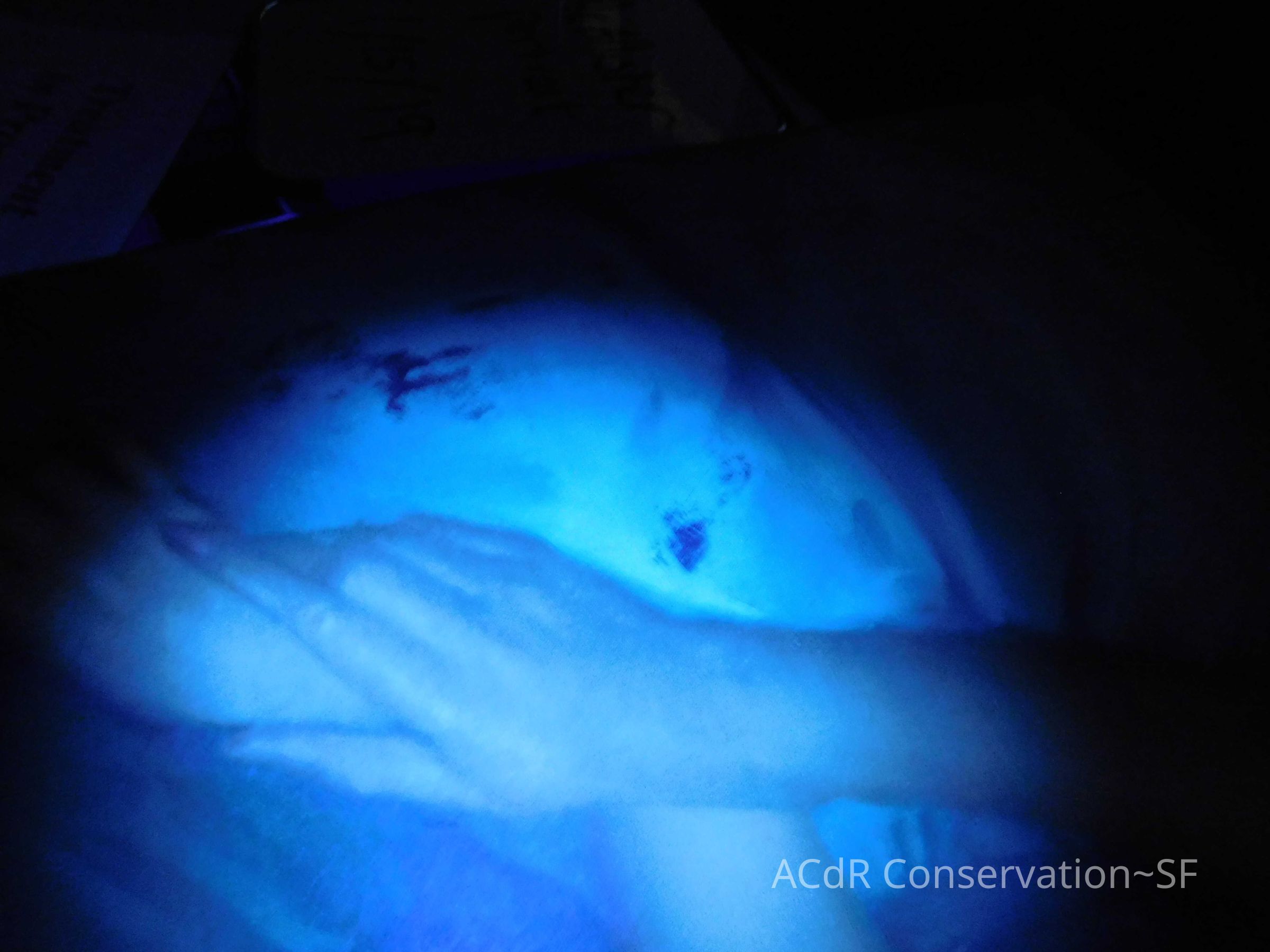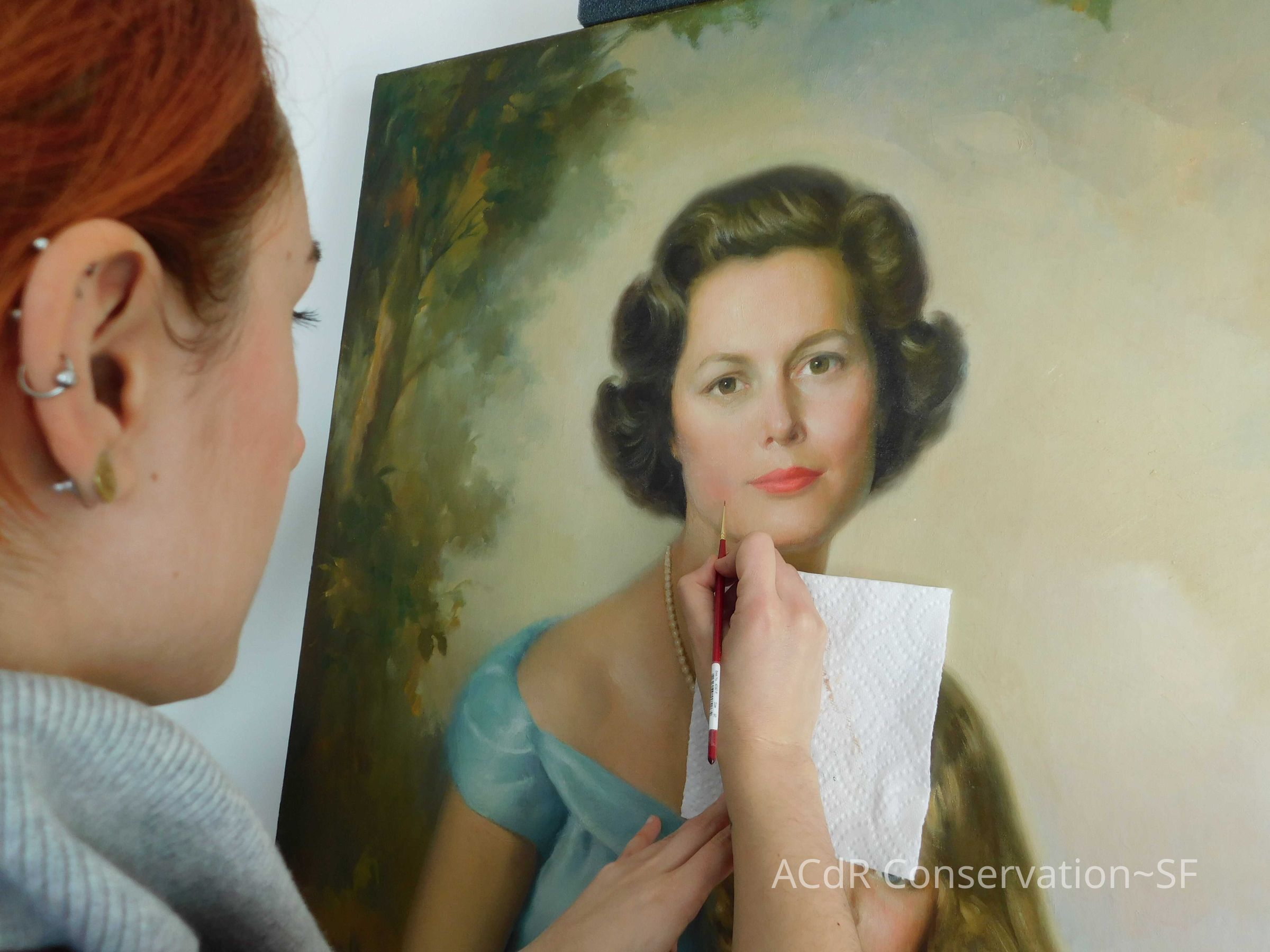 Testing and beginning varnish removal, starting at bottom right corner and moving along bottom edge. Using Naptha, 1/5th of glossy varnish removed. Blue color coming away on swabs confirmed to be due to varnish rather than pigment lifting (did not come up blue on child’s legs). Blue areas still sensitive and susceptible, so being quick in application. Finished varnish removal; reconsolidated cracks in mother’s left arm/child’s right cheek.