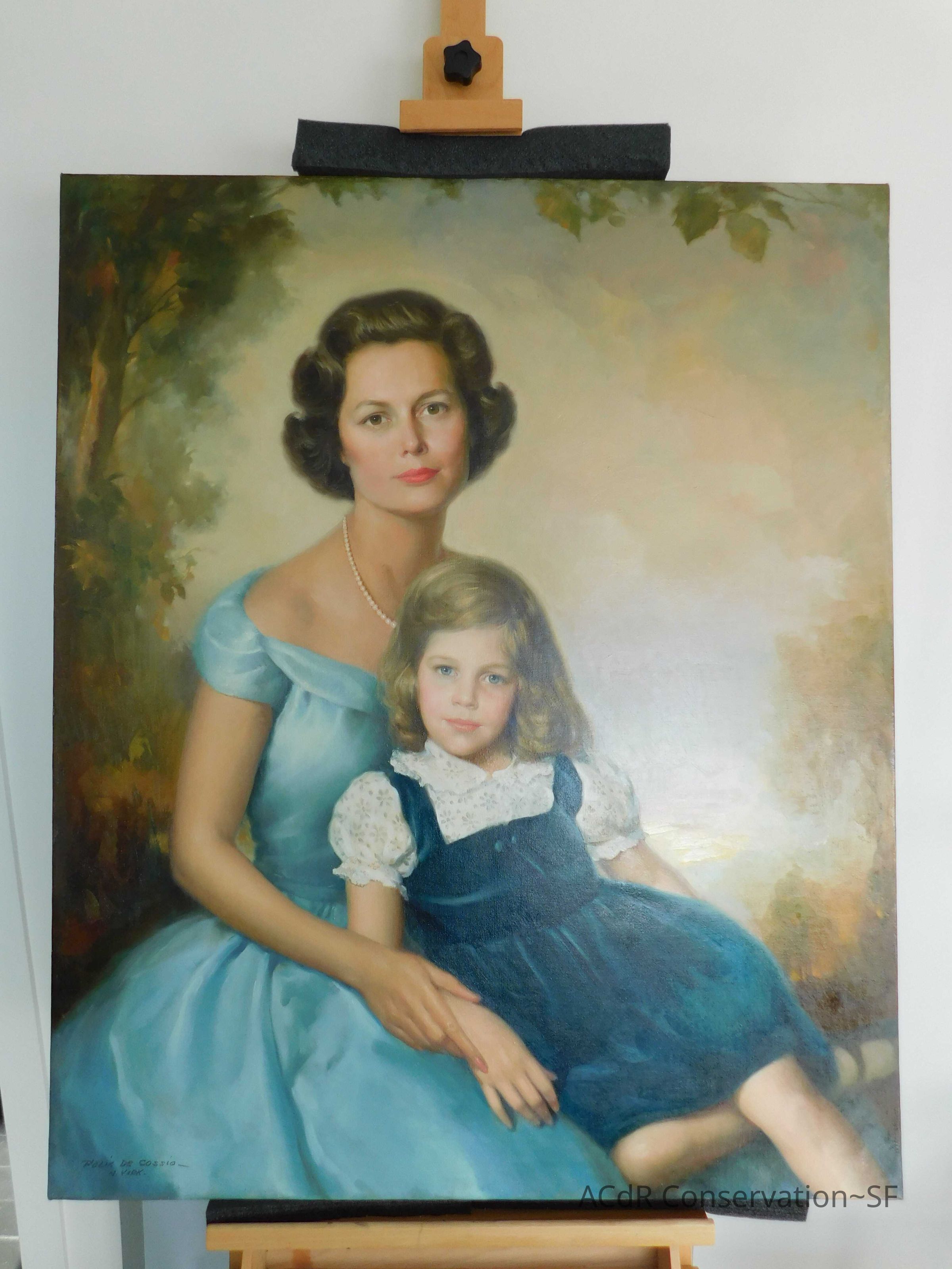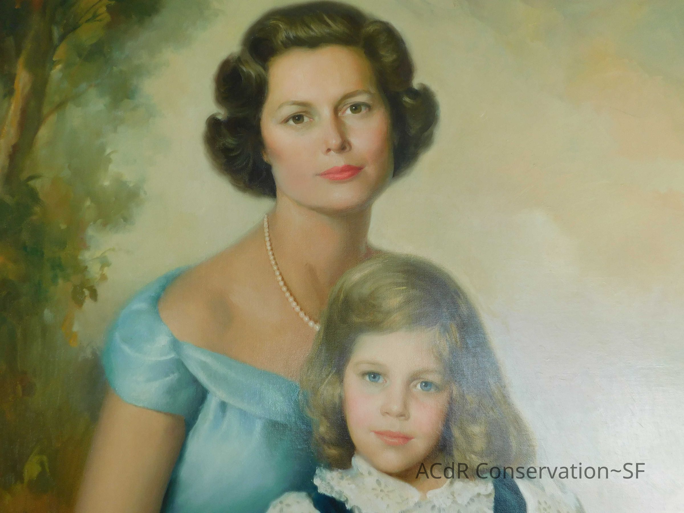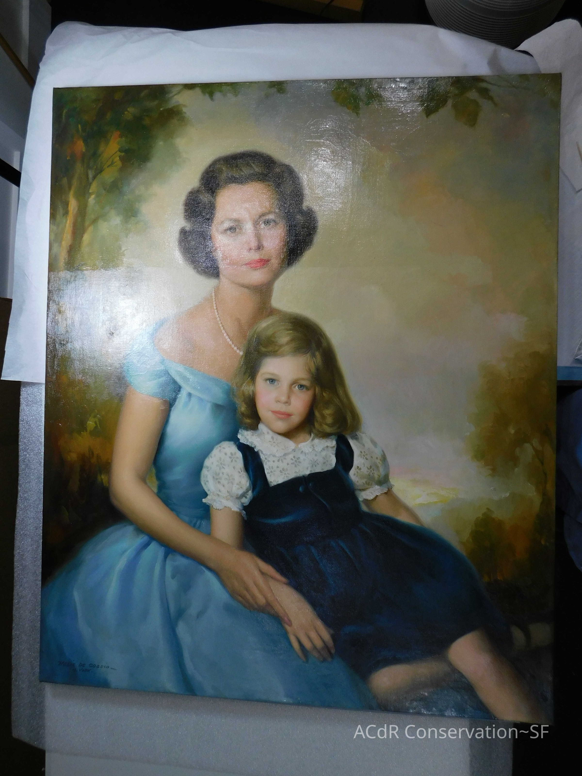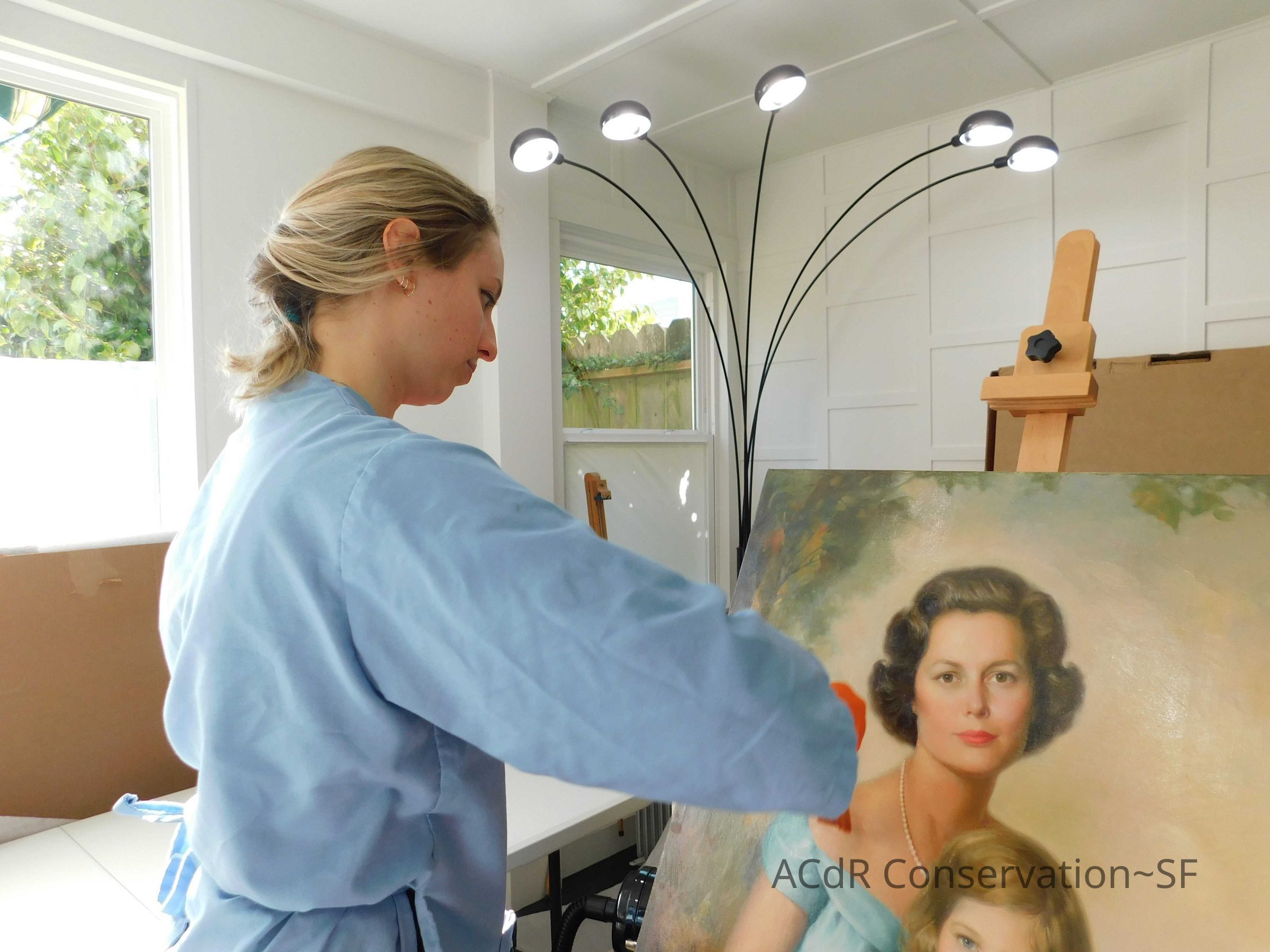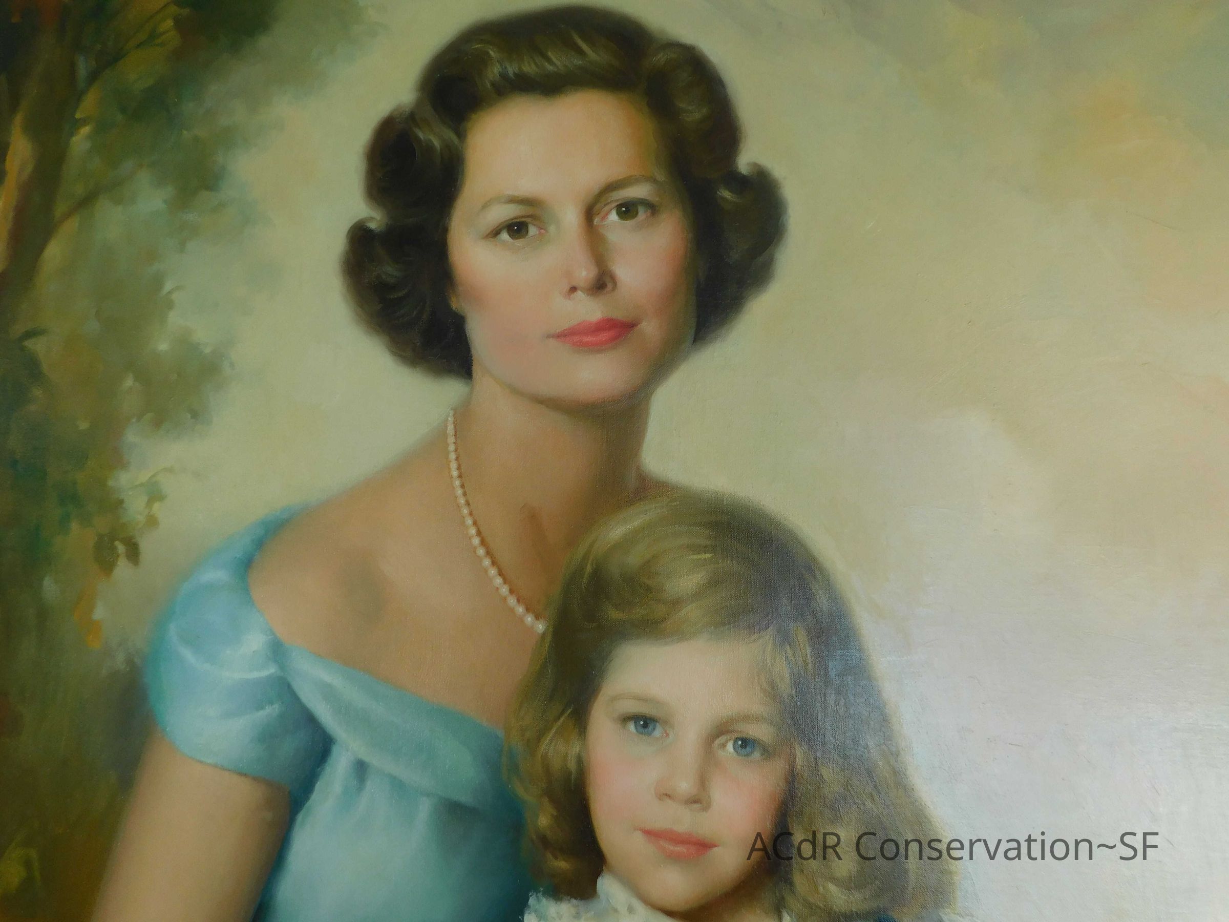Testing and beginning varnish removal, starting at bottom right corner and moving along bottom edge. Using Naptha, 1/5th of glossy varnish removed. Blue color coming away on swabs confirmed to be due to varnish rather than pigment lifting (did not come up blue on child’s legs). Blue areas still sensitive and susceptible, so being quick in application. Finished varnish removal; reconsolidated cracks in mother’s left arm/child’s right cheek.