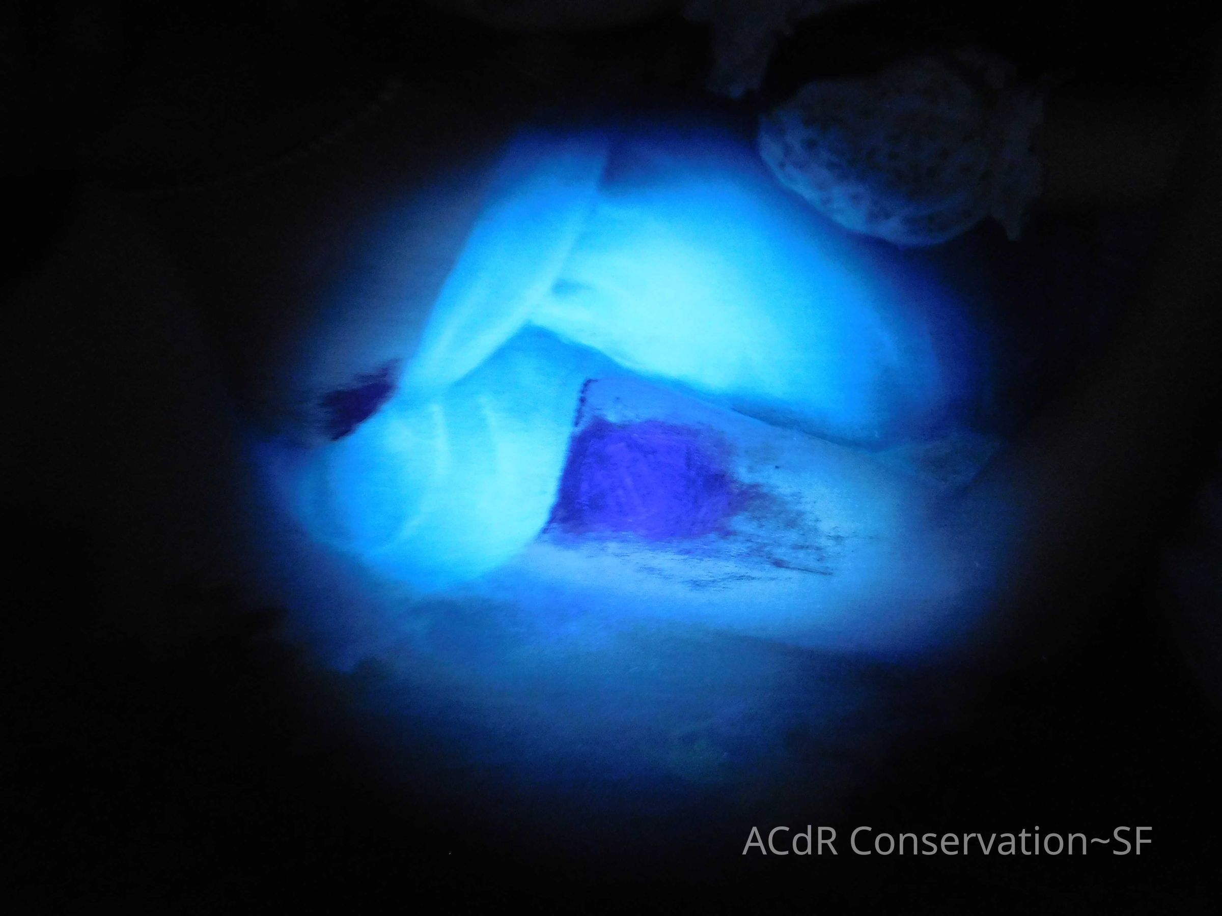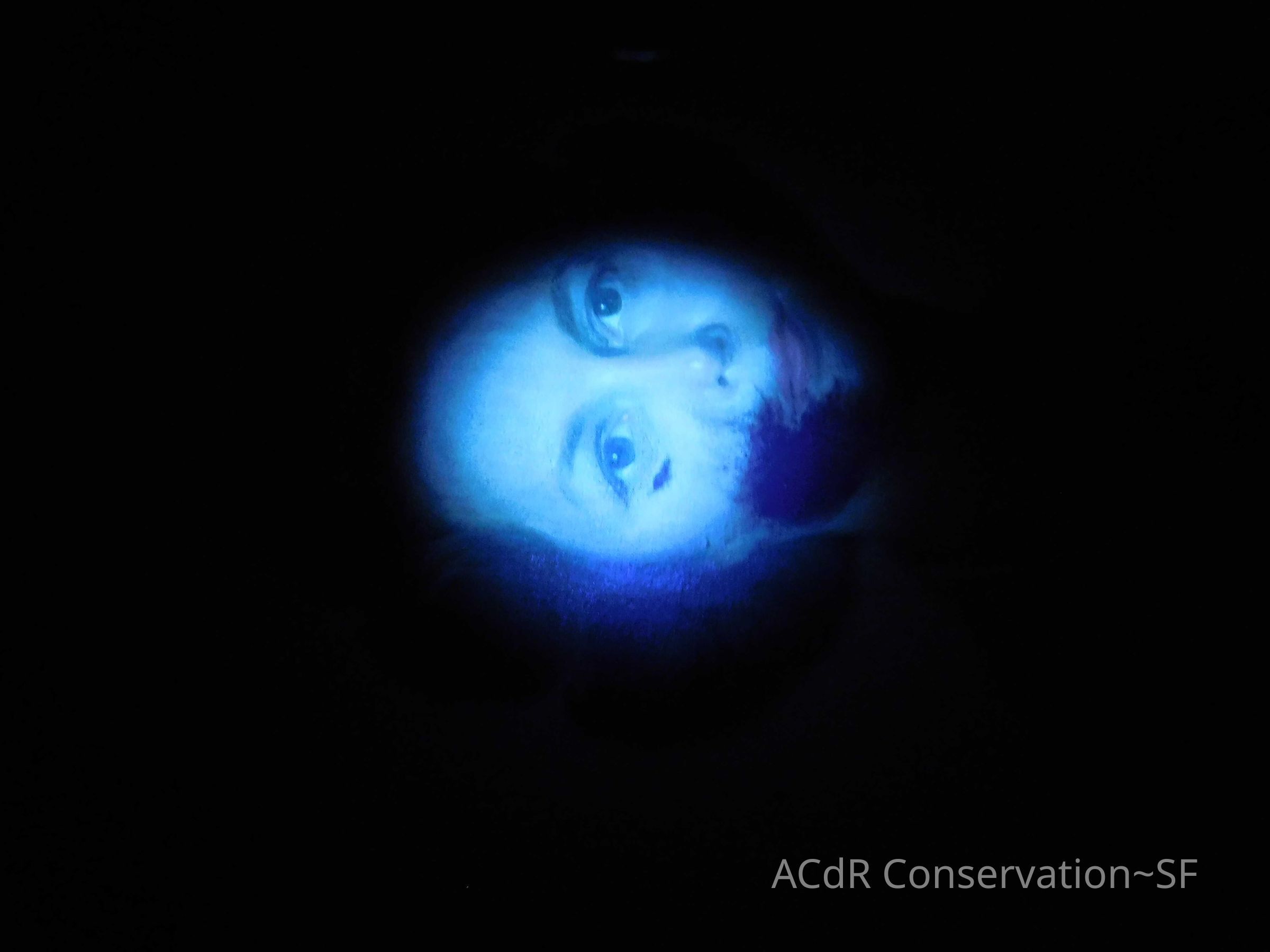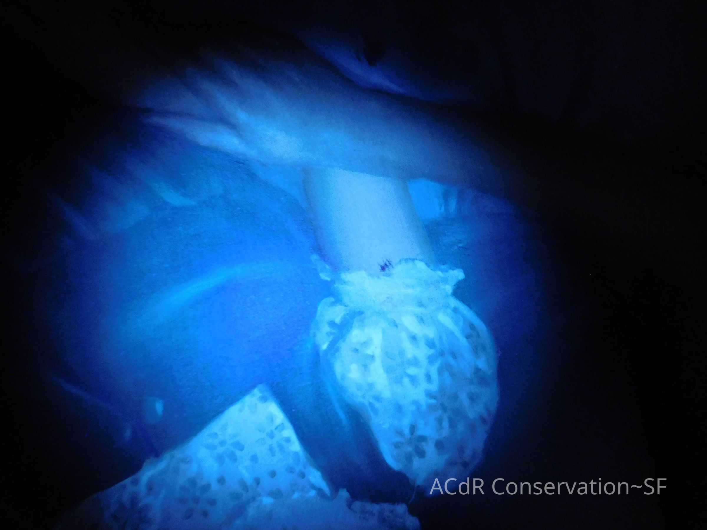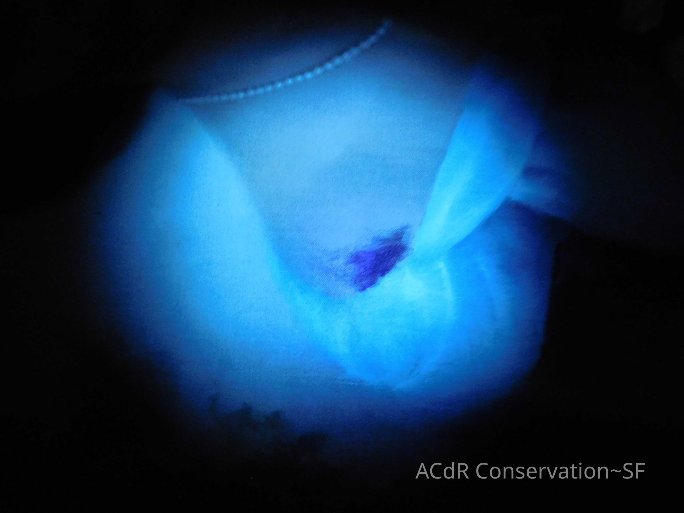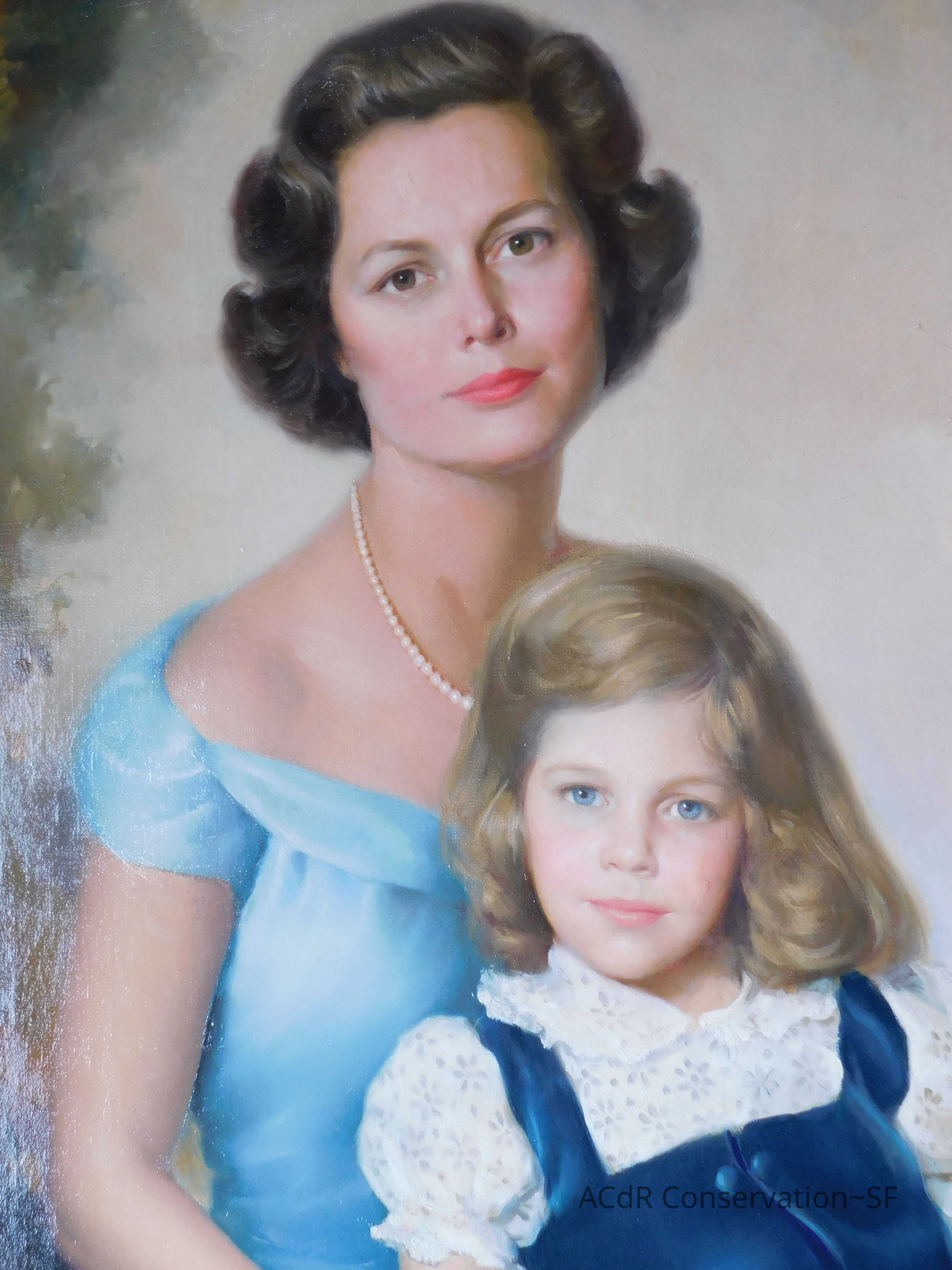 Testing and beginning varnish removal, starting at bottom right corner and moving along bottom edge. Using Naptha, 1/5th of glossy varnish removed. Blue color coming away on swabs confirmed to be due to varnish rather than pigment lifting (did not come up blue on child’s legs). Blue areas still sensitive and susceptible, so being quick in application. Finished varnish removal; reconsolidated cracks in mother’s left arm/child’s right cheek.