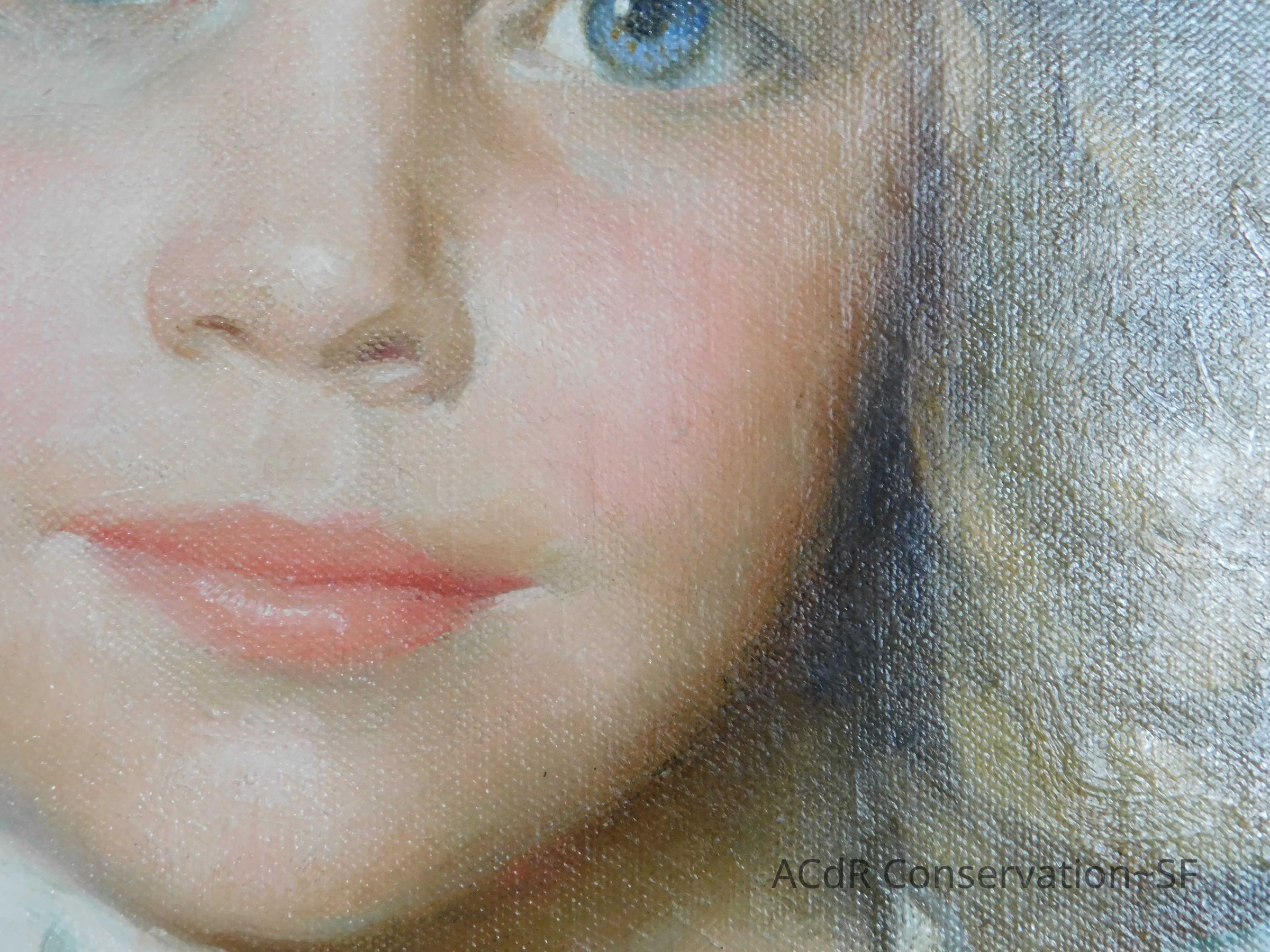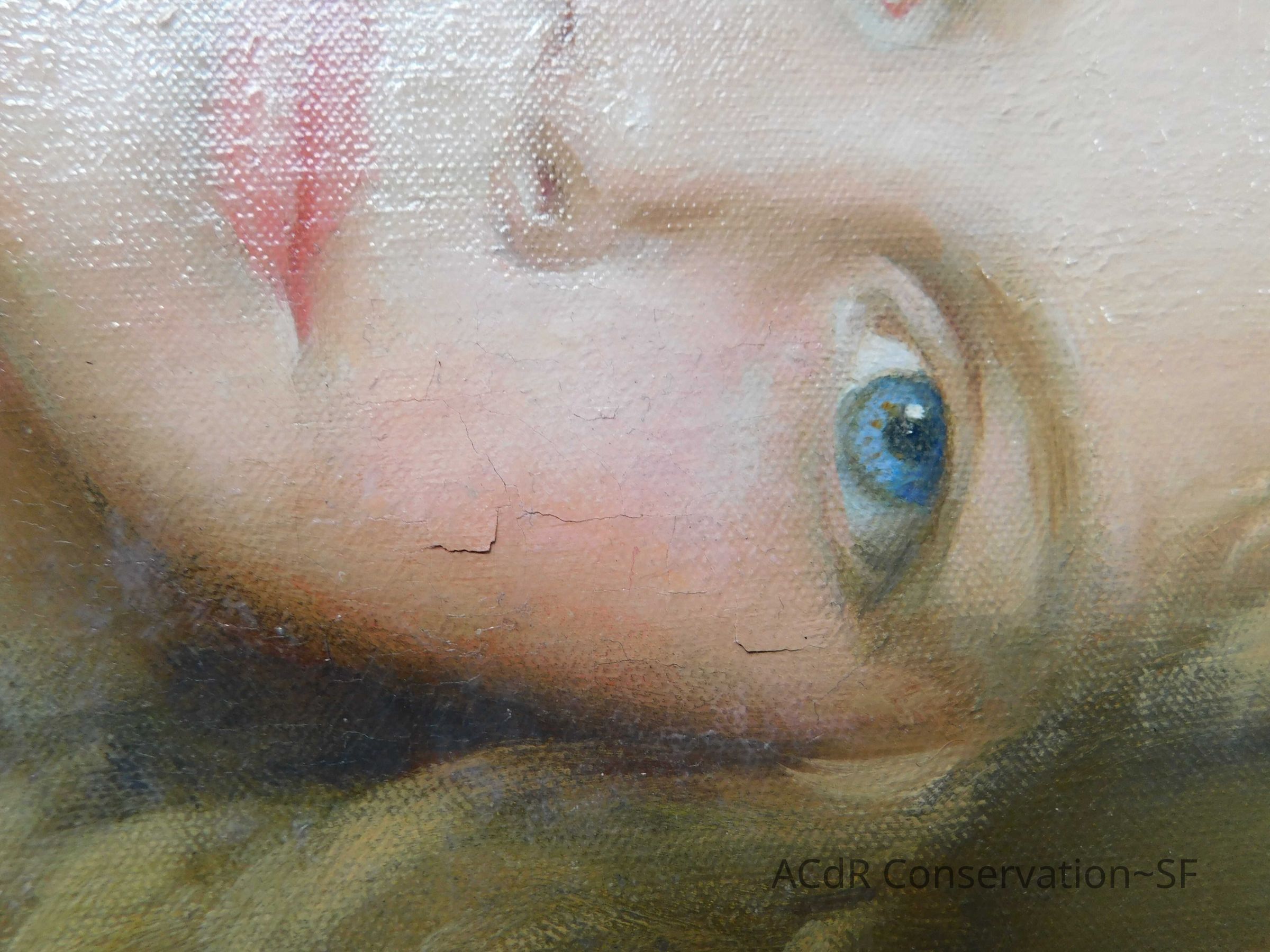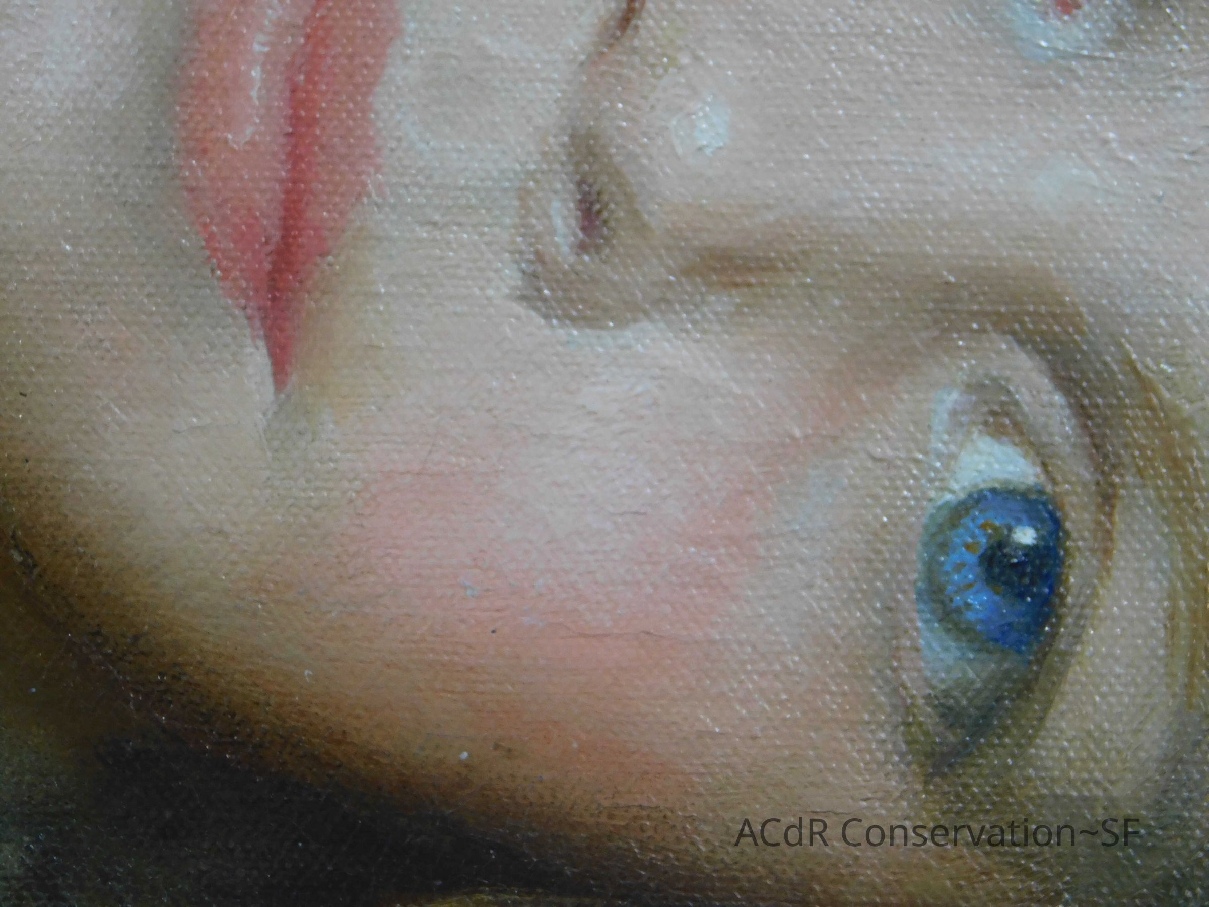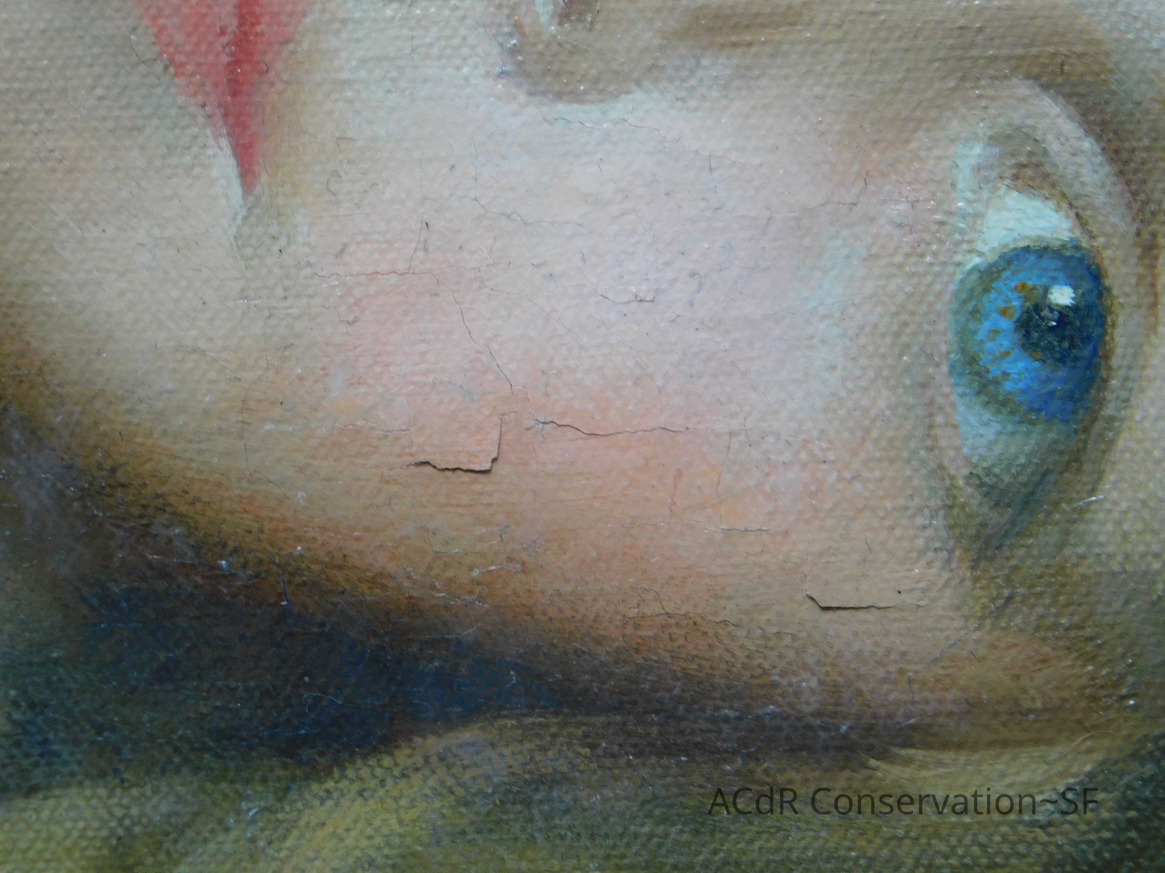 Photographs taken. Consolidations of lifting cracks in girl’s face using 3:1 Beva 371: Naptha, syringed into cracks and set with heat spatula to 150 degrees.