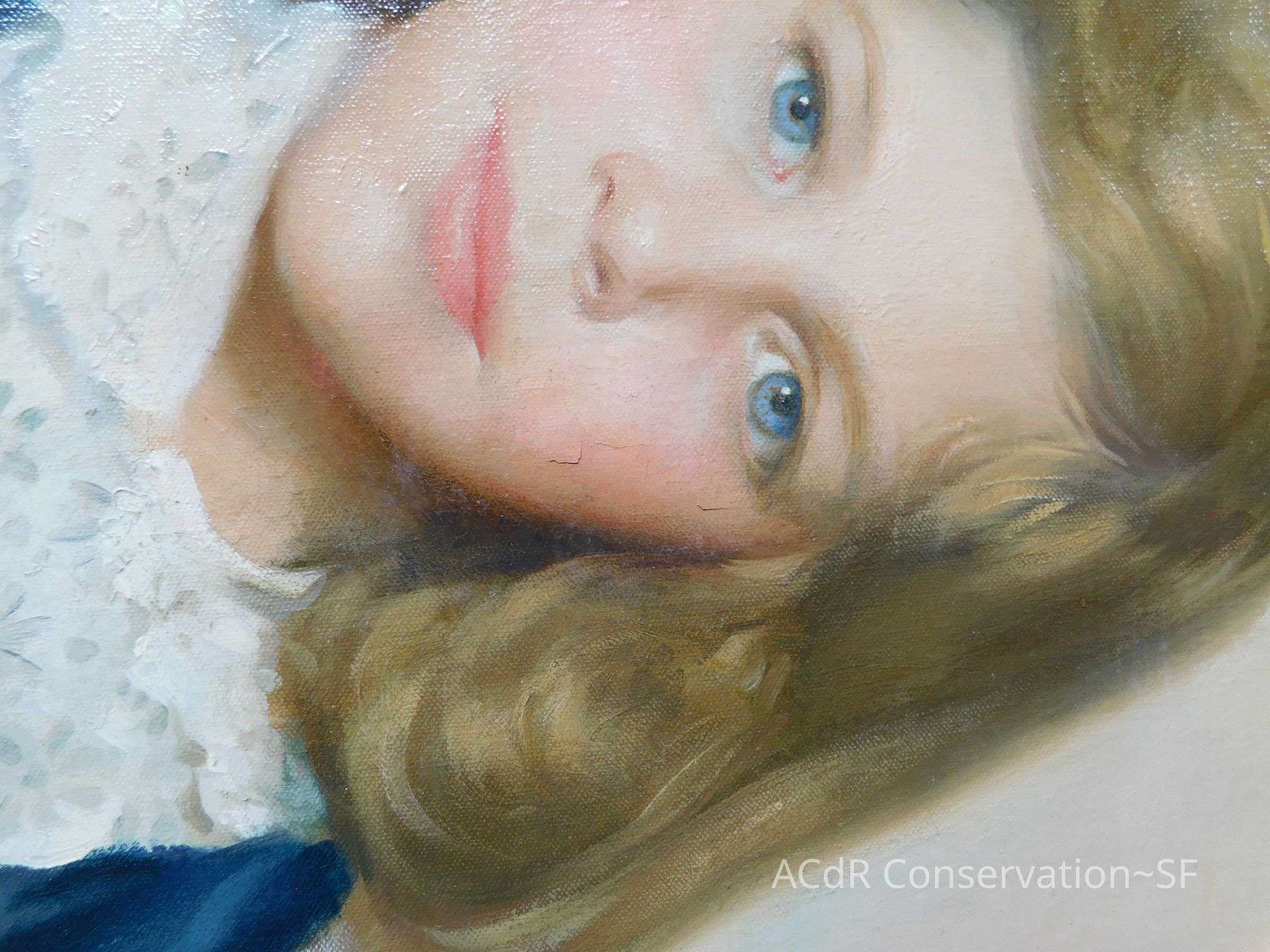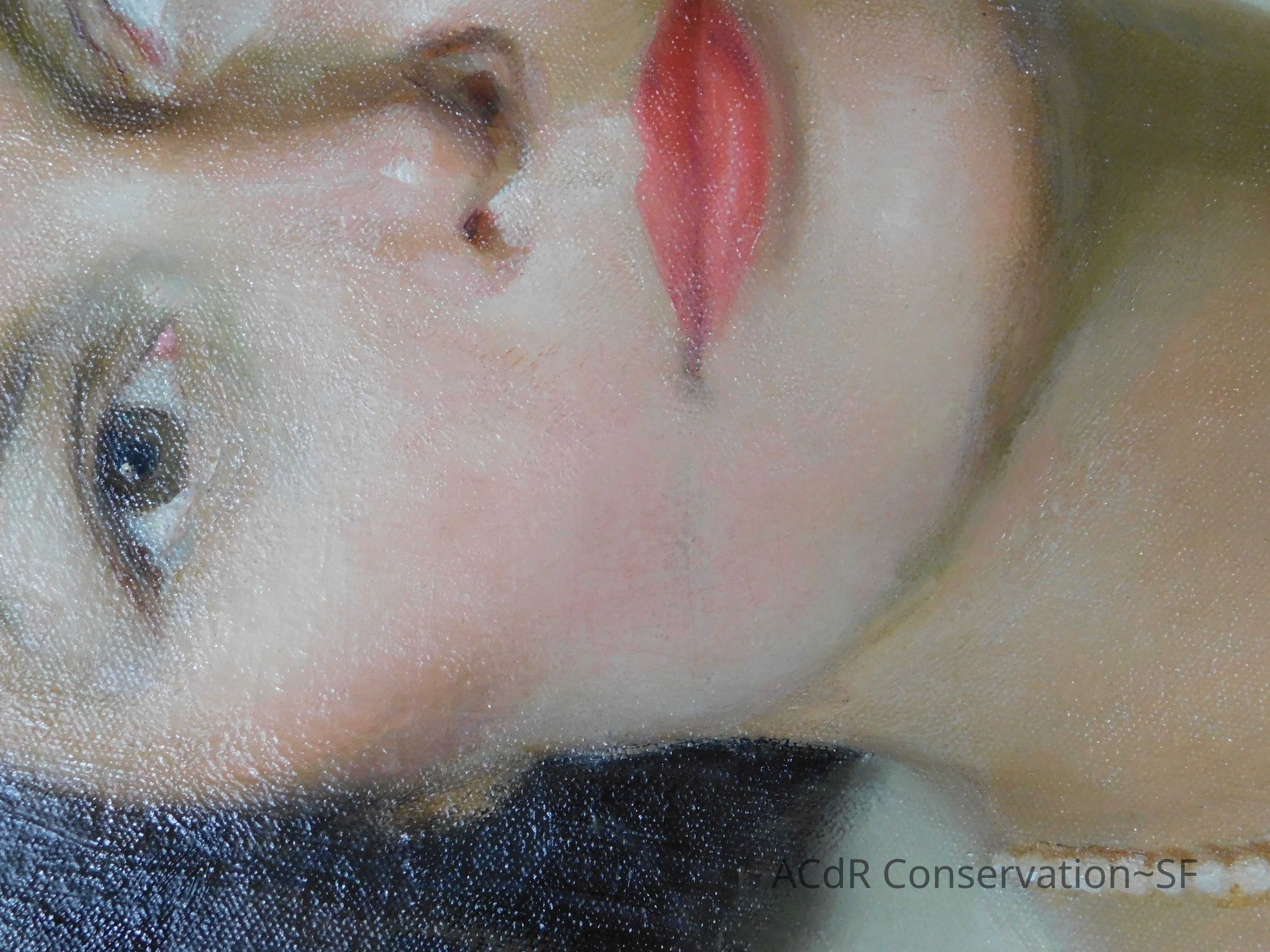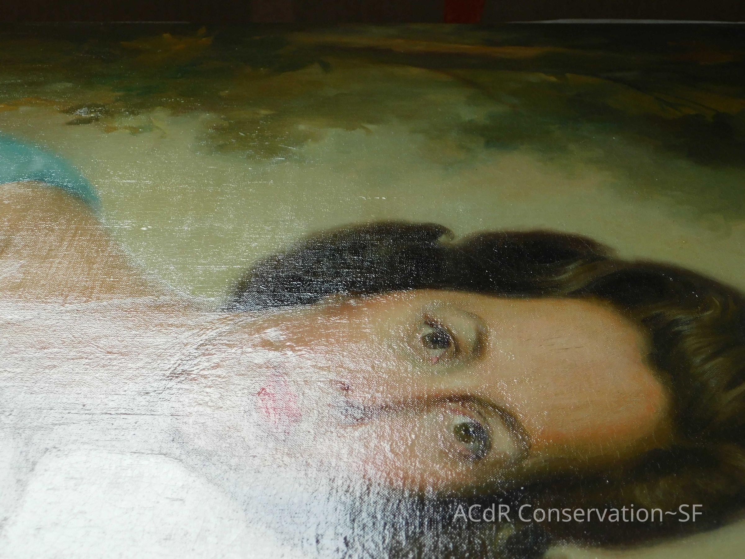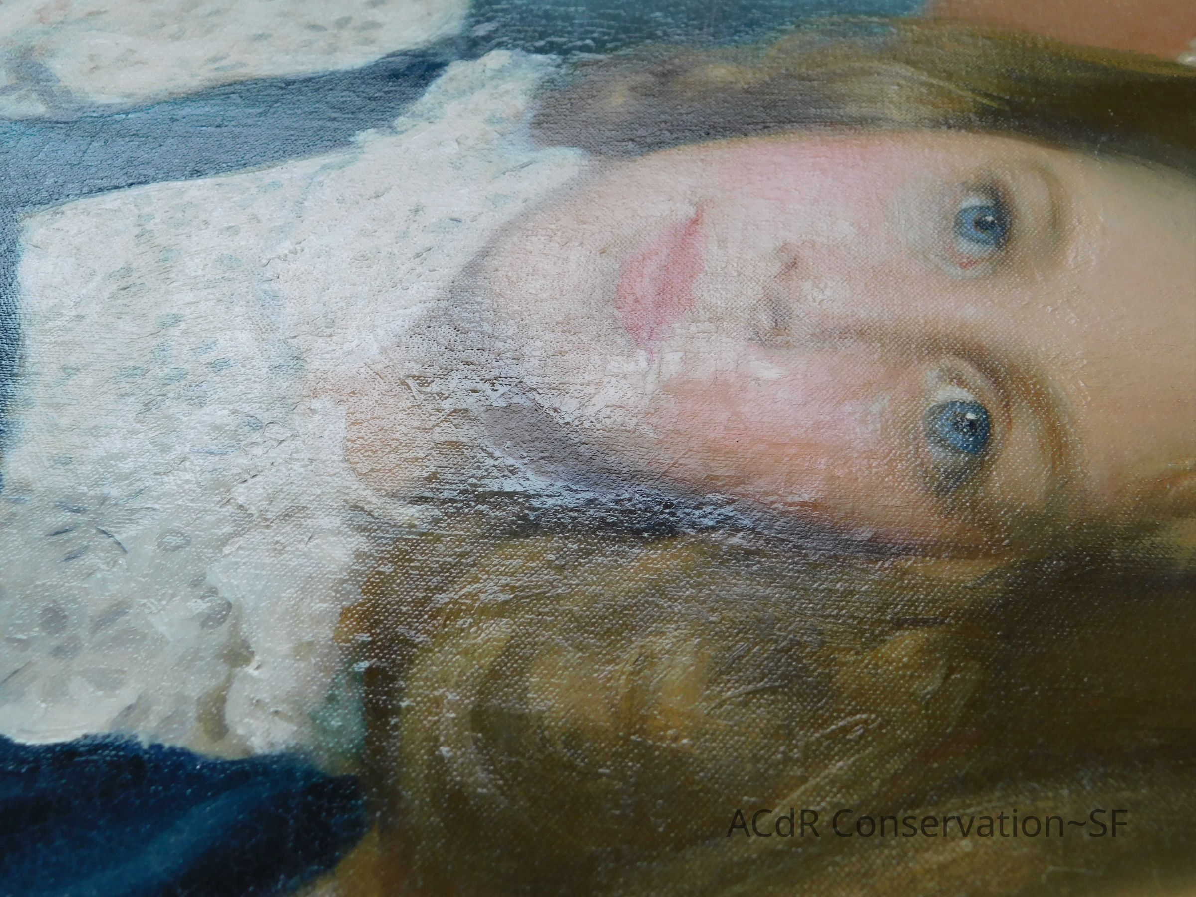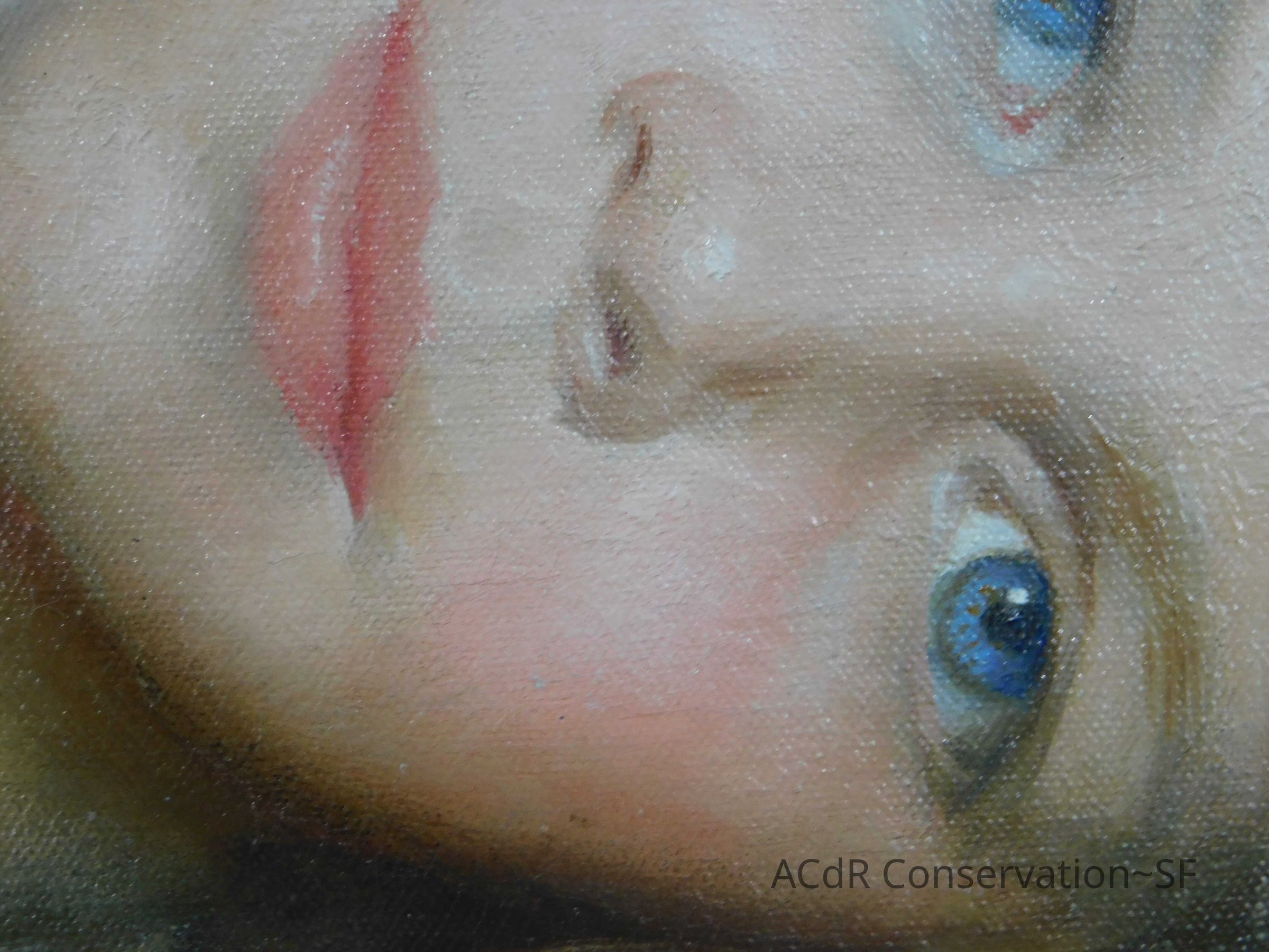 Photographs taken. Consolidations of lifting cracks in girl’s face using 3:1 Beva 371: Naptha, syringed into cracks and set with heat spatula to 150 degrees.