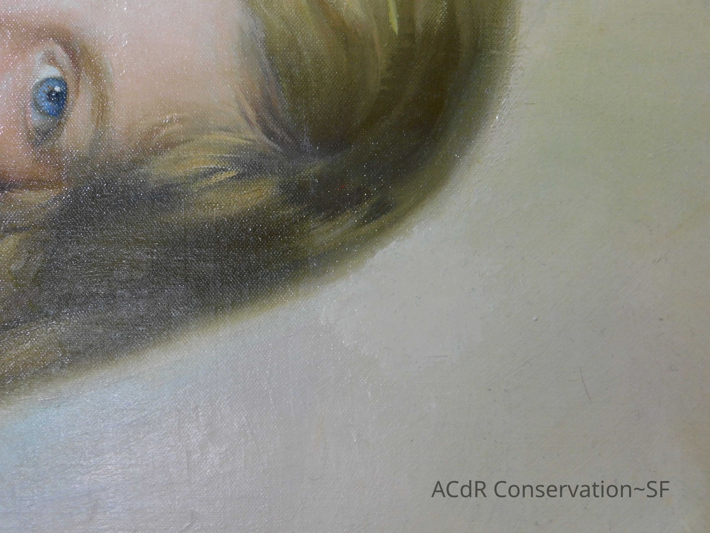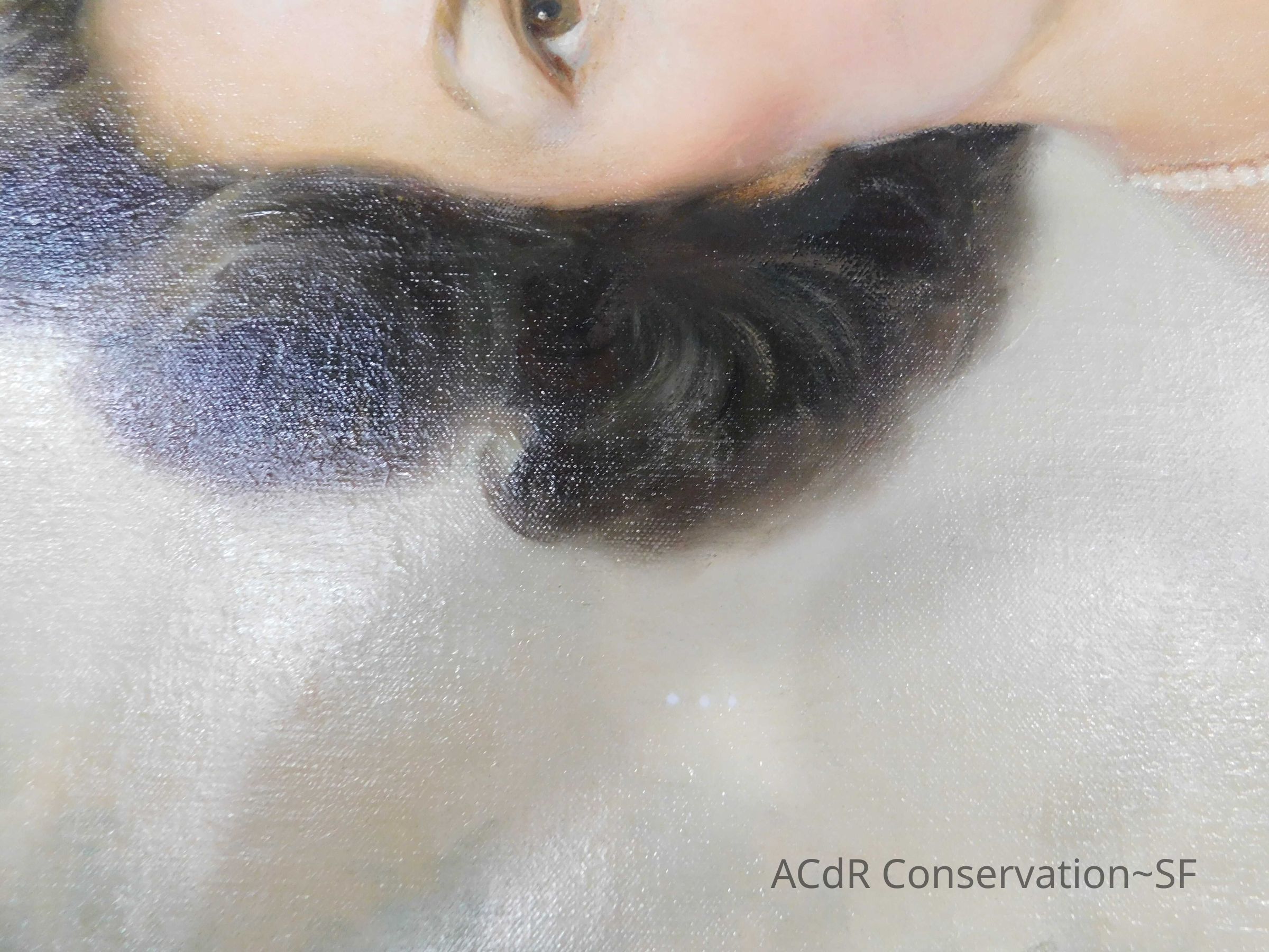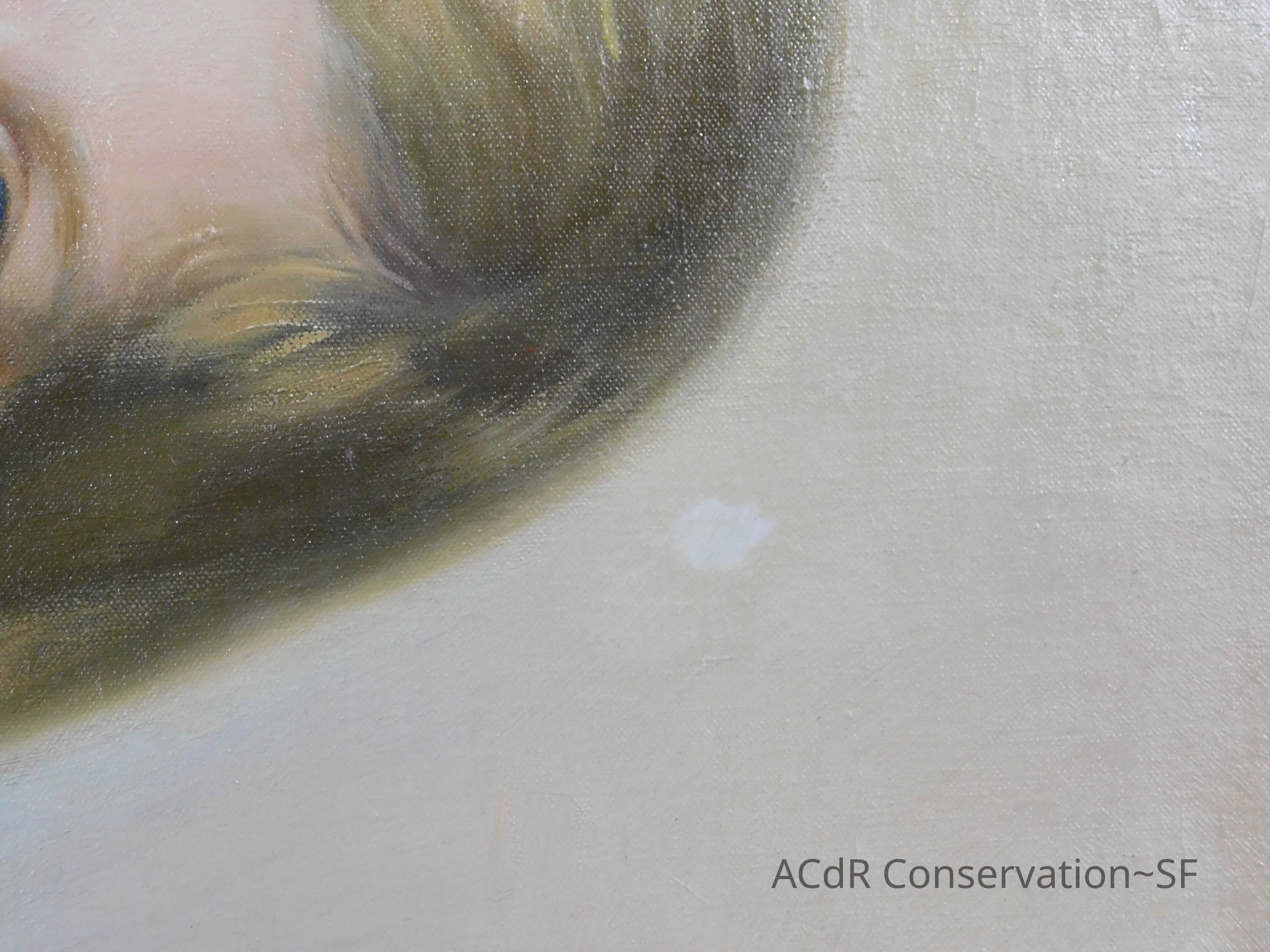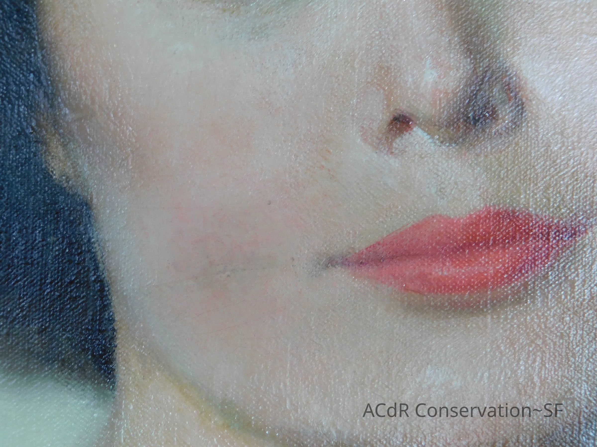 Photographs taken. Consolidations of lifting cracks in girl’s face using 3:1 Beva 371: Naptha, syringed into cracks and set with heat spatula to 150 degrees.