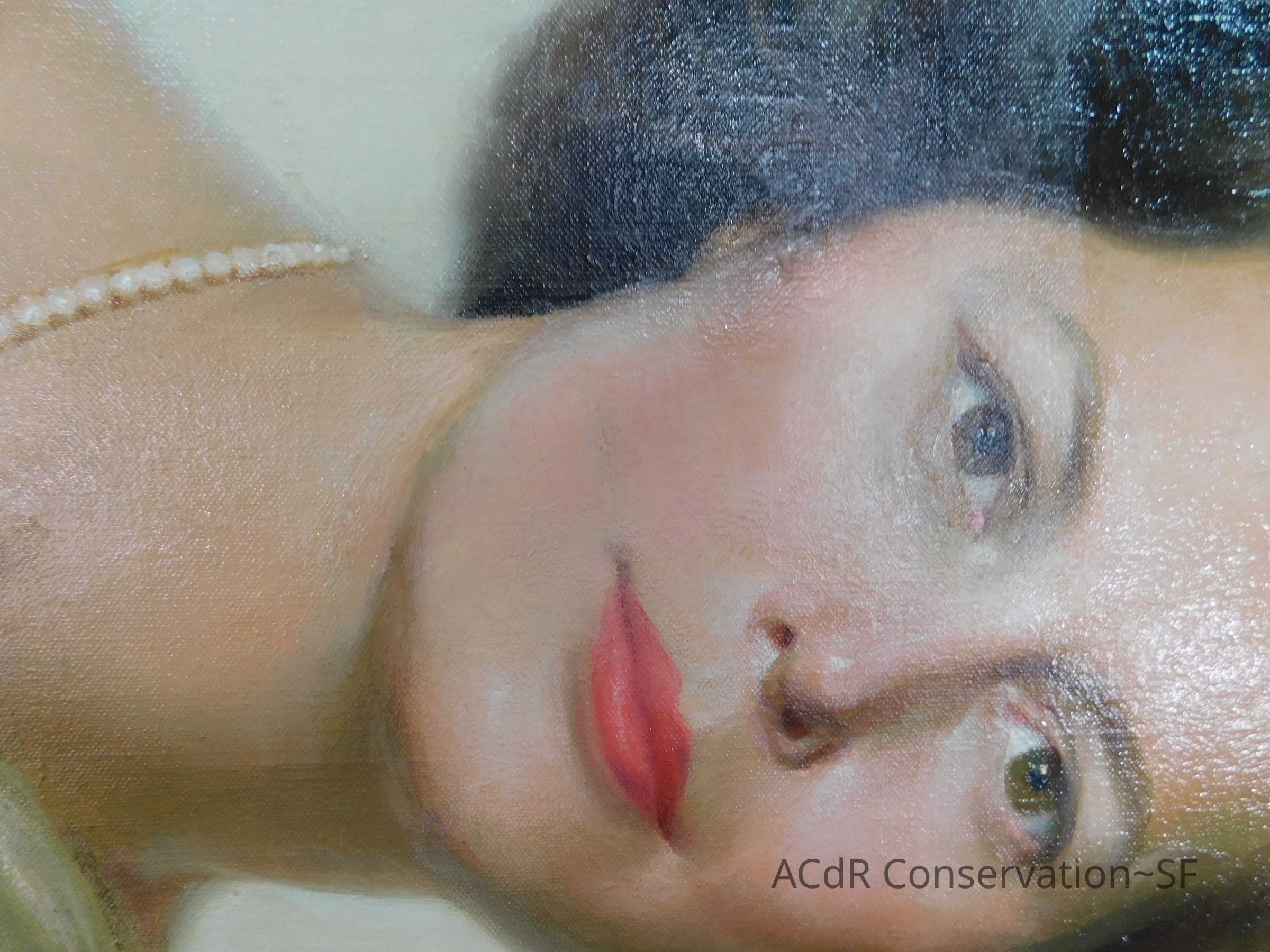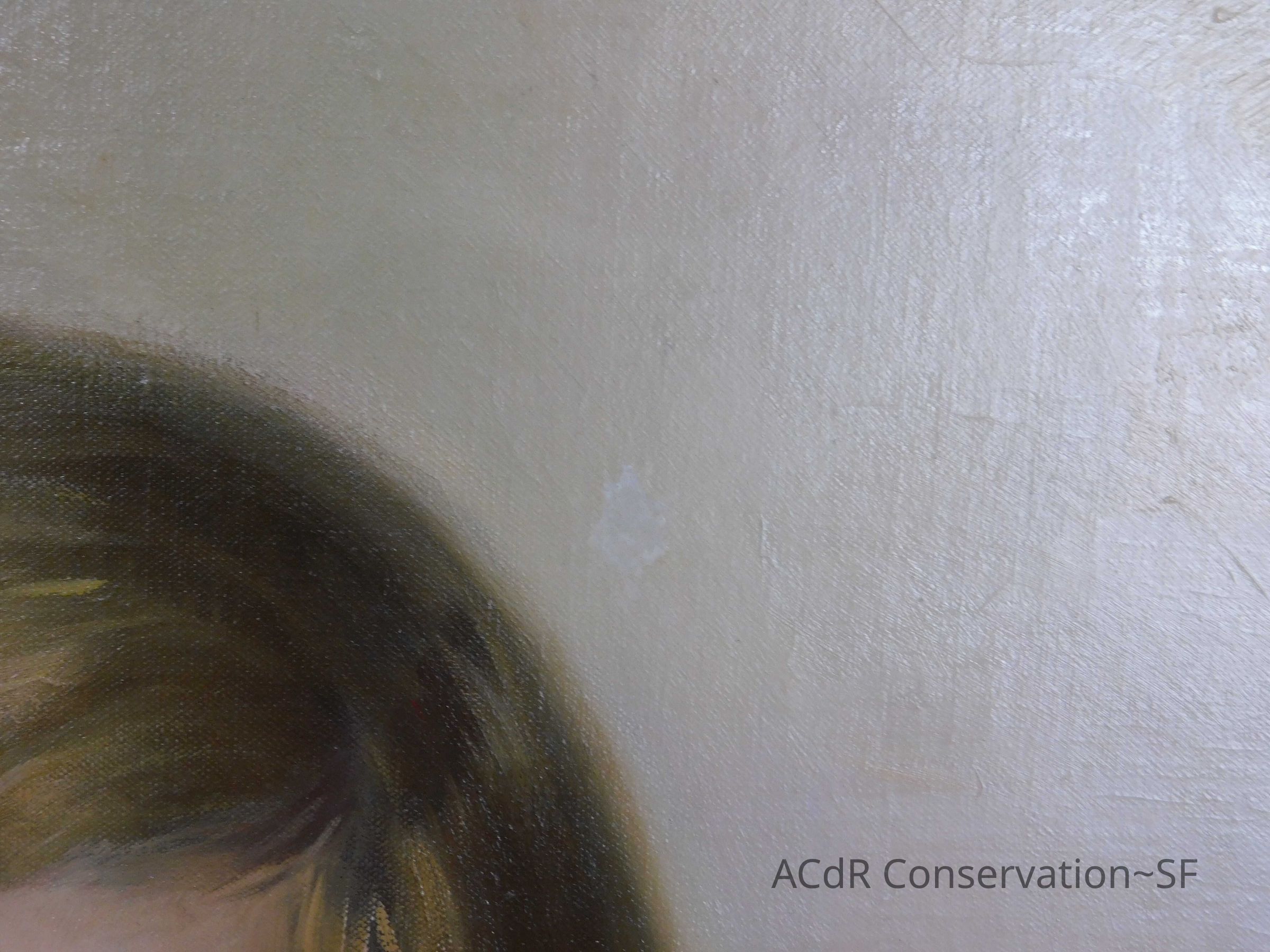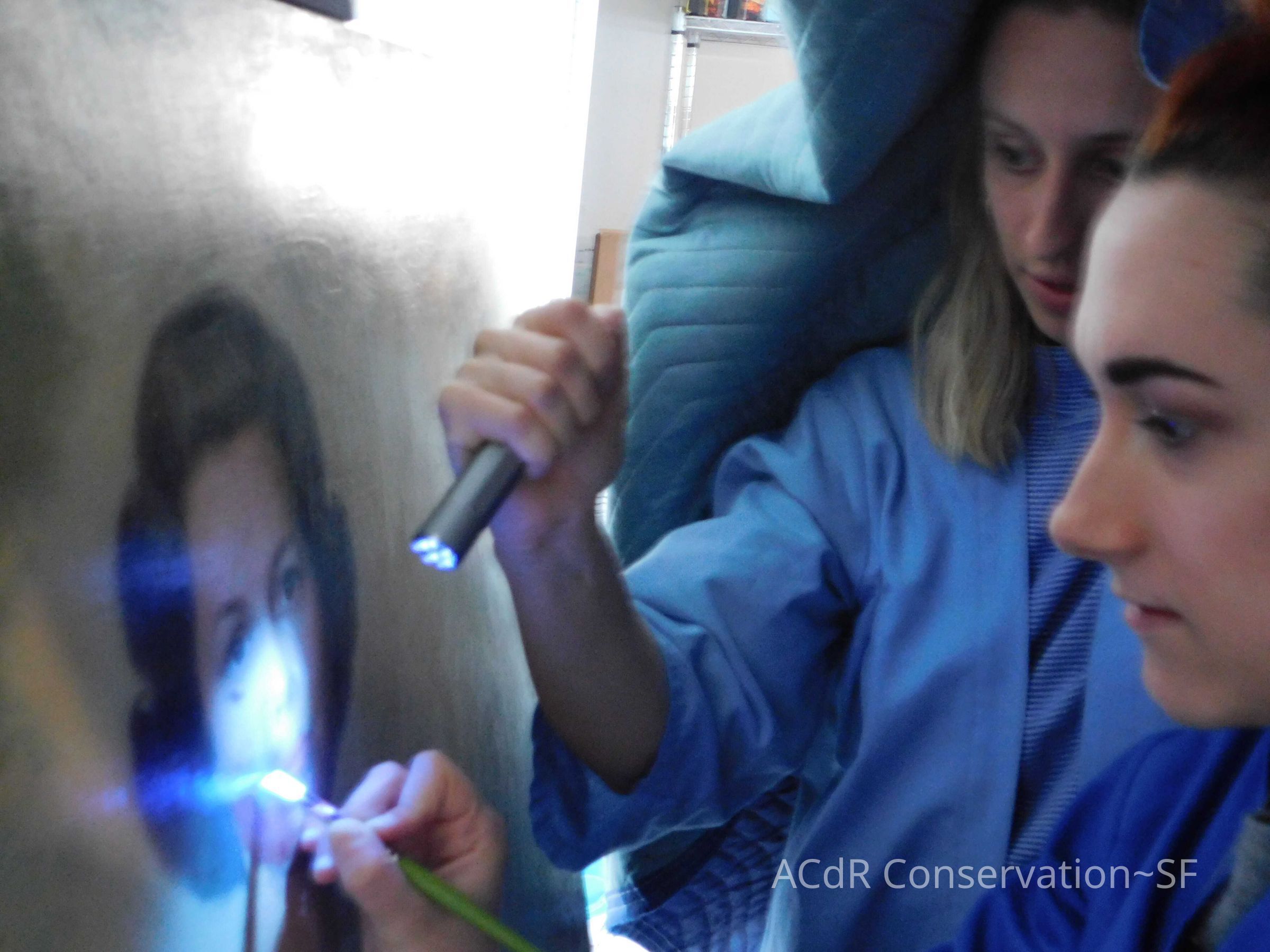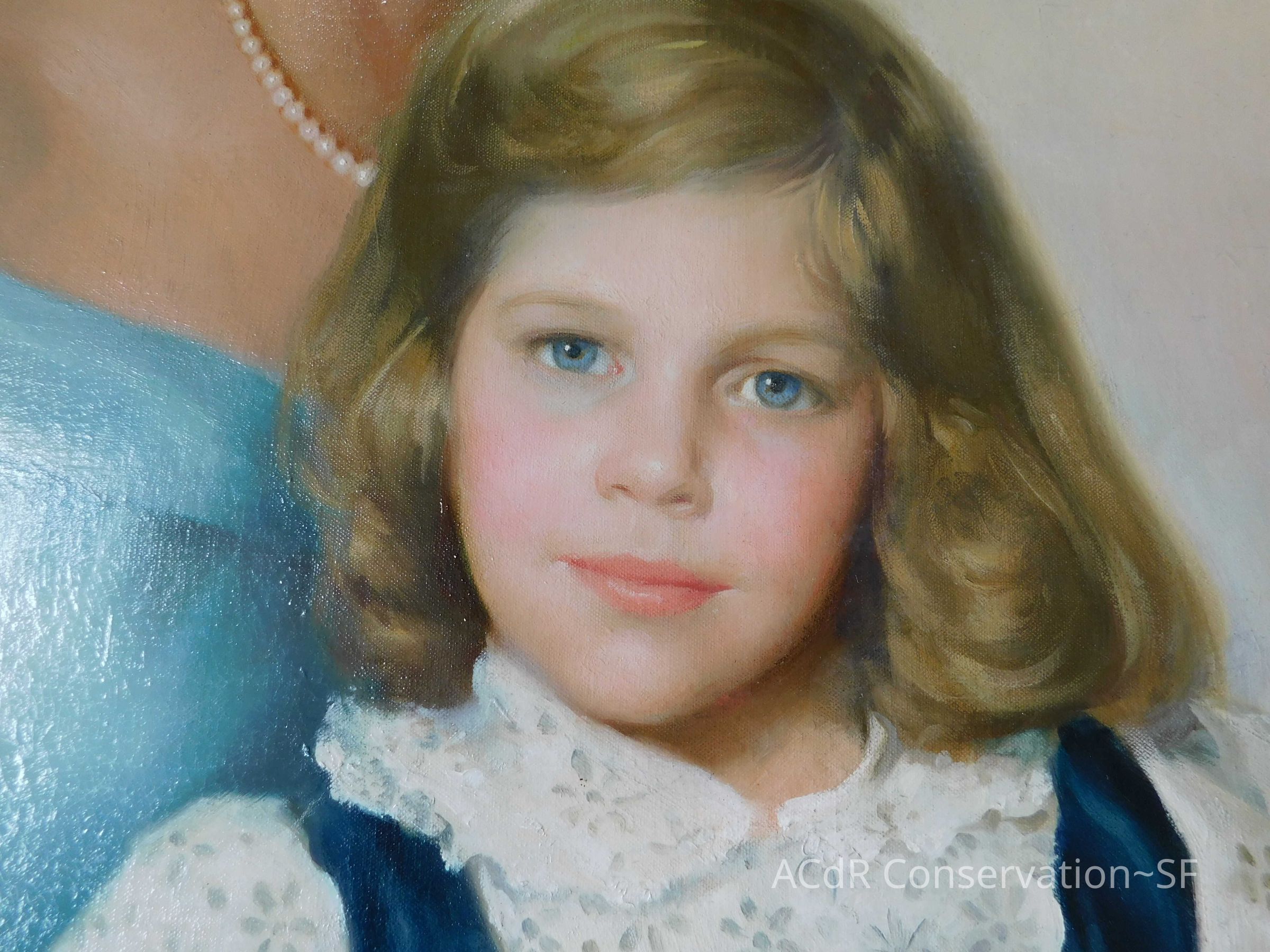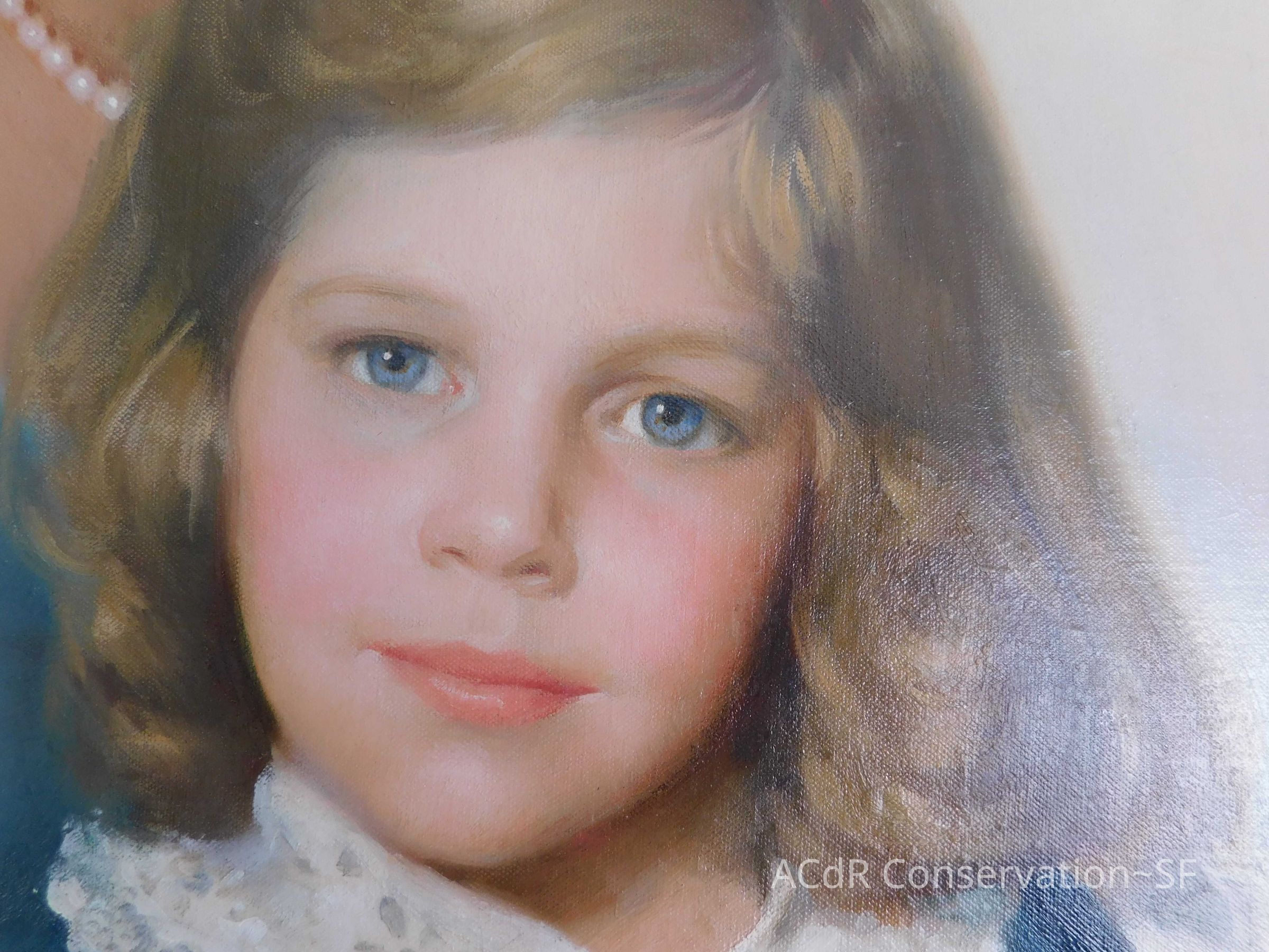 Photographs taken. Consolidations of lifting cracks in girl’s face using 3:1 Beva 371: Naptha, syringed into cracks and set with heat spatula to 150 degrees.