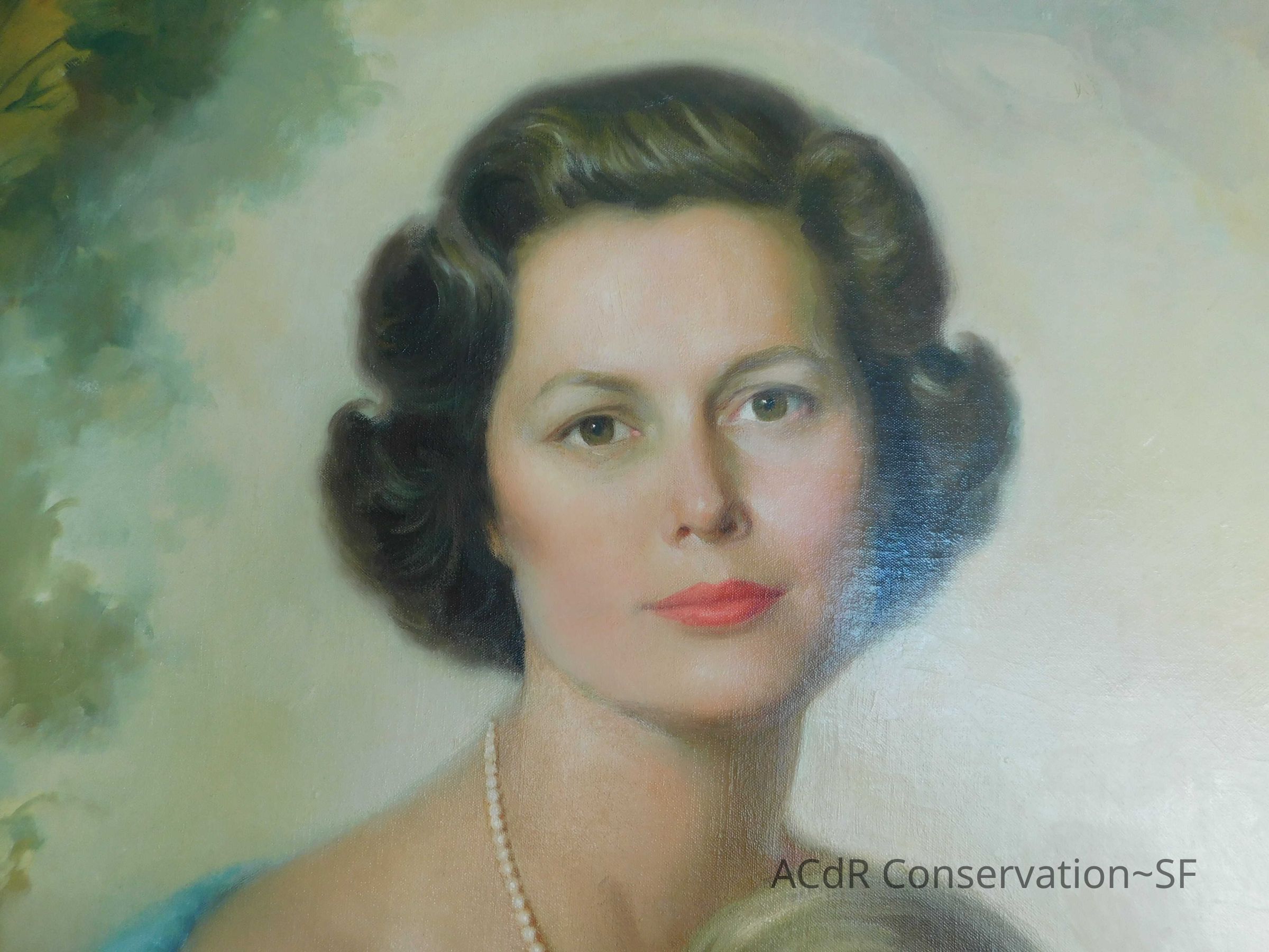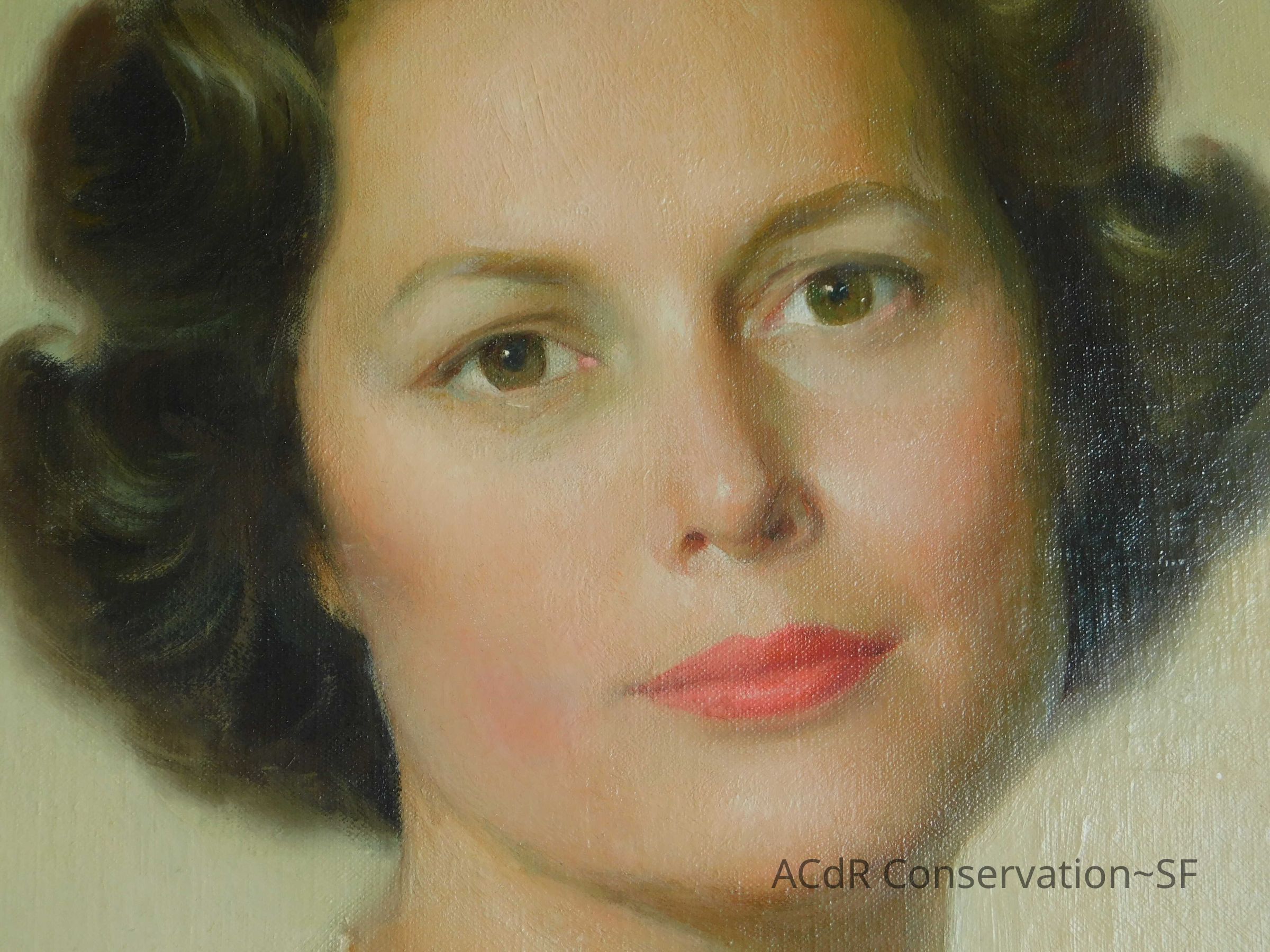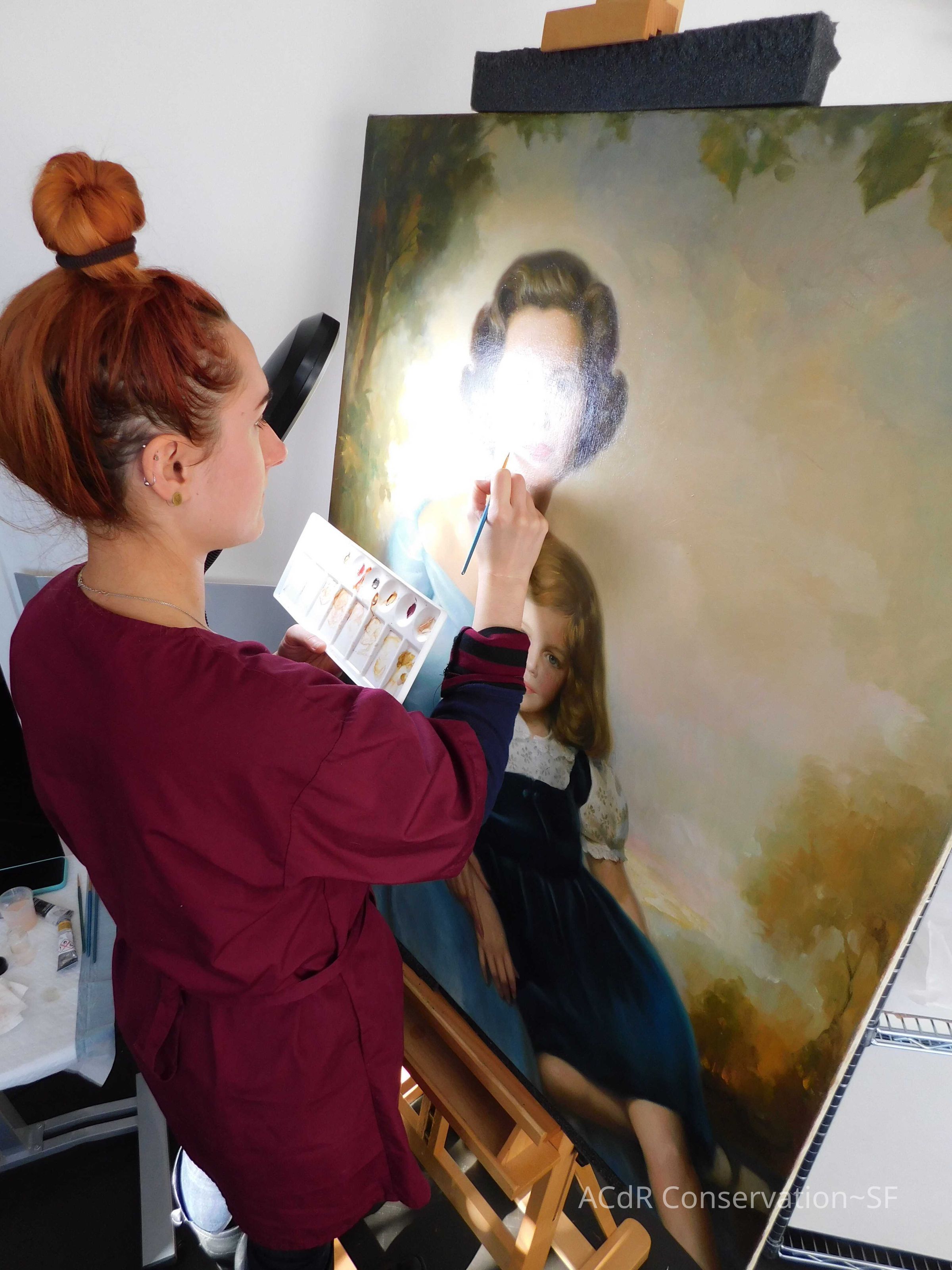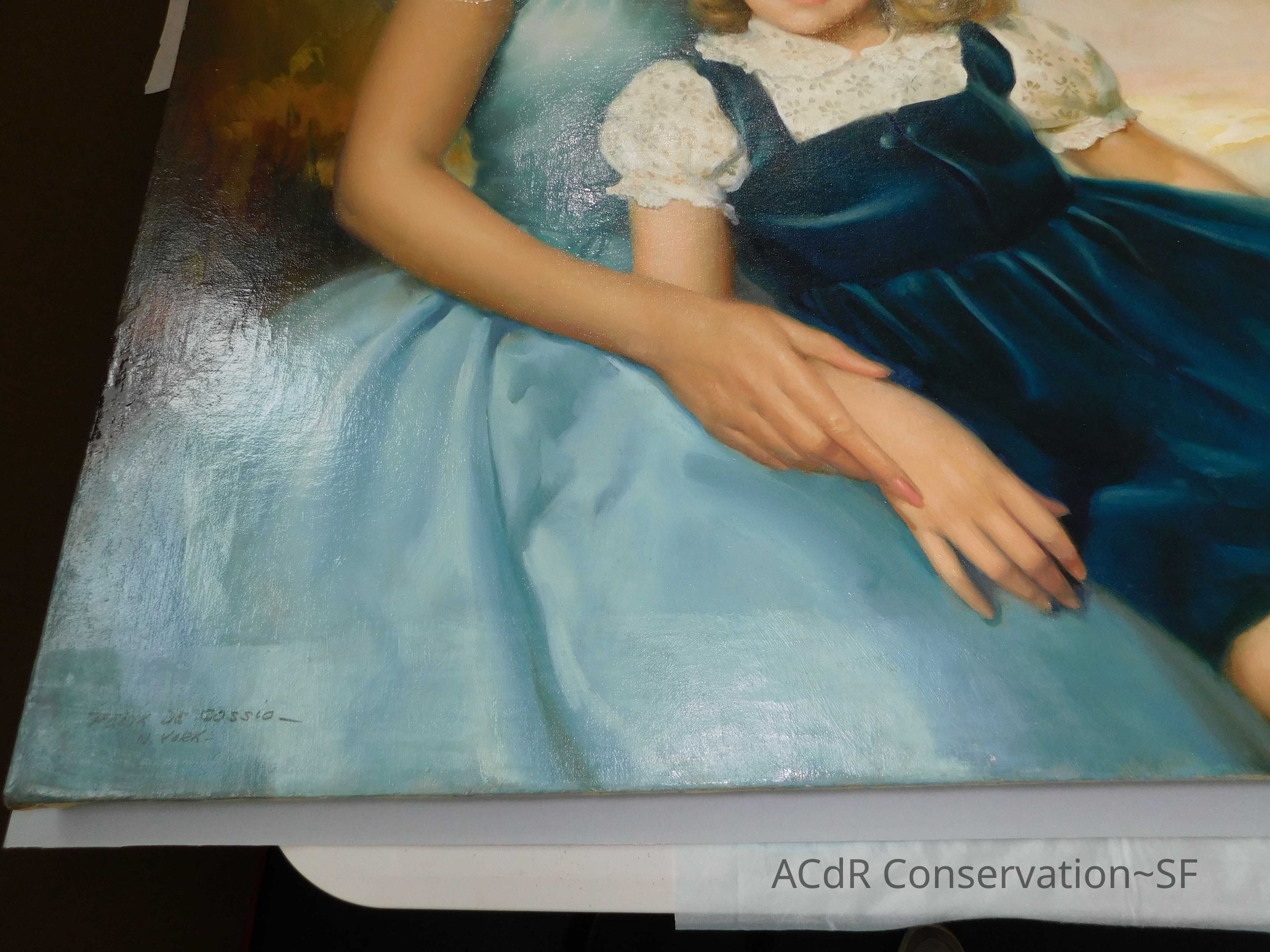Photographs taken. Consolidations of lifting cracks in girl’s face using 3:1 Beva 371: Naptha, syringed into cracks and set with heat spatula to 150 degrees.