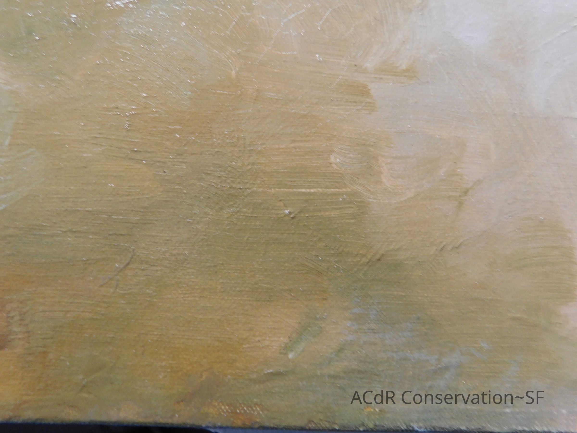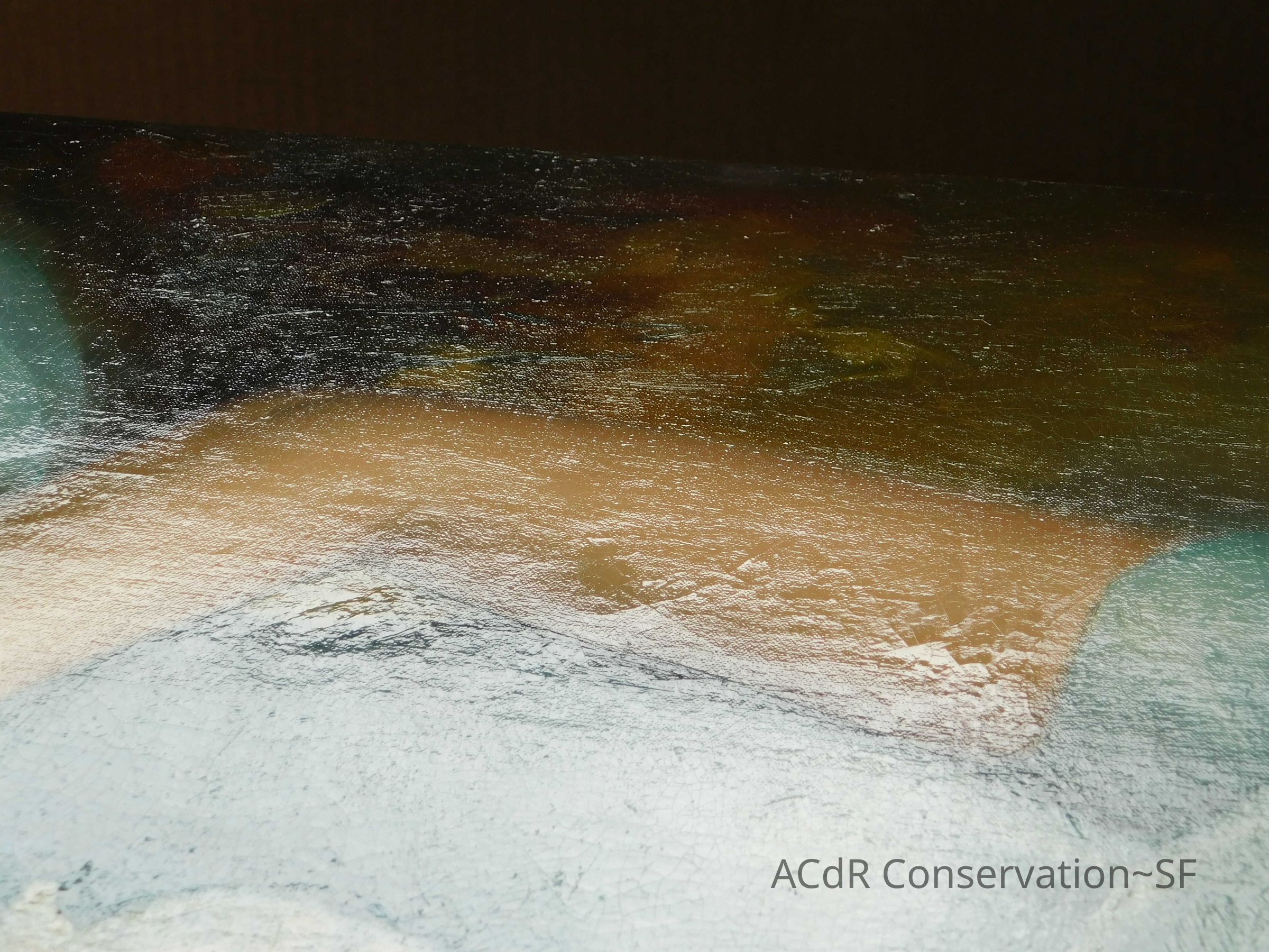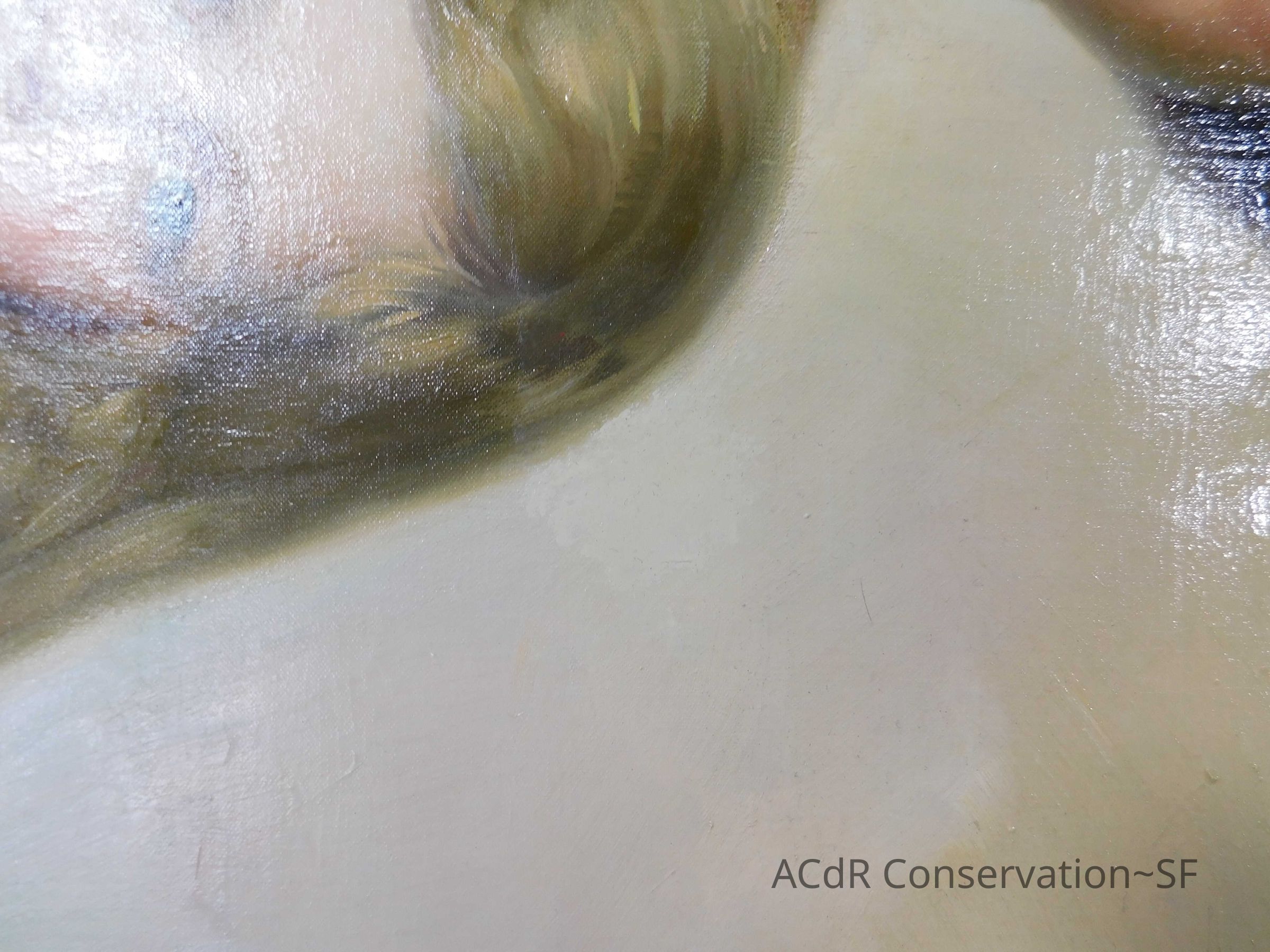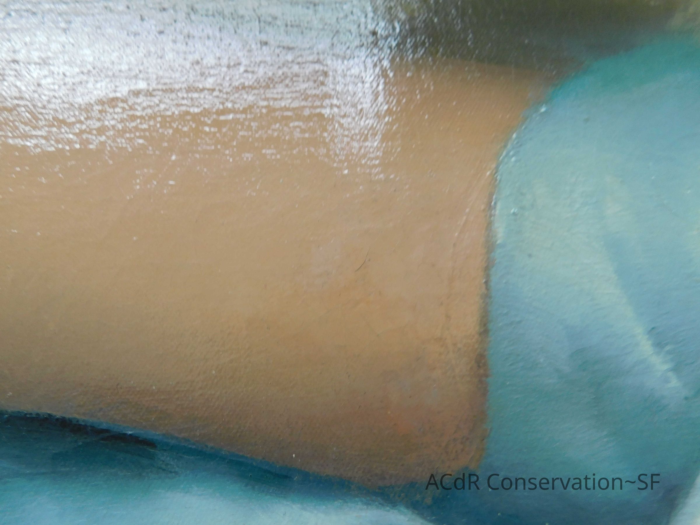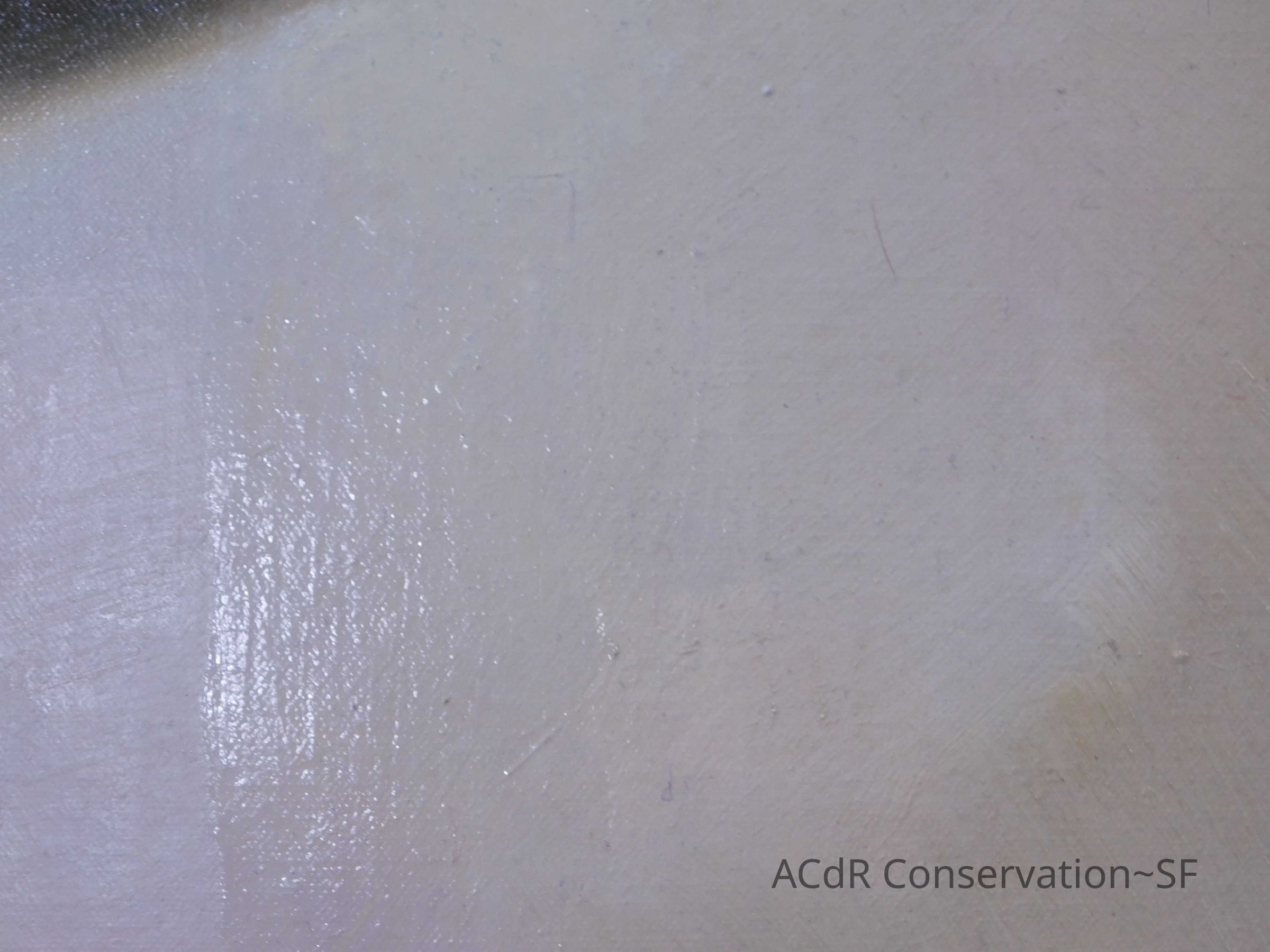 Remove varnish using solvent, especially areas of pooled varnish and where cracks are lifting to remove lint and trapped flyspecks and other materials in varnish. Added matte varnish. Potential for further consolidation.