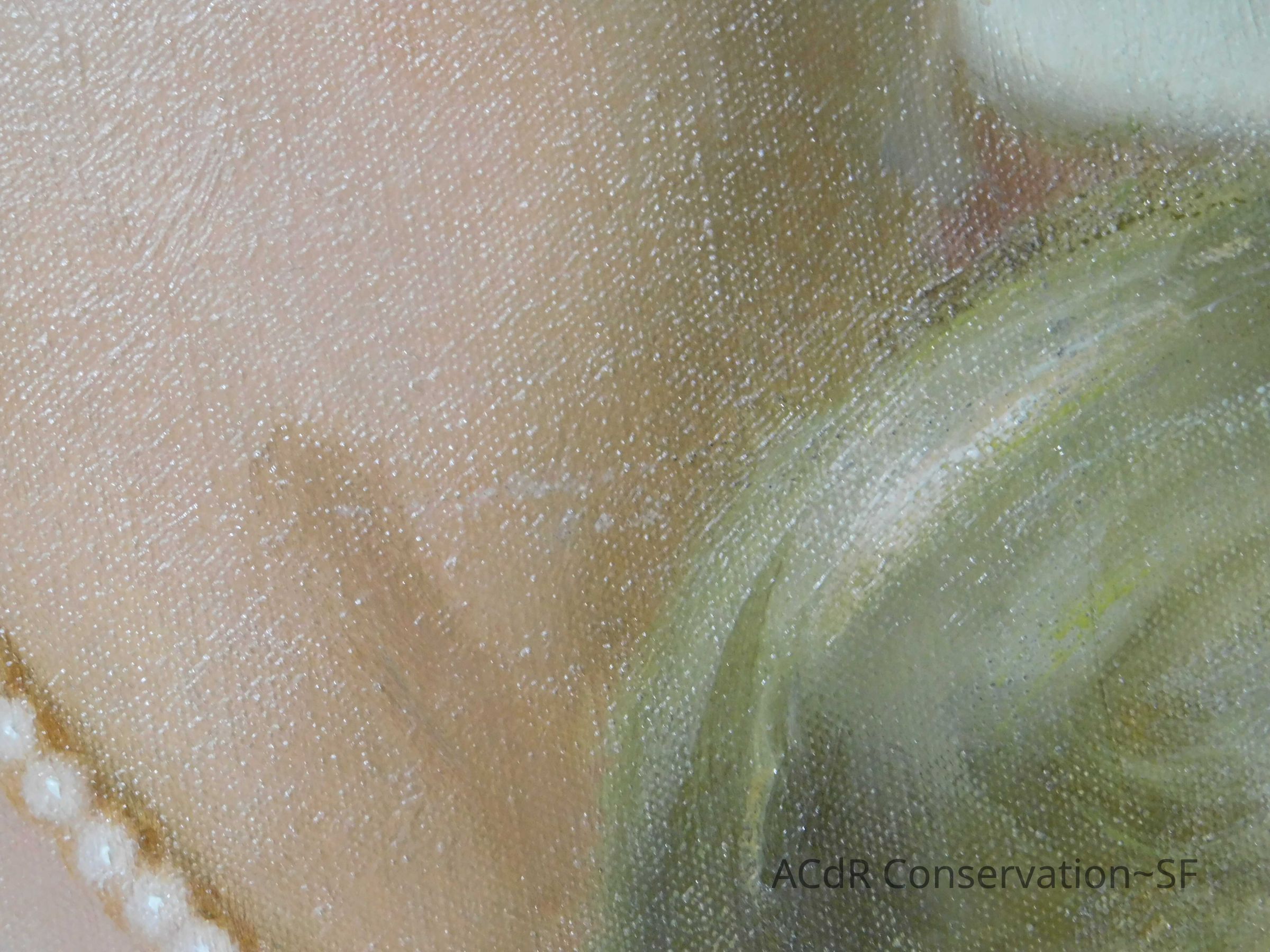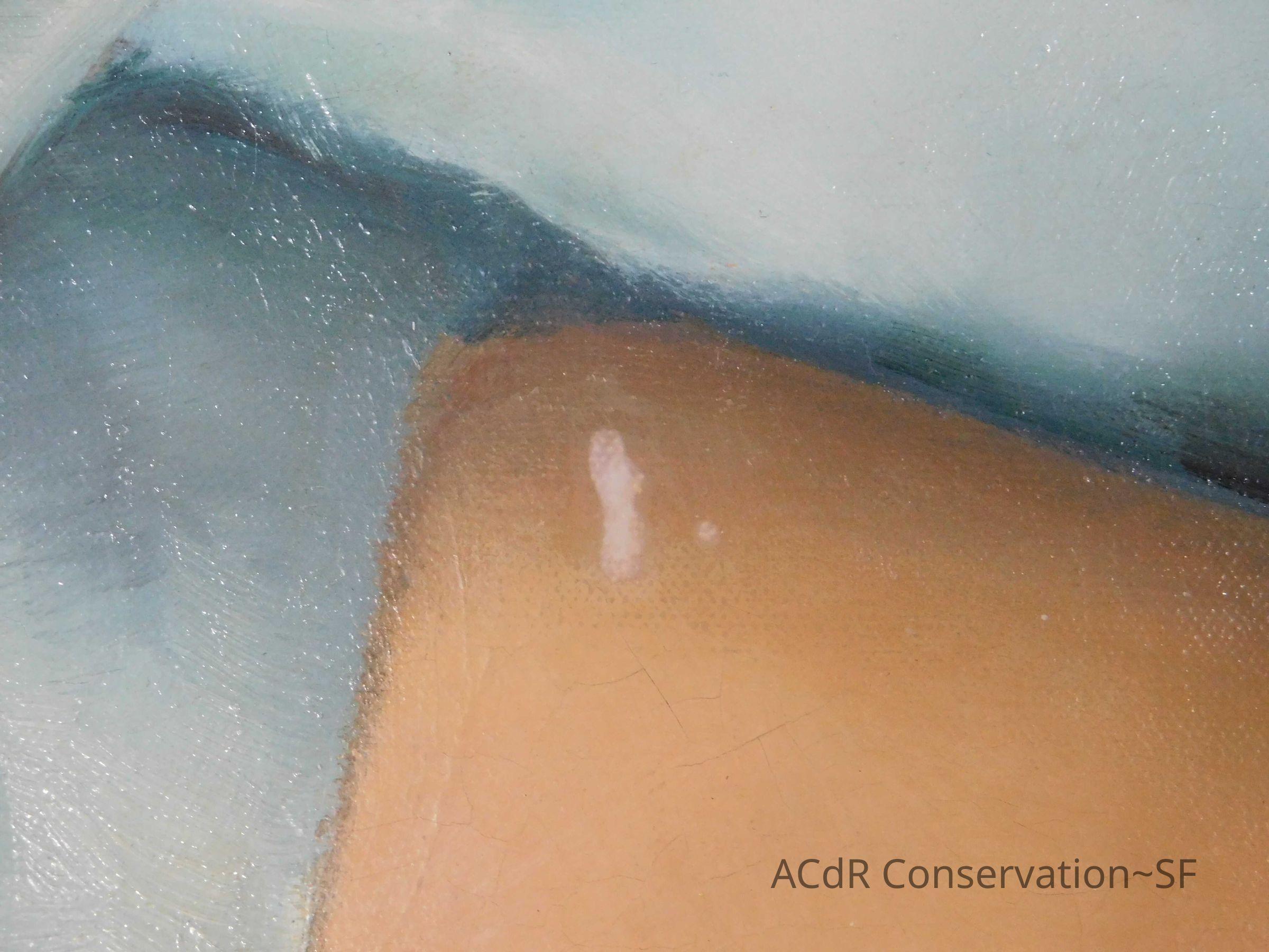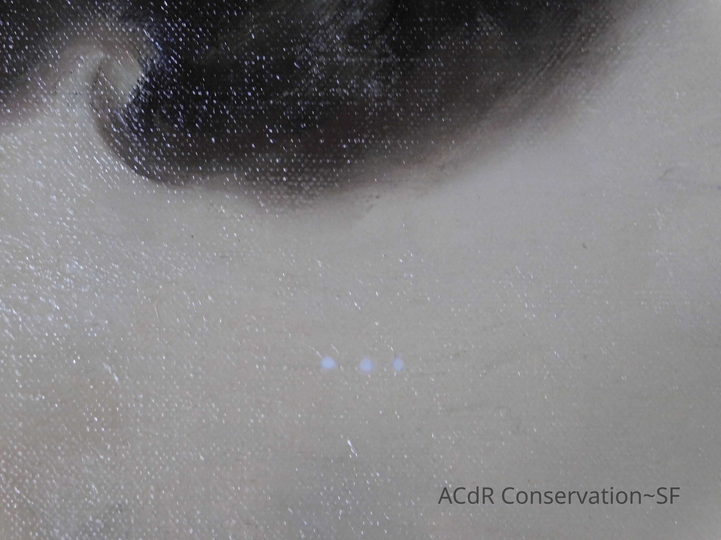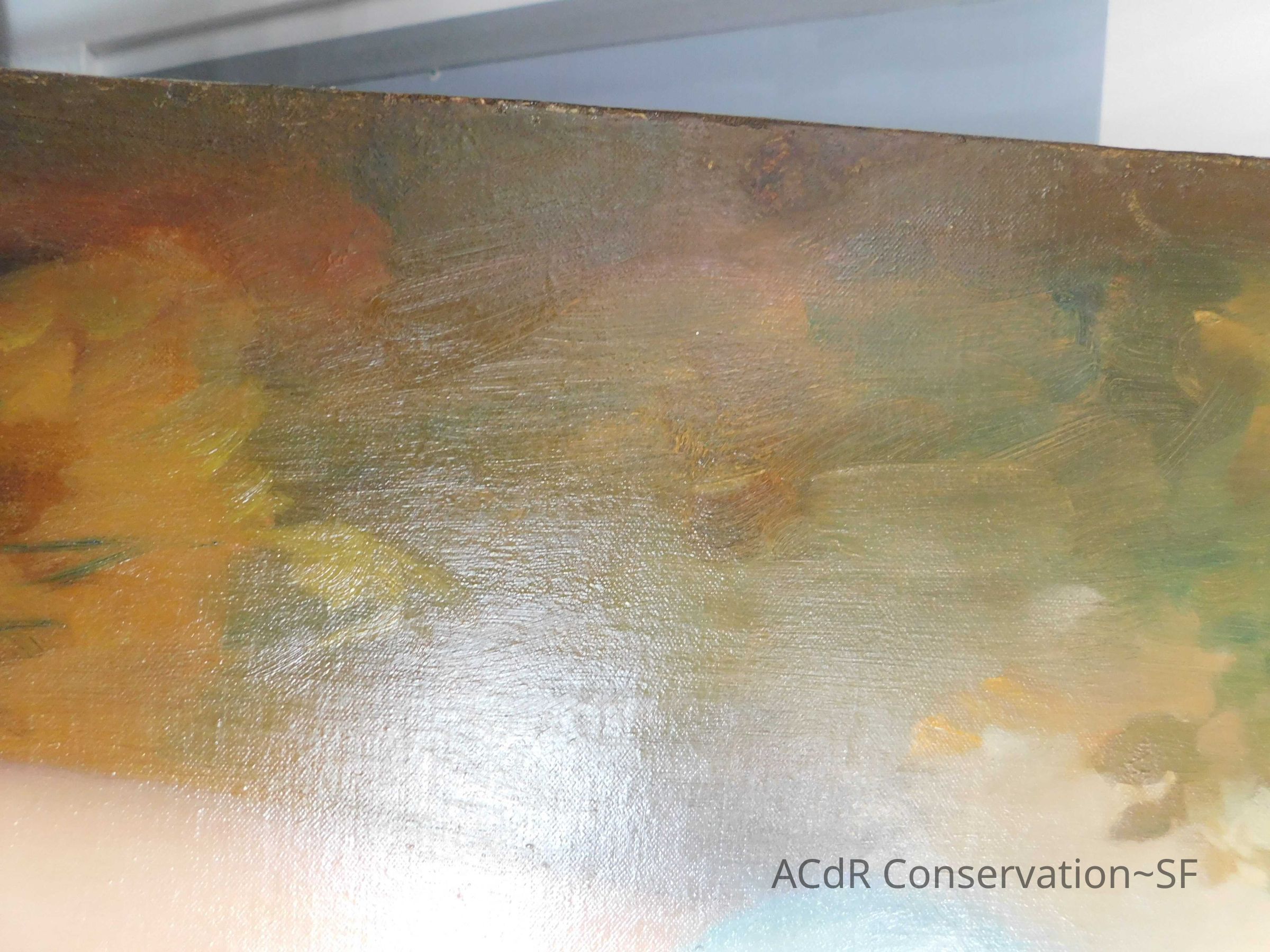 Remove varnish using solvent, especially areas of pooled varnish and where cracks are lifting to remove lint and trapped flyspecks and other materials in varnish. Added matte varnish. Potential for further consolidation.