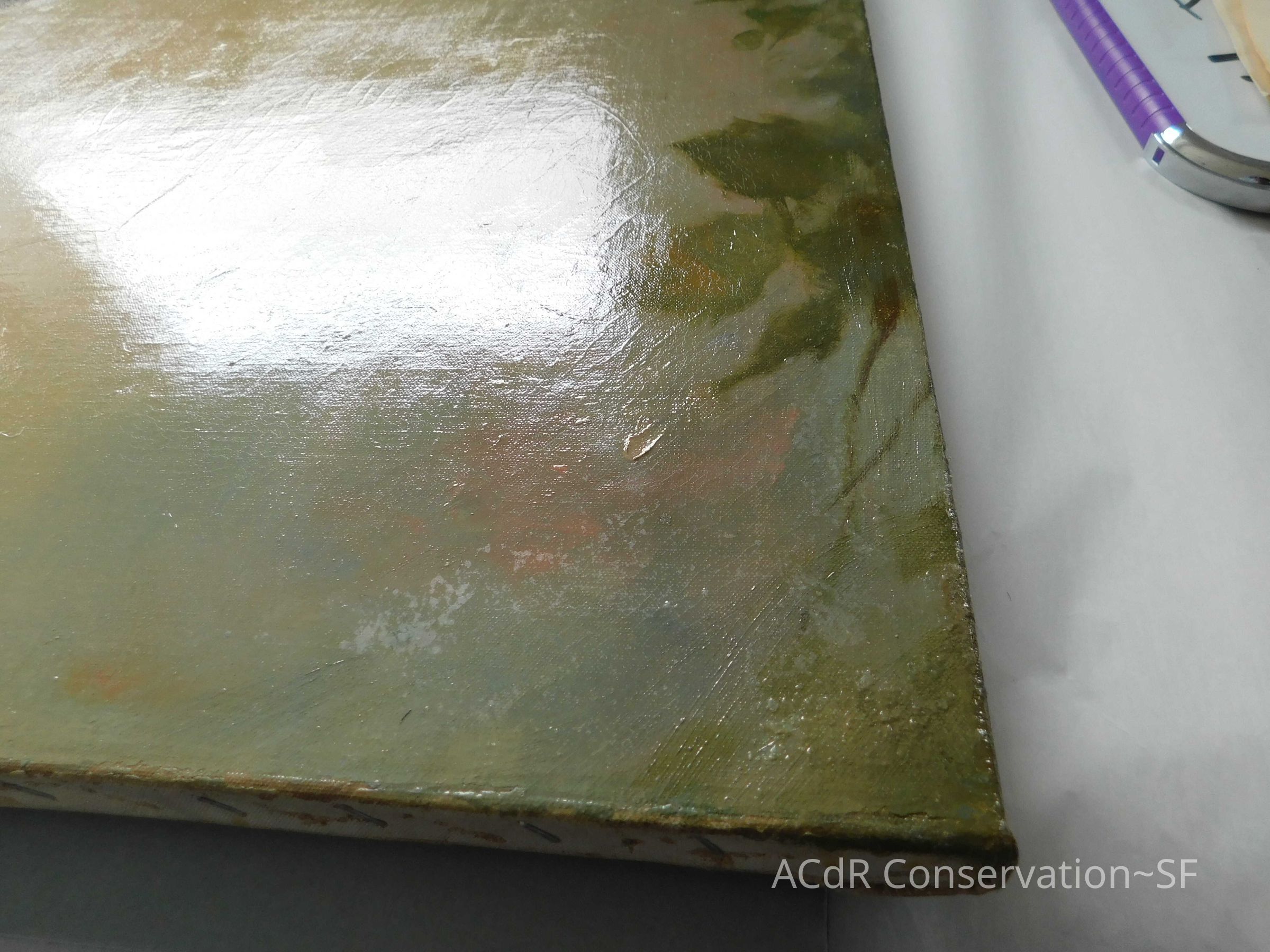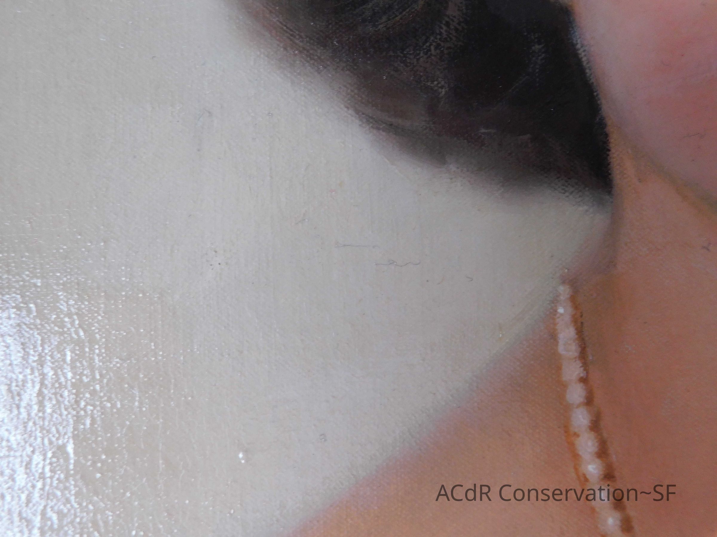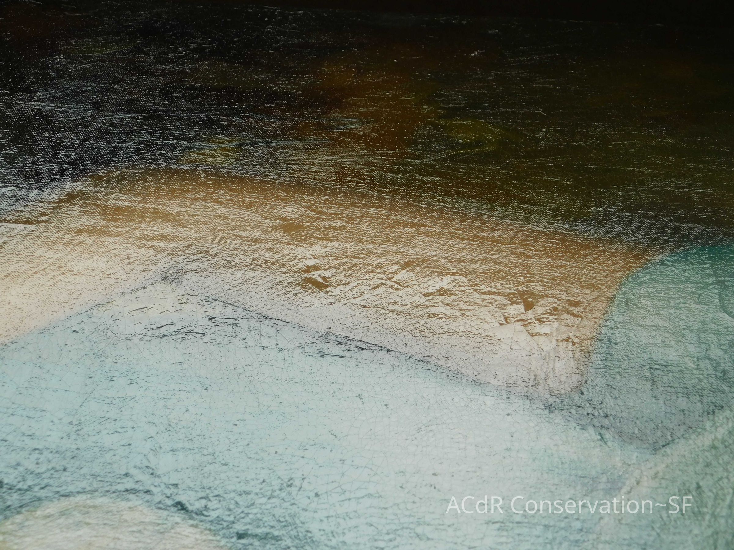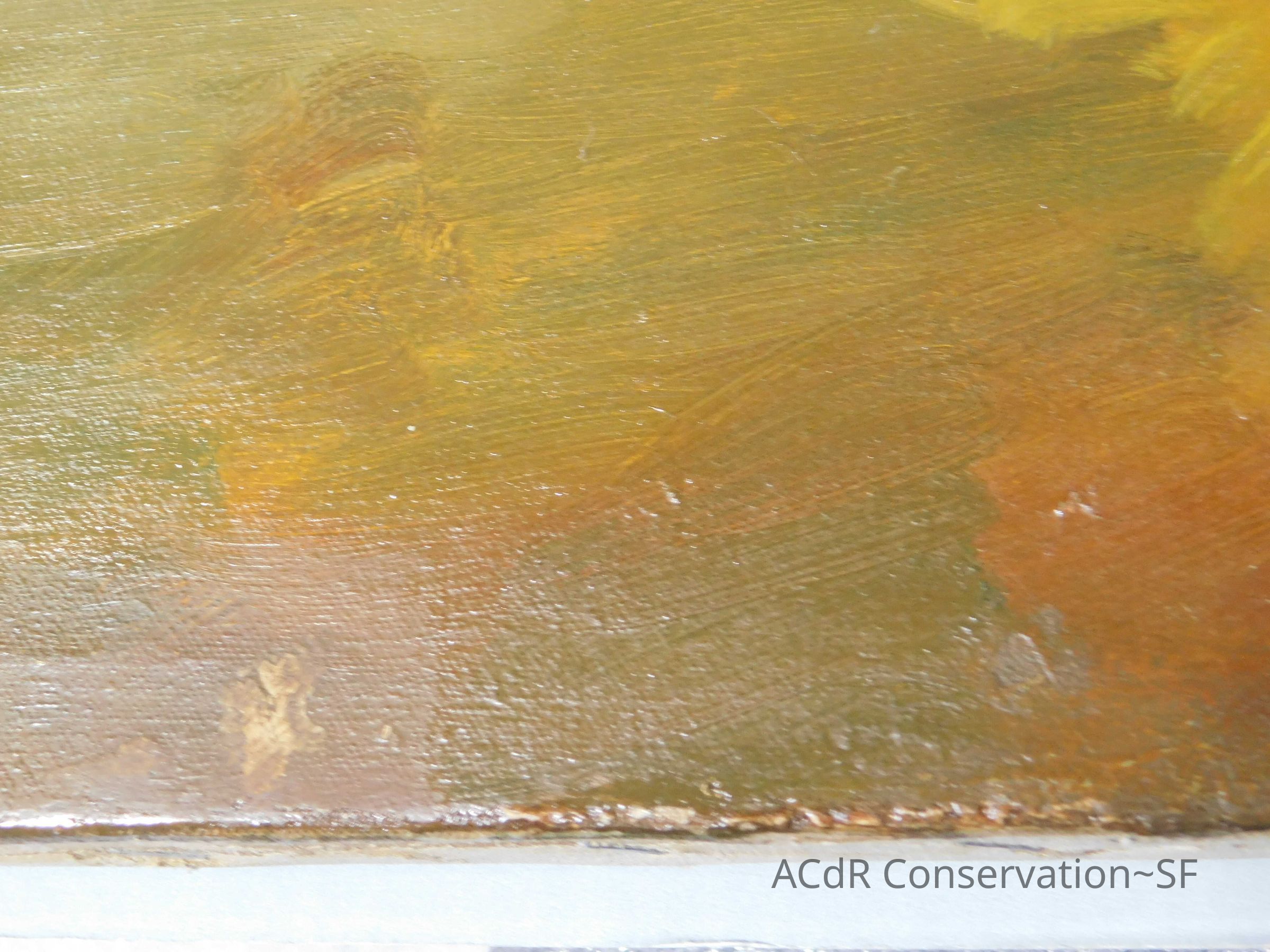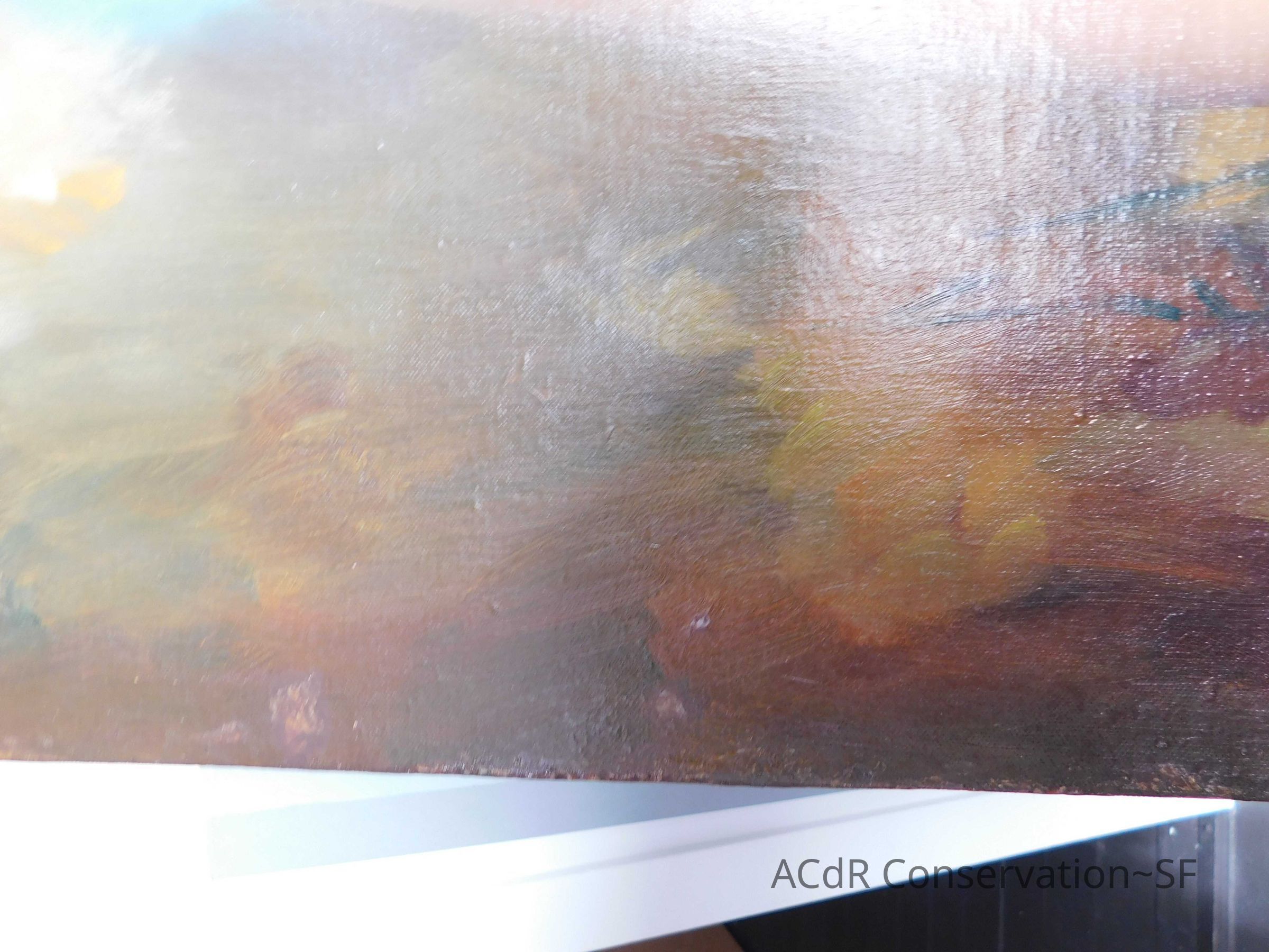 Remove varnish using solvent, especially areas of pooled varnish and where cracks are lifting to remove lint and trapped flyspecks and other materials in varnish. Added matte varnish. Potential for further consolidation.