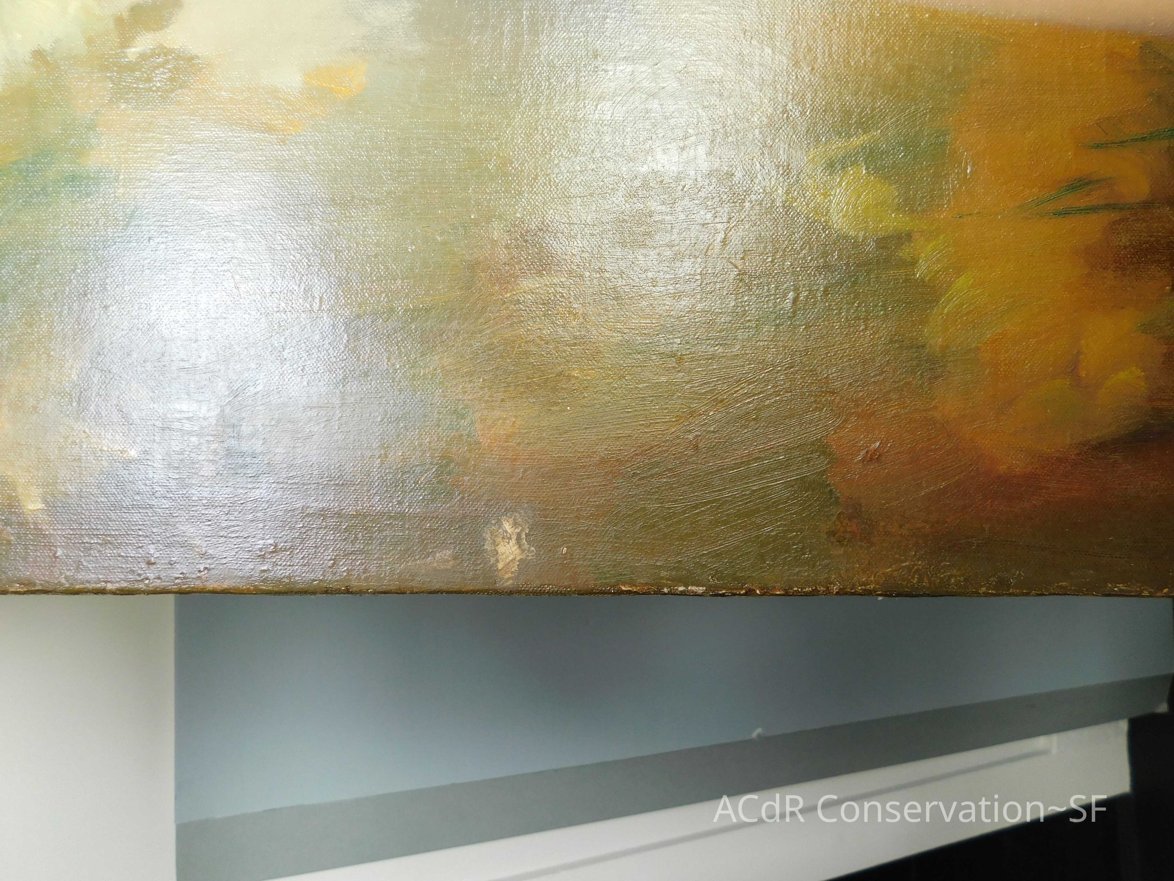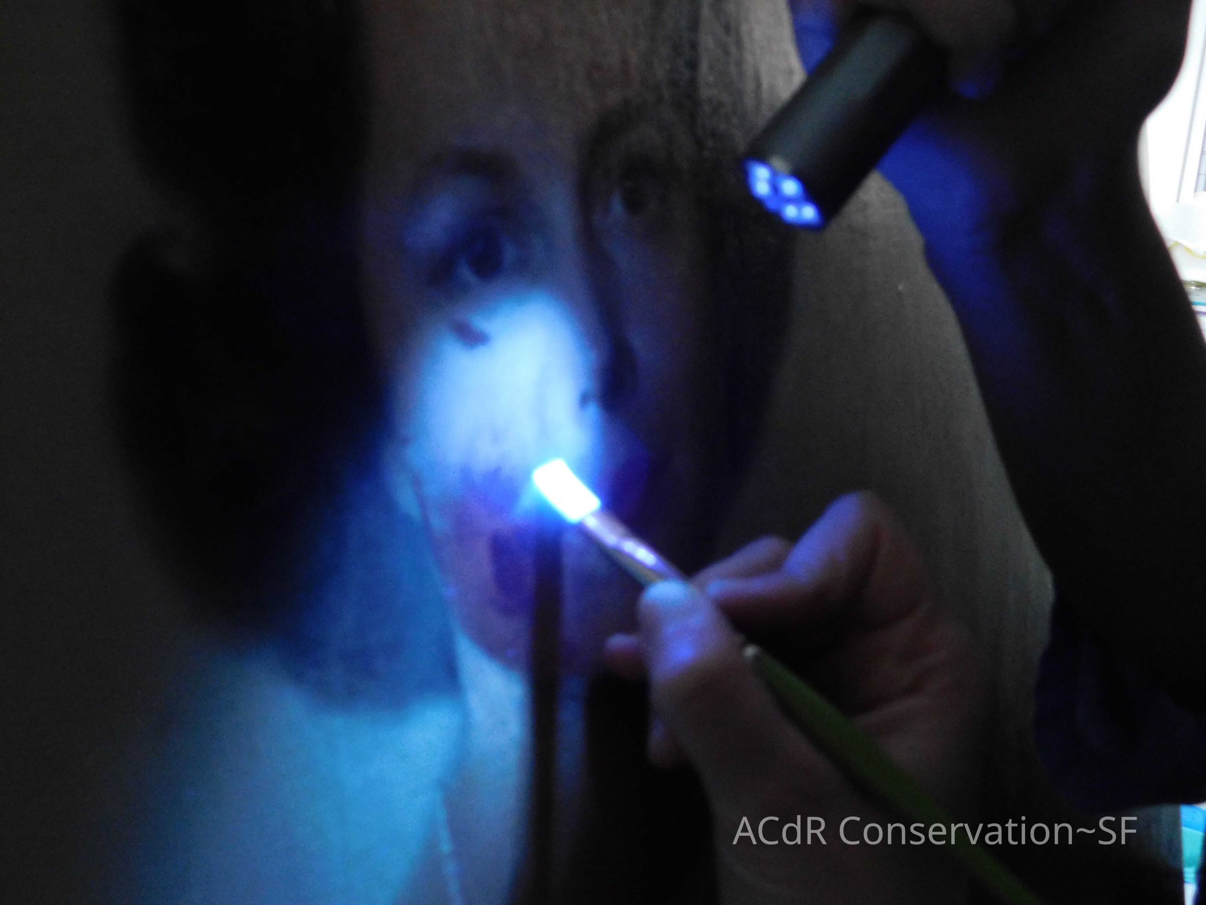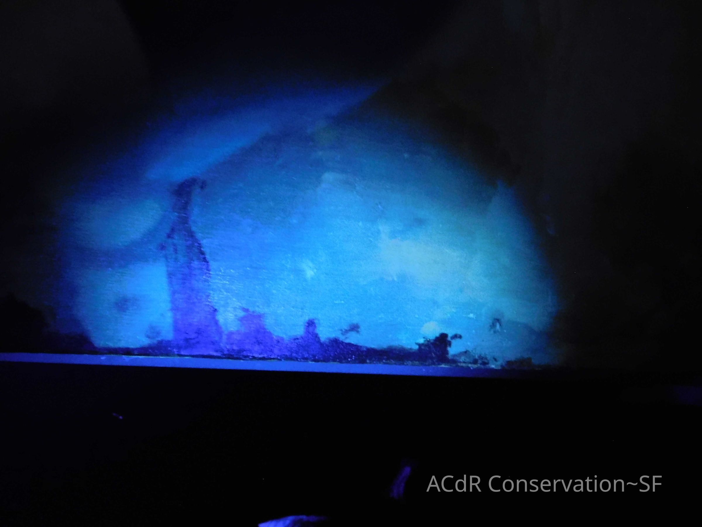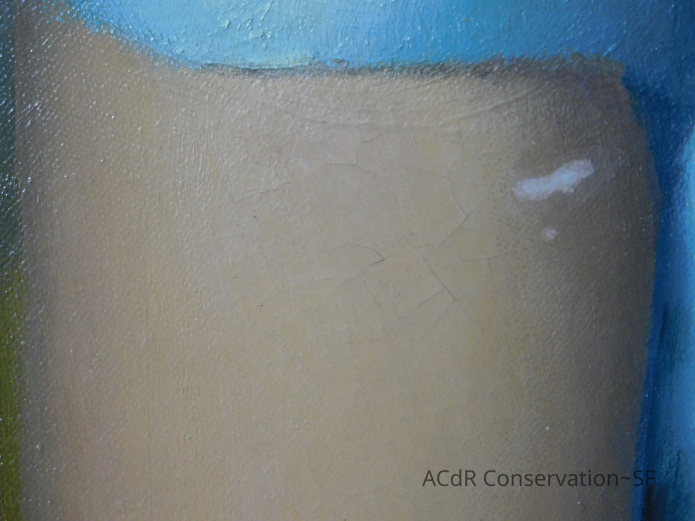 Remove varnish using solvent, especially areas of pooled varnish and where cracks are lifting to remove lint and trapped flyspecks and other materials in varnish. Added matte varnish. Potential for further consolidation.