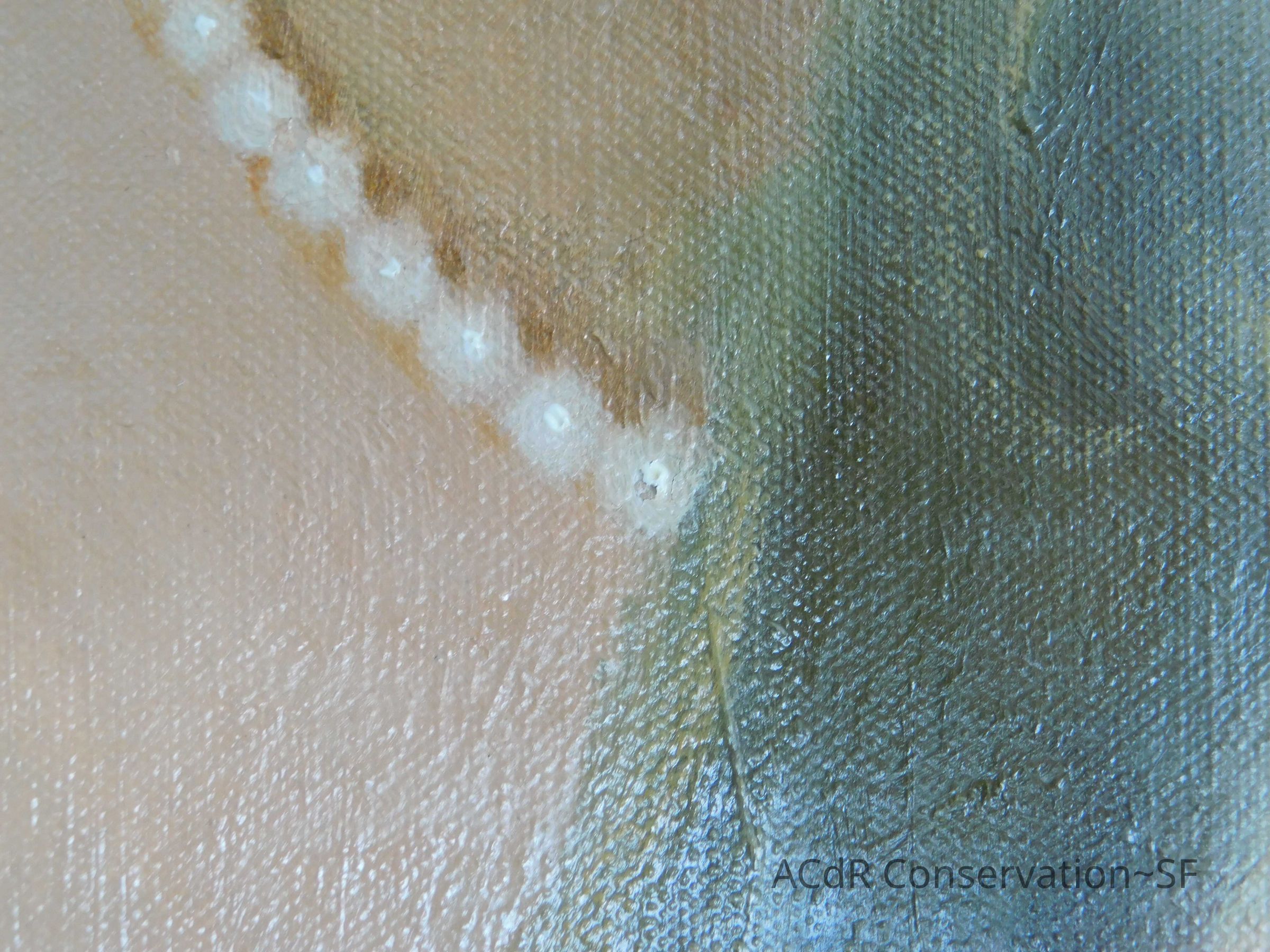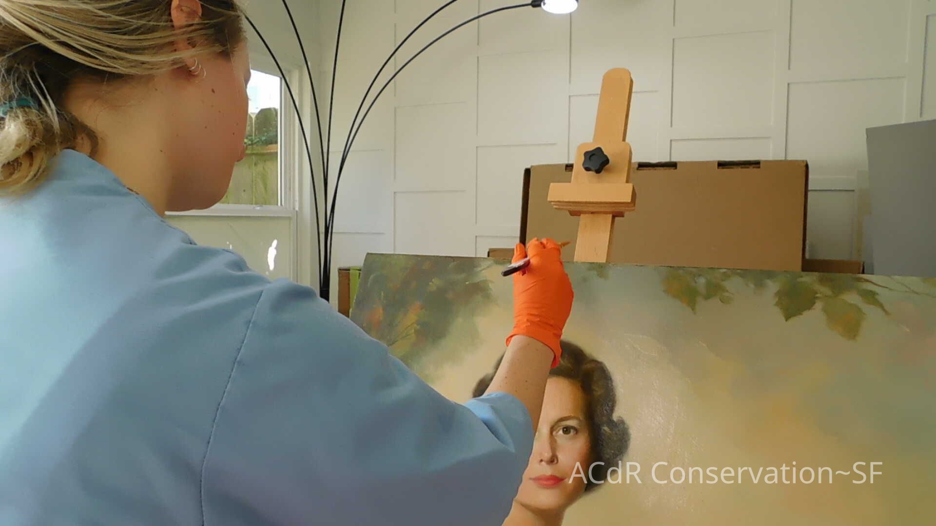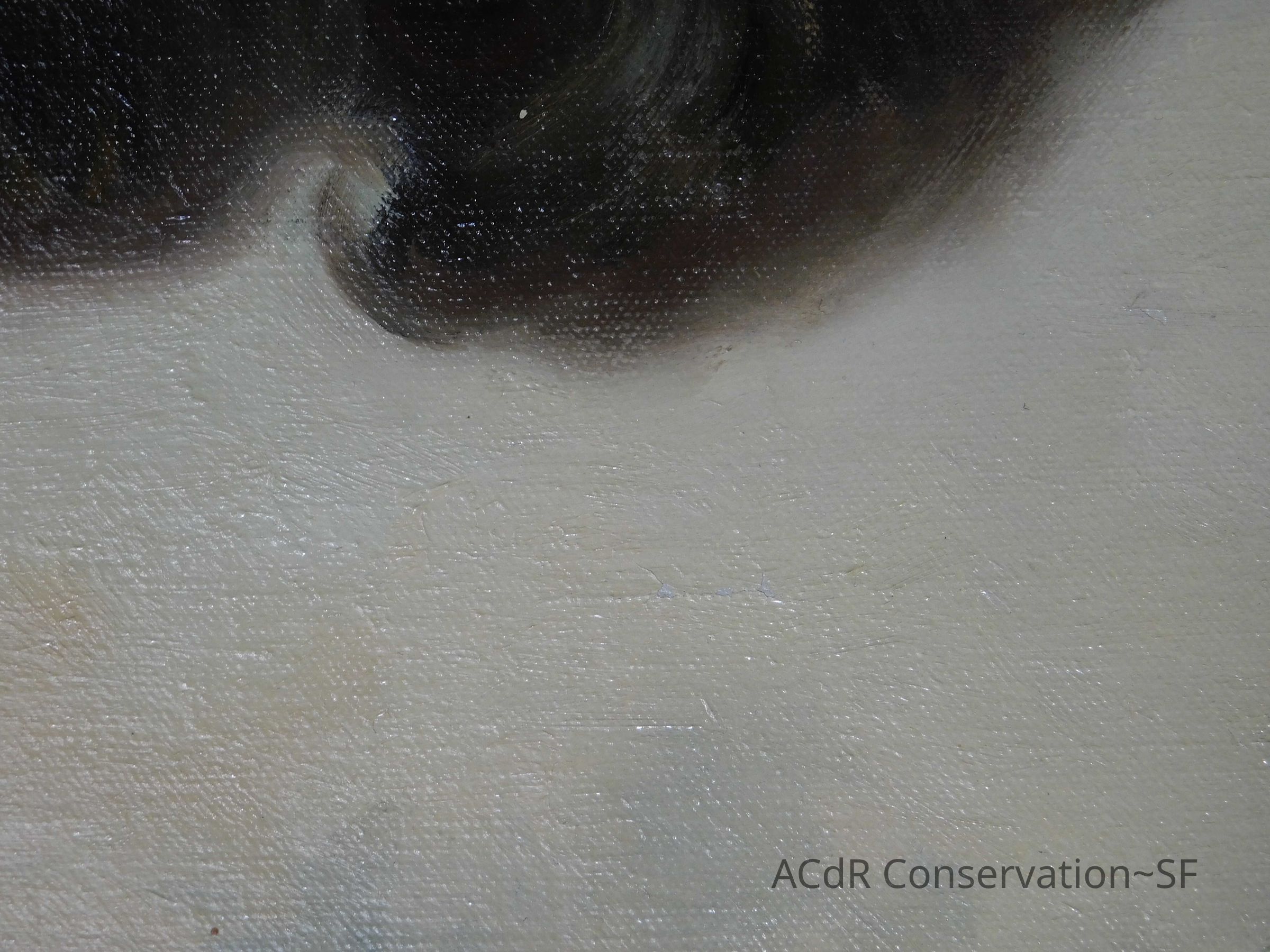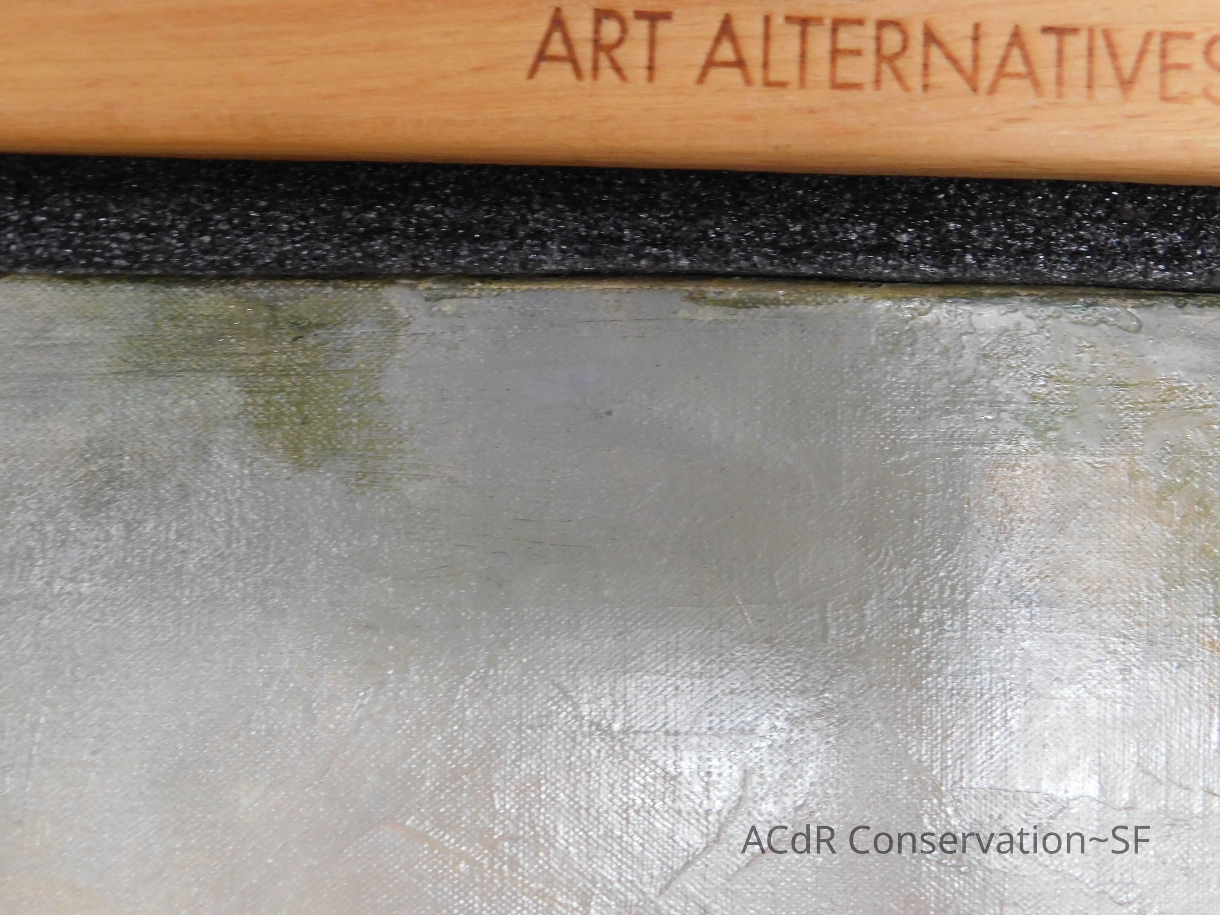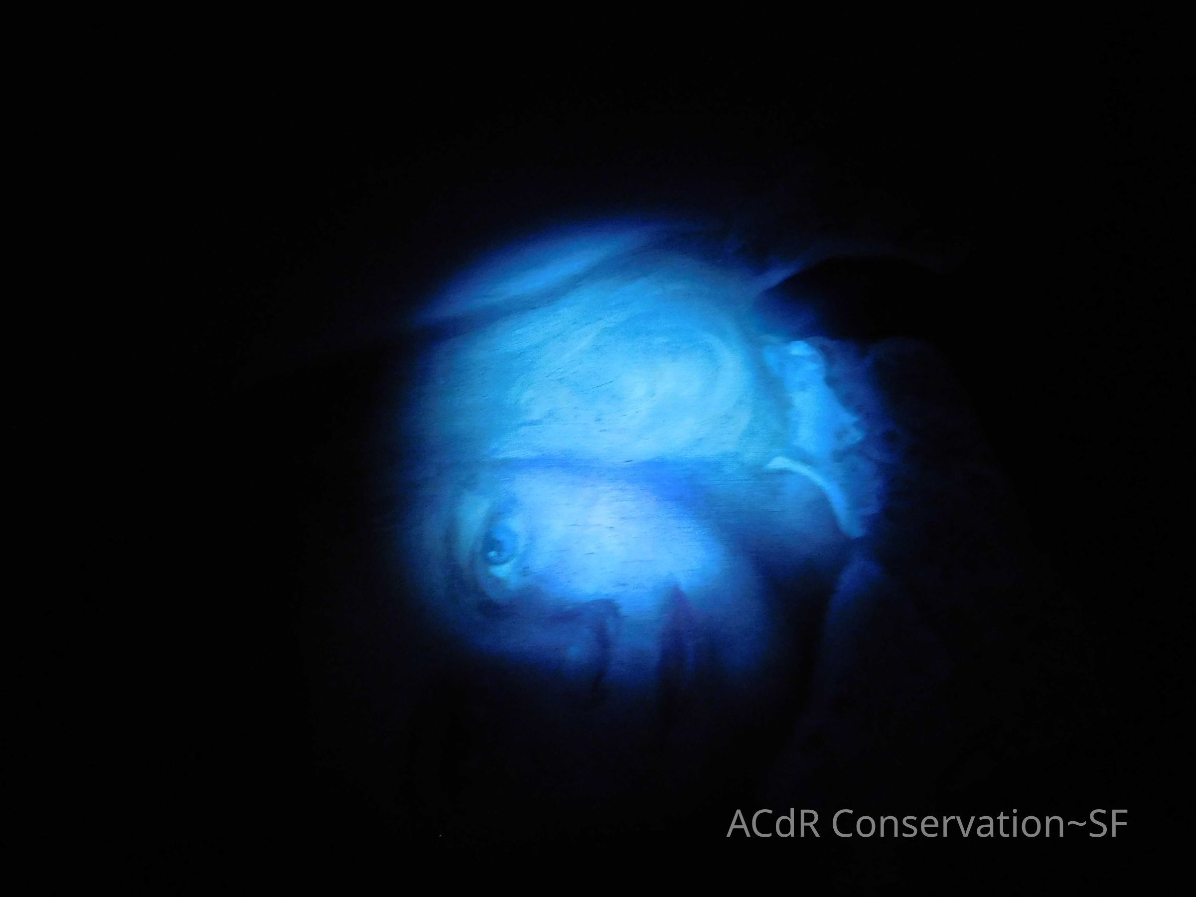 Remove varnish using solvent, especially areas of pooled varnish and where cracks are lifting to remove lint and trapped flyspecks and other materials in varnish. Added matte varnish. Potential for further consolidation.