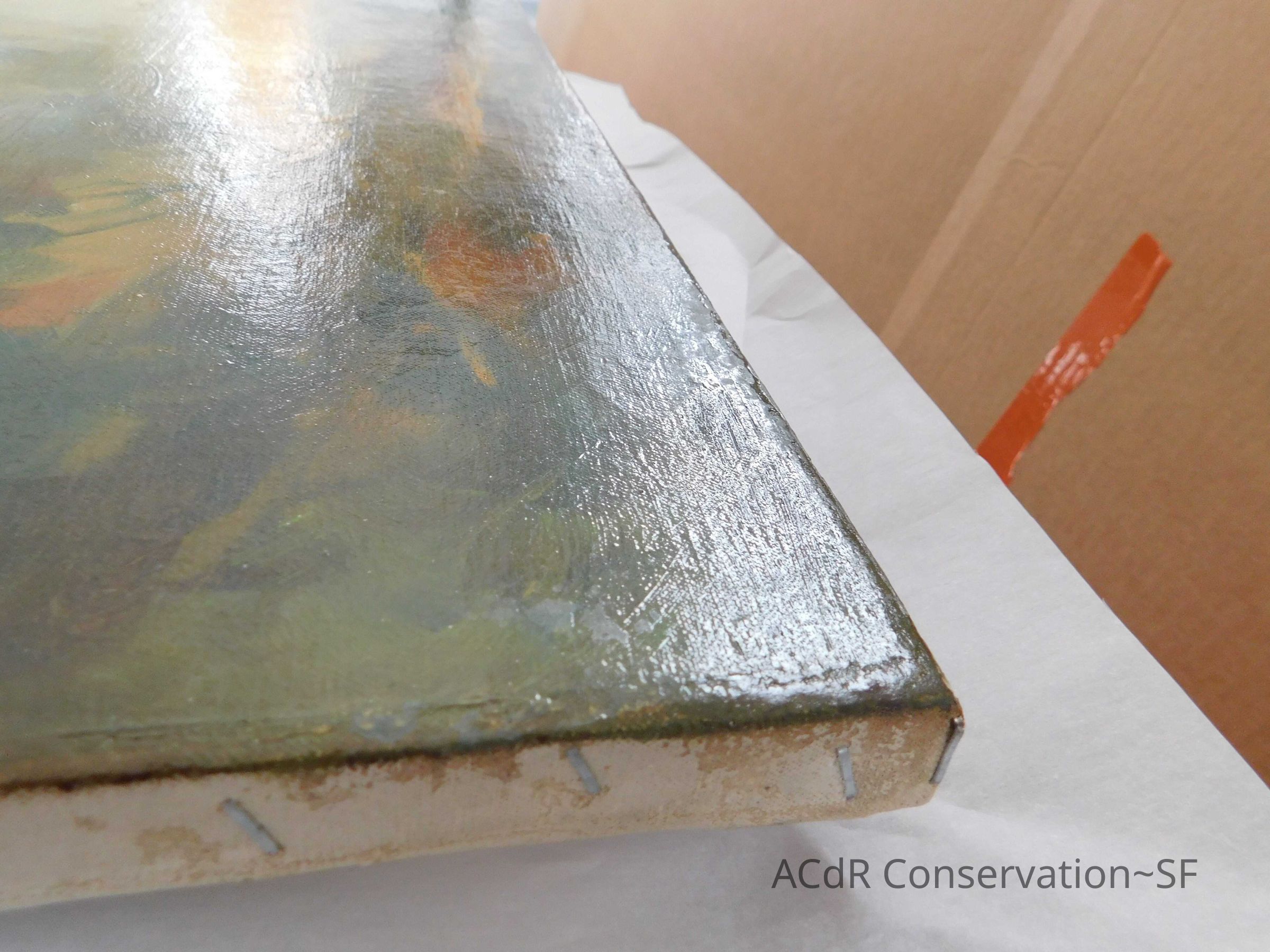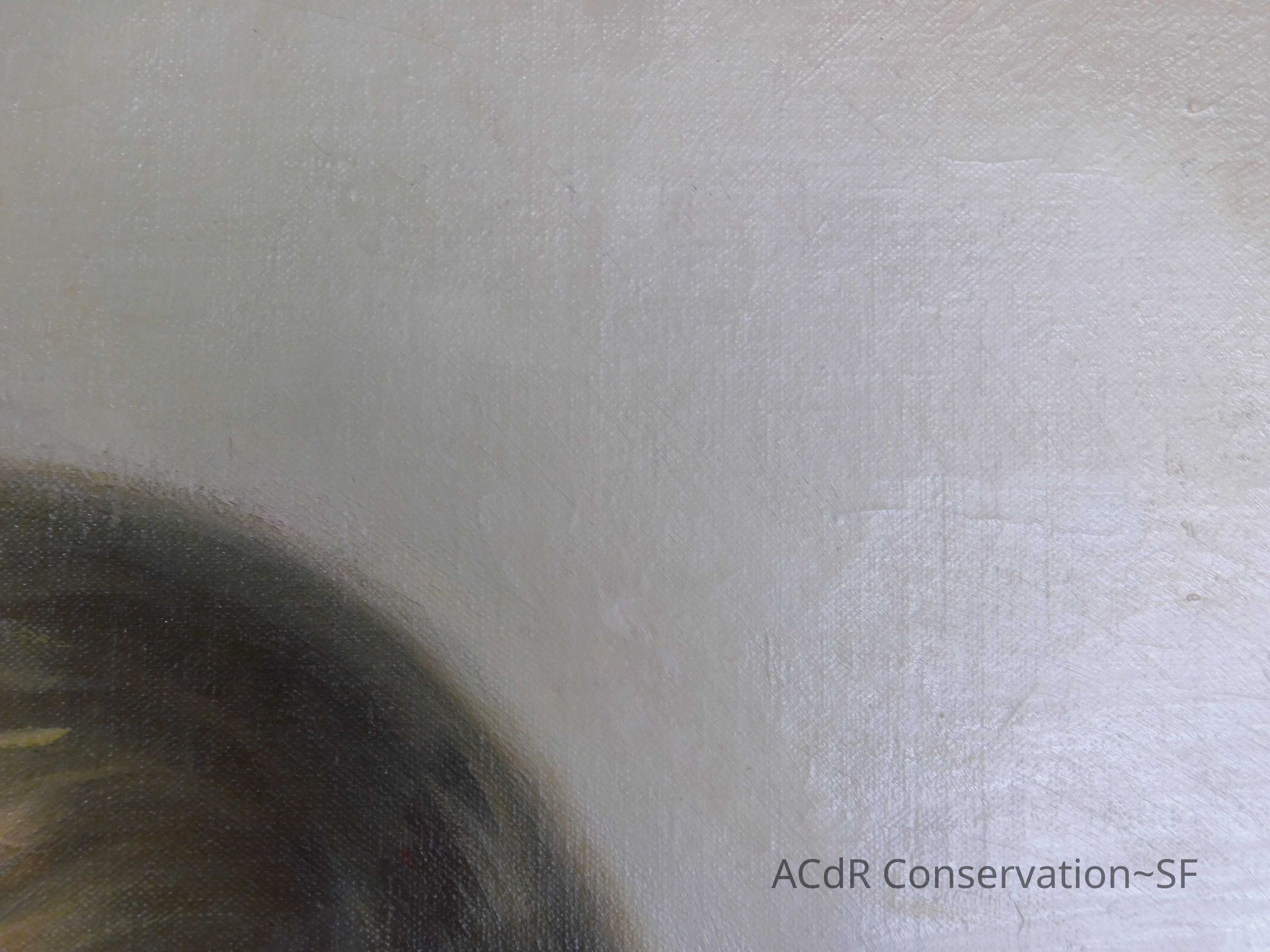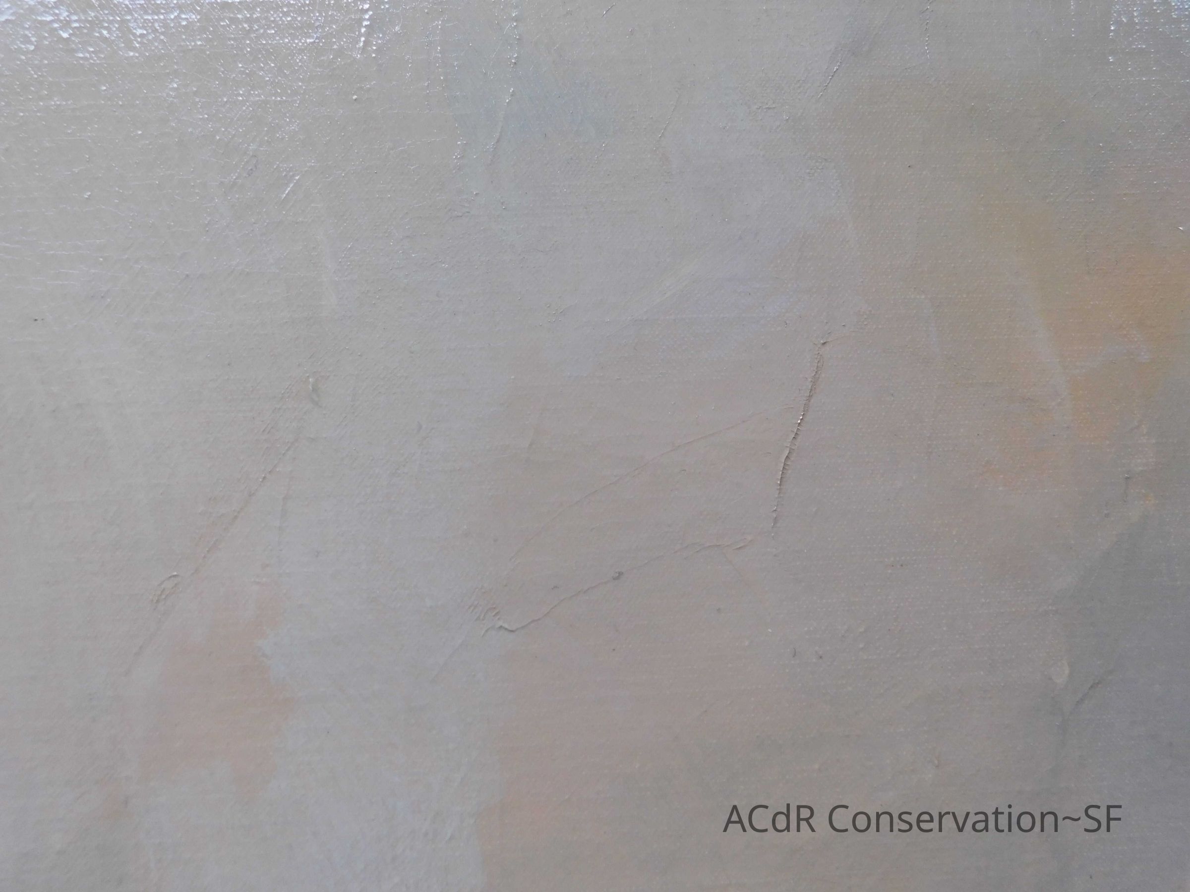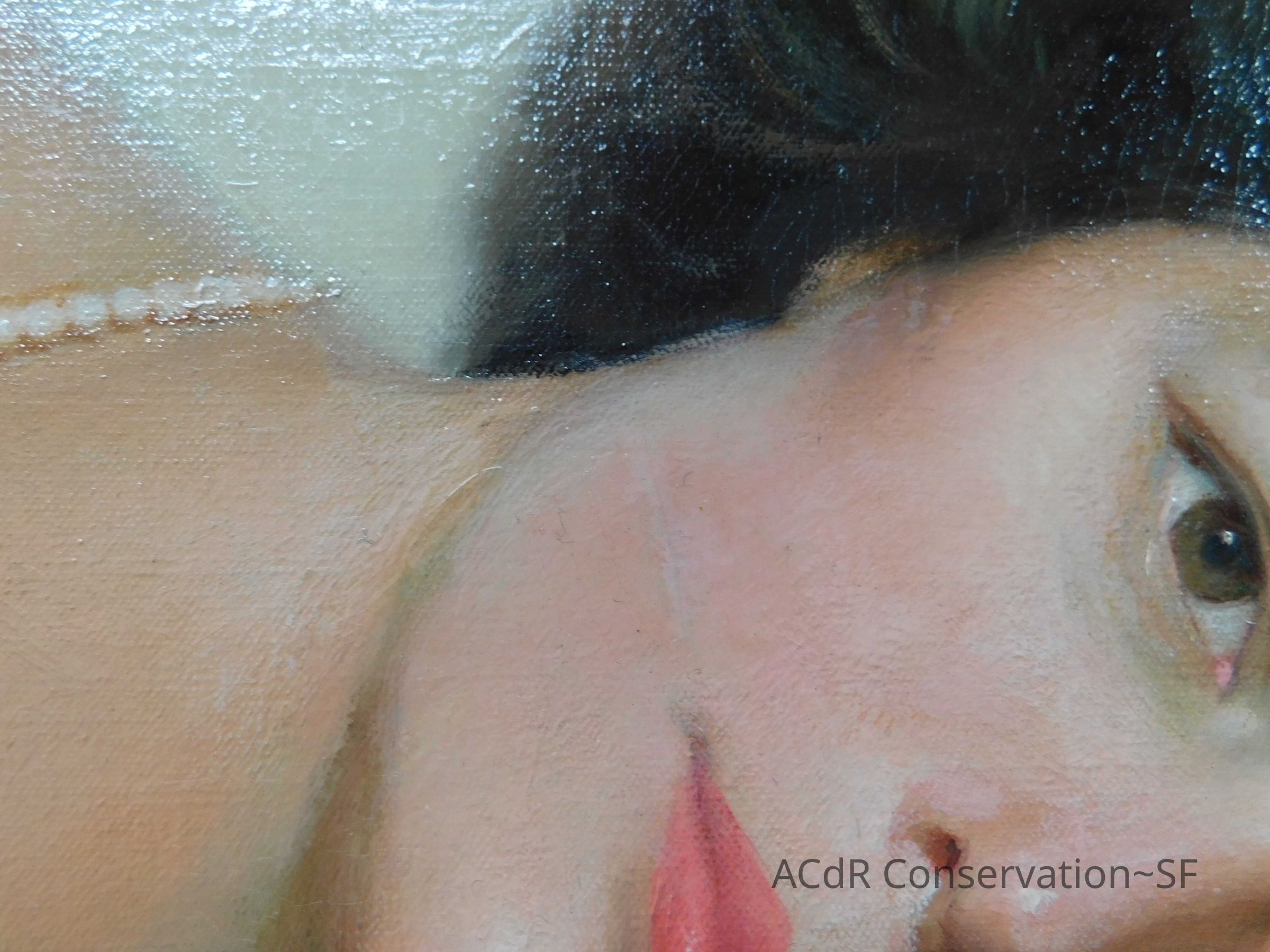 Remove varnish using solvent, especially areas of pooled varnish and where cracks are lifting to remove lint and trapped flyspecks and other materials in varnish. Added matte varnish. Potential for further consolidation.