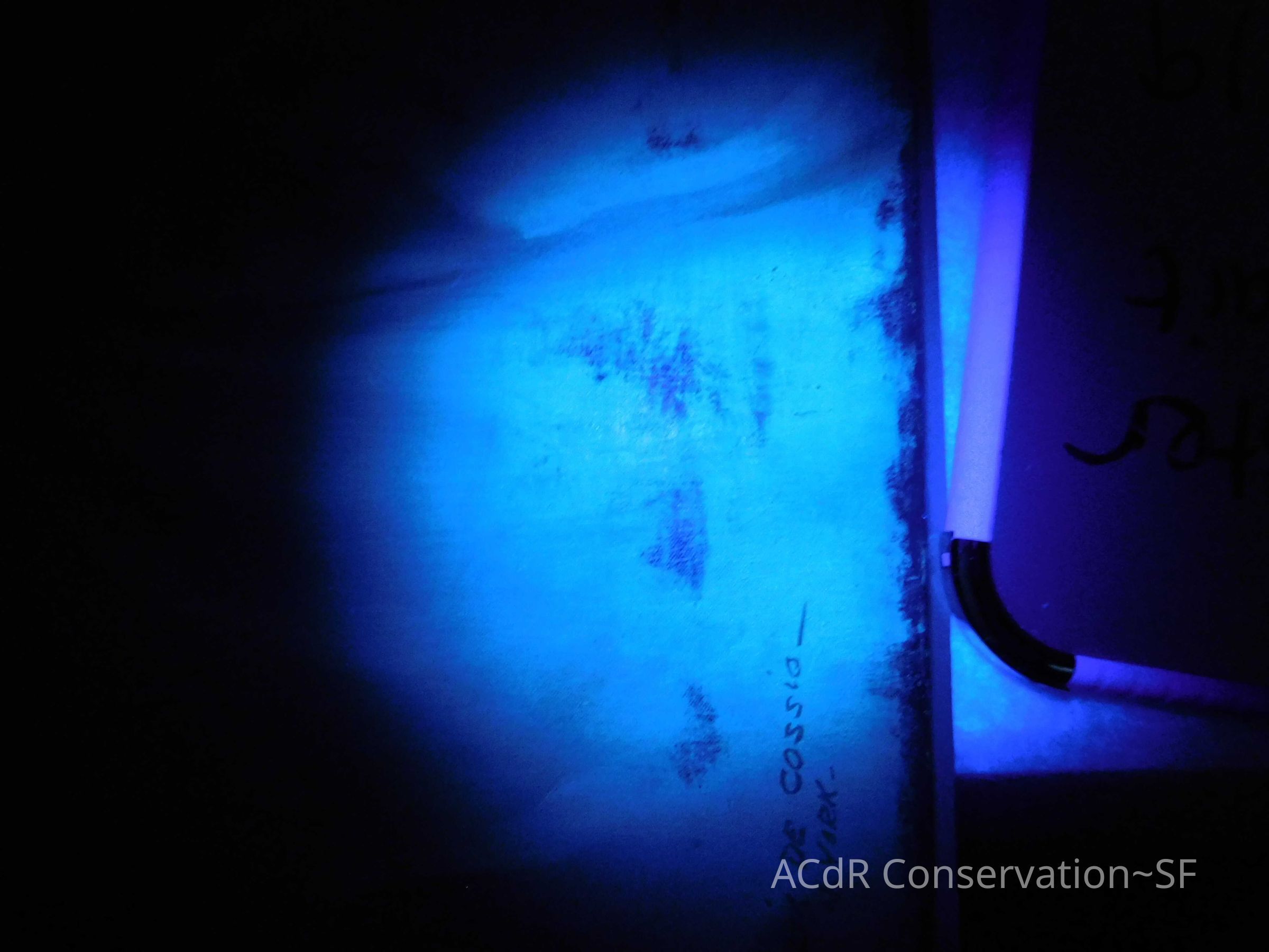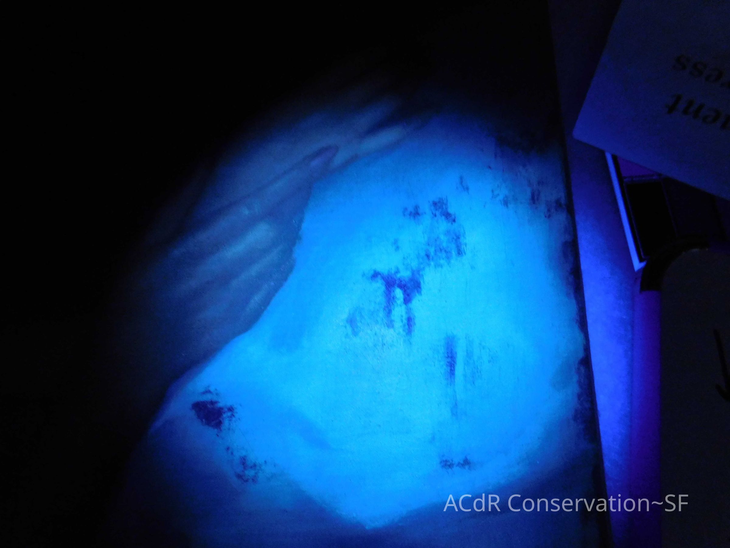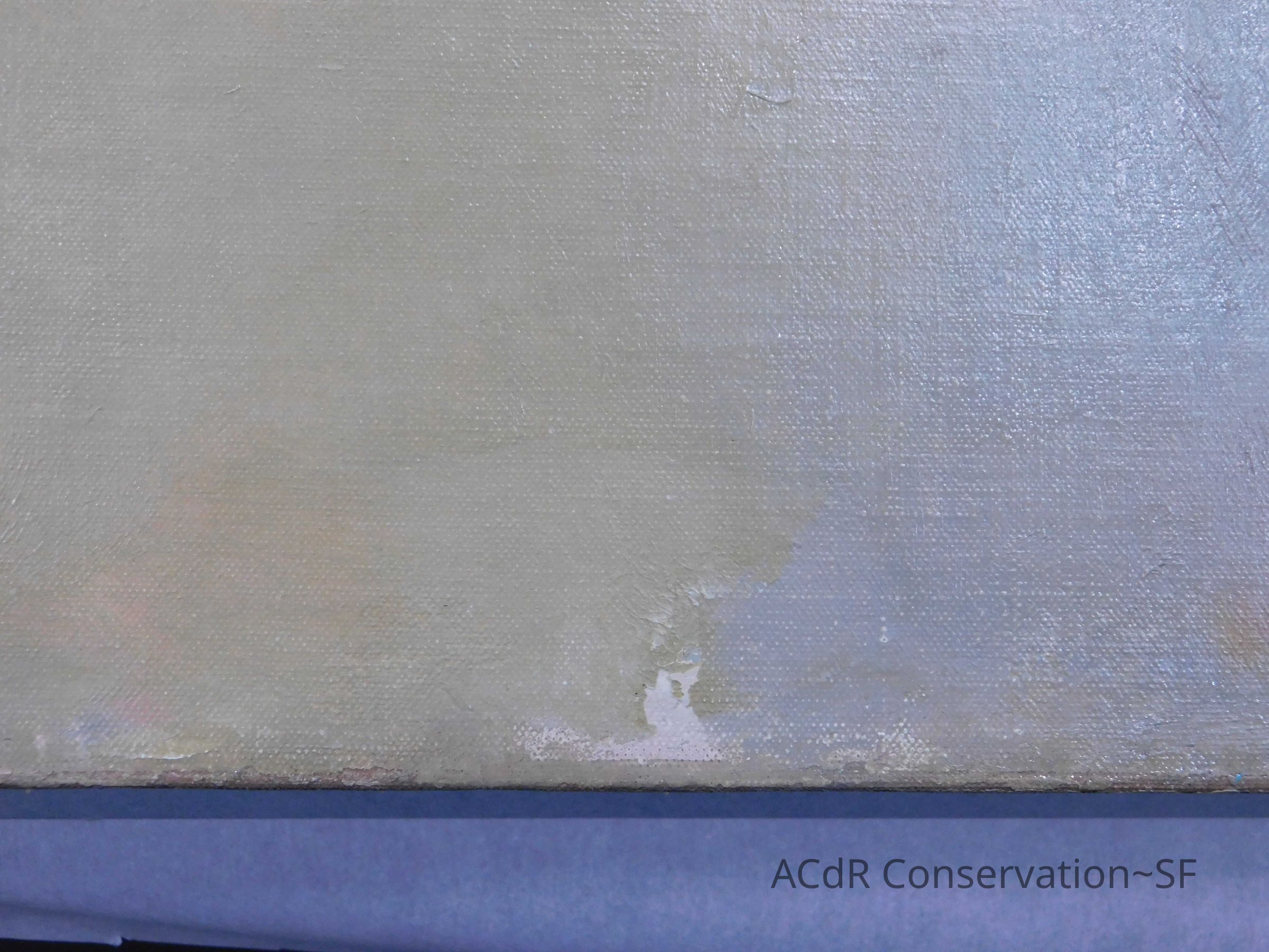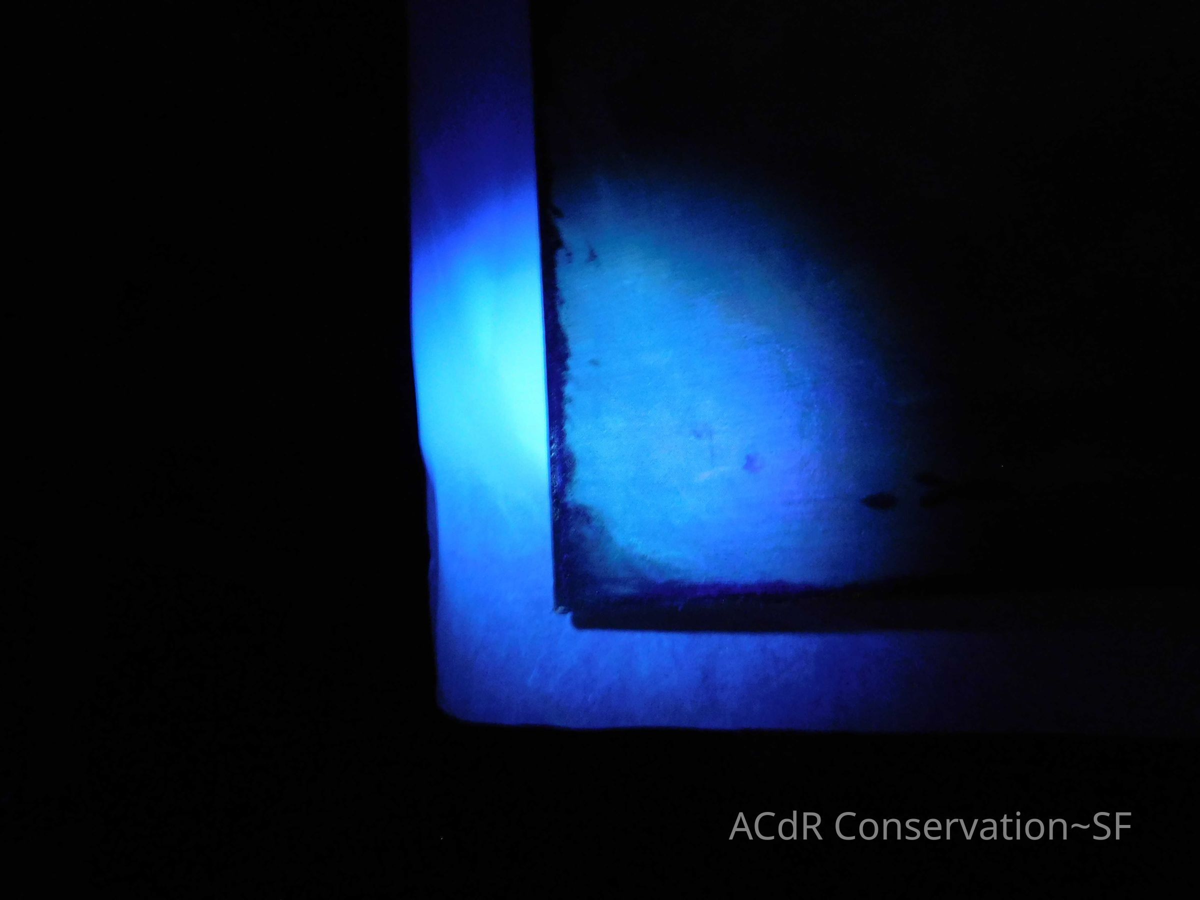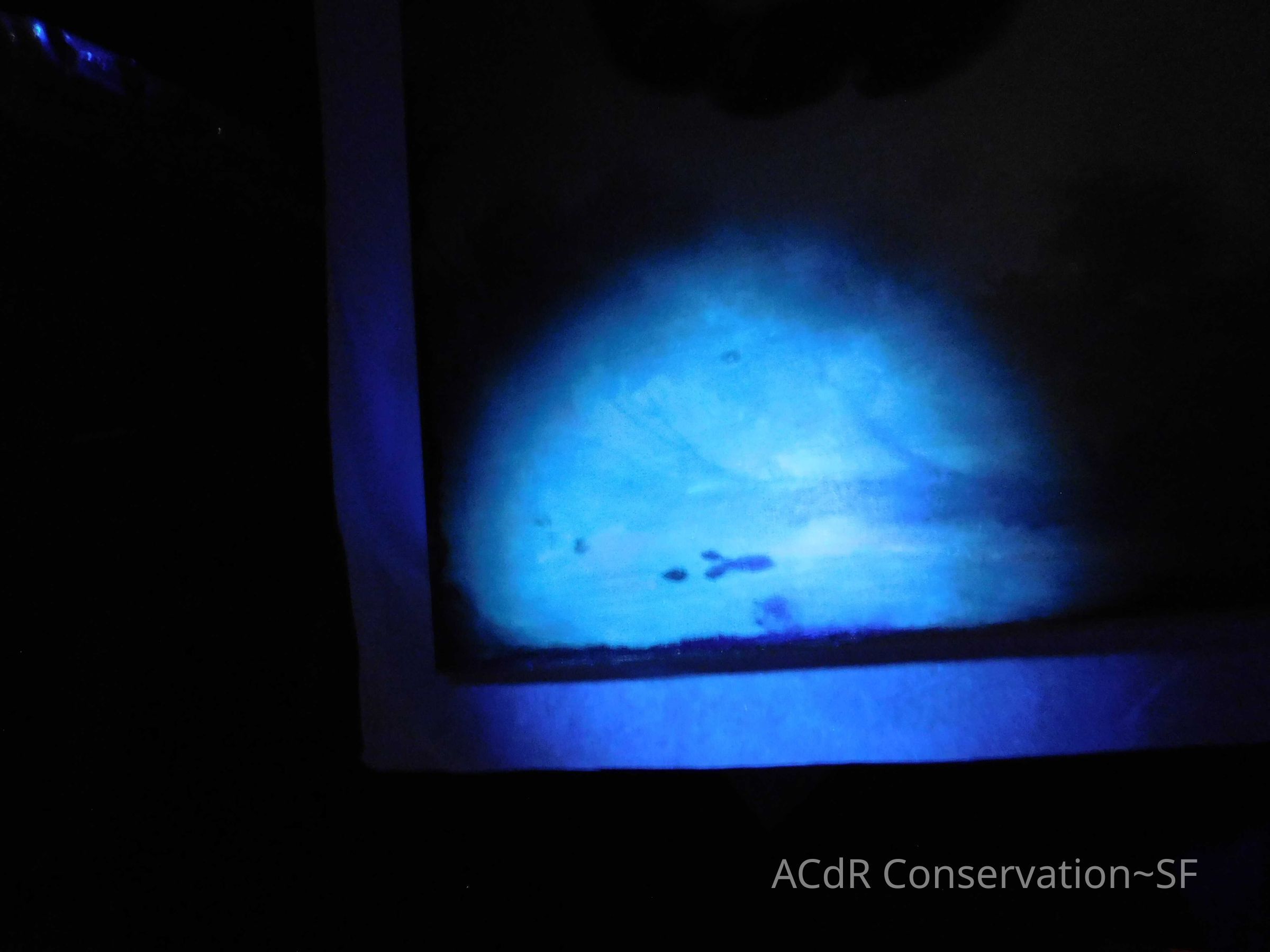 In-filled losses with clear gesso, removed flyspecks with pH adjusted water (8.5). Fills pared back to be level with surface. Barrier layer of Larapol, in-painting with watercolor. Removed adhesive substance of top edge with Naptha. May be the same material as the varnish removed from the painting’s surface. It pulls away like PVA residue. In-painting using Bremer and Daniel Smith watercolors.