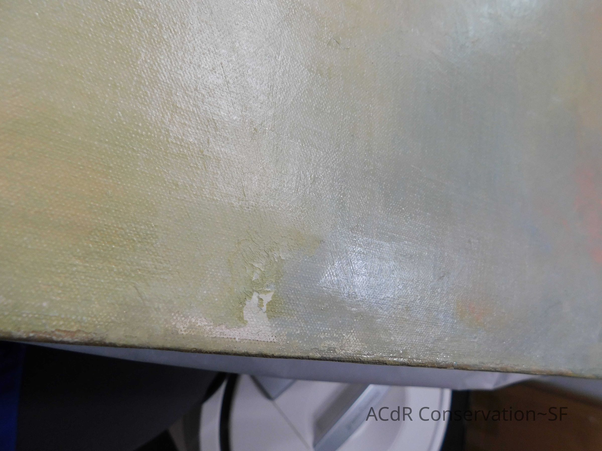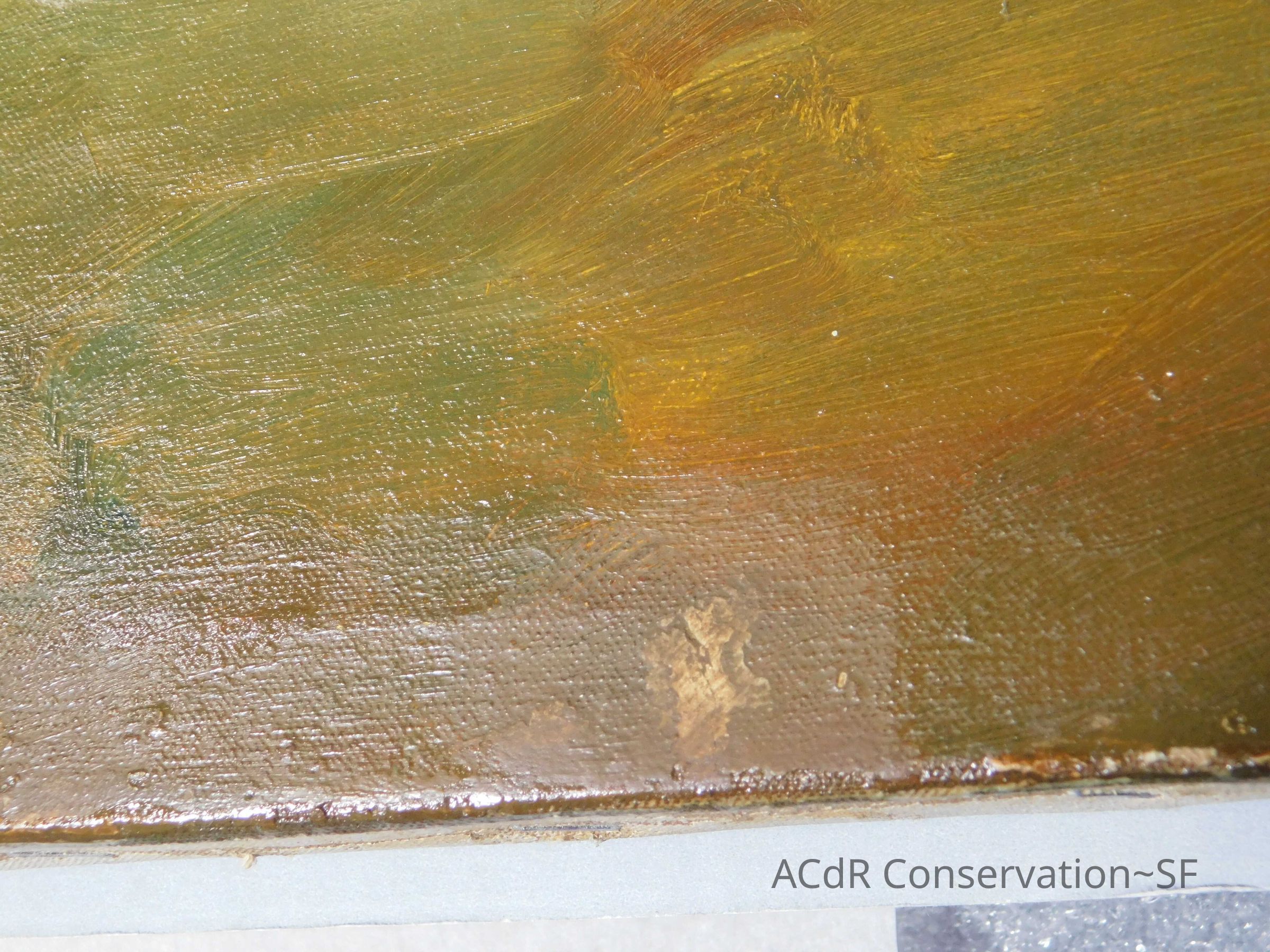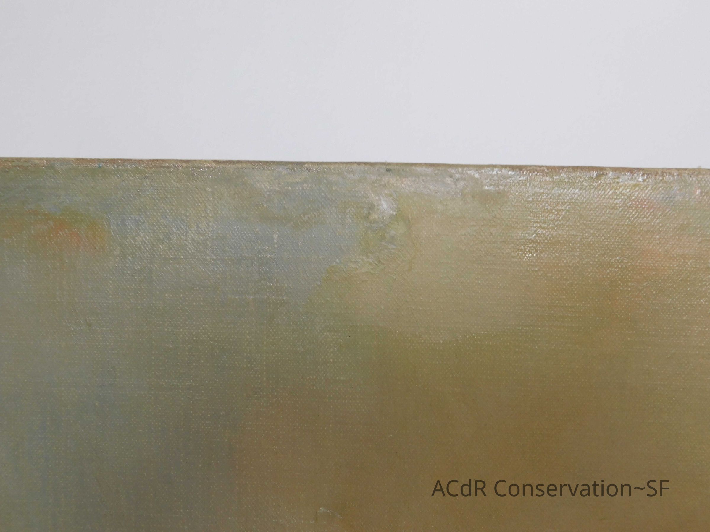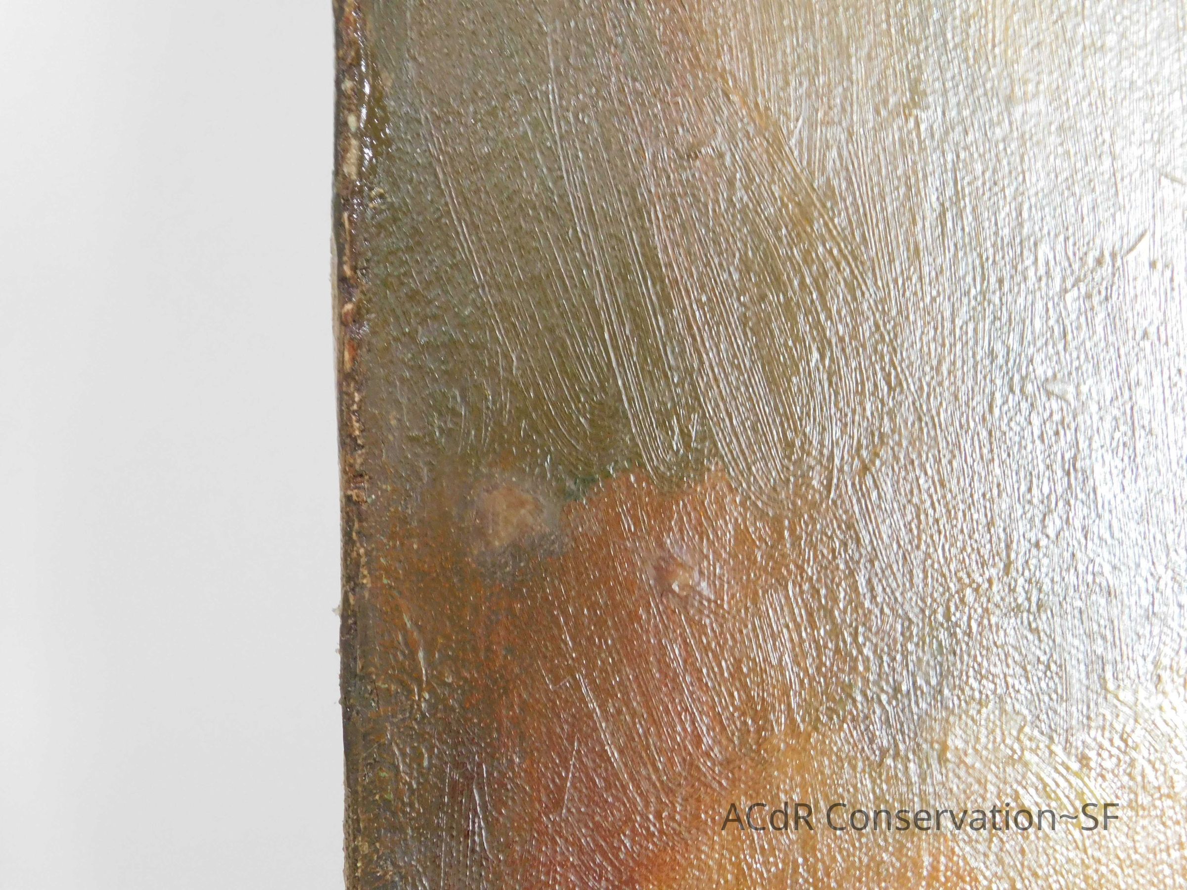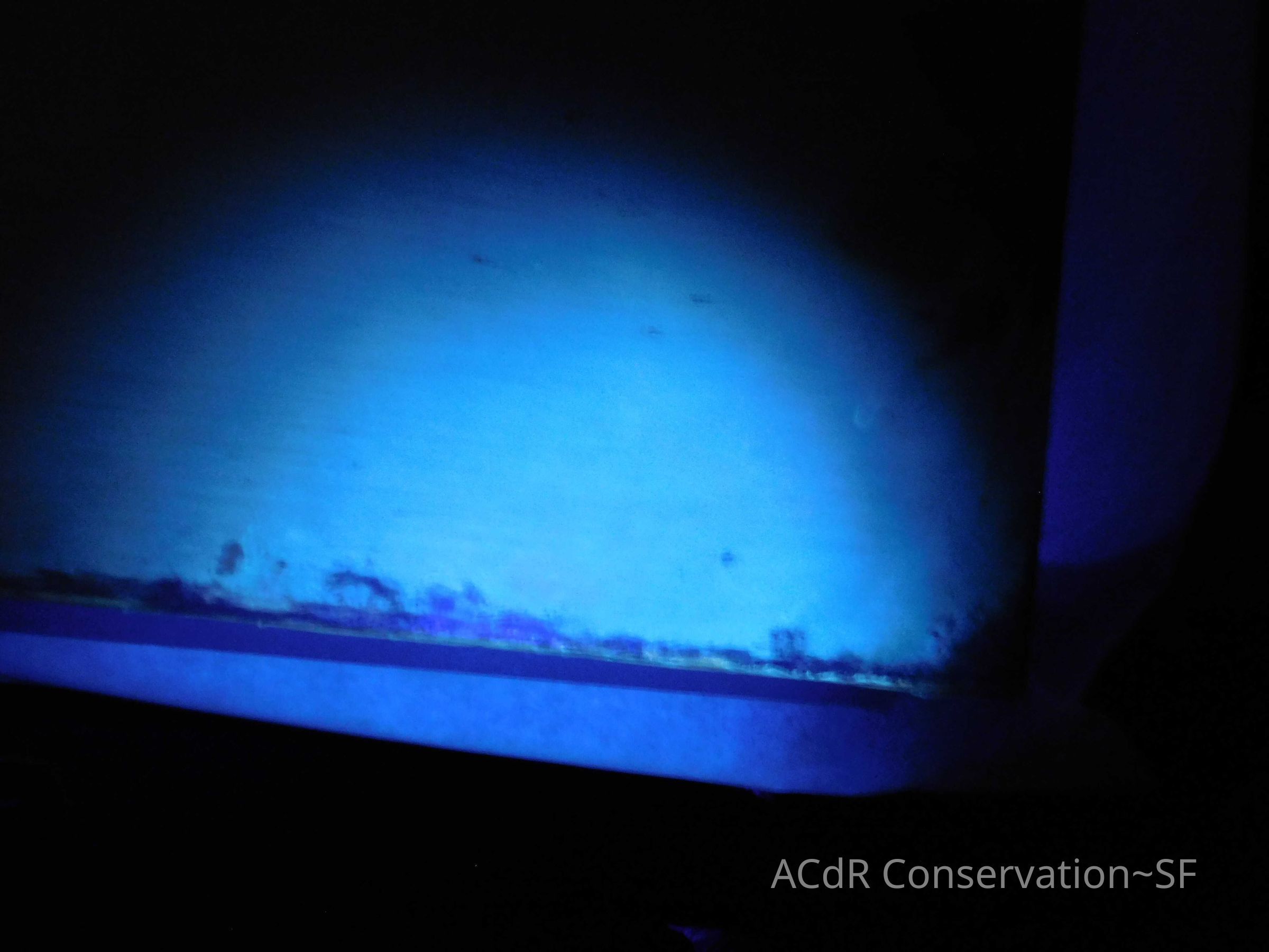 In-filled losses with clear gesso, removed flyspecks with pH adjusted water (8.5). Fills pared back to be level with surface. Barrier layer of Larapol, in-painting with watercolor. Removed adhesive substance of top edge with Naptha. May be the same material as the varnish removed from the painting’s surface. It pulls away like PVA residue. In-painting using Bremer and Daniel Smith watercolors.