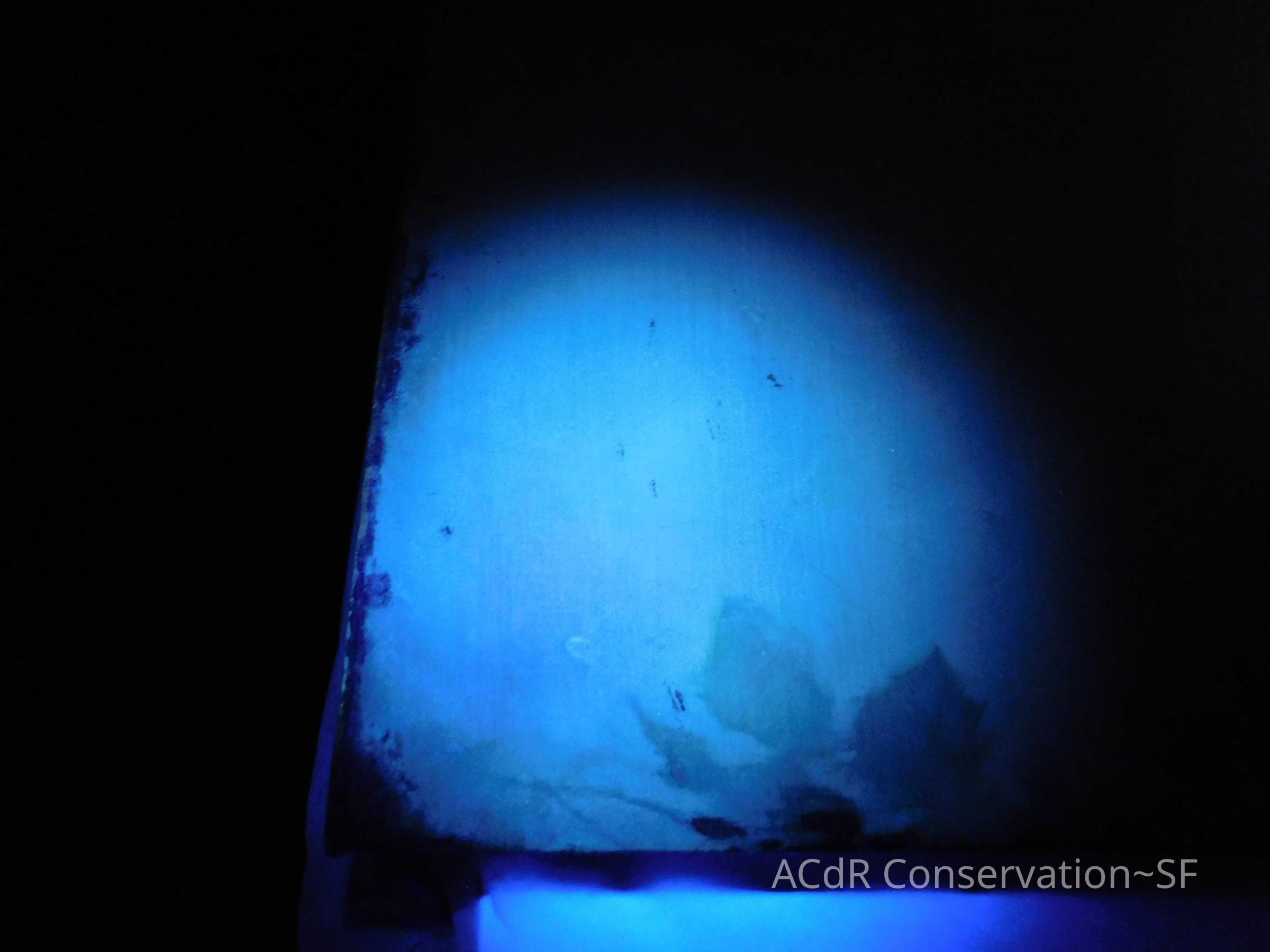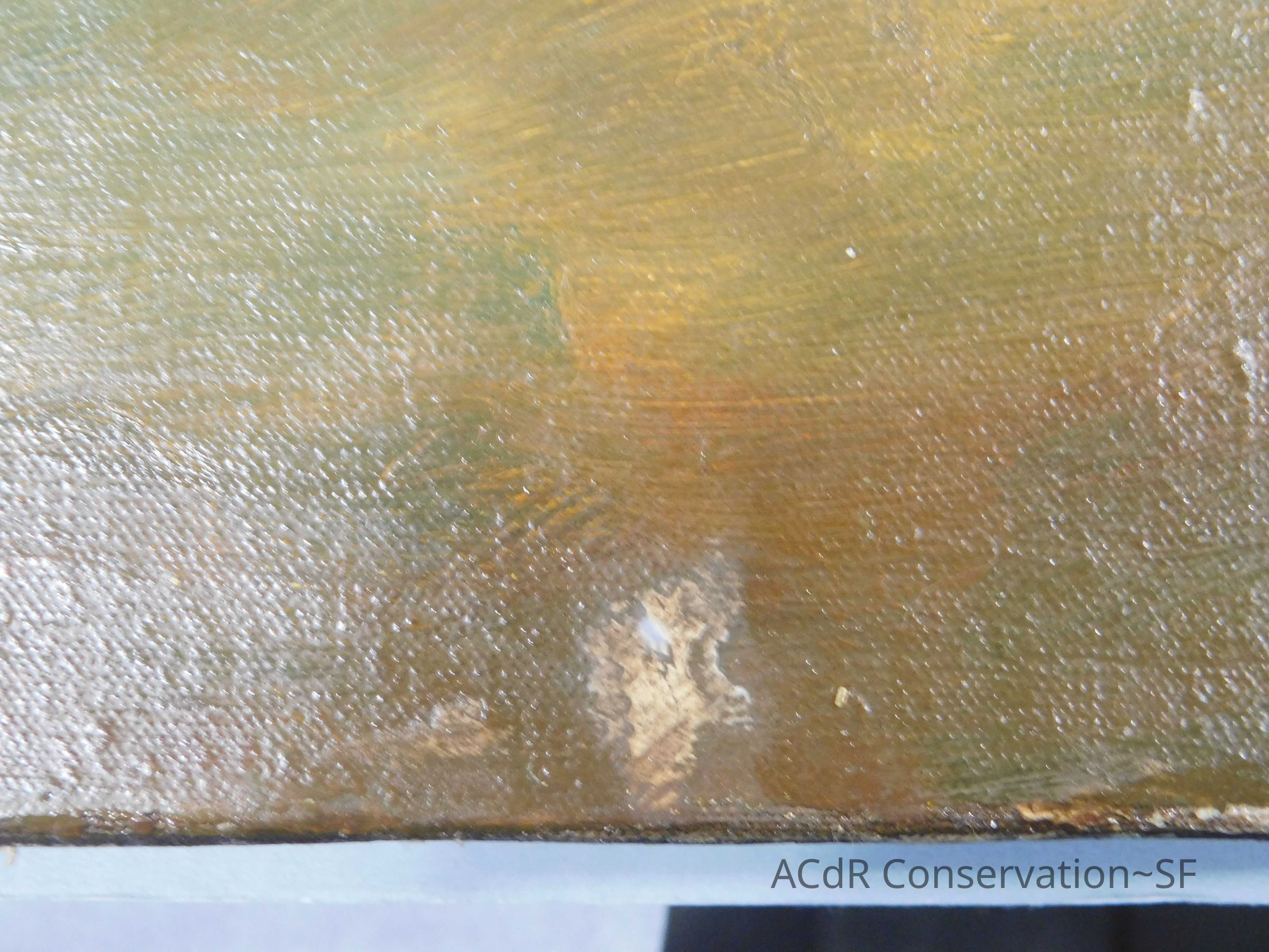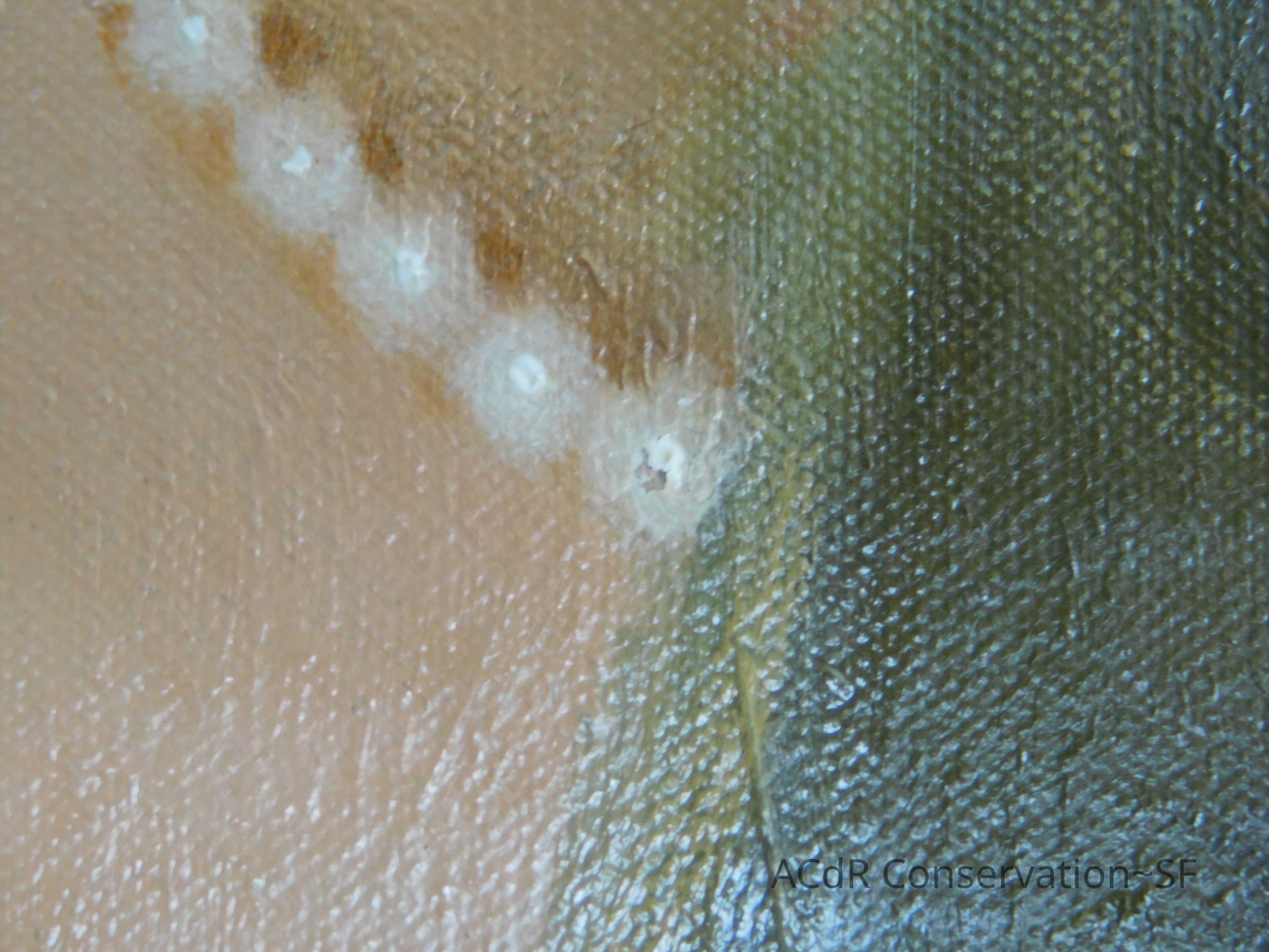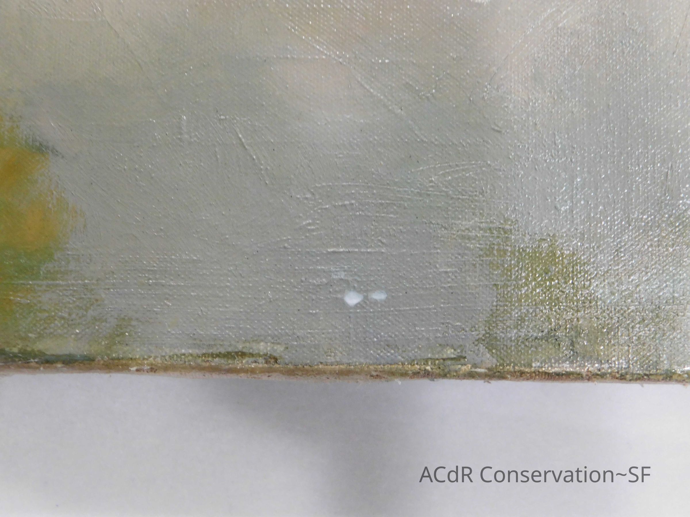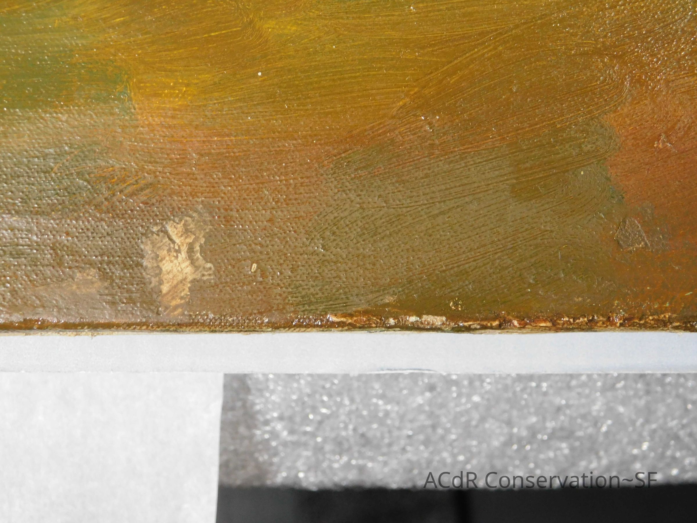 In-filled losses with clear gesso, removed flyspecks with pH adjusted water (8.5). Fills pared back to be level with surface. Barrier layer of Larapol, in-painting with watercolor. Removed adhesive substance of top edge with Naptha. May be the same material as the varnish removed from the painting’s surface. It pulls away like PVA residue. In-painting using Bremer and Daniel Smith watercolors.