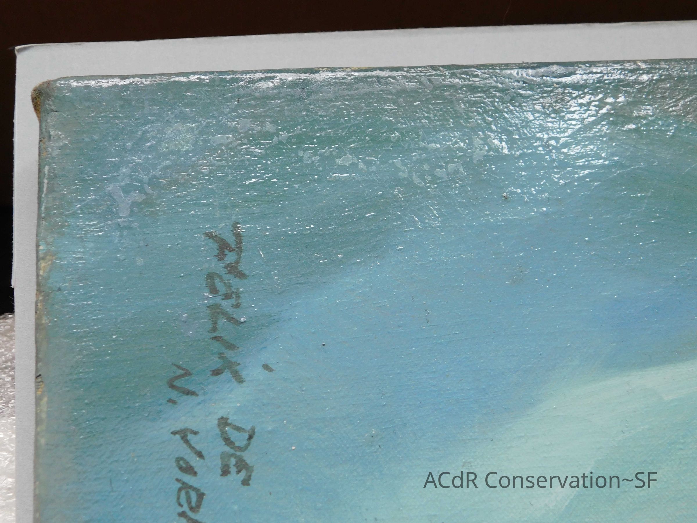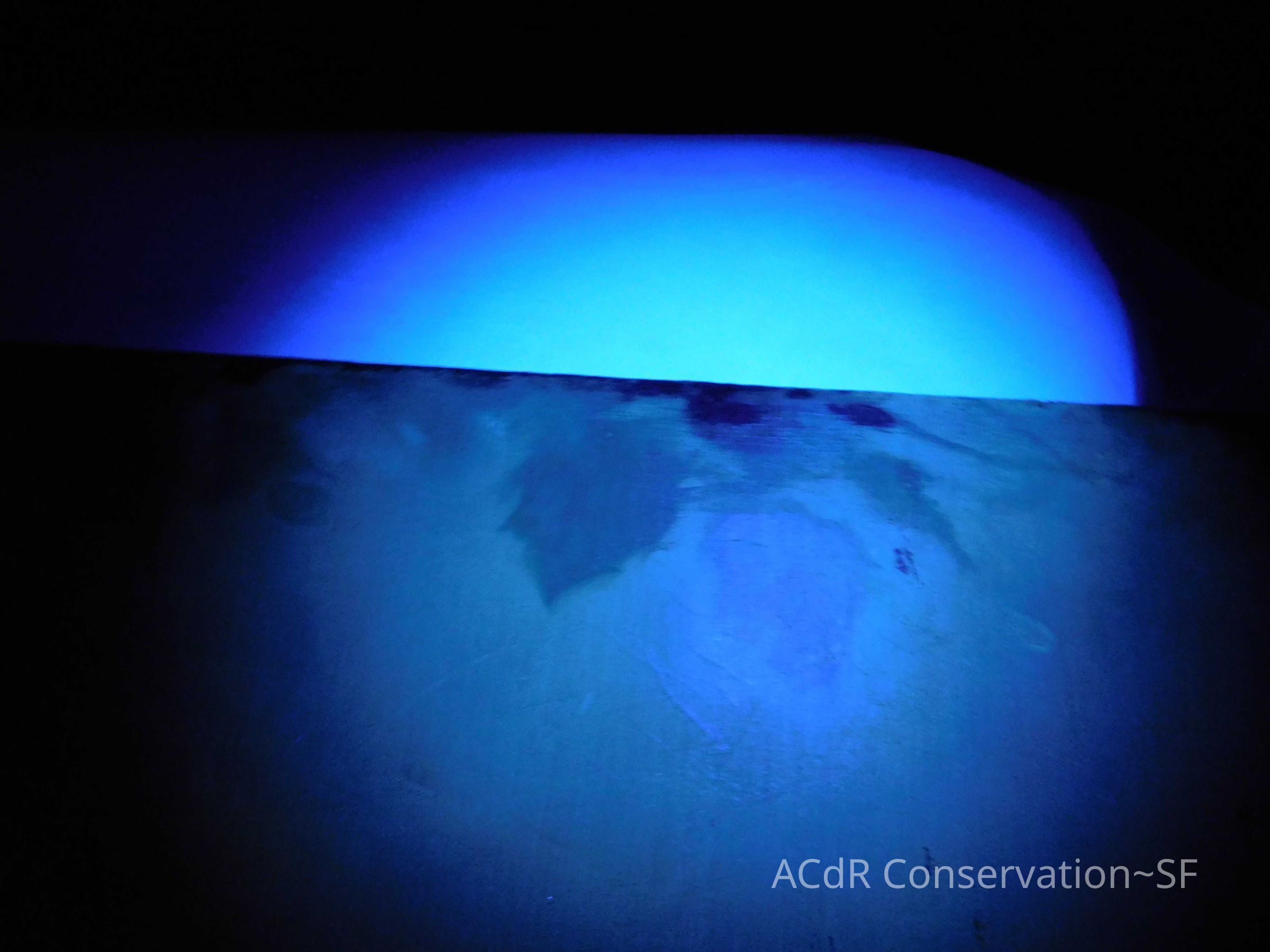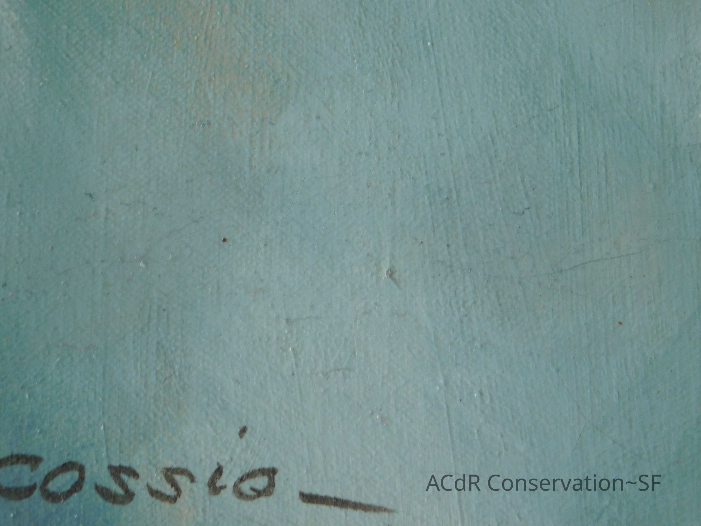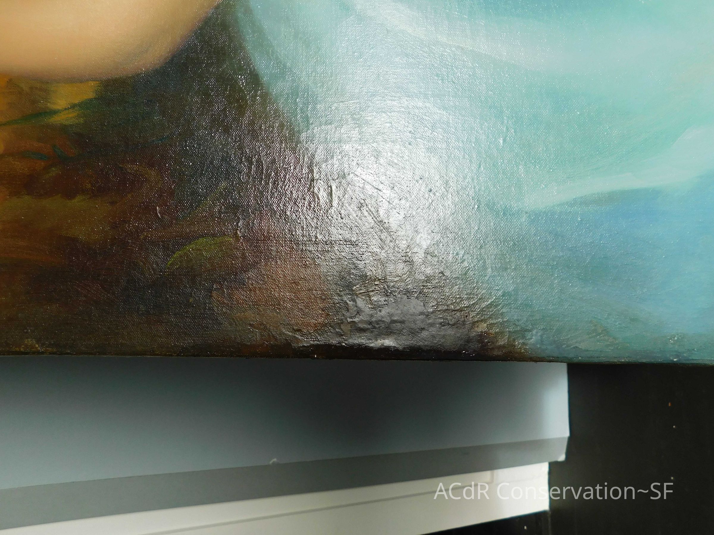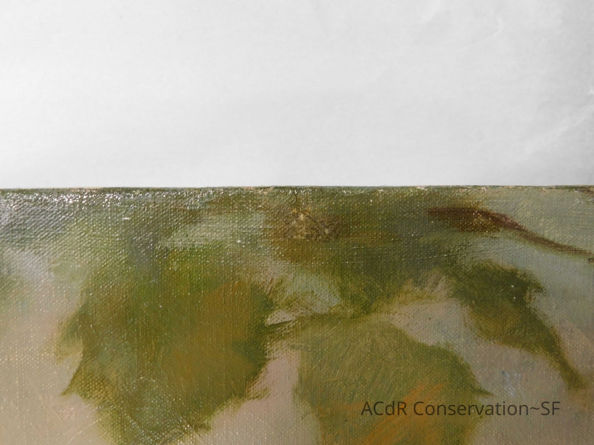 In-filled losses with clear gesso, removed flyspecks with pH adjusted water (8.5). Fills pared back to be level with surface. Barrier layer of Larapol, in-painting with watercolor. Removed adhesive substance of top edge with Naptha. May be the same material as the varnish removed from the painting’s surface. It pulls away like PVA residue. In-painting using Bremer and Daniel Smith watercolors.
