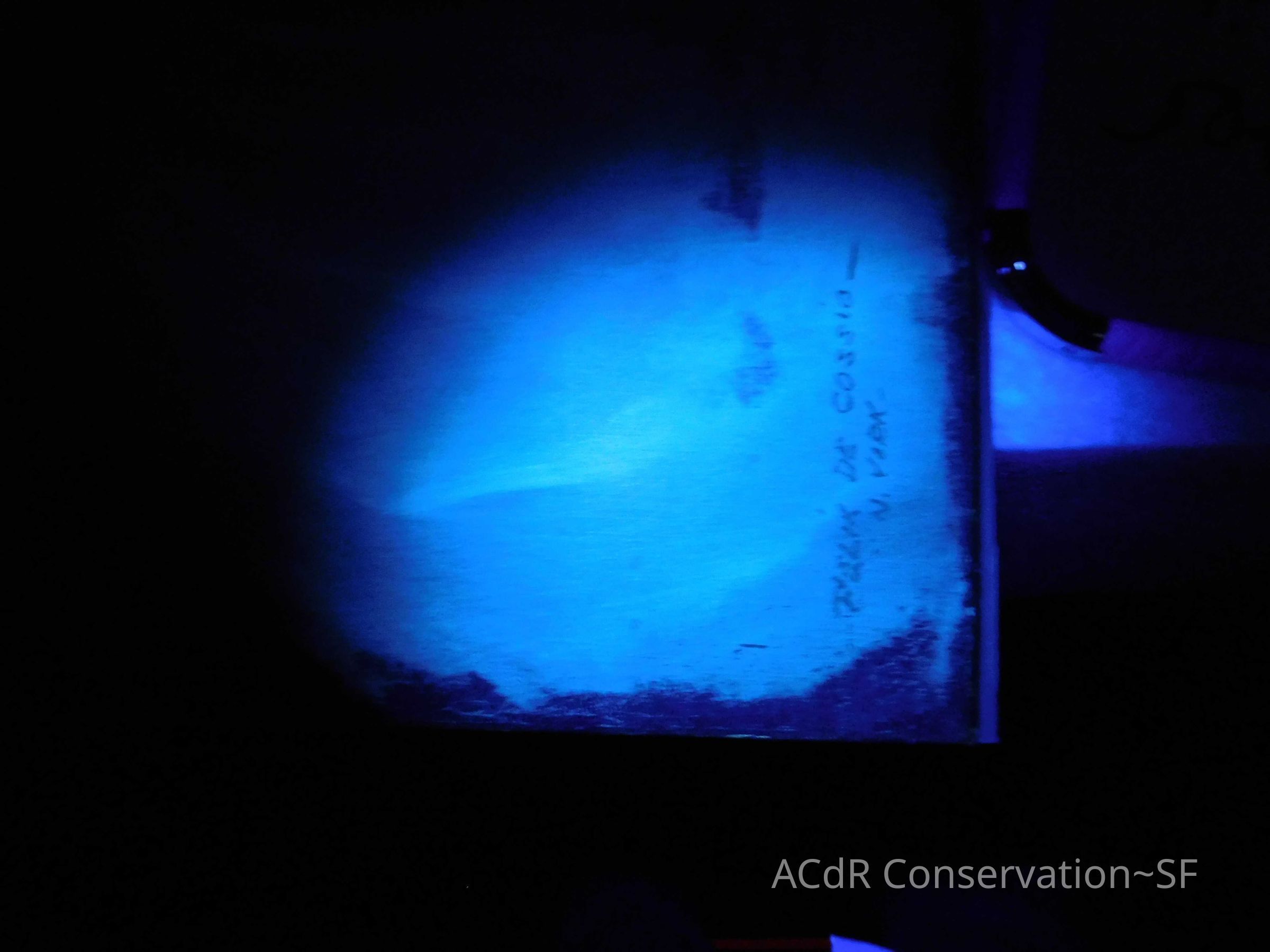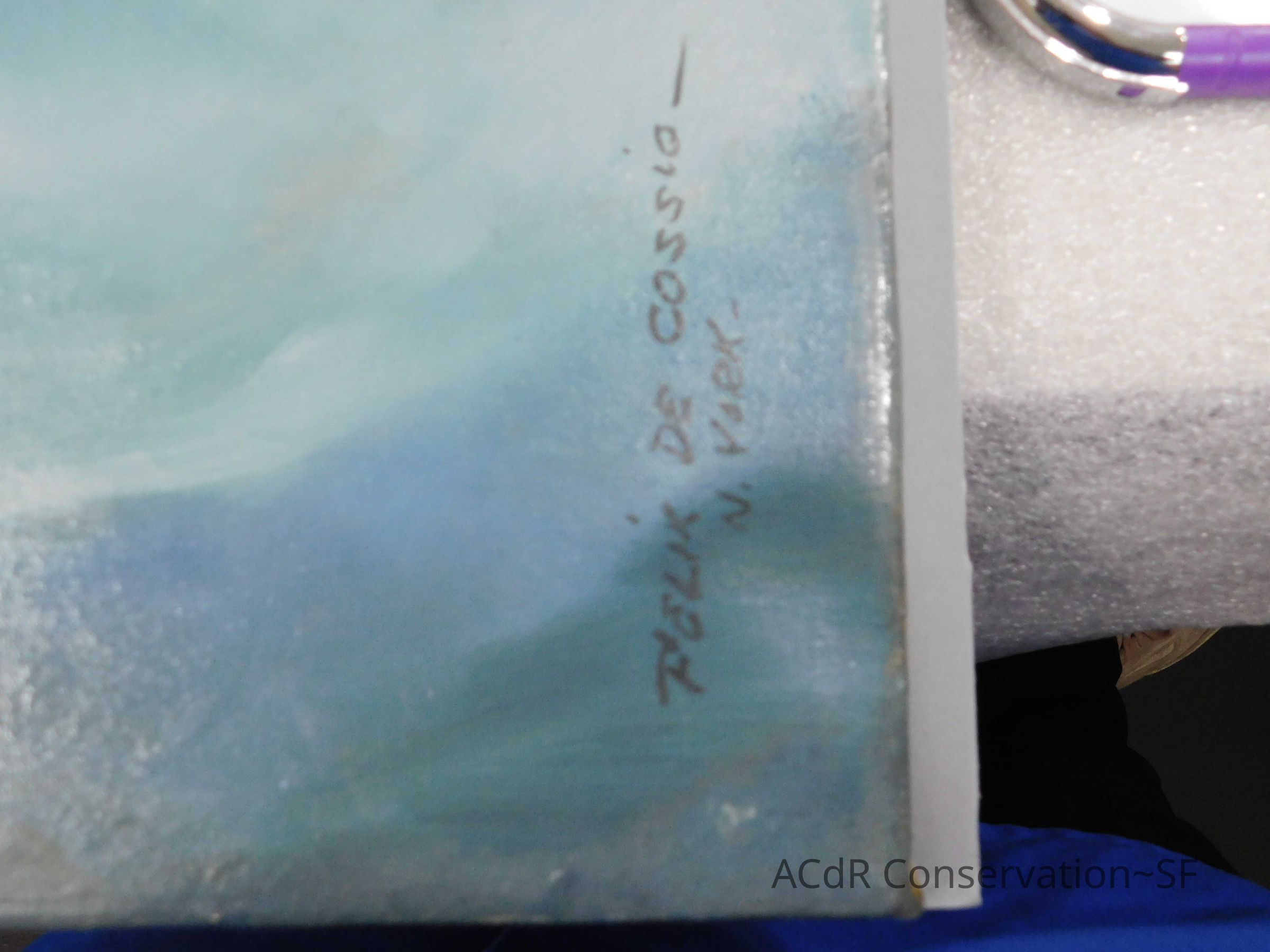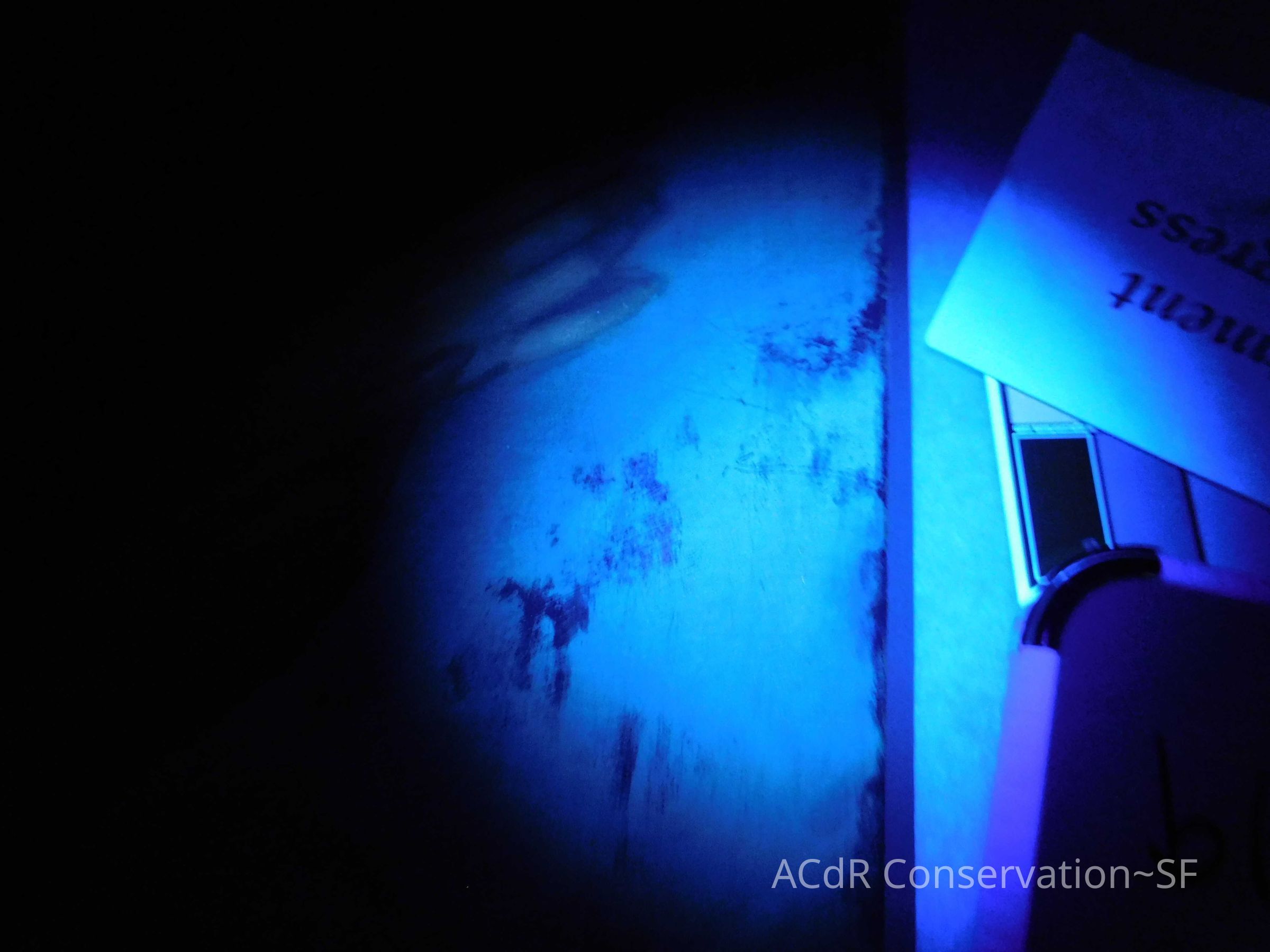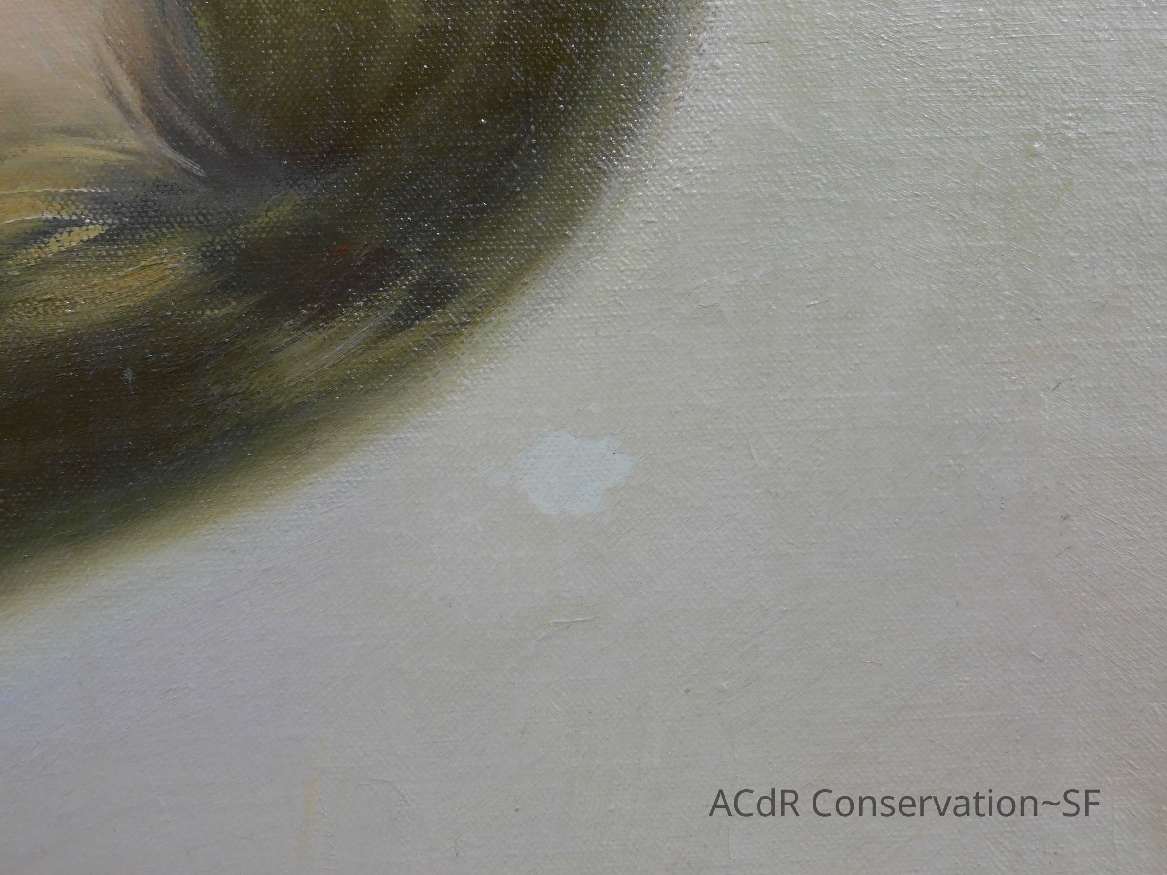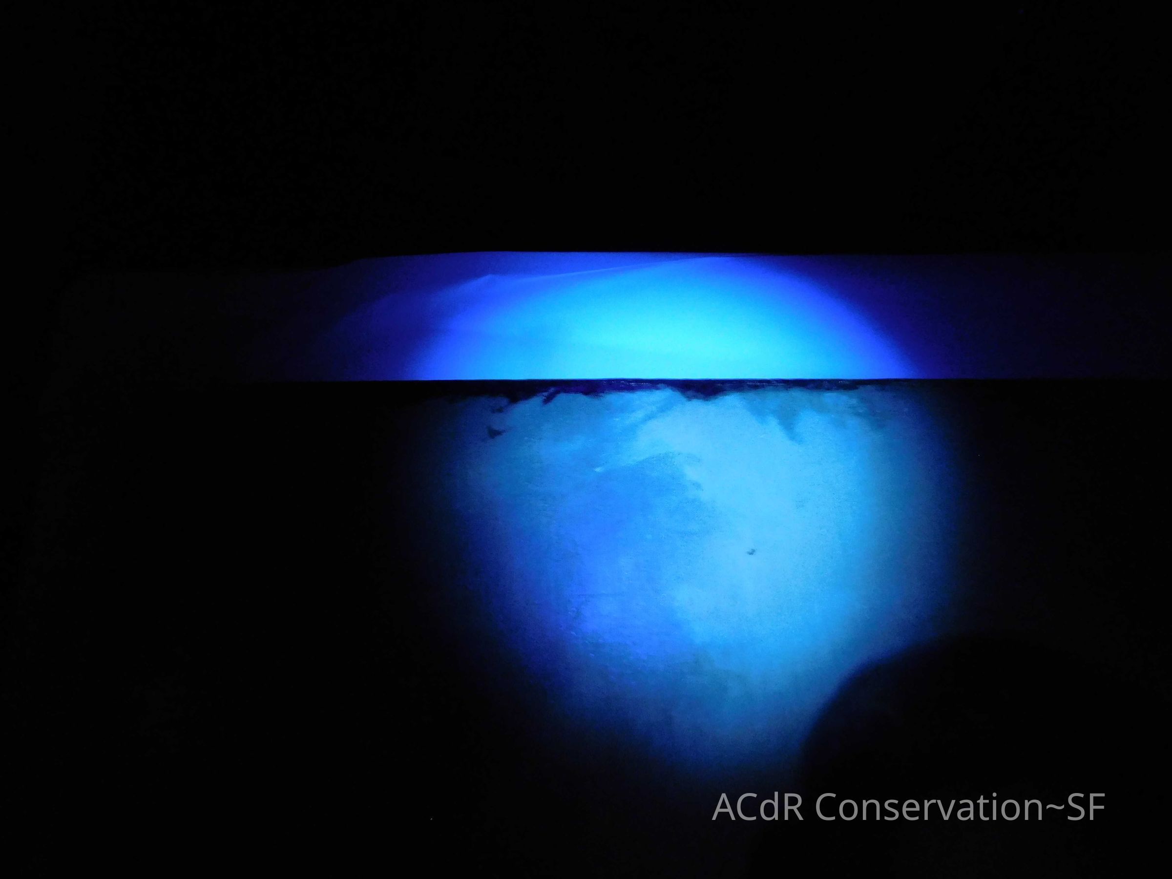 In-filled losses with clear gesso, removed flyspecks with pH adjusted water (8.5). Fills pared back to be level with surface. Barrier layer of Larapol, in-painting with watercolor. Removed adhesive substance of top edge with Naptha. May be the same material as the varnish removed from the painting’s surface. It pulls away like PVA residue. In-painting using Bremer and Daniel Smith watercolors.