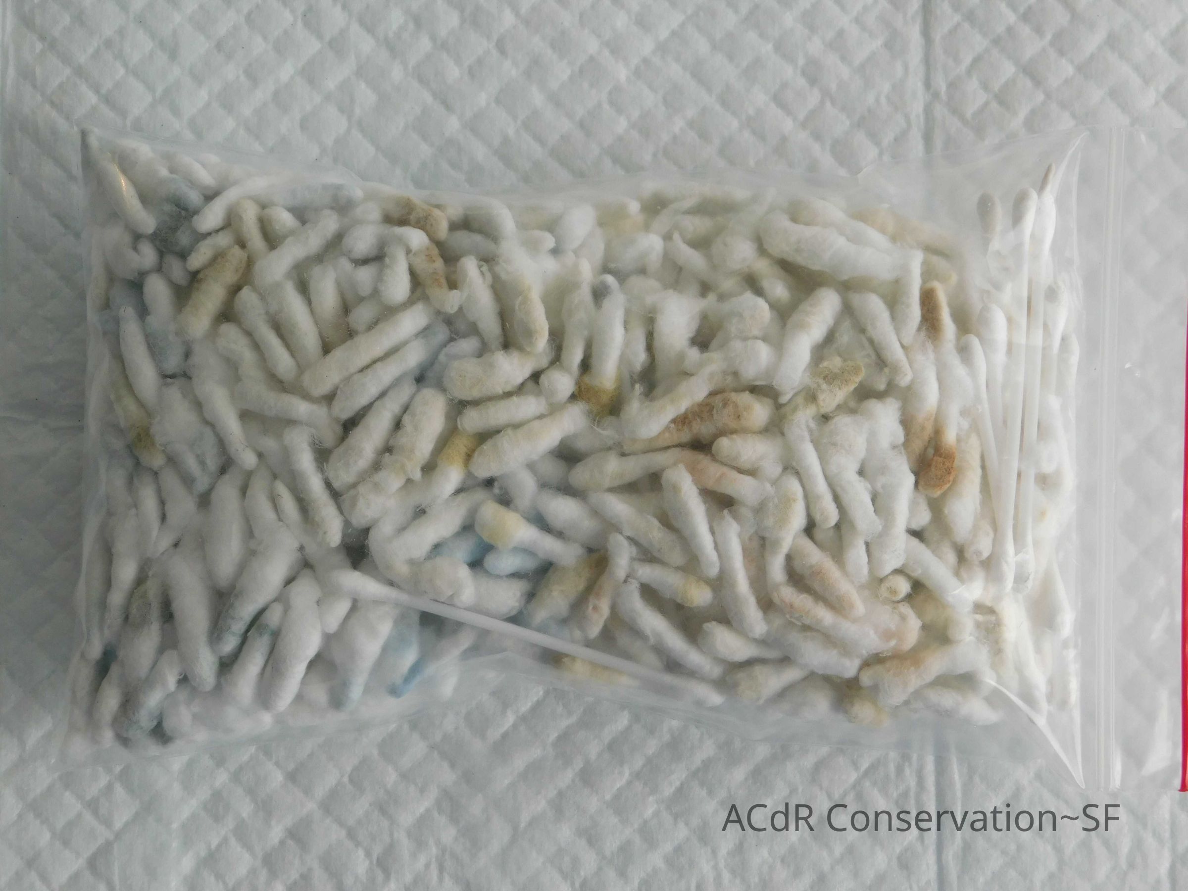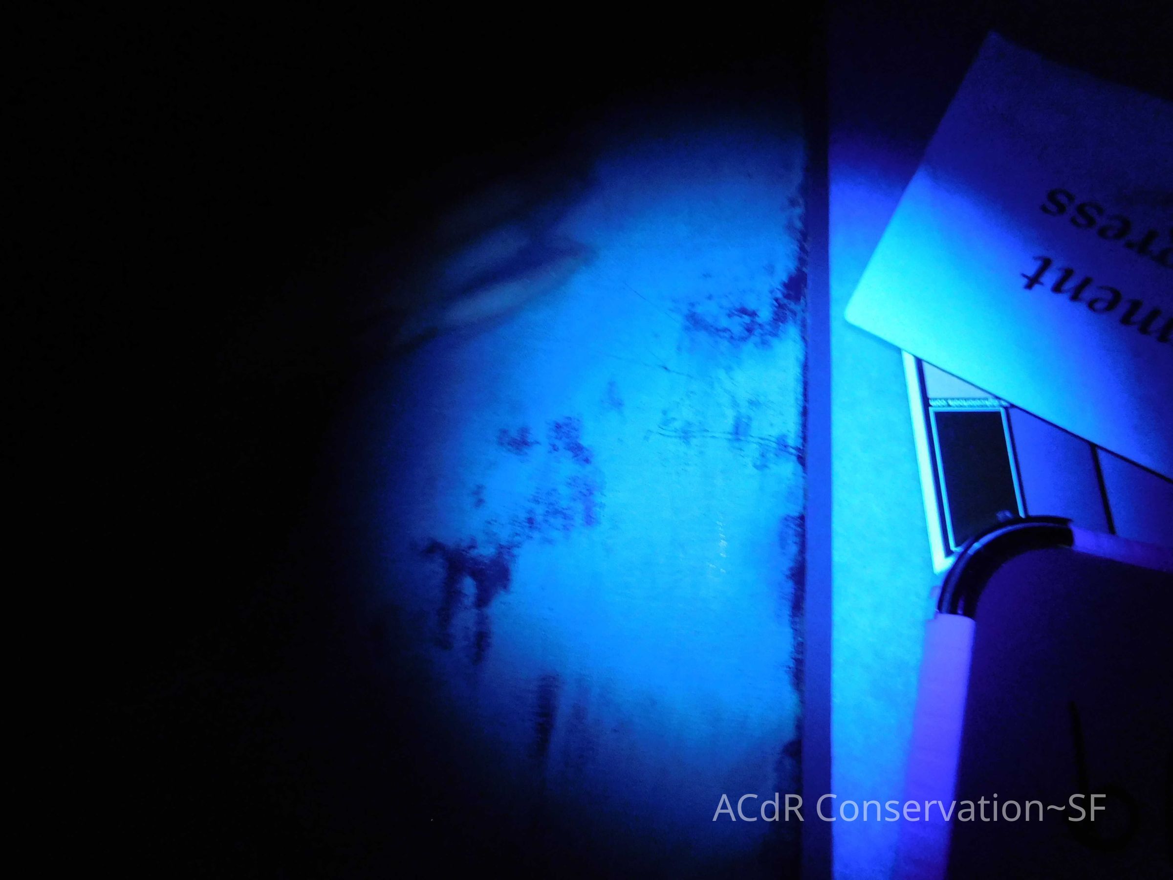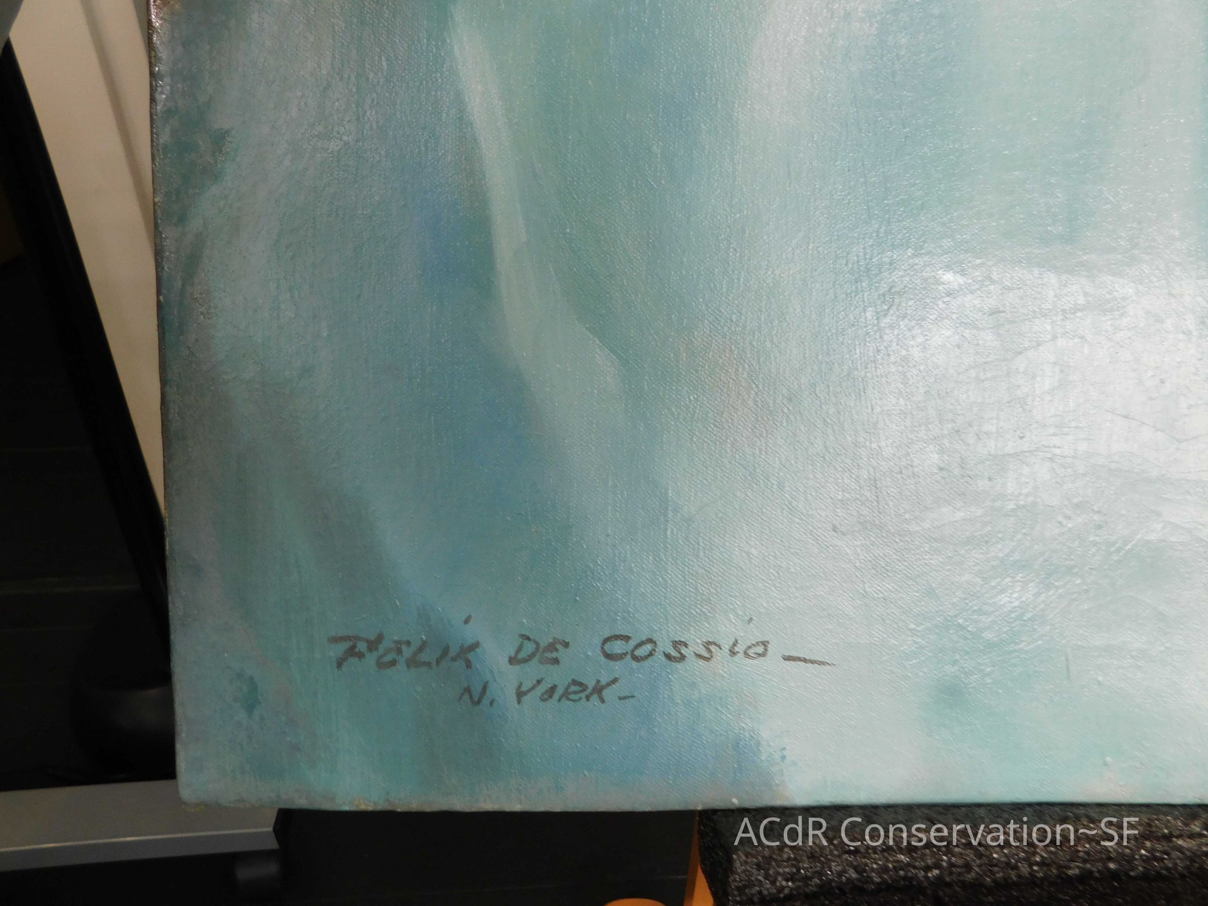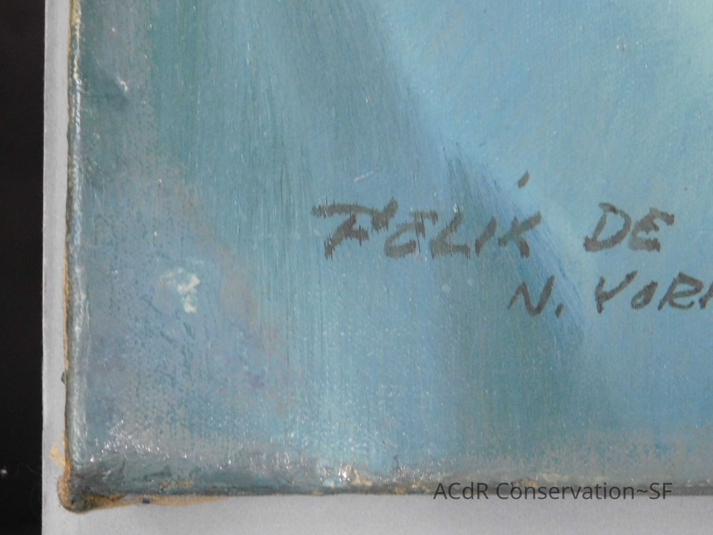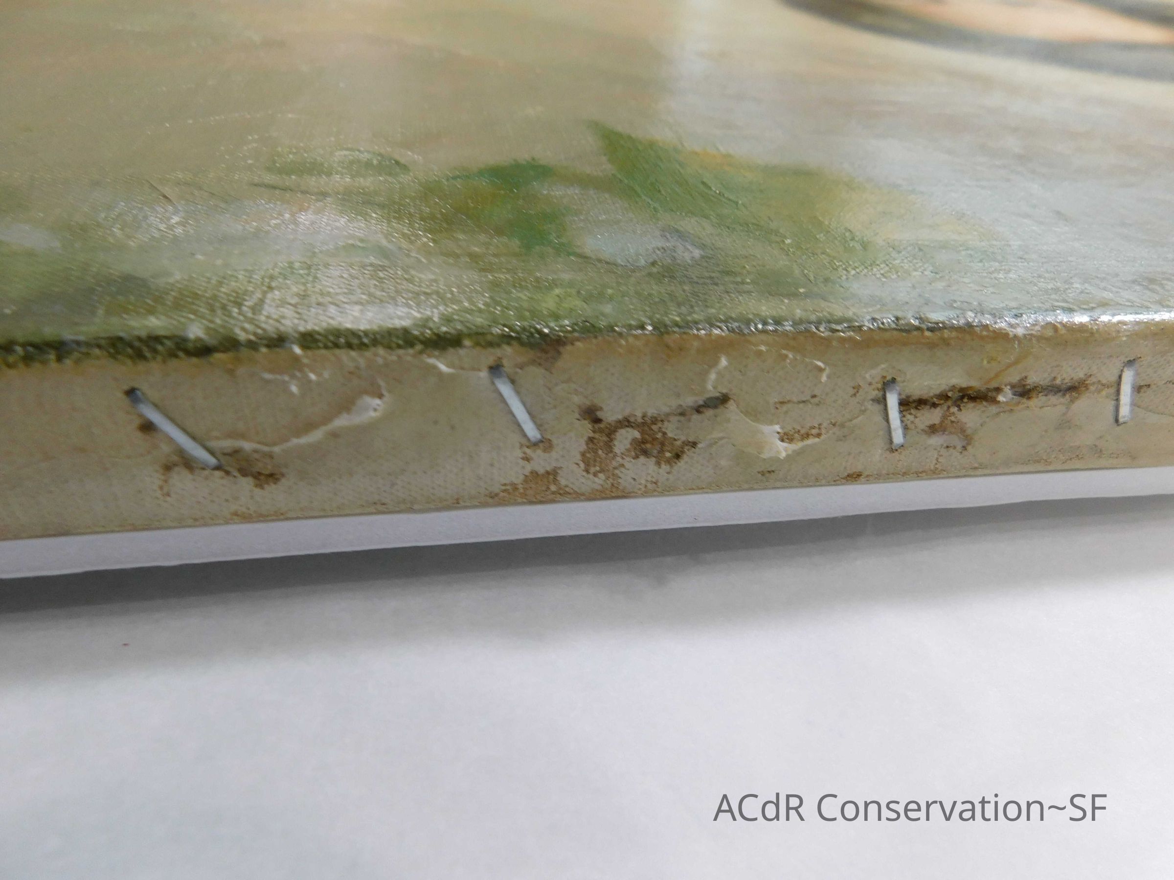 In-filled losses with clear gesso, removed flyspecks with pH adjusted water (8.5). Fills pared back to be level with surface. Barrier layer of Larapol, in-painting with watercolor. Removed adhesive substance of top edge with Naptha. May be the same material as the varnish removed from the painting’s surface. It pulls away like PVA residue. In-painting using Bremer and Daniel Smith watercolors.