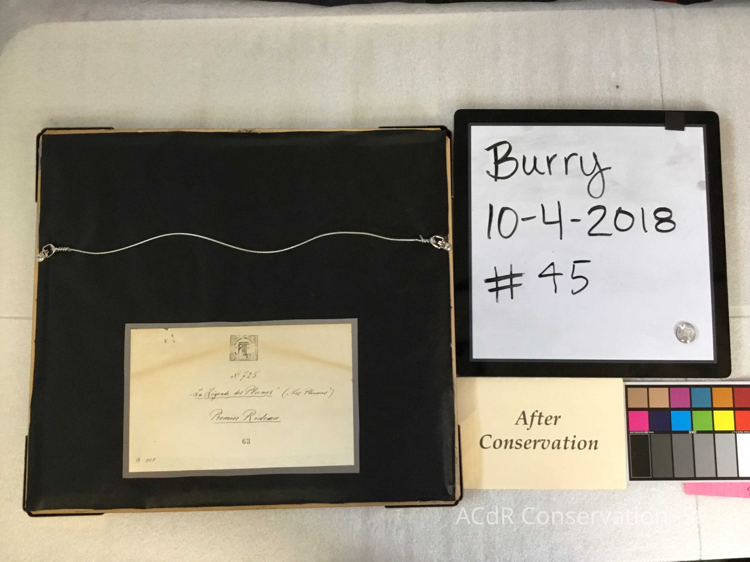 Project Gallery Go back Prev Next Les Plumes PrintEntry/Object ID#45ConservationConservation PurposeDisaster RecoveryTreatmentAcute TreatmentCO2 AnoxiaDate(s)Jul 10, 2018 - Aug 23, 2018Acute TreatmentGeneral CleaningDate(s)Oct 4, 2018