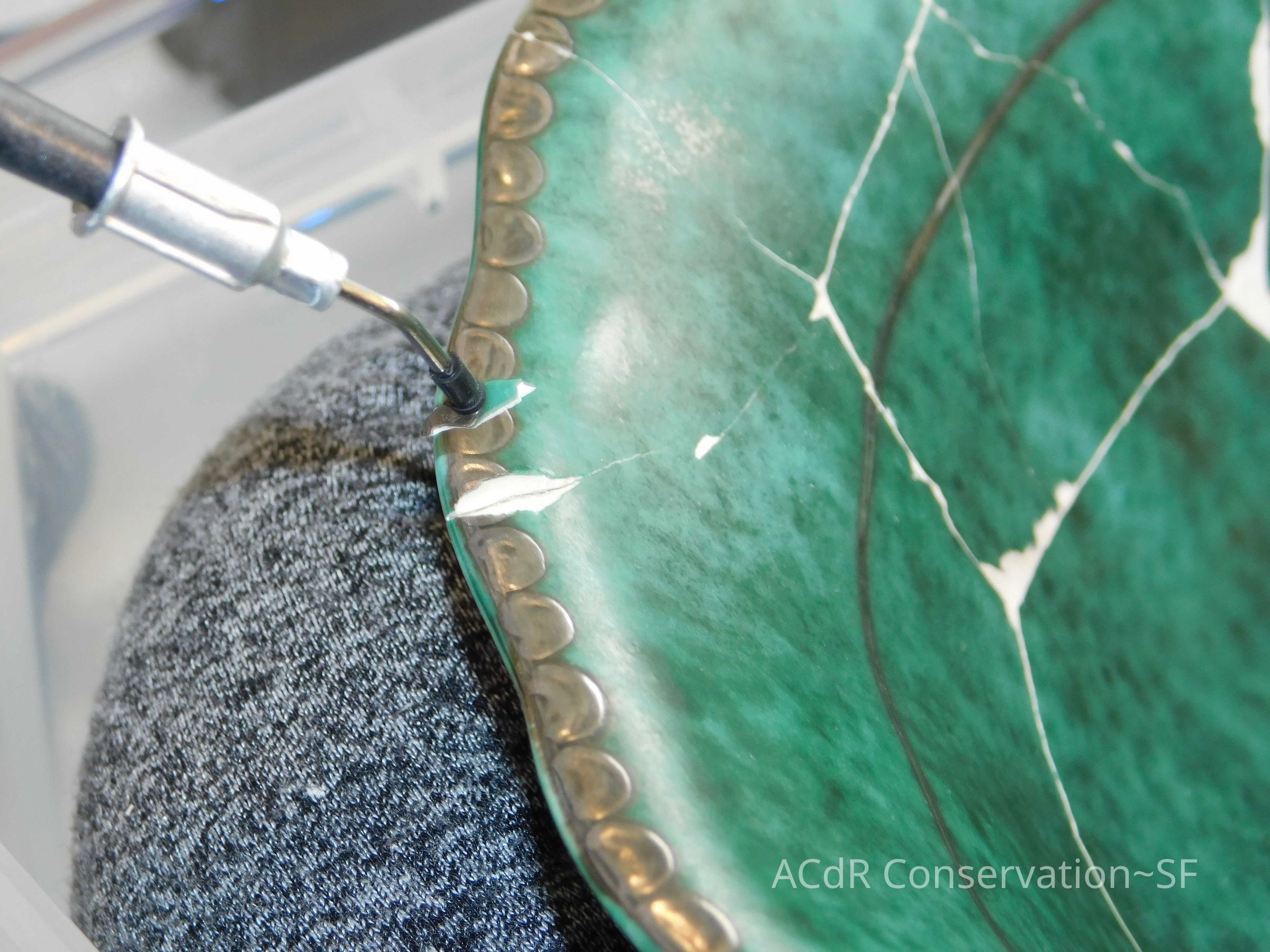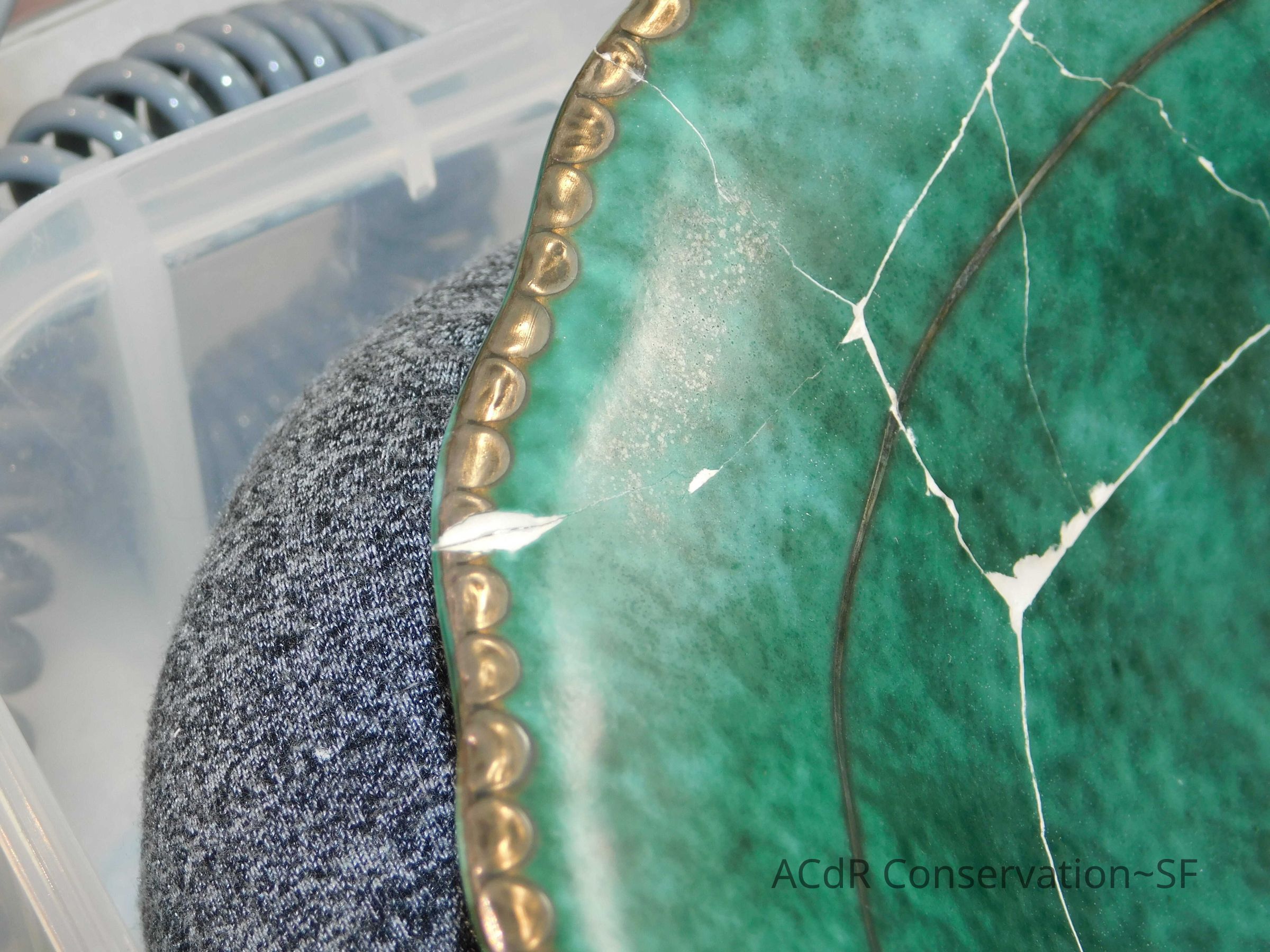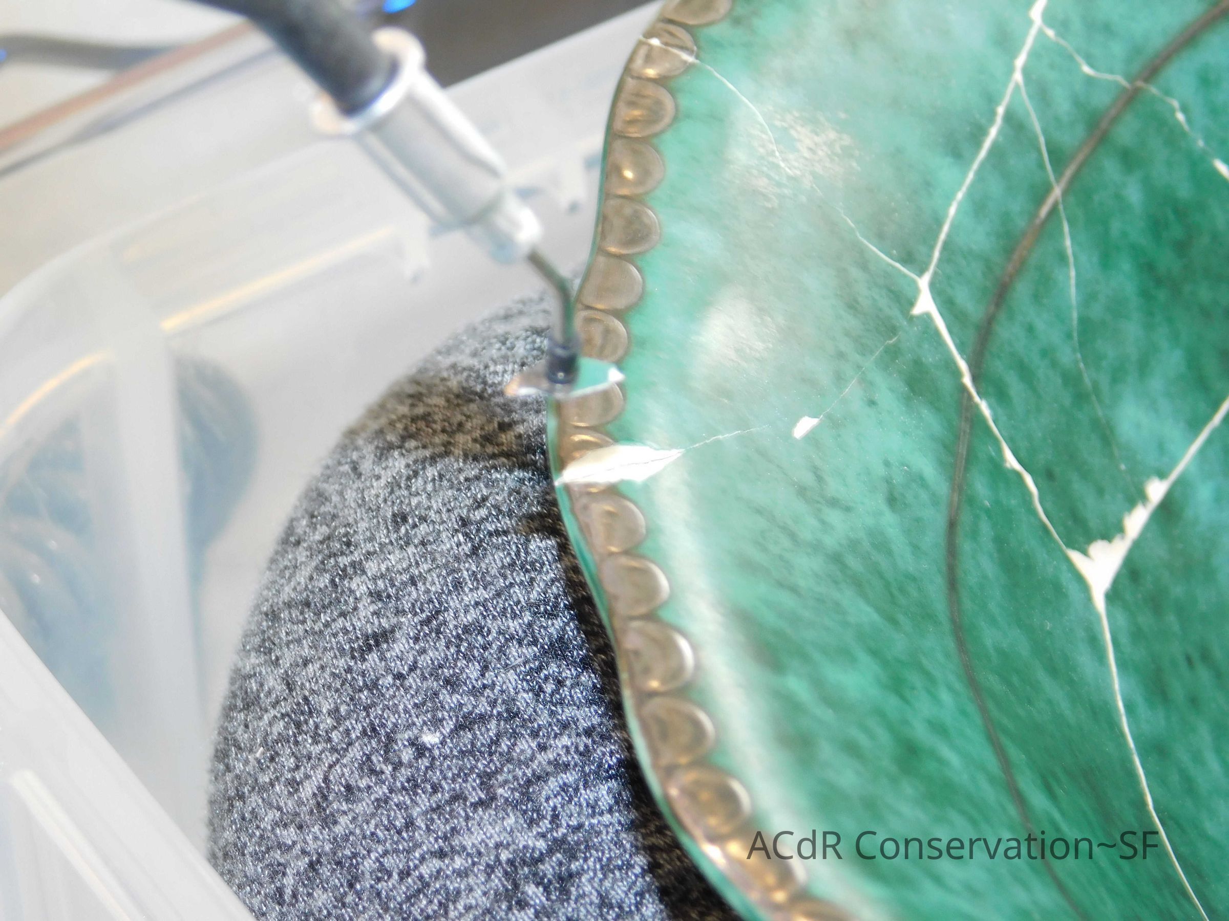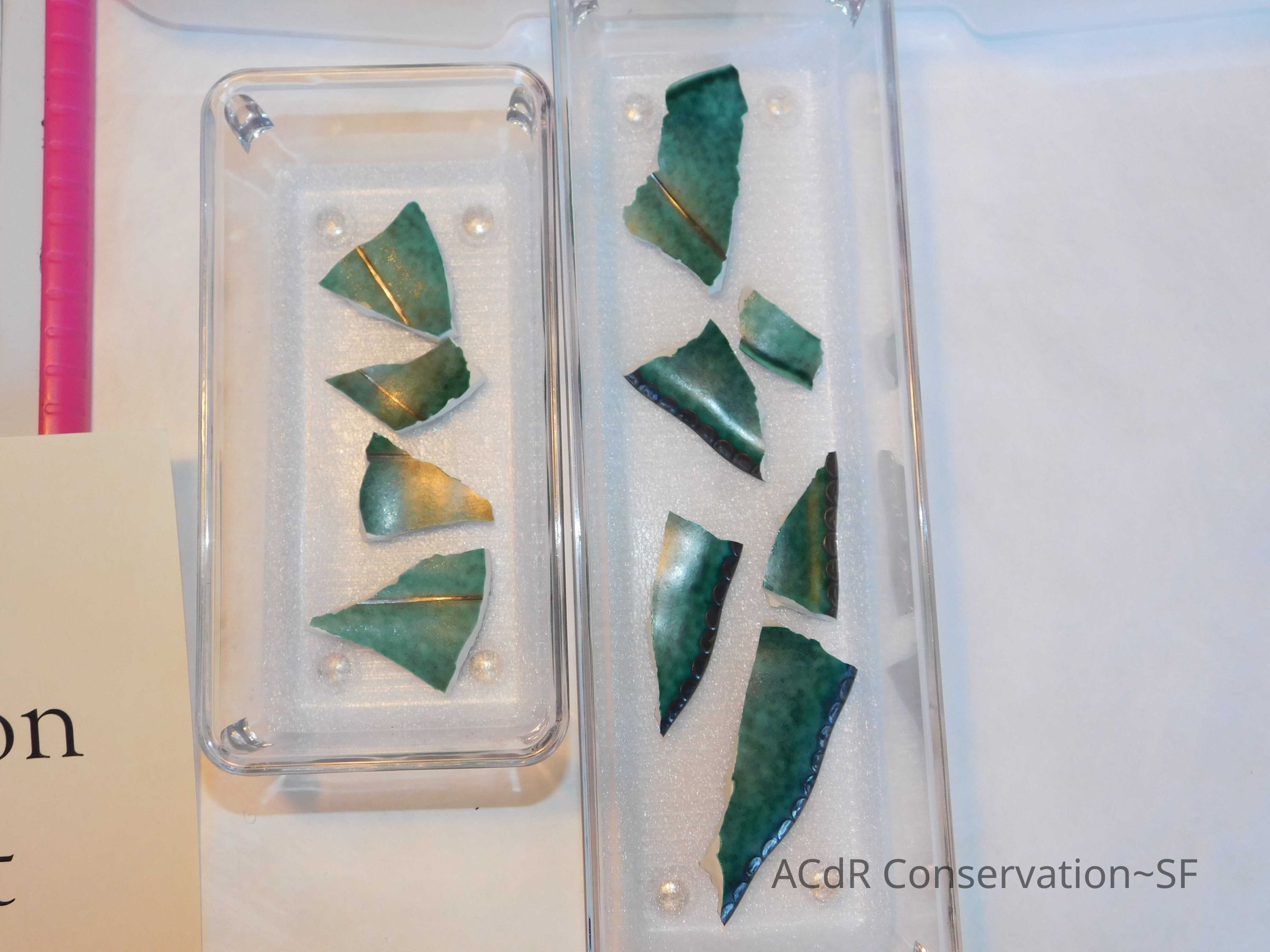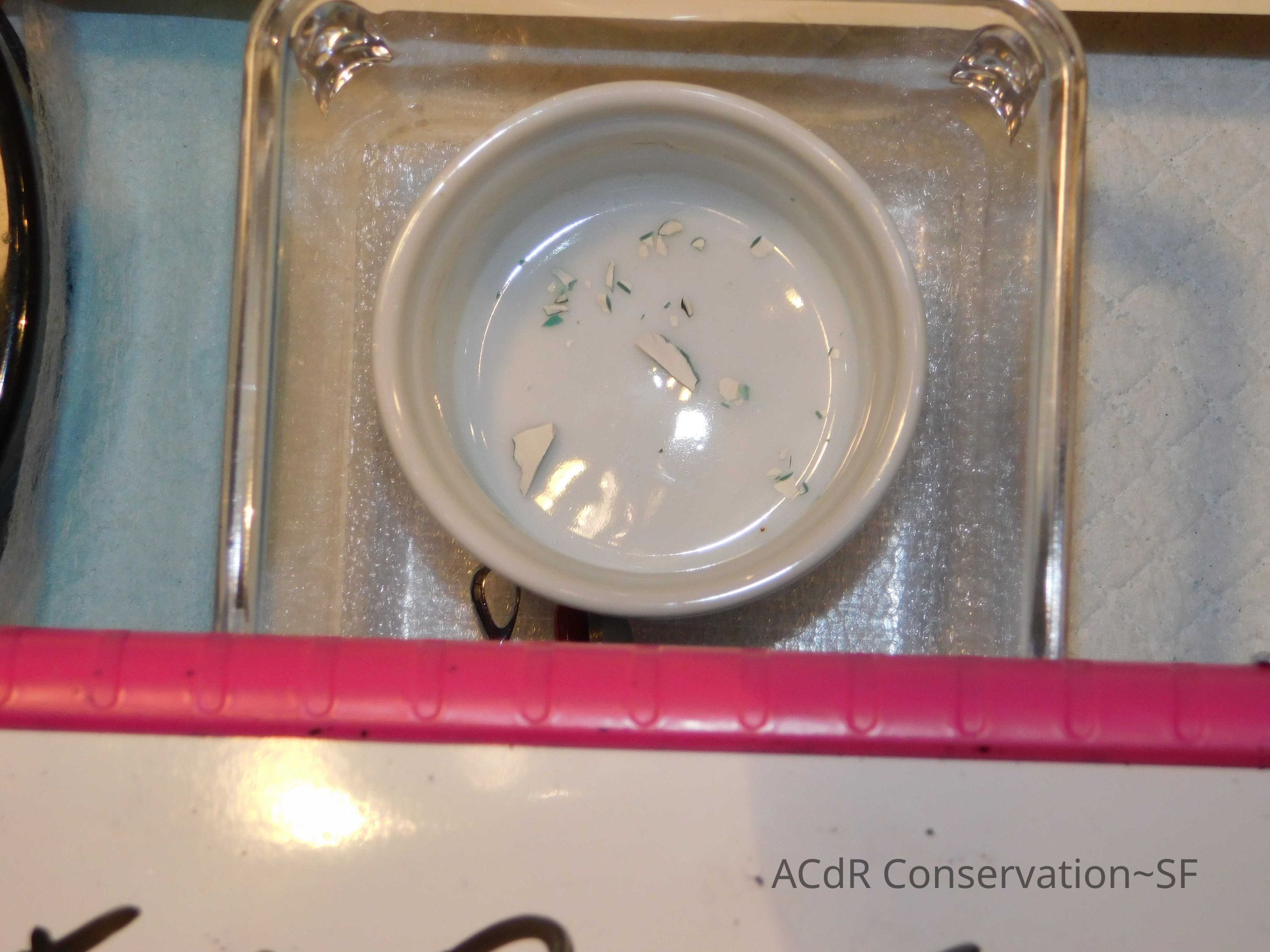 Applied barrier B-72 layer to edges with #4 Filbert “Snap” brush. Took photos. Began reassembly with B-72 and paint brush. In-filling with modostuc. Fills done and two chips re-adhered with suction tweezers. Fill touch-ups and sealing with B-72. Cleaned excess B-72