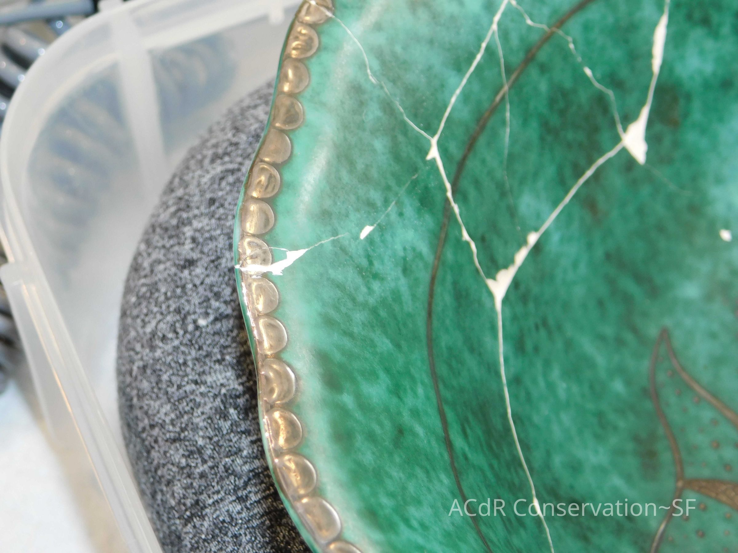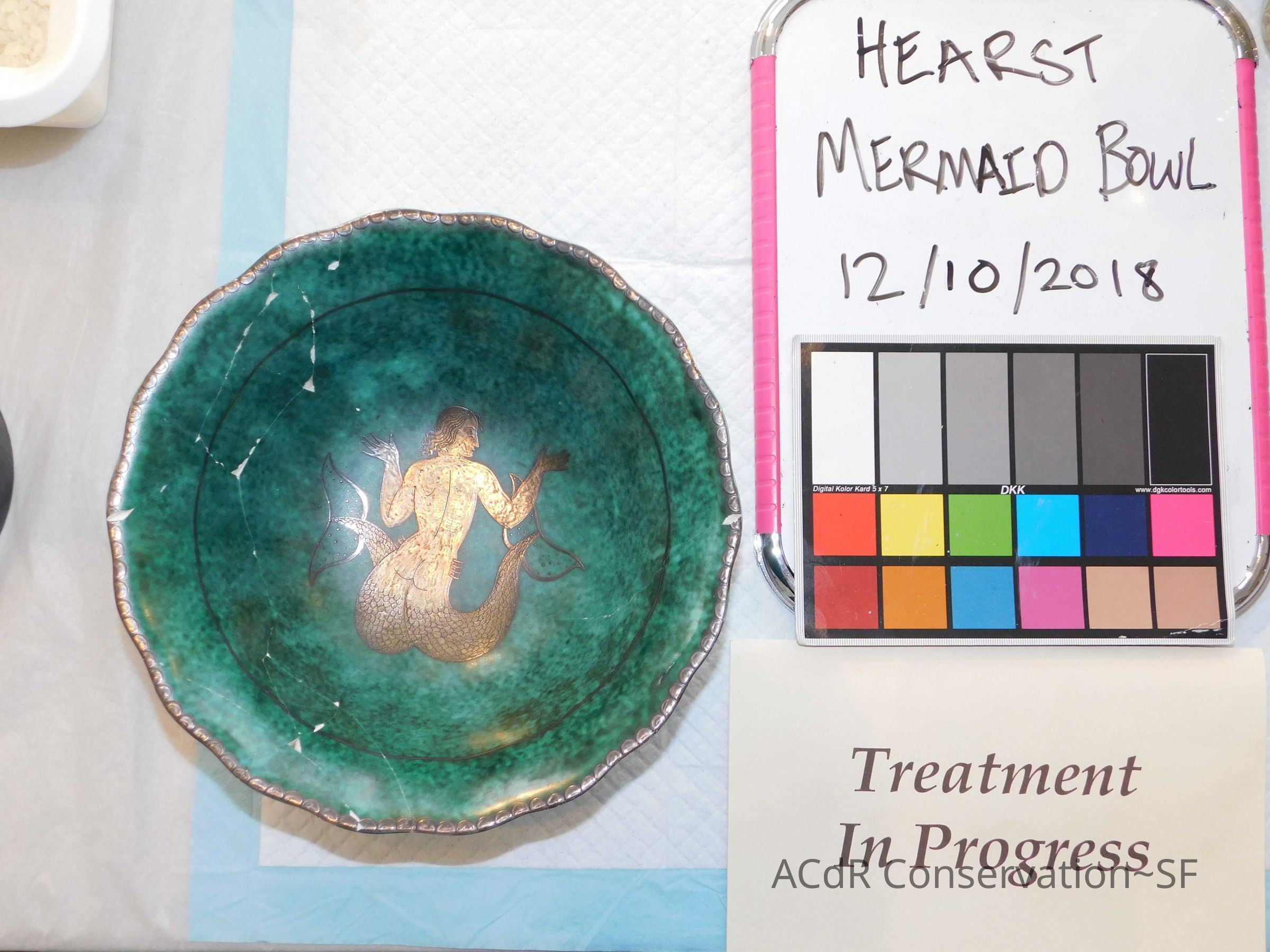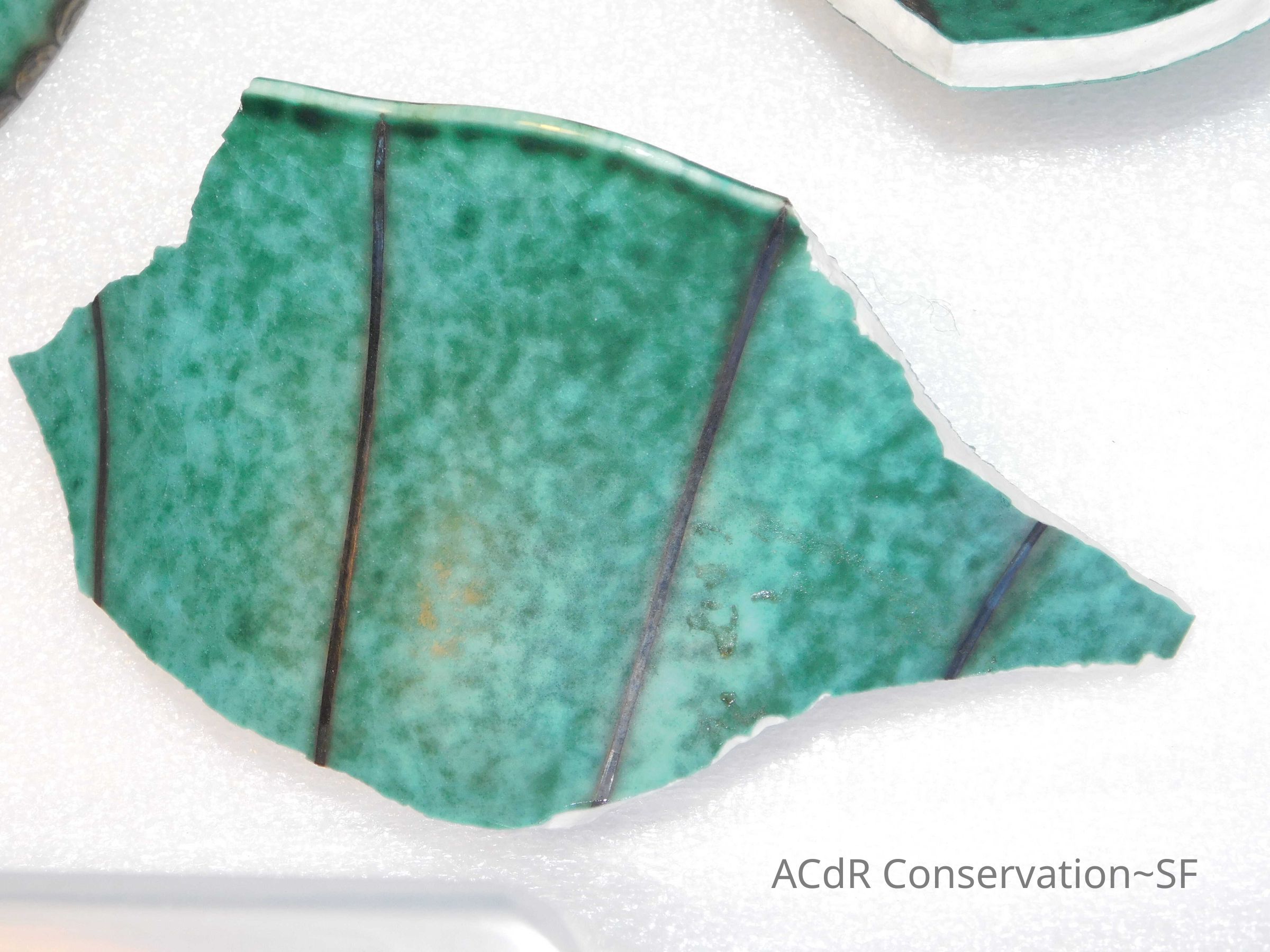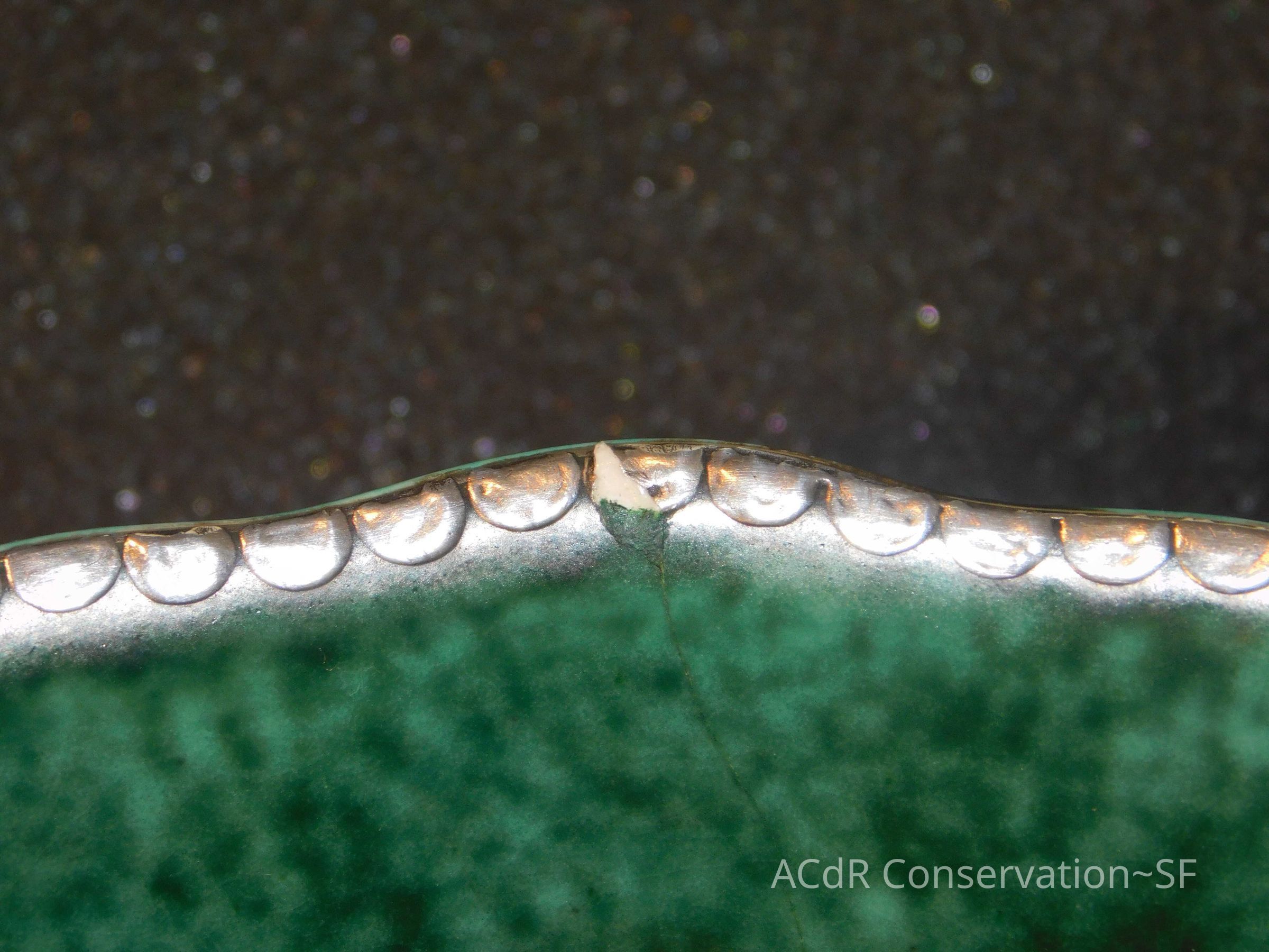 Applied barrier B-72 layer to edges with #4 Filbert “Snap” brush. Took photos. Began reassembly with B-72 and paint brush. In-filling with modostuc. Fills done and two chips re-adhered with suction tweezers. Fill touch-ups and sealing with B-72. Cleaned excess B-72