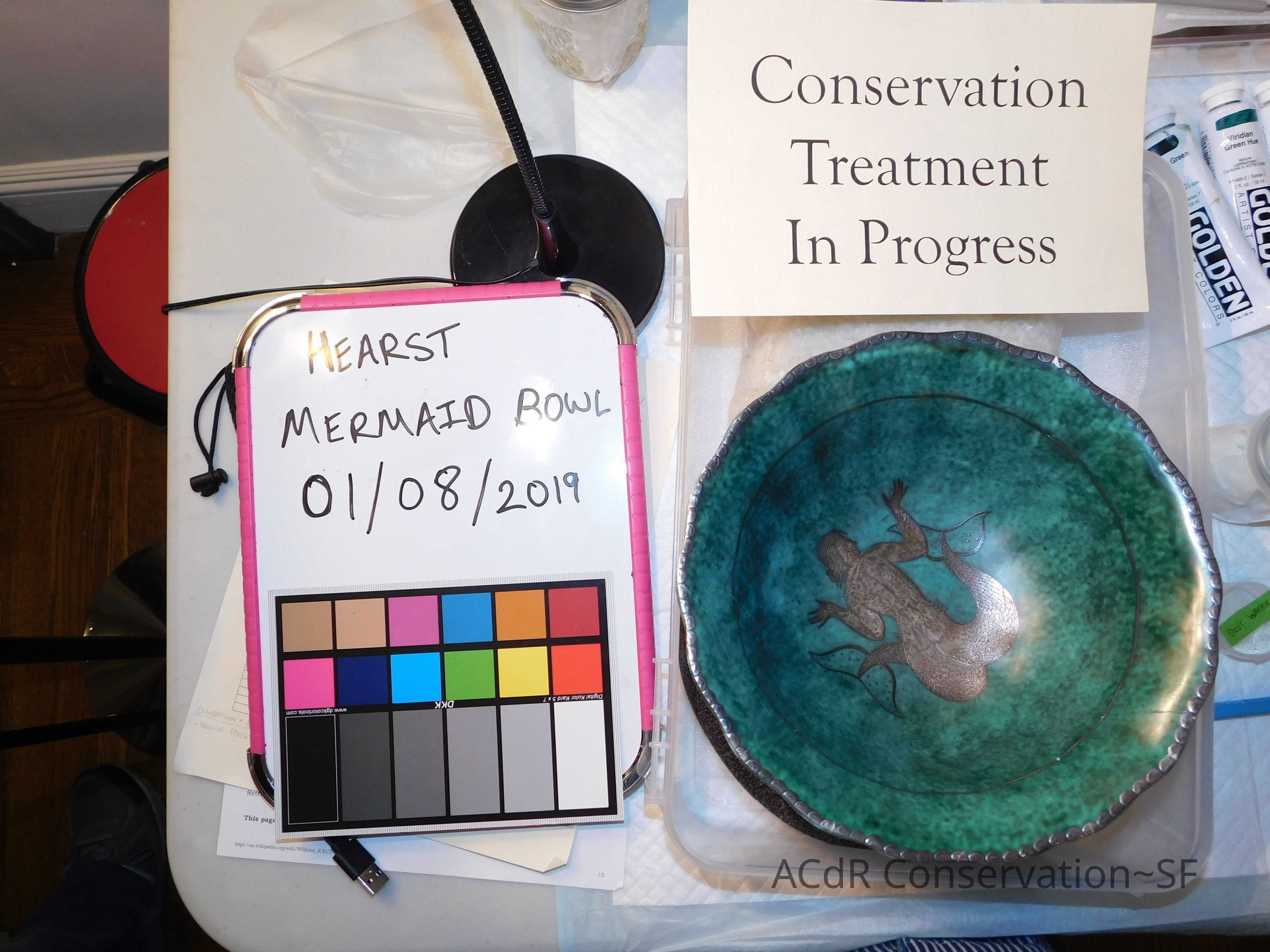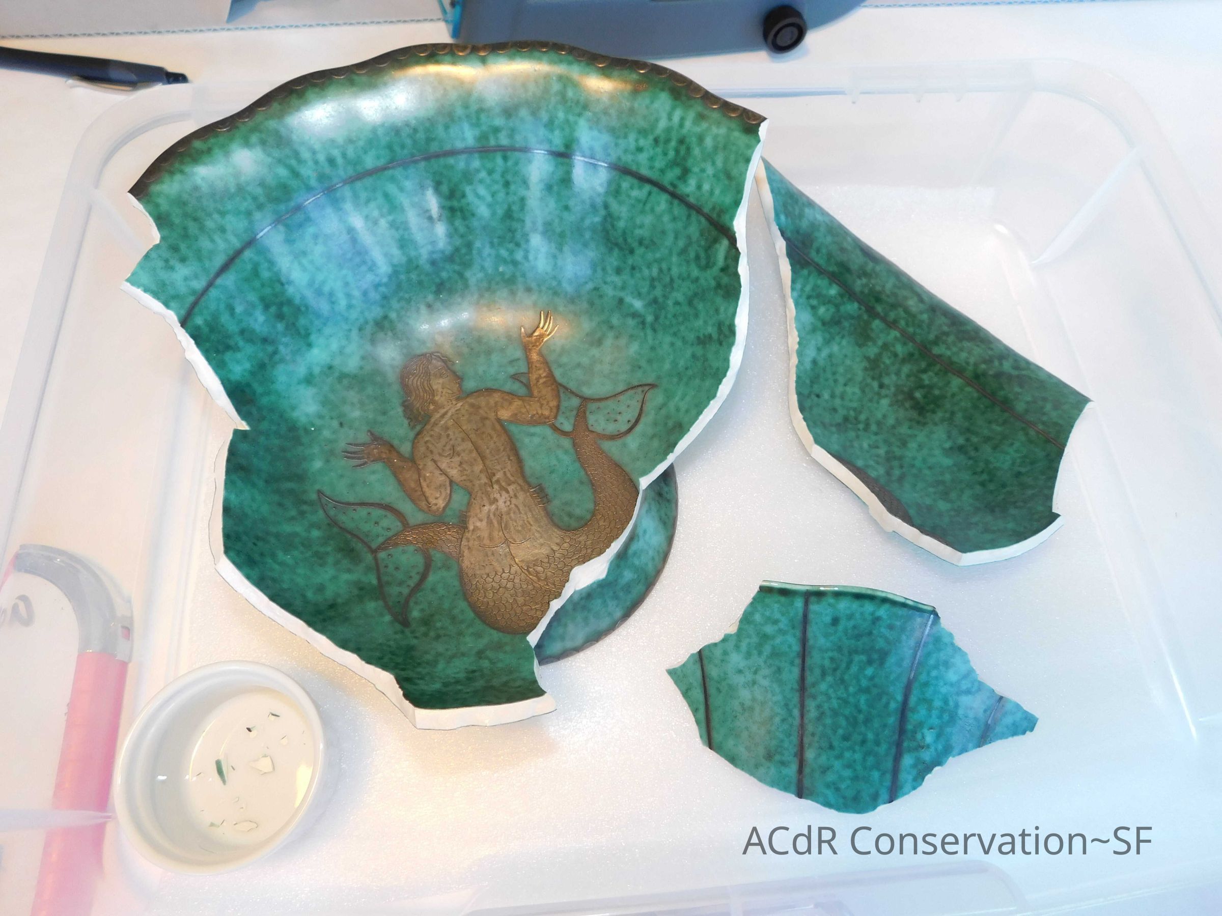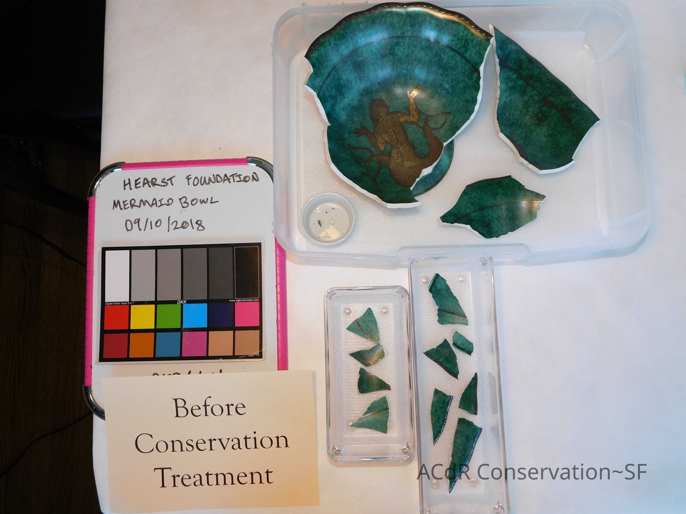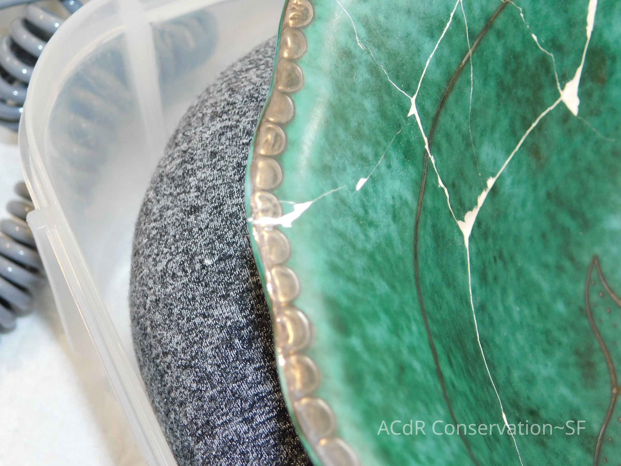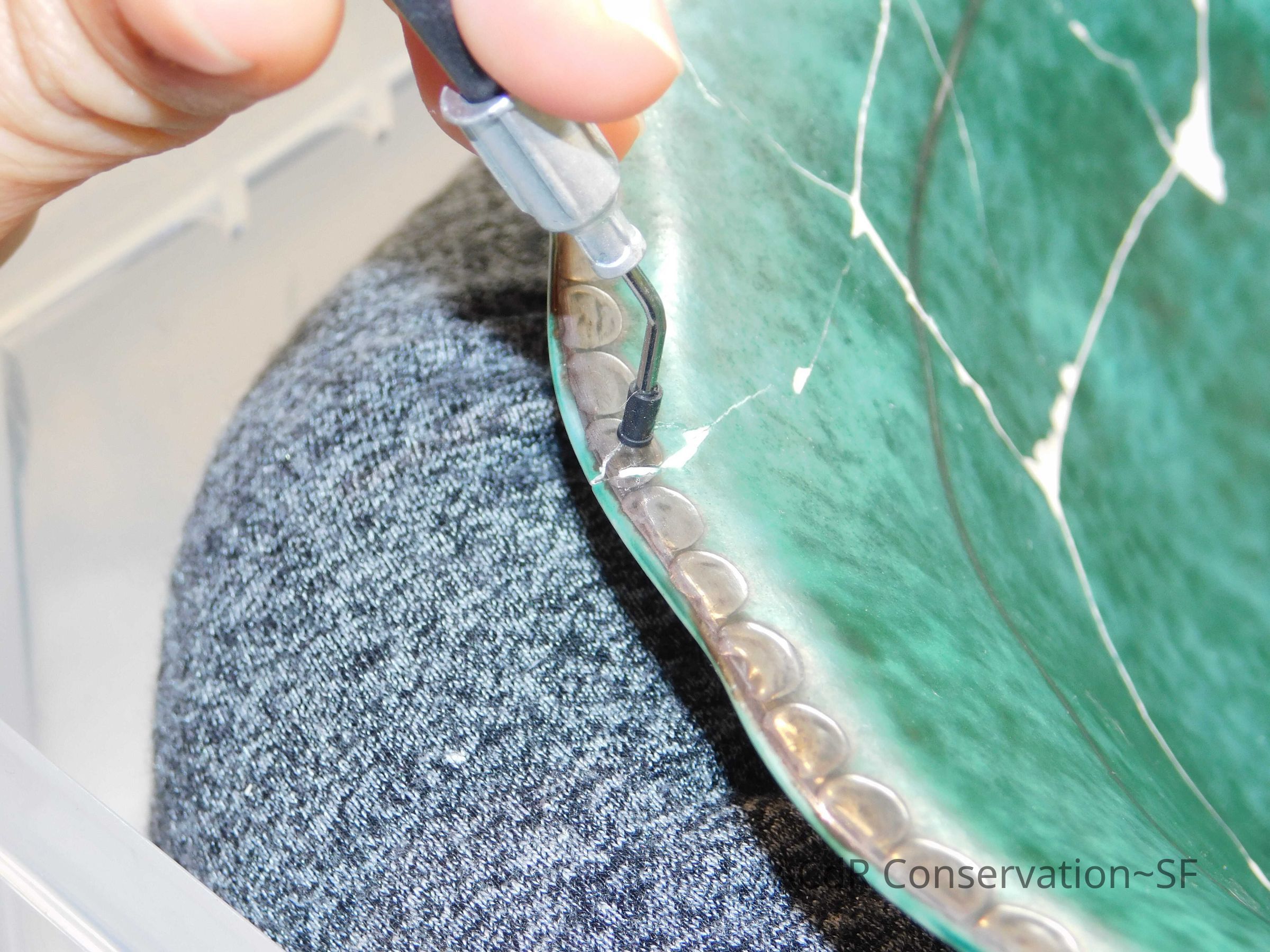 Applied barrier B-72 layer to edges with #4 Filbert “Snap” brush. Took photos. Began reassembly with B-72 and paint brush. In-filling with modostuc. Fills done and two chips re-adhered with suction tweezers. Fill touch-ups and sealing with B-72. Cleaned excess B-72