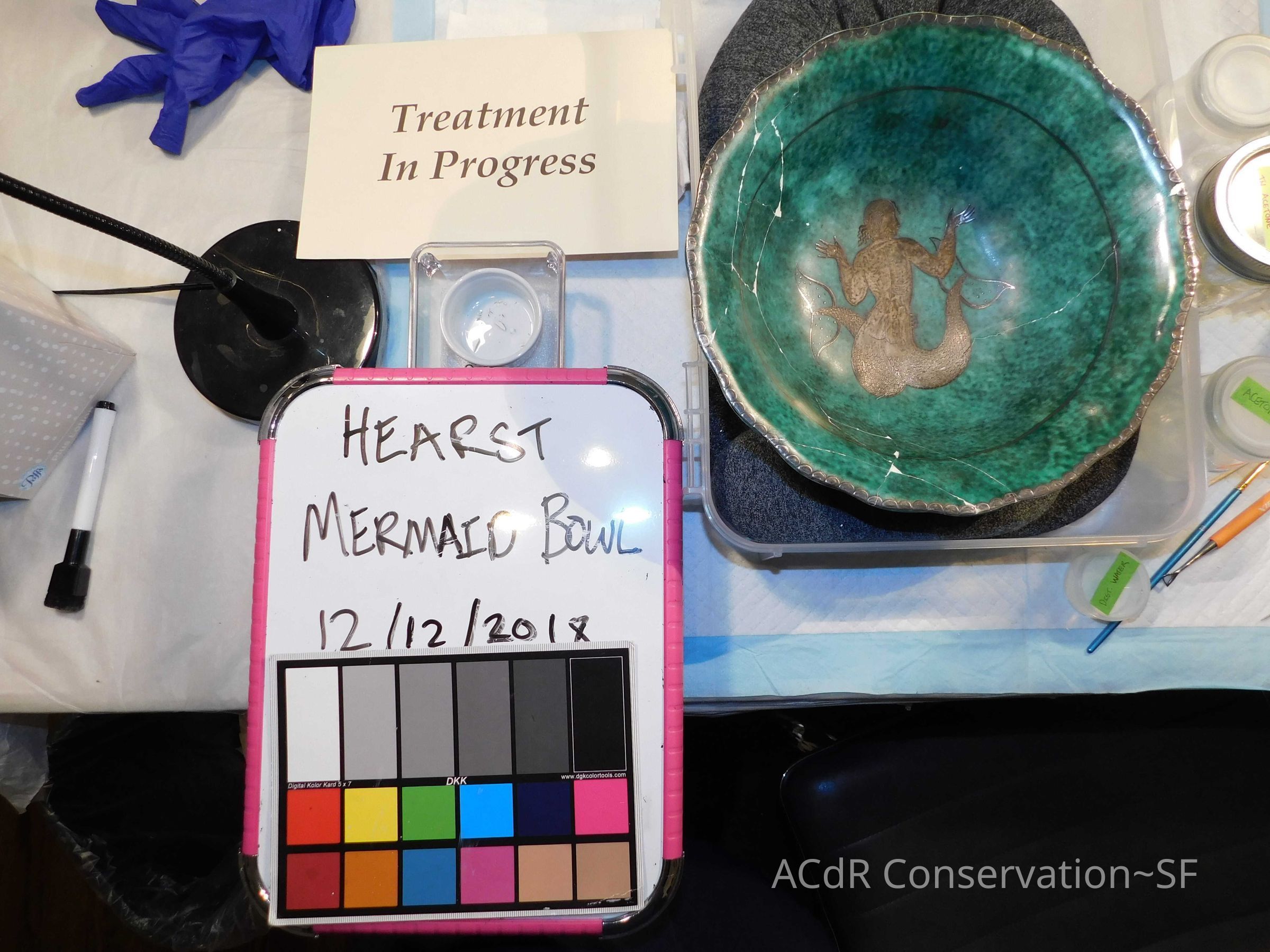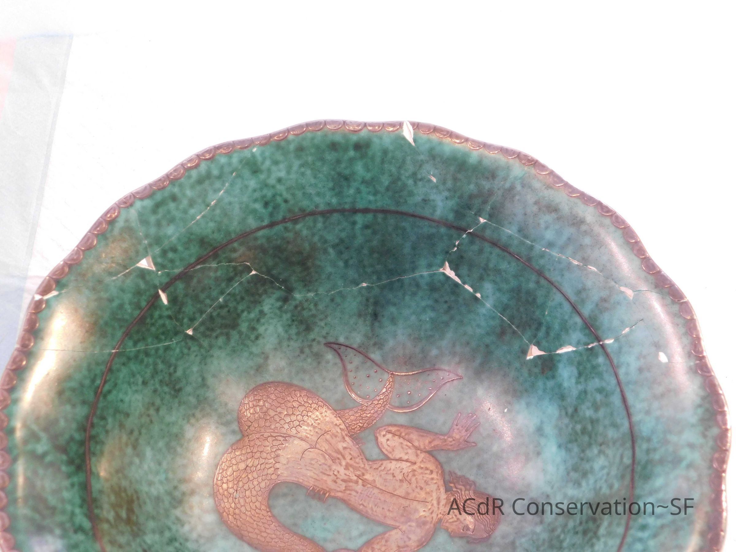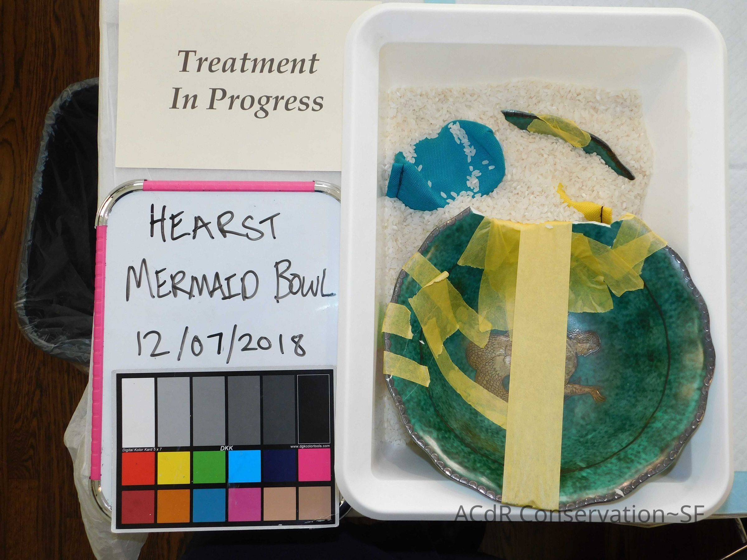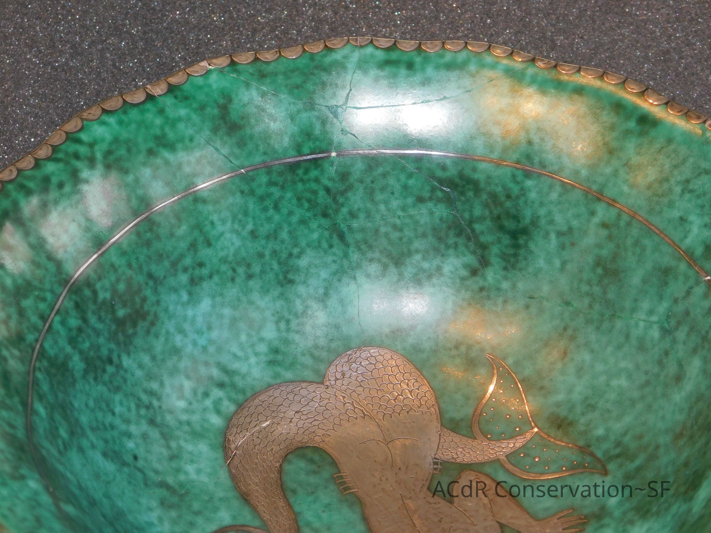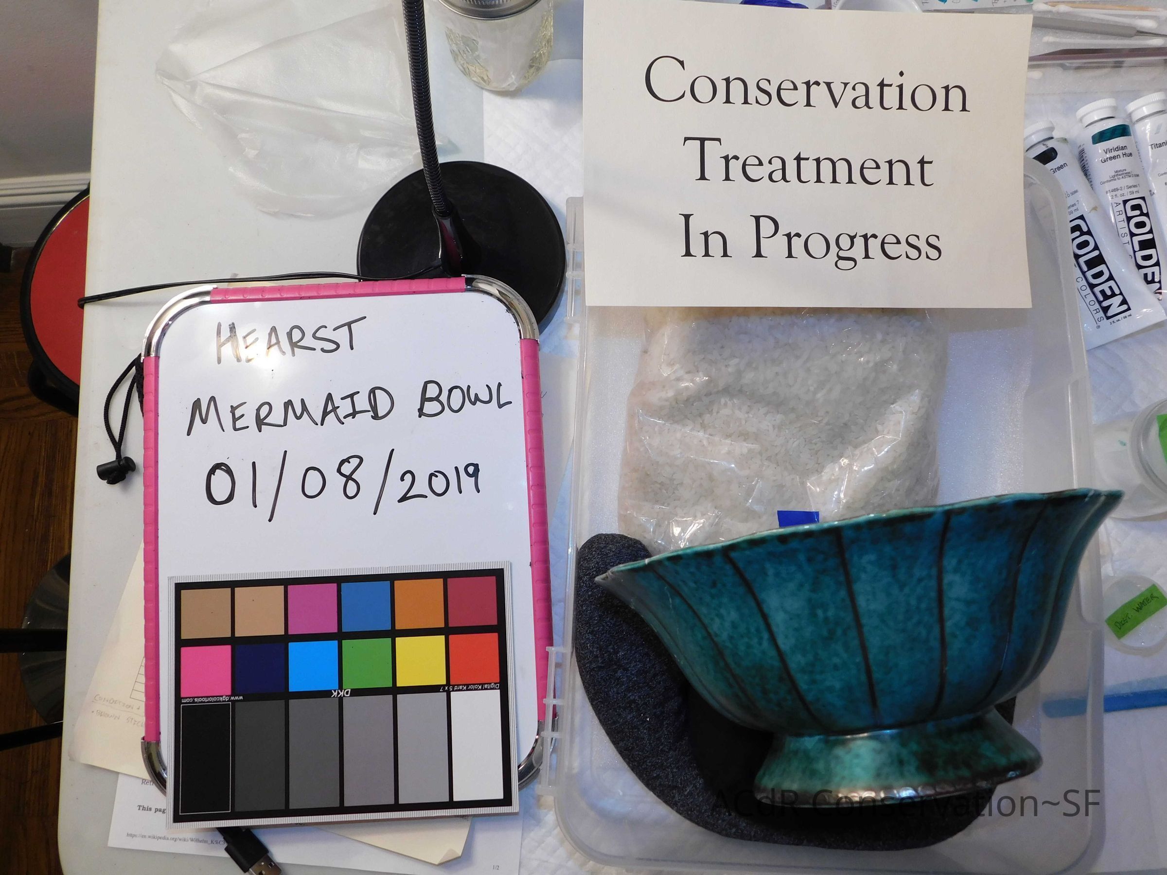 Applied barrier B-72 layer to edges with #4 Filbert “Snap” brush. Took photos. Began reassembly with B-72 and paint brush. In-filling with modostuc. Fills done and two chips re-adhered with suction tweezers. Fill touch-ups and sealing with B-72. Cleaned excess B-72