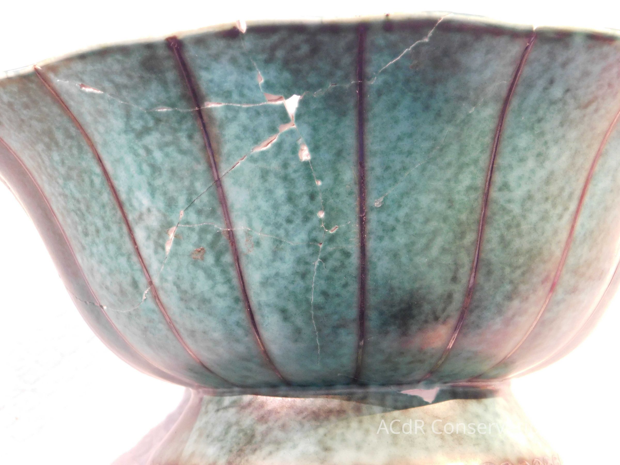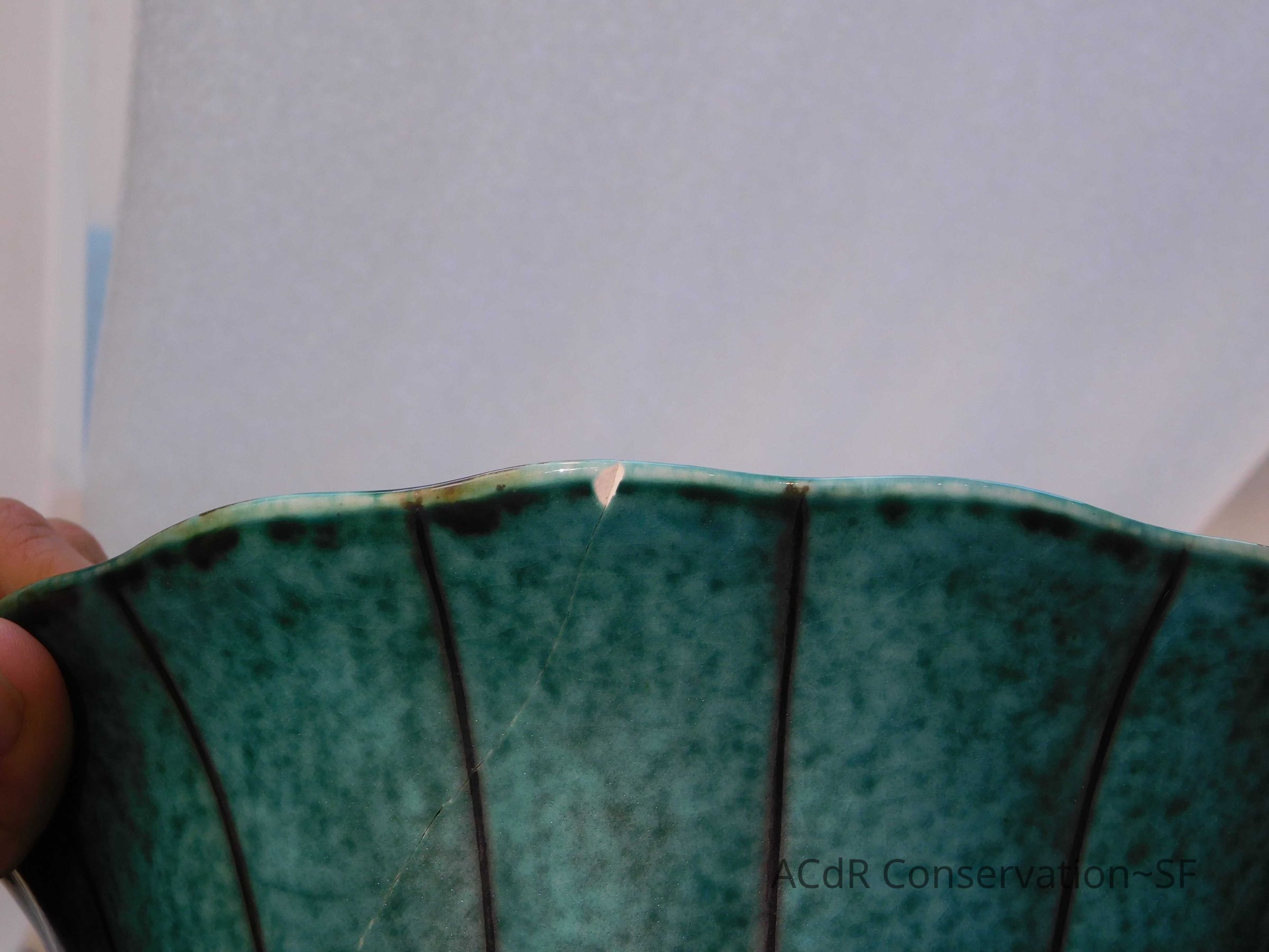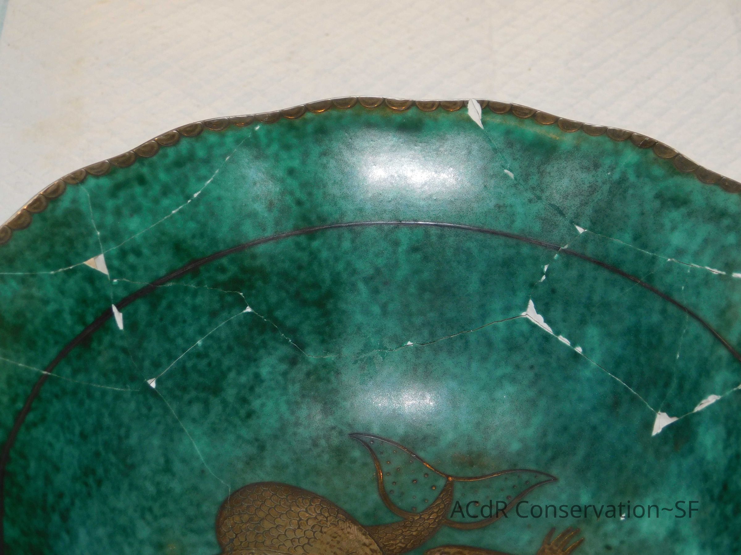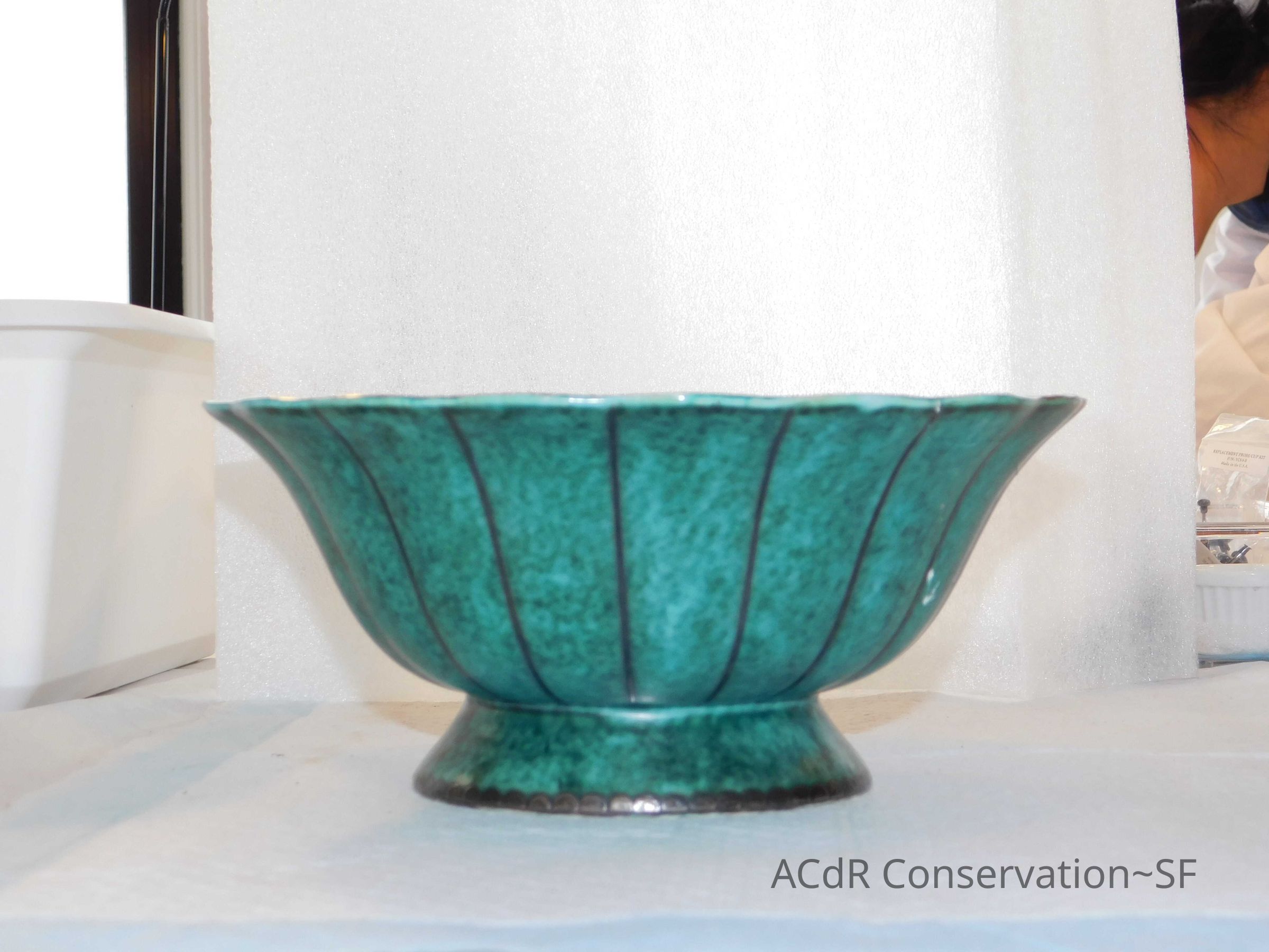 Applied barrier B-72 layer to edges with #4 Filbert “Snap” brush. Took photos. Began reassembly with B-72 and paint brush. In-filling with modostuc. Fills done and two chips re-adhered with suction tweezers. Fill touch-ups and sealing with B-72. Cleaned excess B-72
