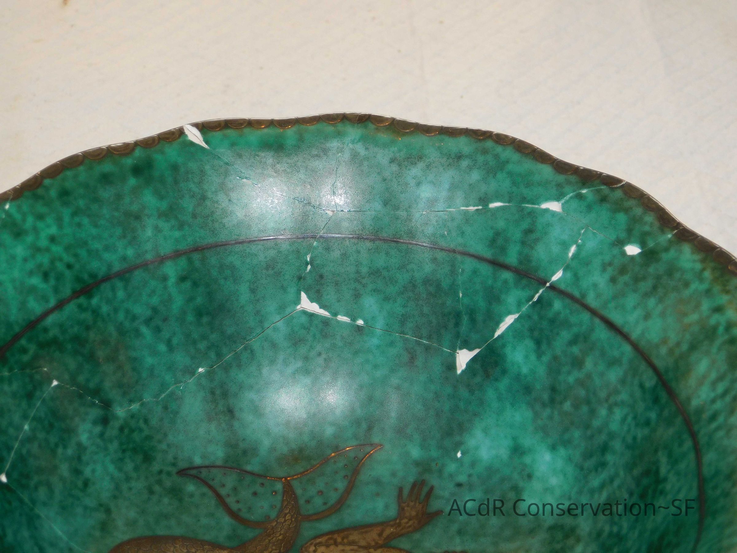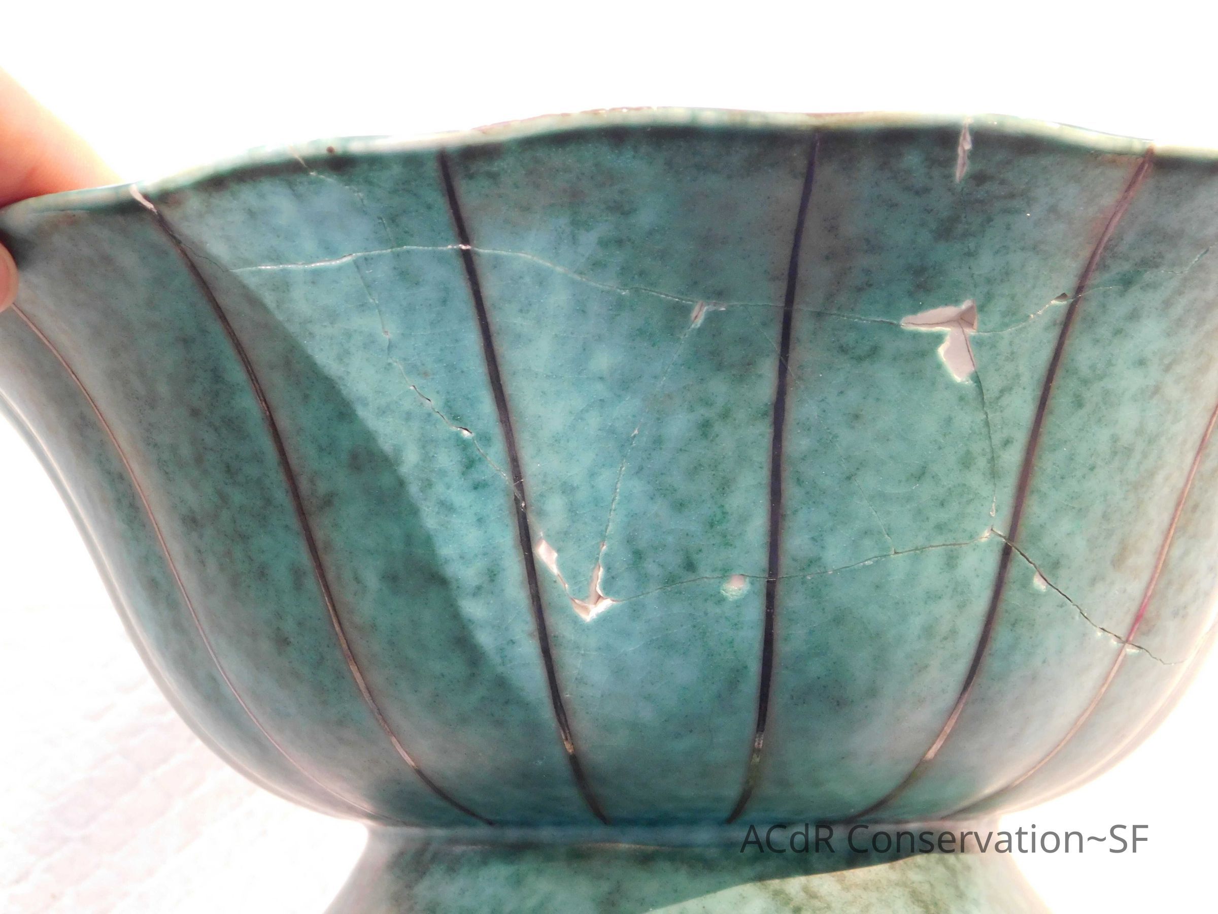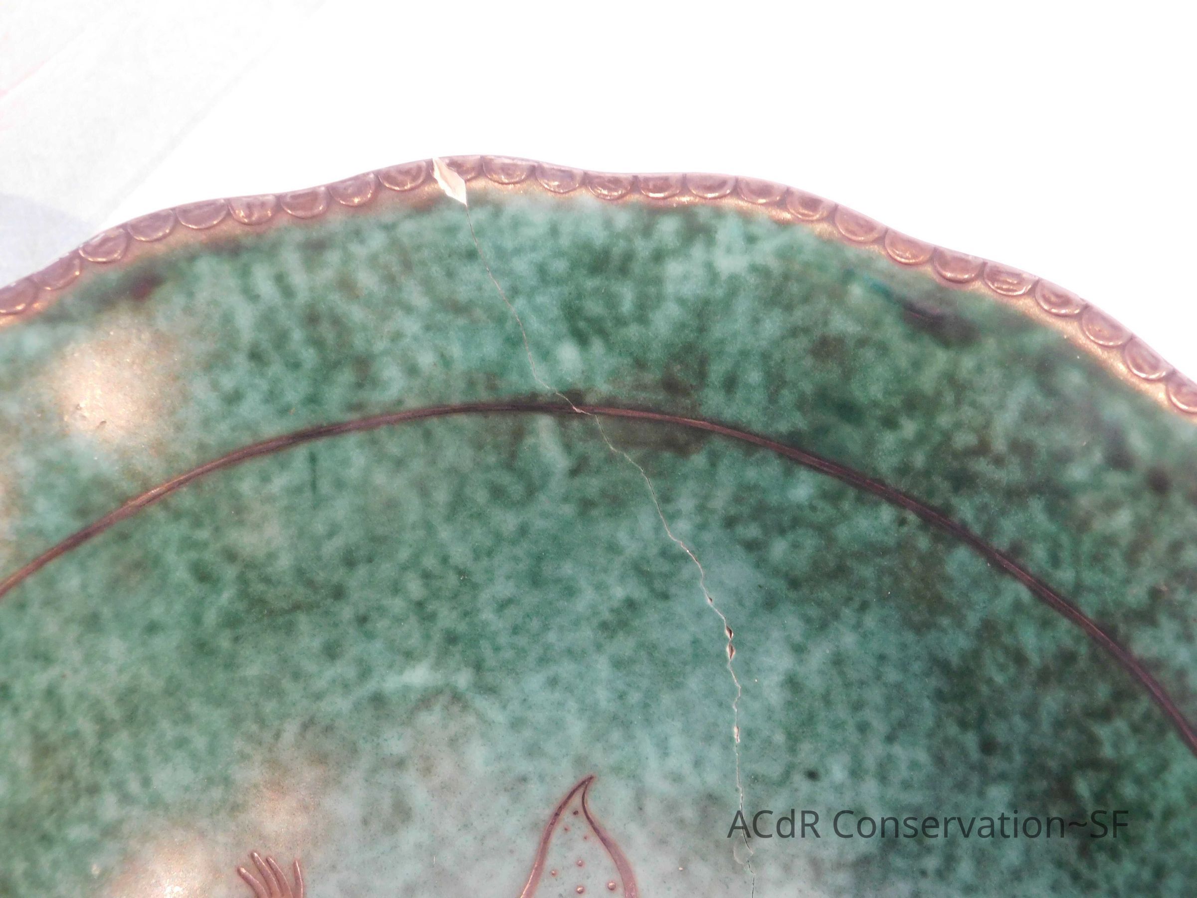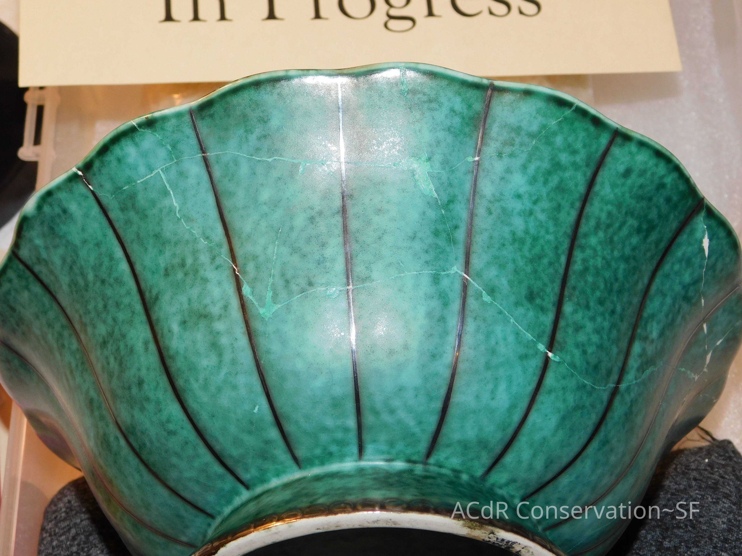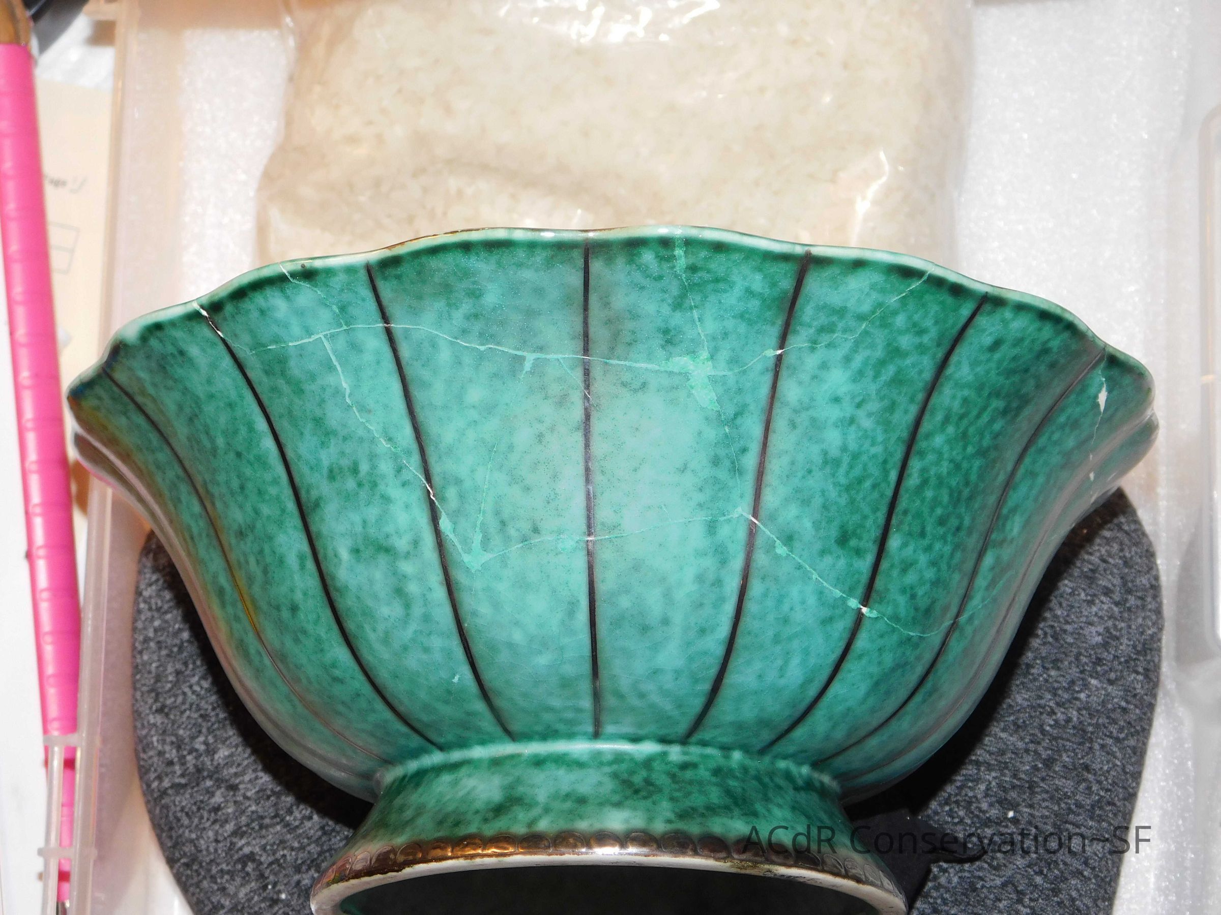 Applied barrier B-72 layer to edges with #4 Filbert “Snap” brush. Took photos. Began reassembly with B-72 and paint brush. In-filling with modostuc. Fills done and two chips re-adhered with suction tweezers. Fill touch-ups and sealing with B-72. Cleaned excess B-72