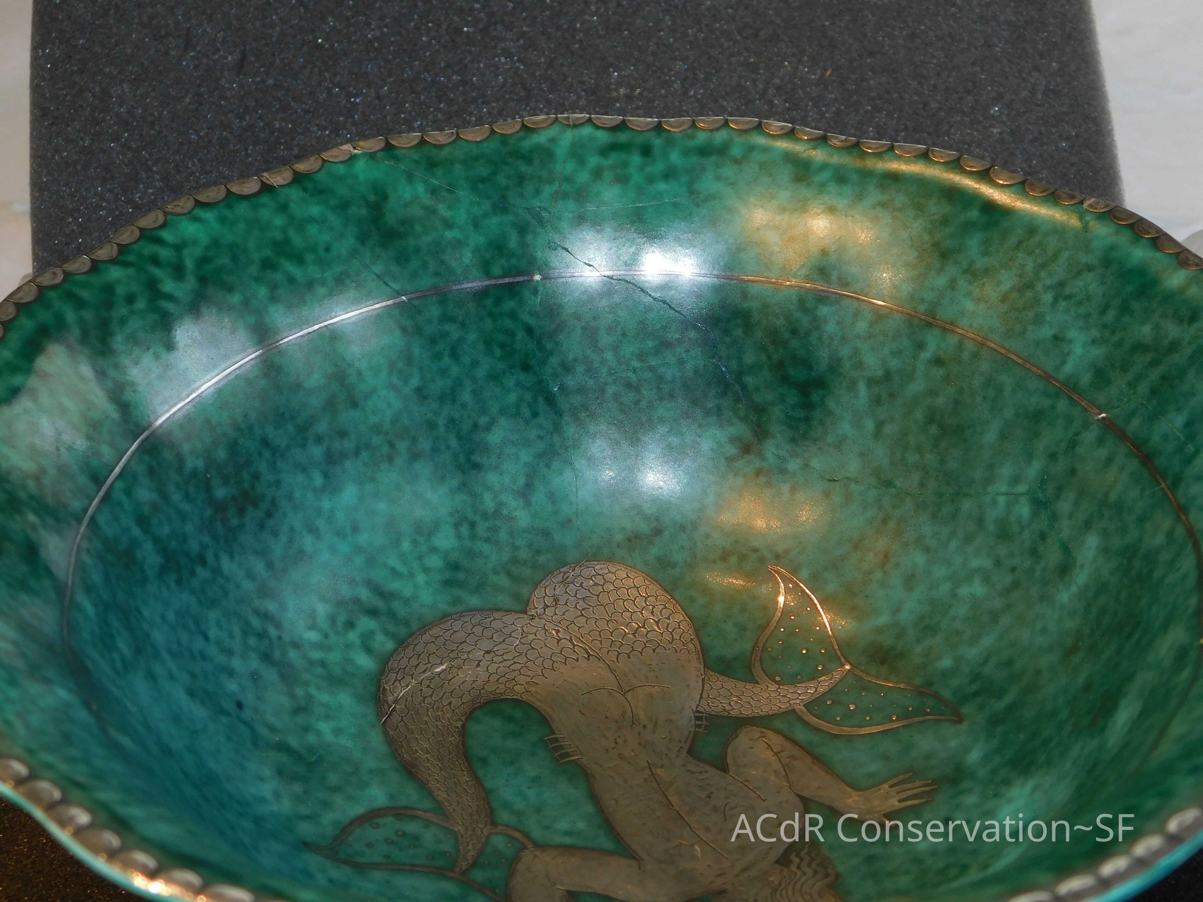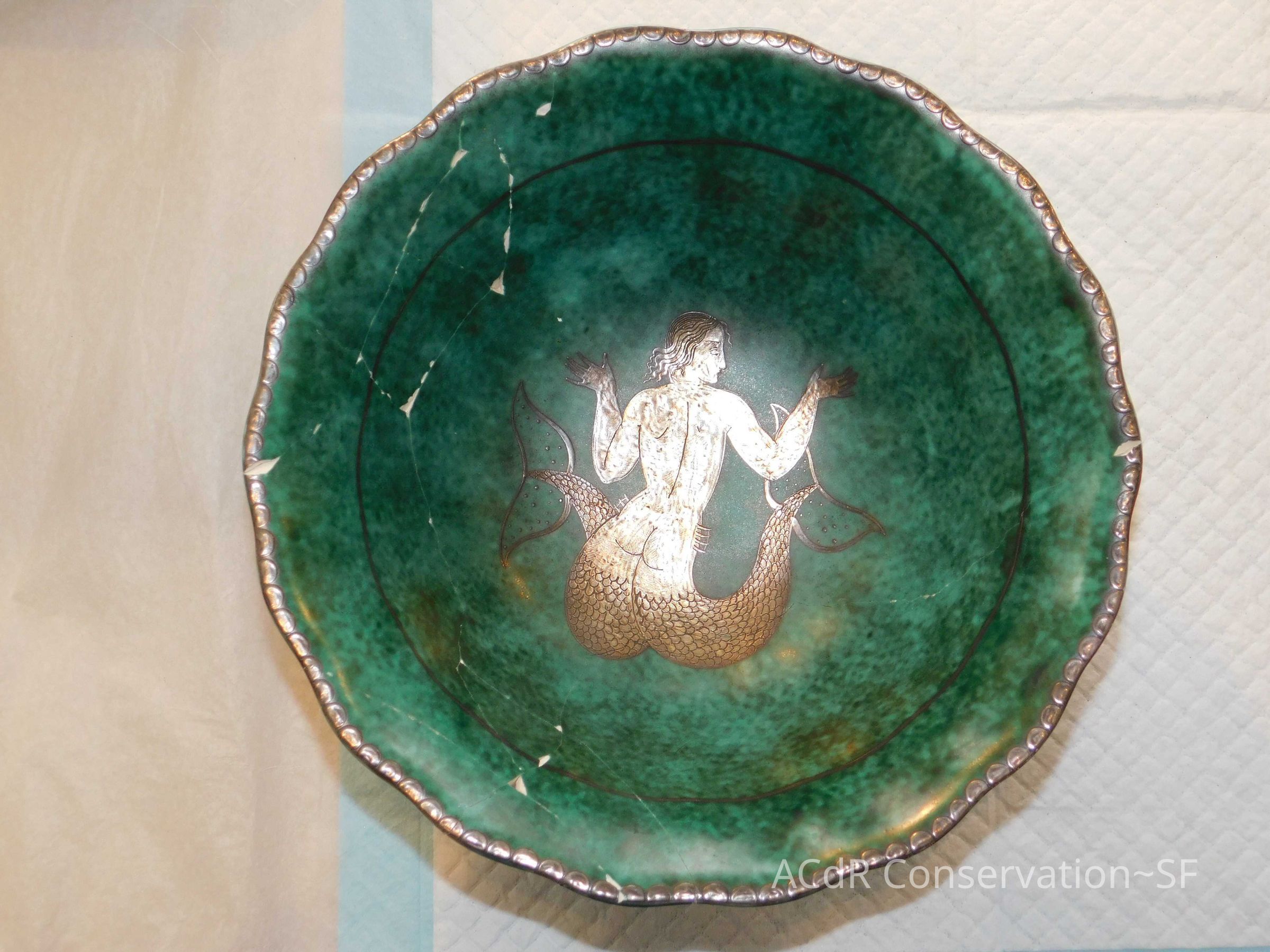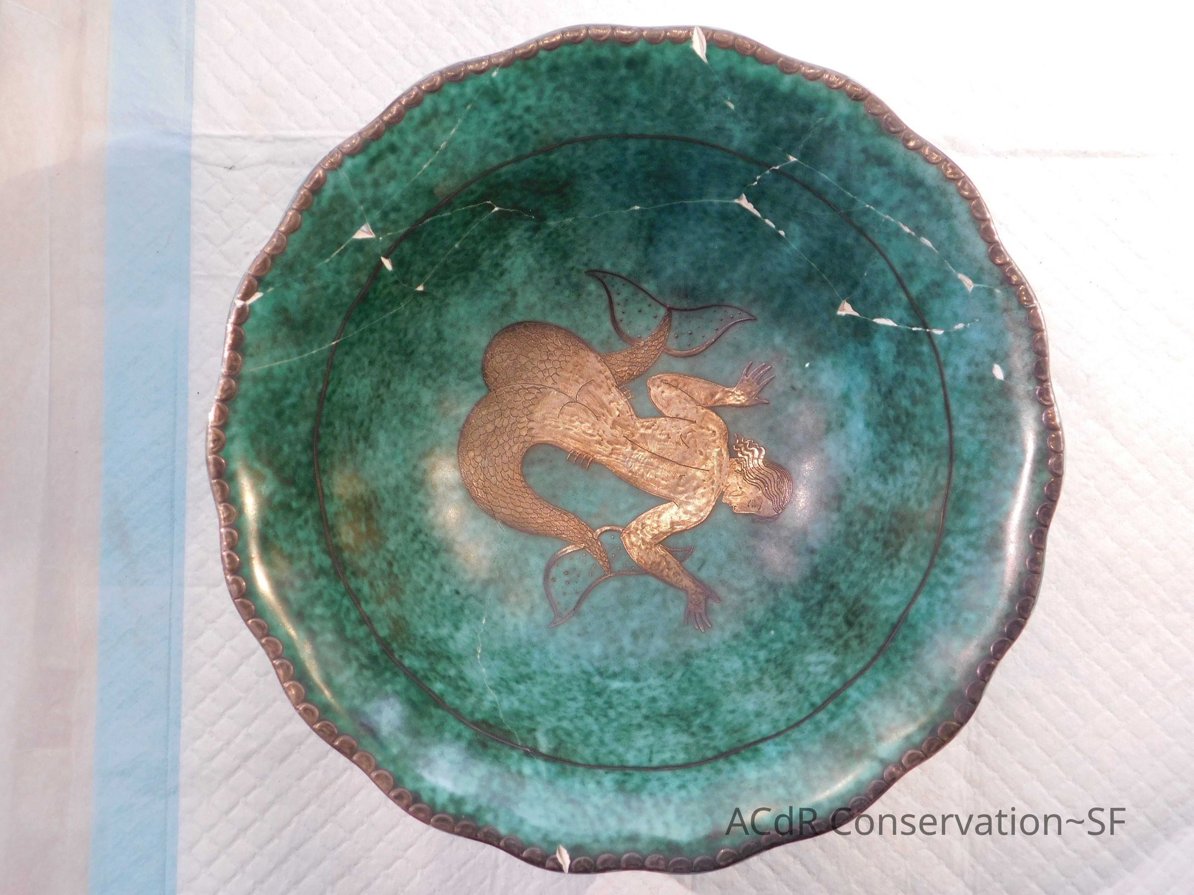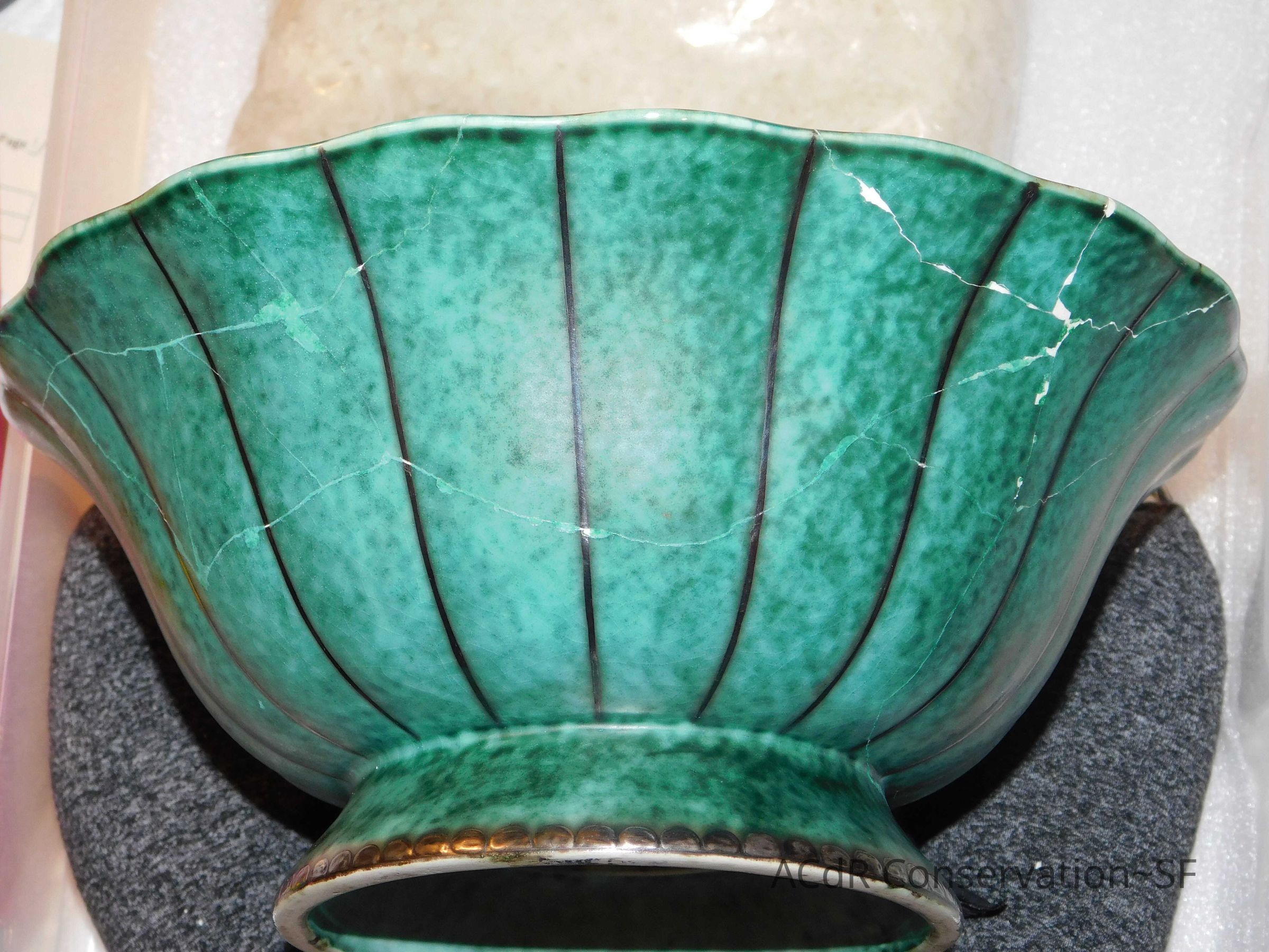 Applied barrier B-72 layer to edges with #4 Filbert “Snap” brush. Took photos. Began reassembly with B-72 and paint brush. In-filling with modostuc. Fills done and two chips re-adhered with suction tweezers. Fill touch-ups and sealing with B-72. Cleaned excess B-72