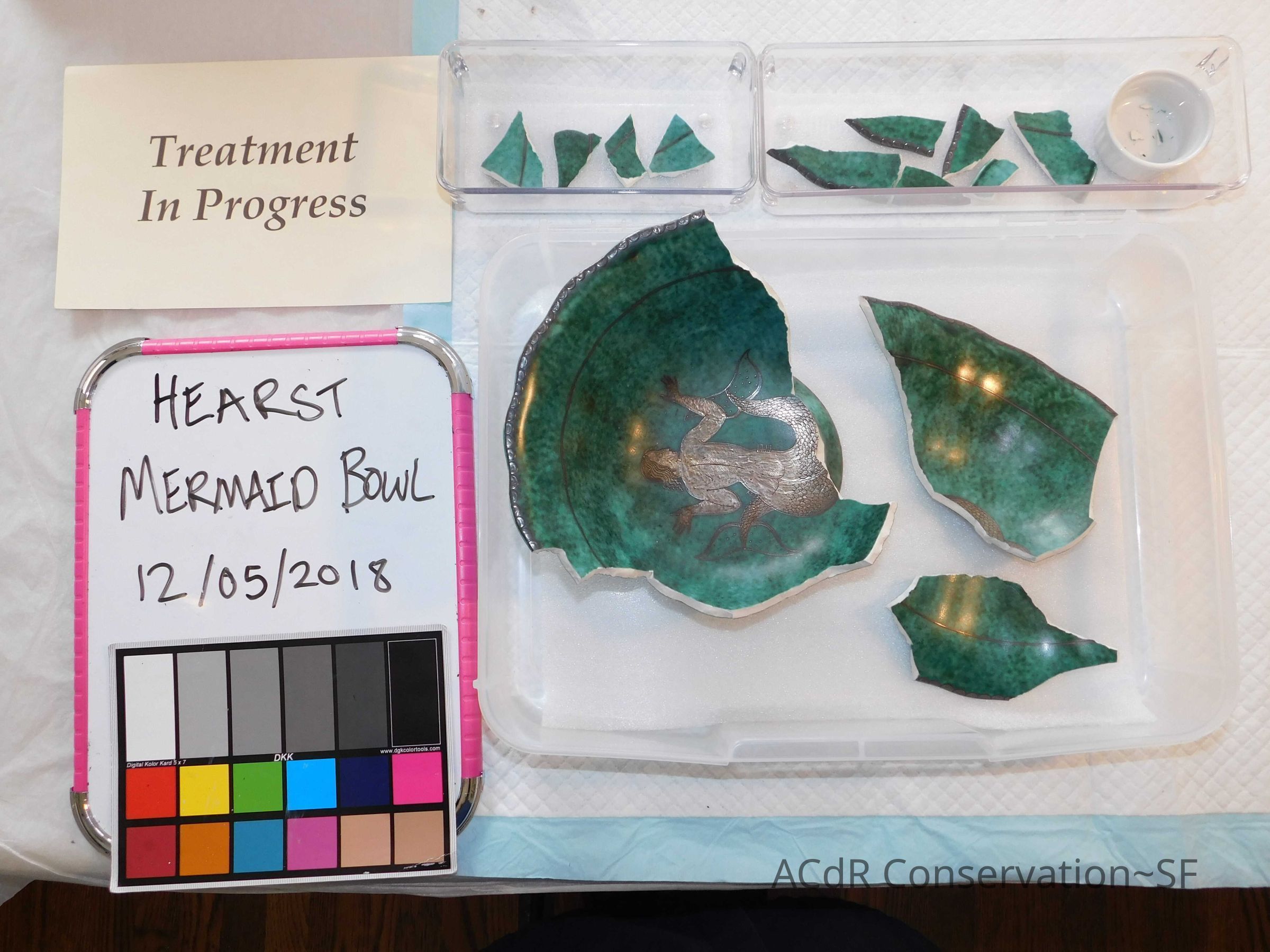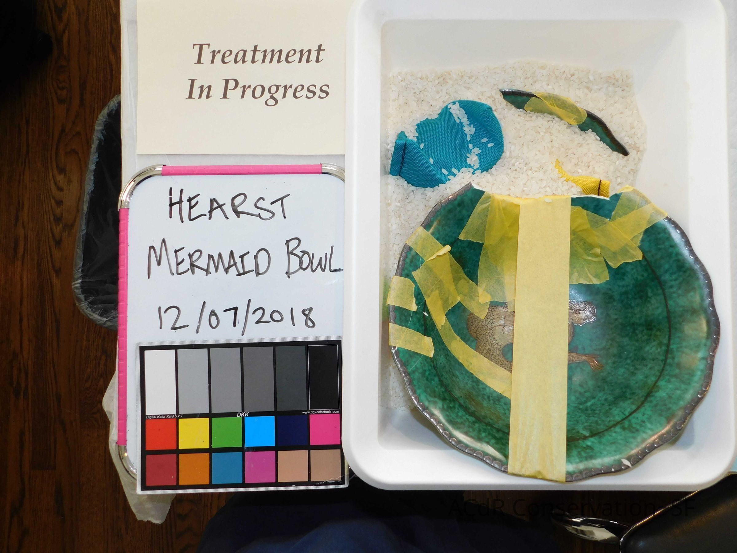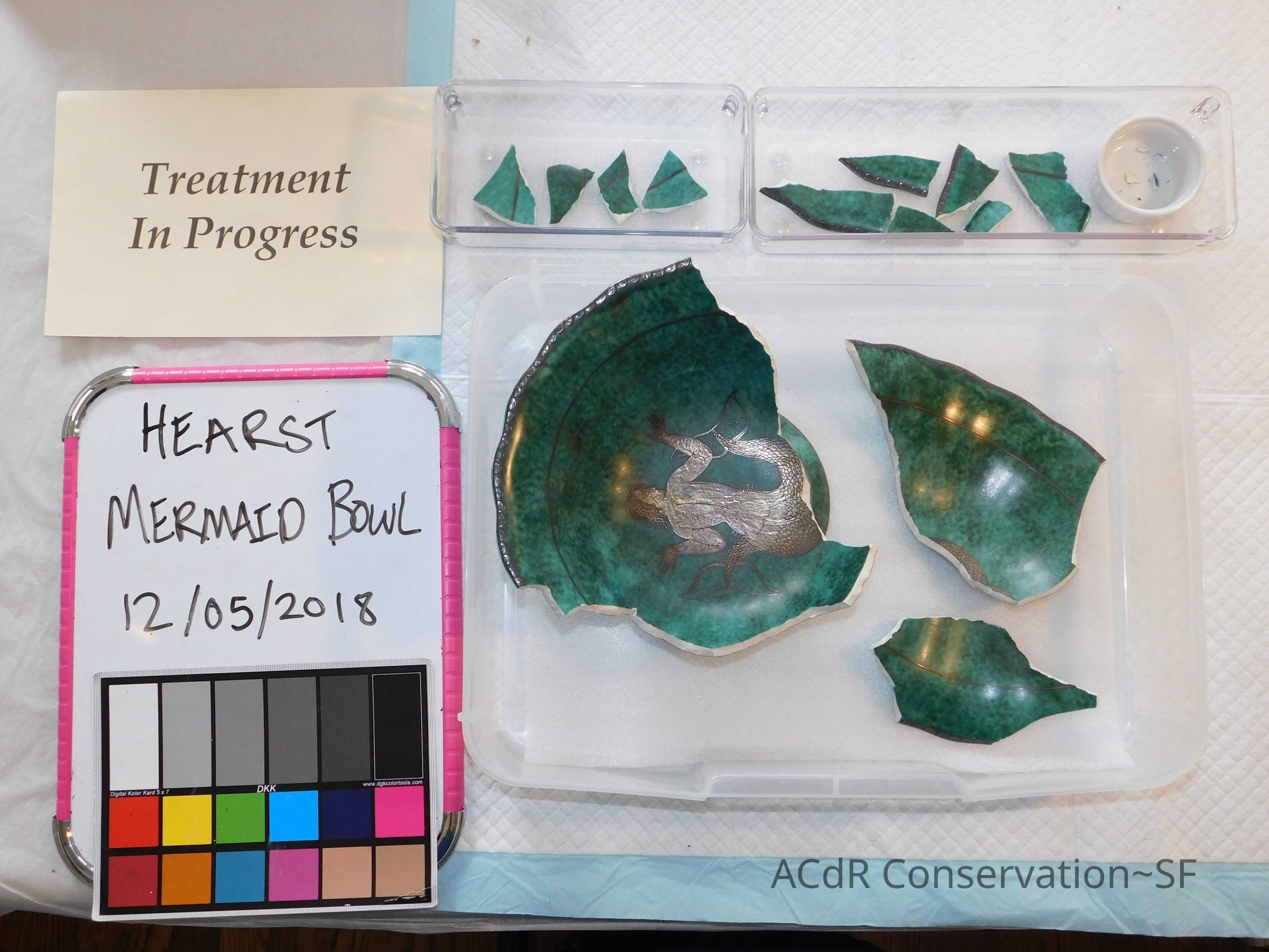 Applied barrier B-72 layer to edges with #4 Filbert “Snap” brush. Took photos. Began reassembly with B-72 and paint brush. In-filling with modostuc. Fills done and two chips re-adhered with suction tweezers. Fill touch-ups and sealing with B-72. Cleaned excess B-72