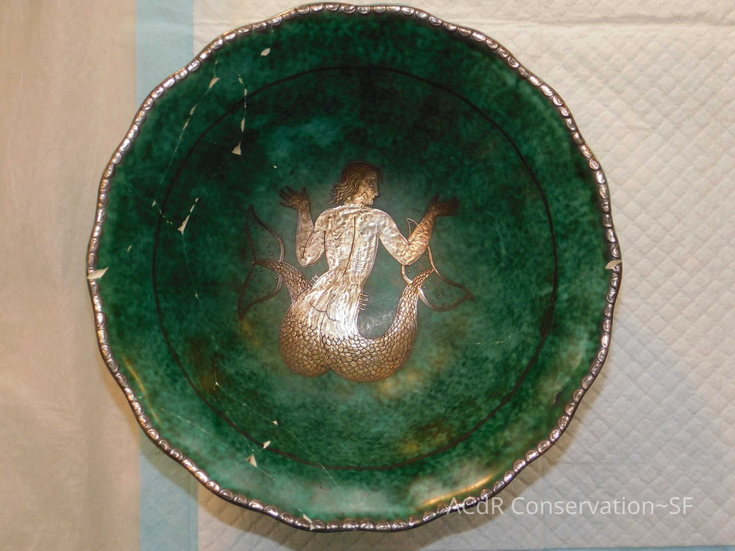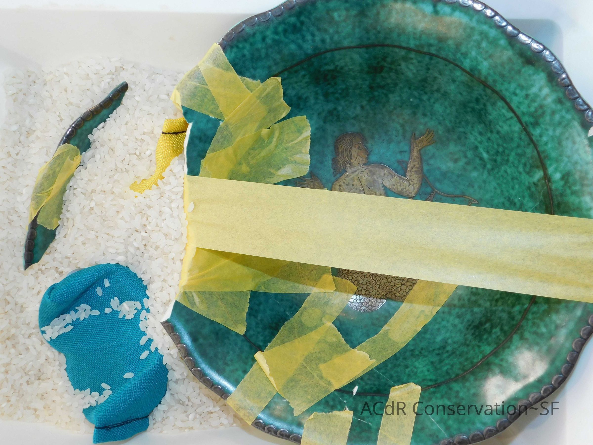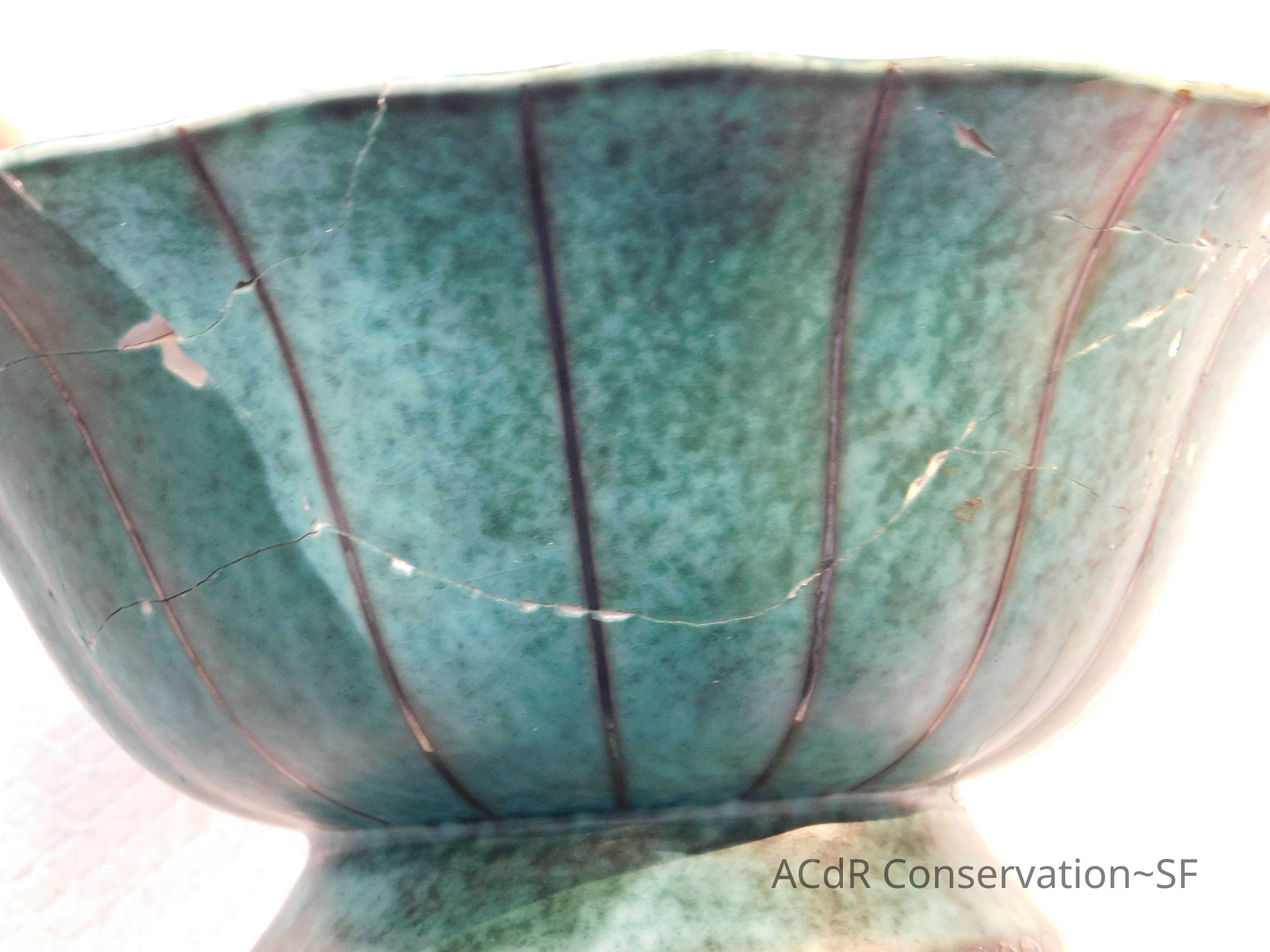 Applied barrier B-72 layer to edges with #4 Filbert “Snap” brush. Took photos. Began reassembly with B-72 and paint brush. In-filling with modostuc. Fills done and two chips re-adhered with suction tweezers. Fill touch-ups and sealing with B-72. Cleaned excess B-72
