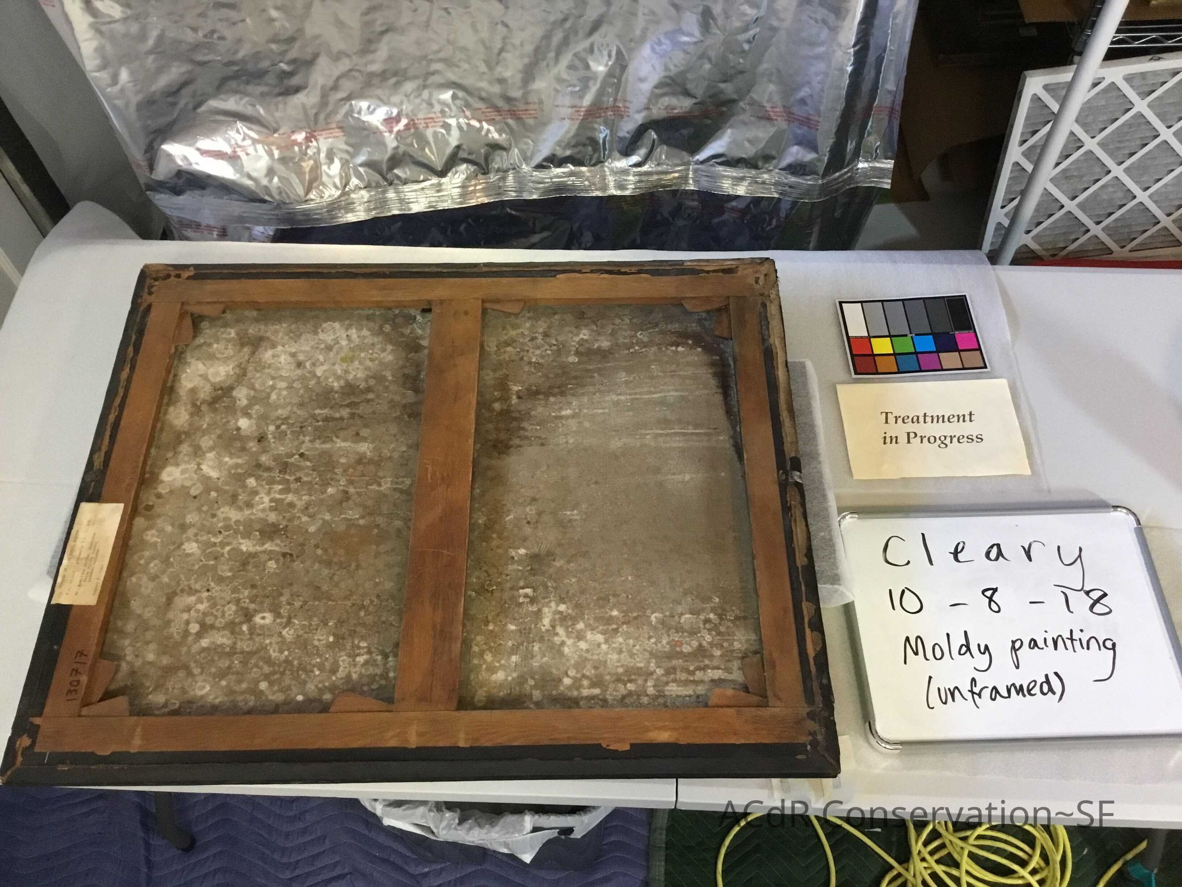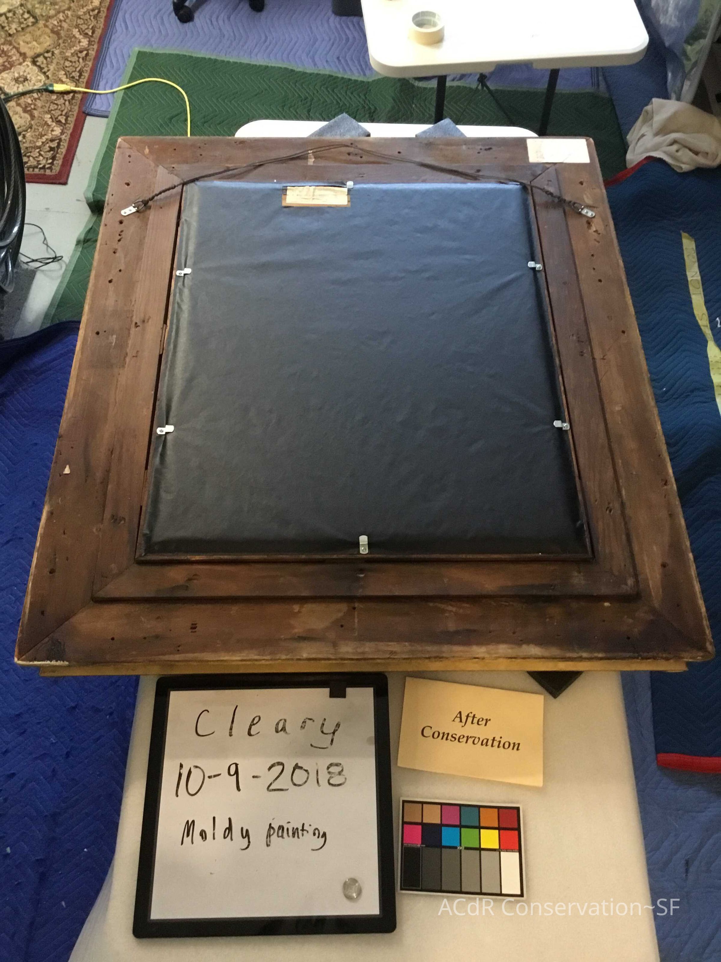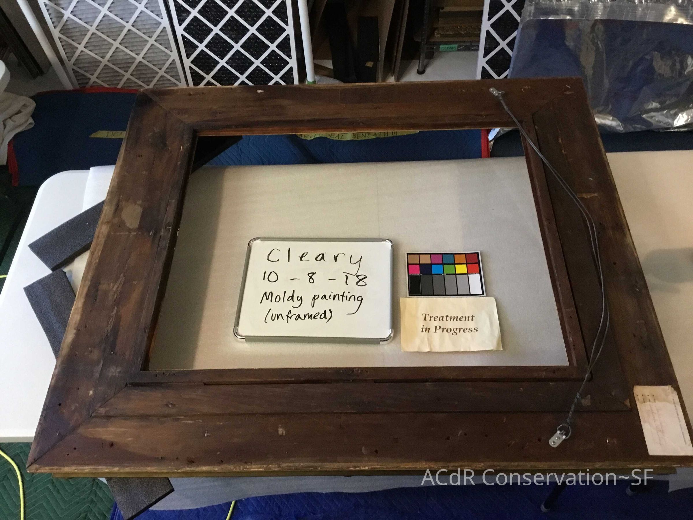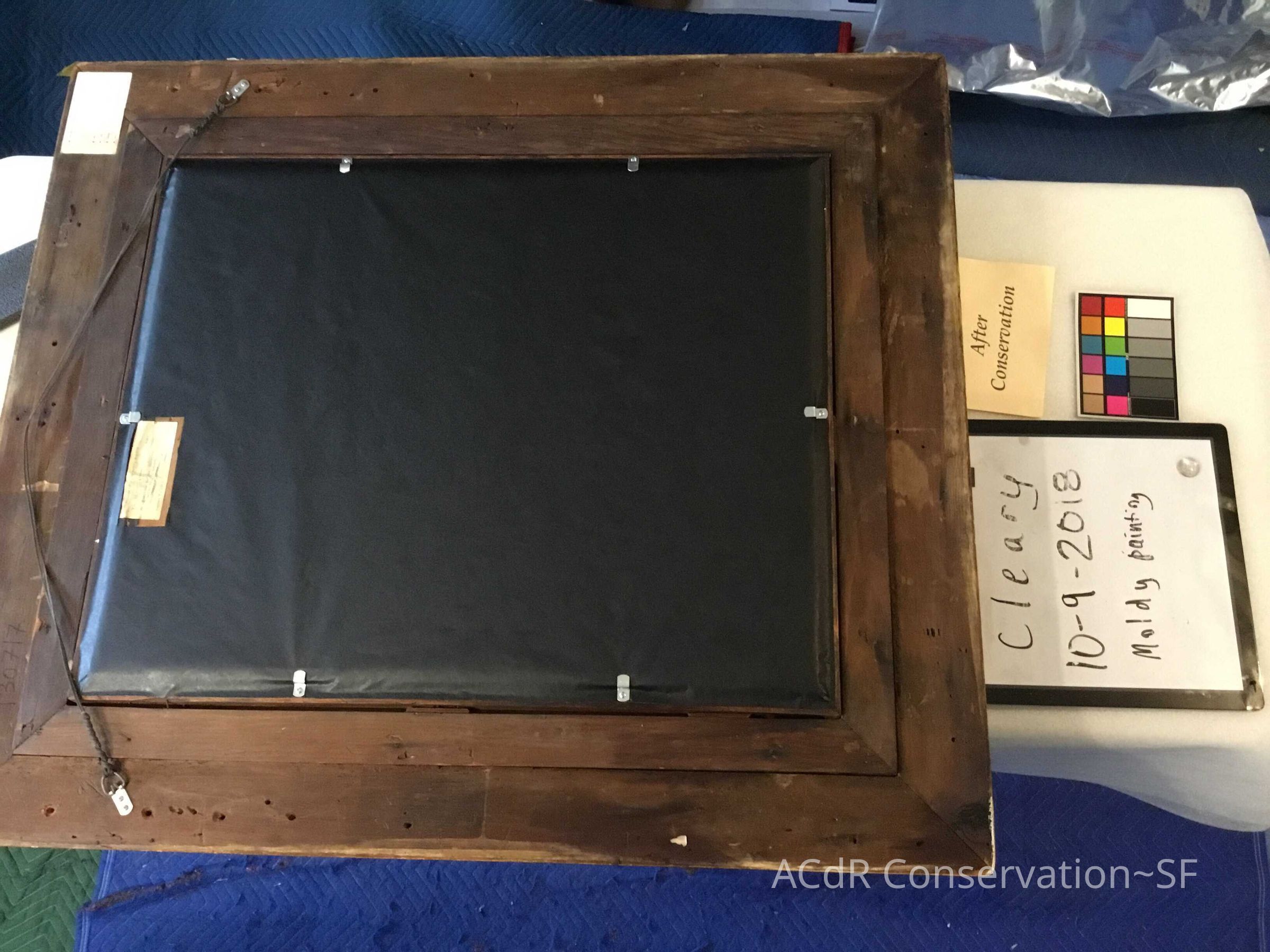 Bleaching to remove mold staining from back of canvas; cleaning of frame