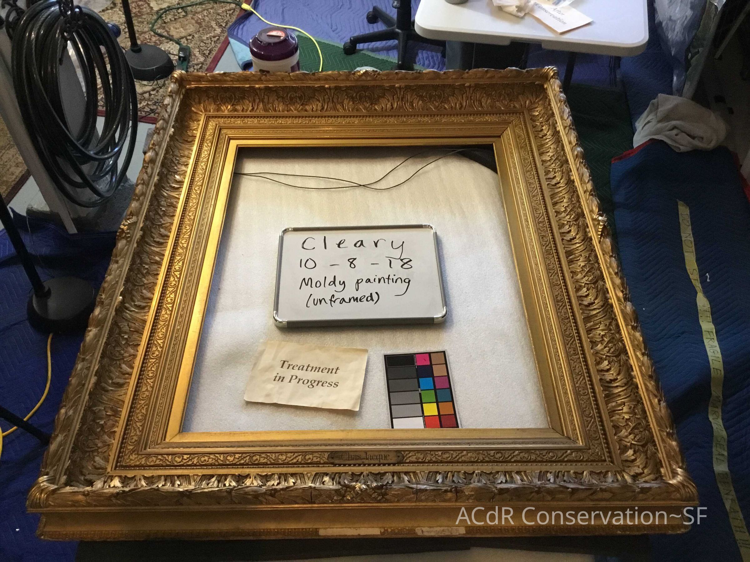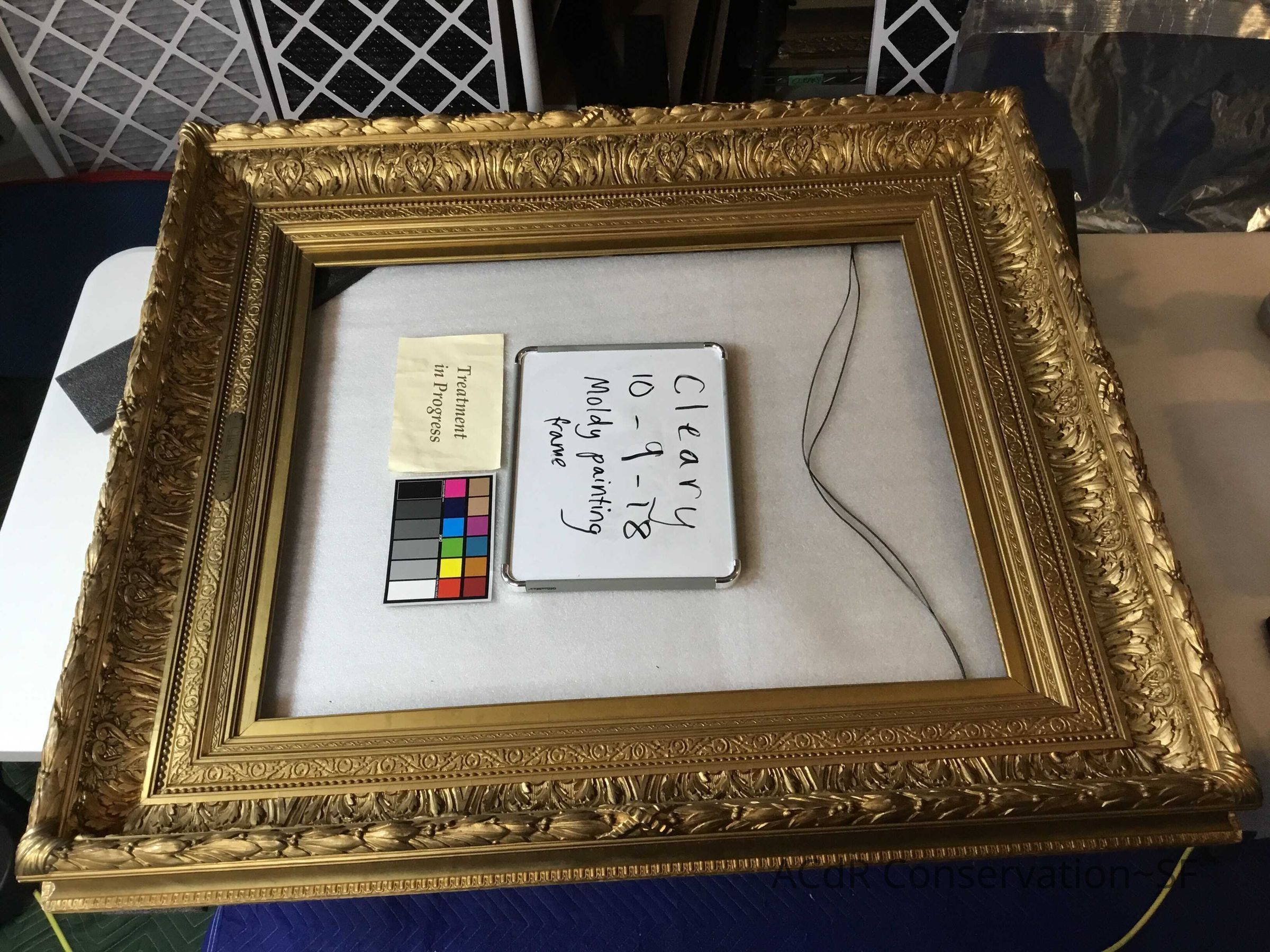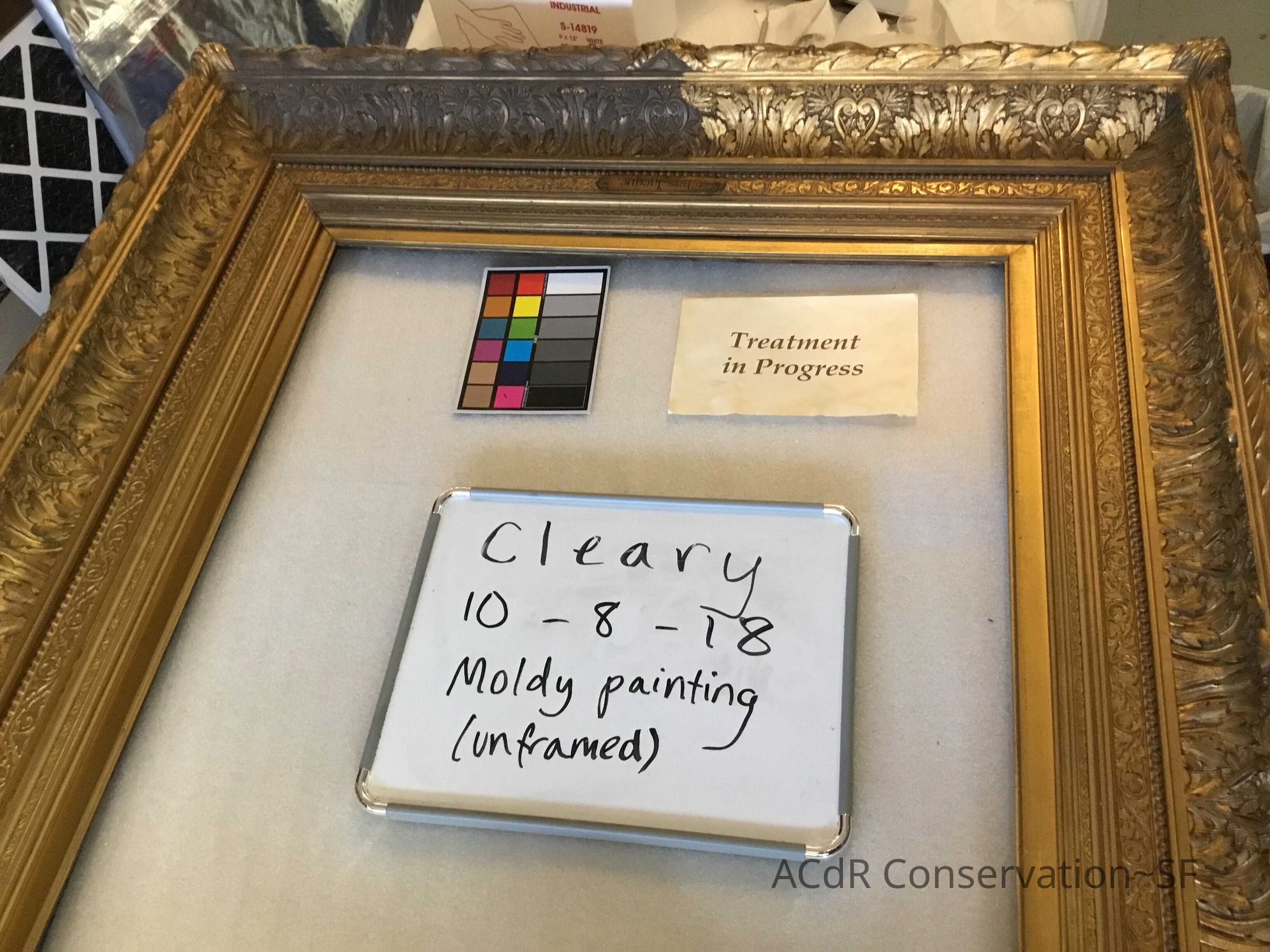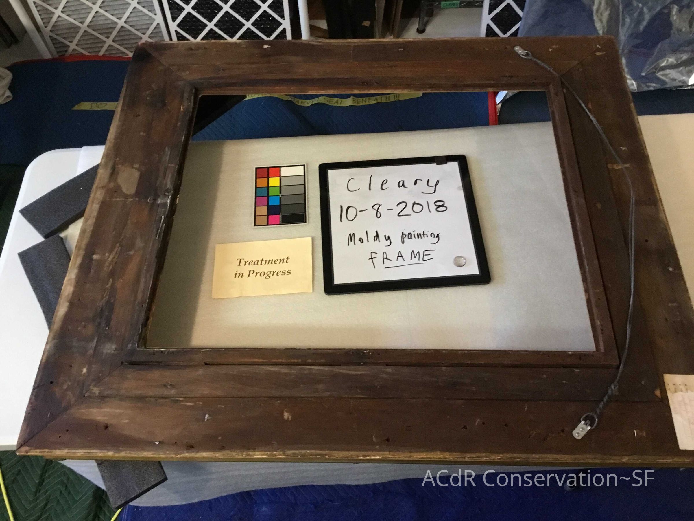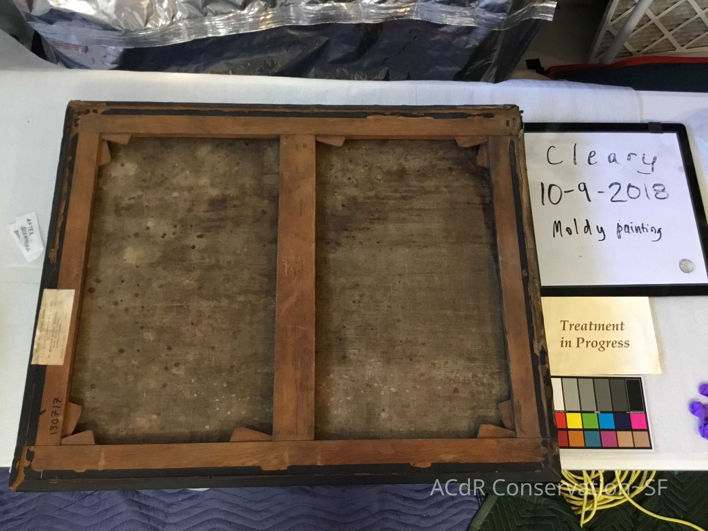 Bleaching to remove mold staining from back of canvas; cleaning of frame