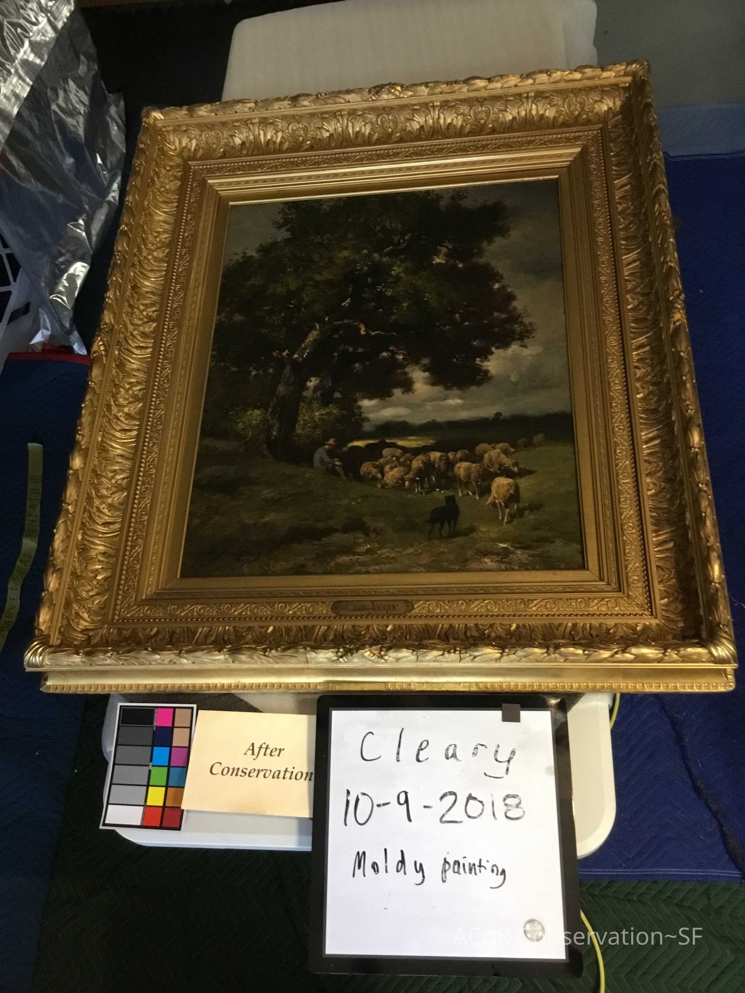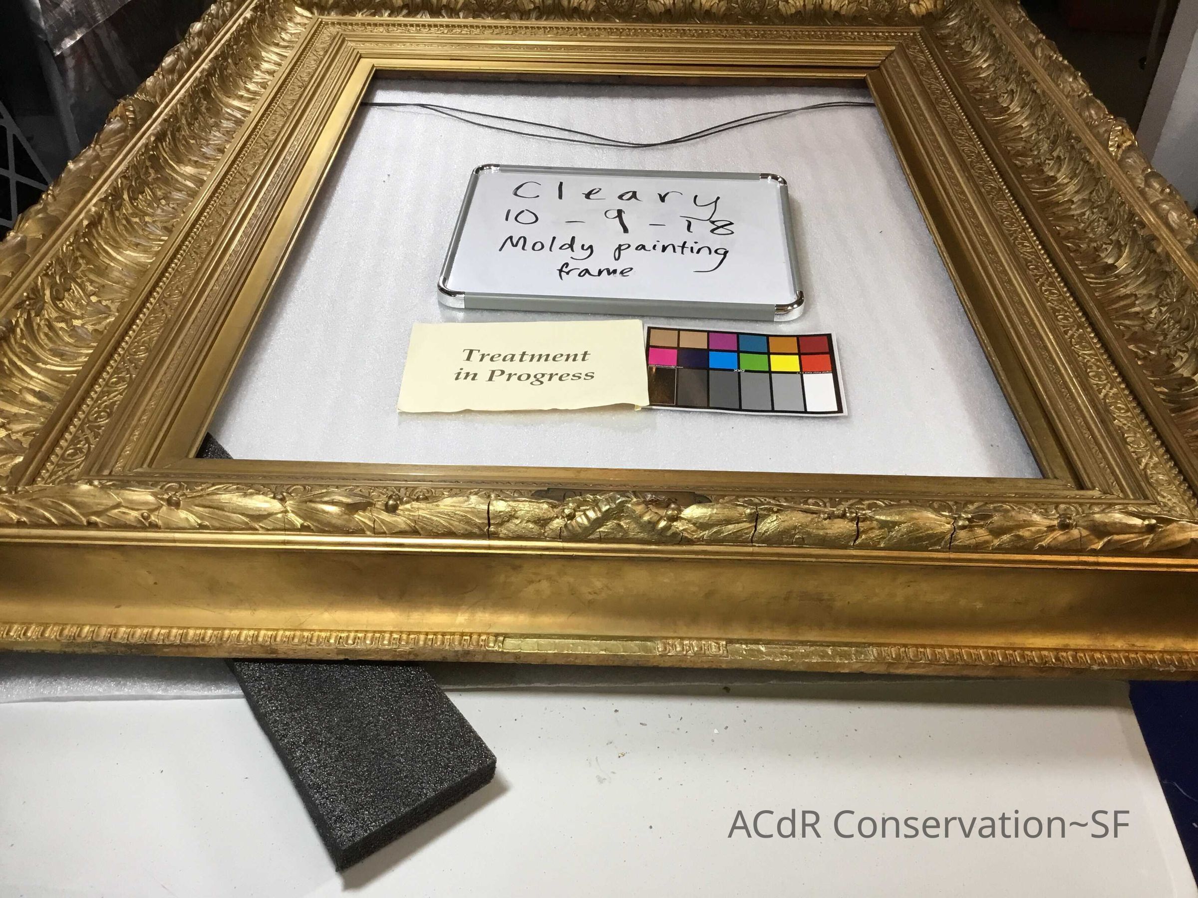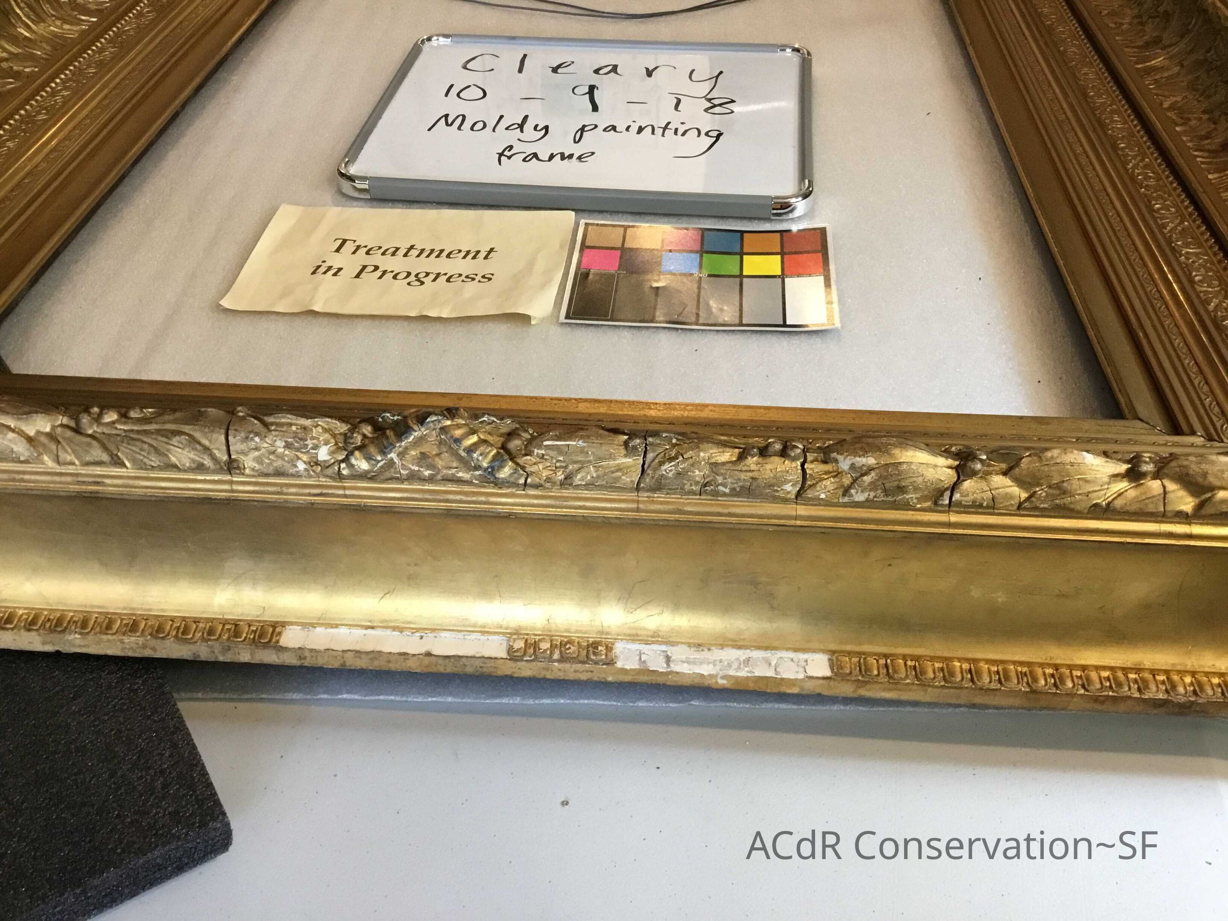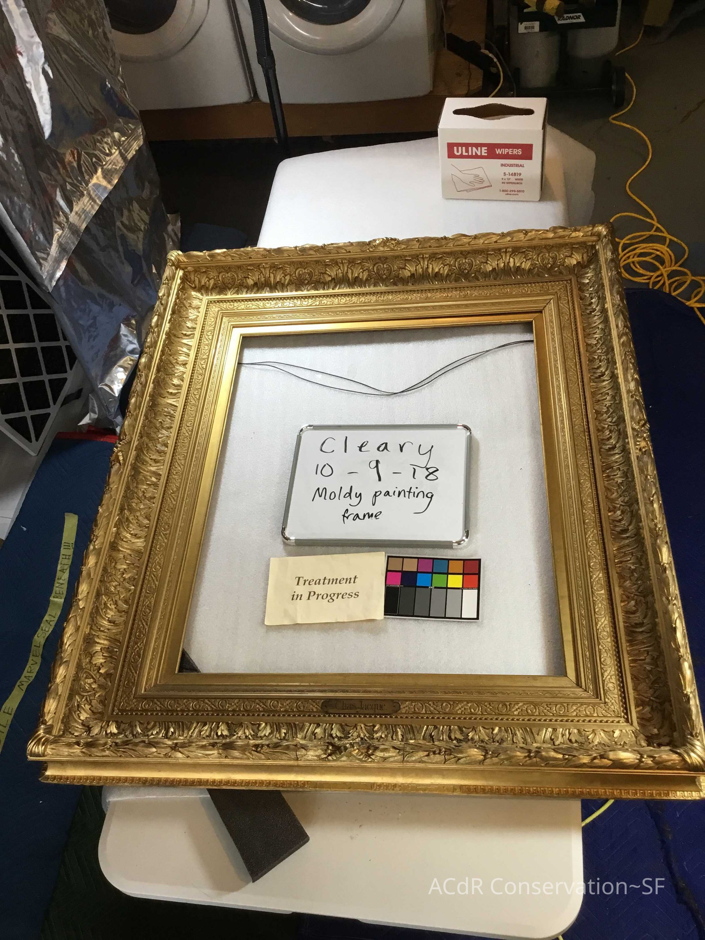 Bleaching to remove mold staining from back of canvas; cleaning of frame