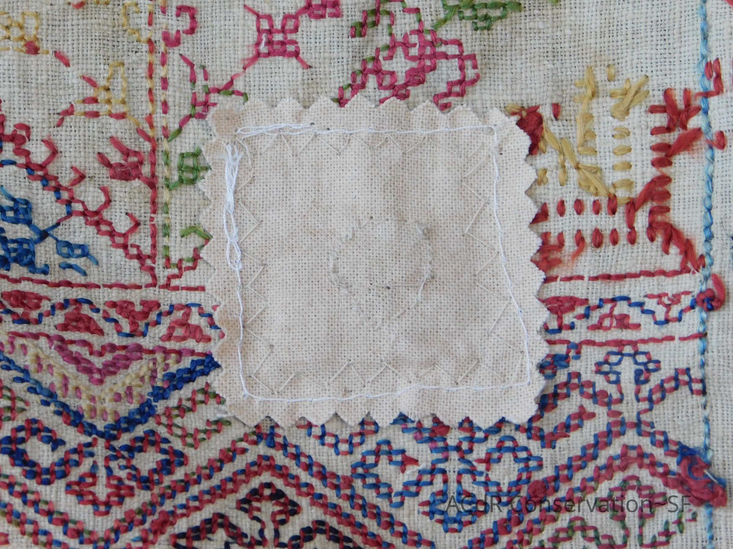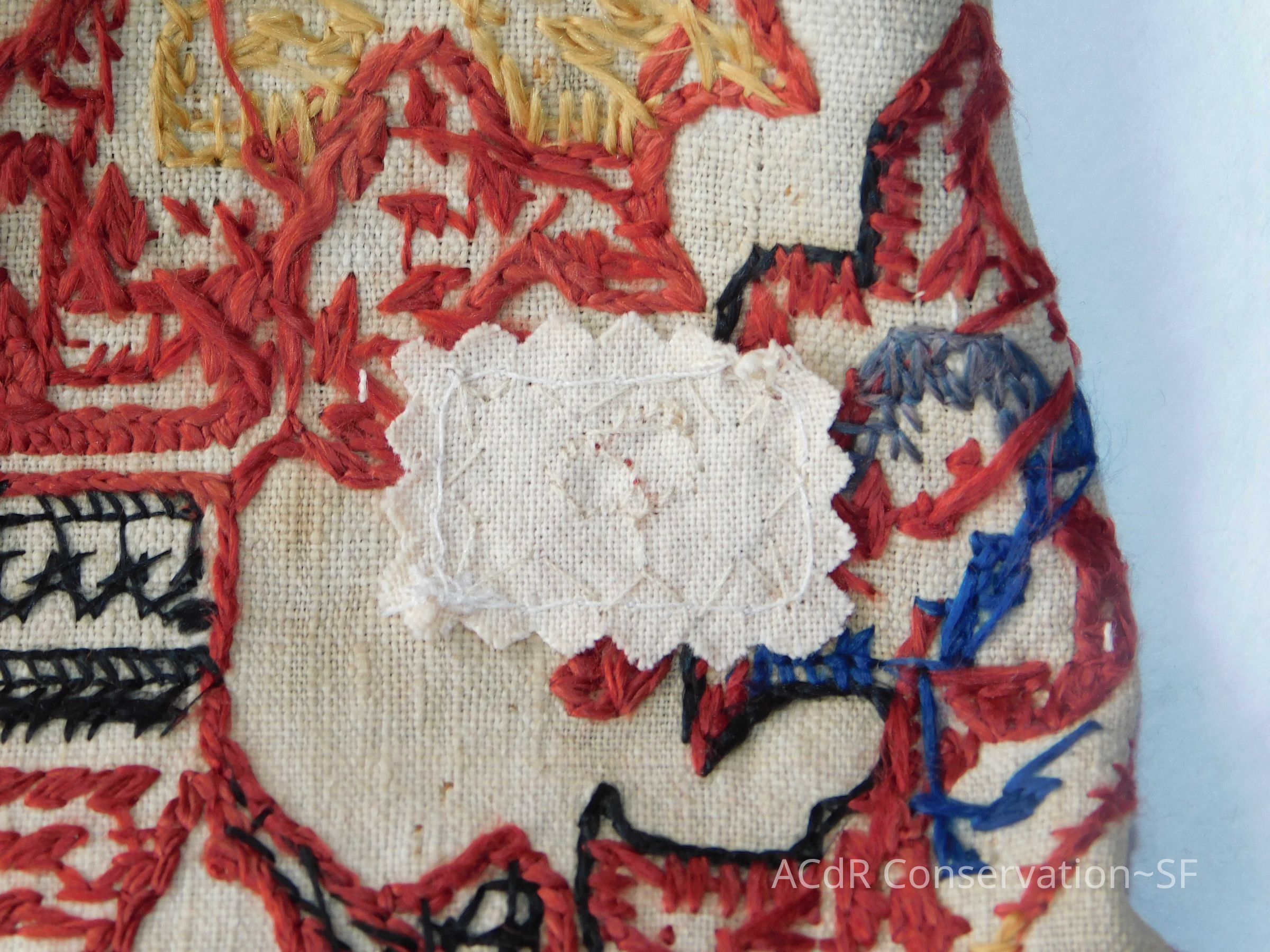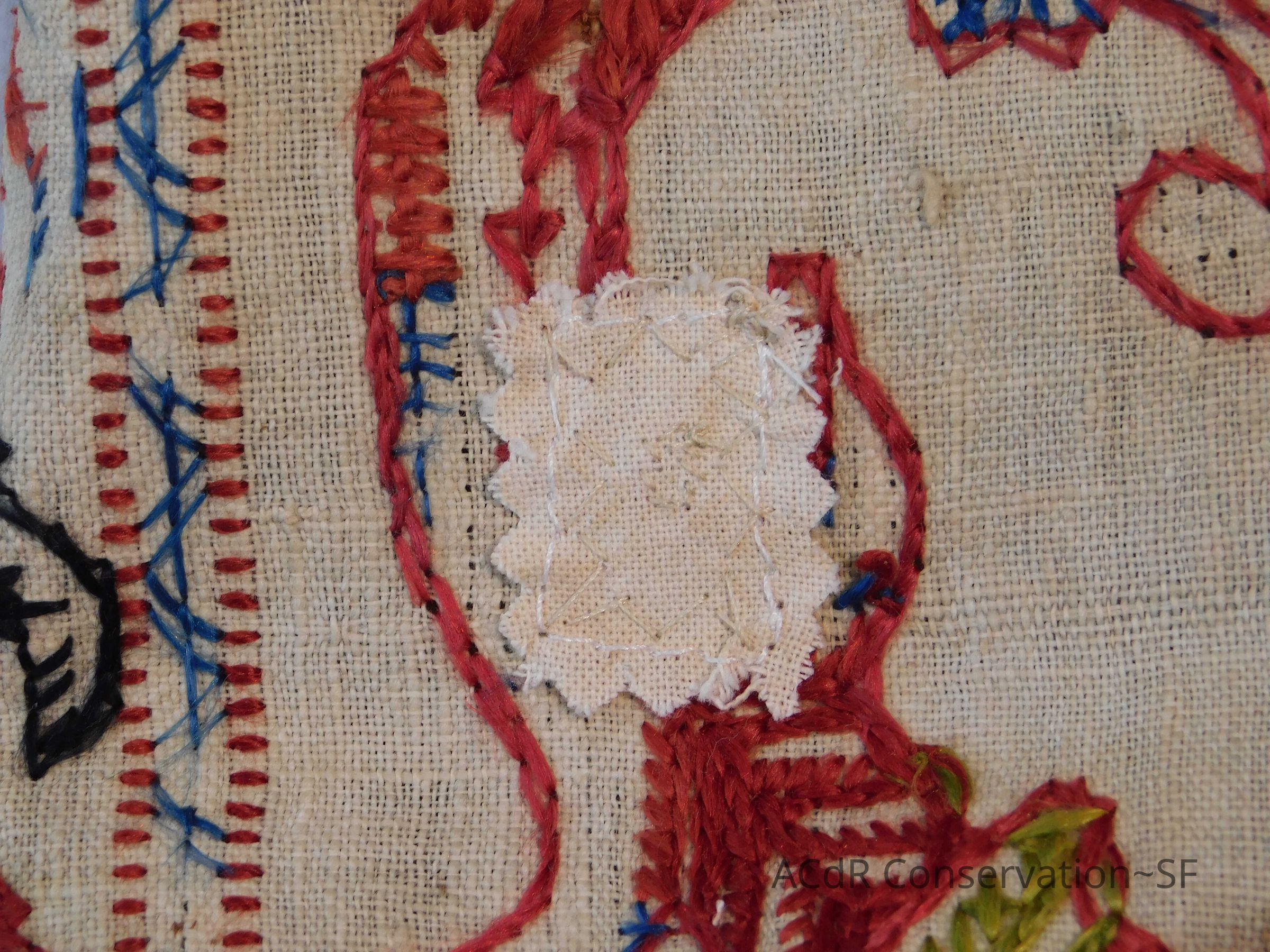 Began sewing and couching patches with photos taken throughout process. For patches, cut piece larger than hole and machine sewed edge to prevent fraying. Zig-zag sewed around patch with small stitches on face of piece. Couch edge of hole down to patch with small couching stitches.