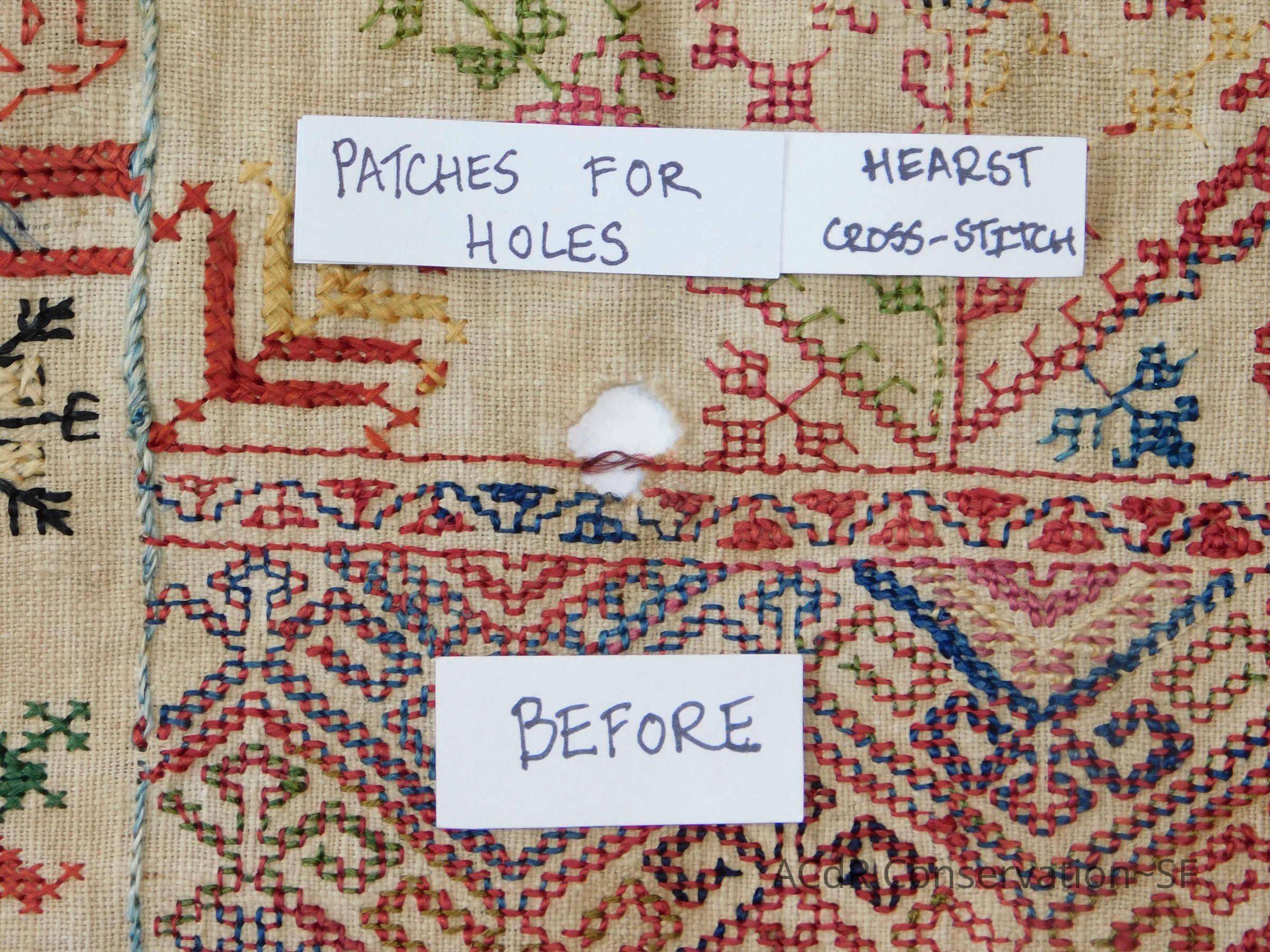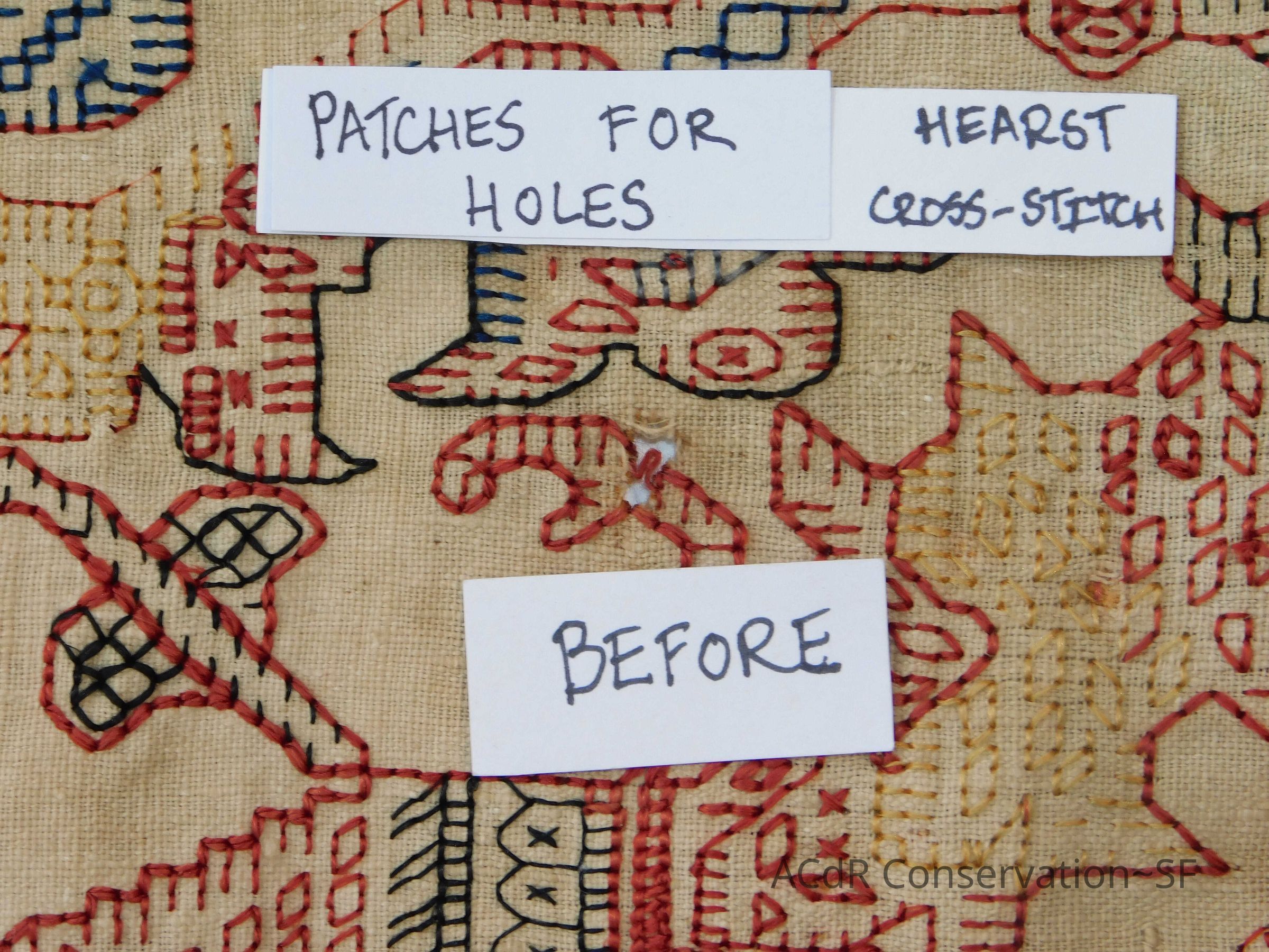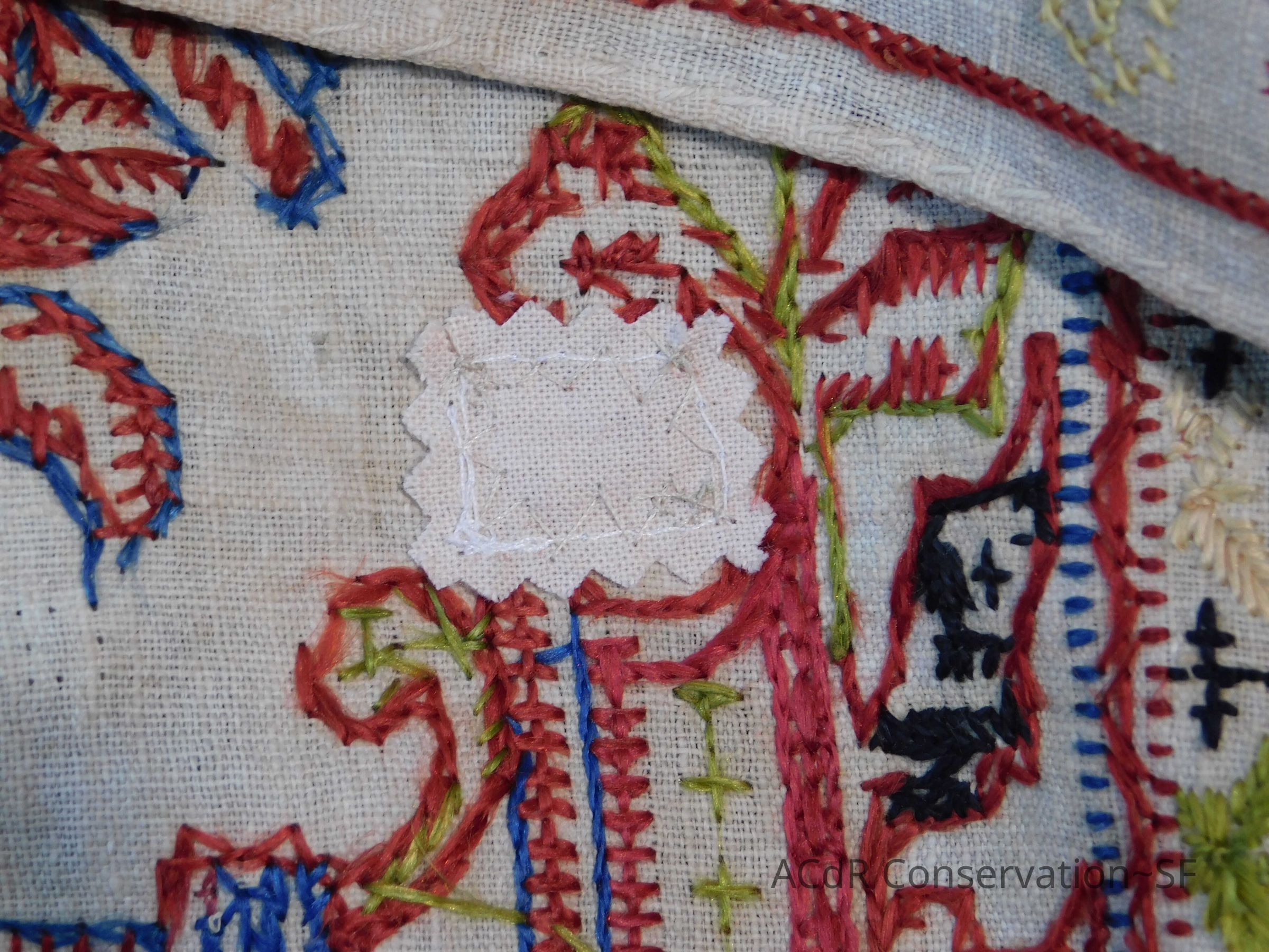 Began sewing and couching patches with photos taken throughout process. For patches, cut piece larger than hole and machine sewed edge to prevent fraying. Zig-zag sewed around patch with small stitches on face of piece. Couch edge of hole down to patch with small couching stitches.