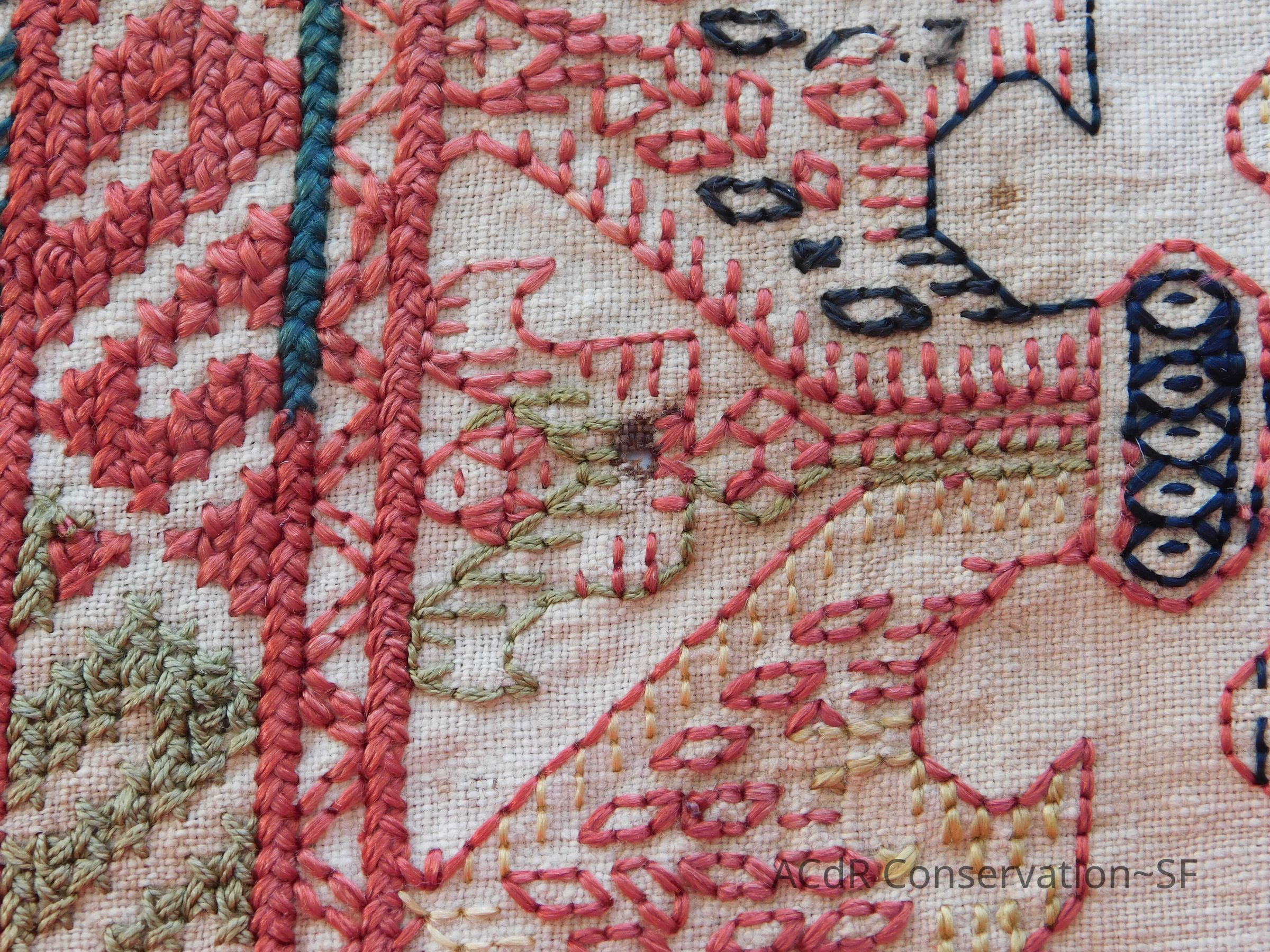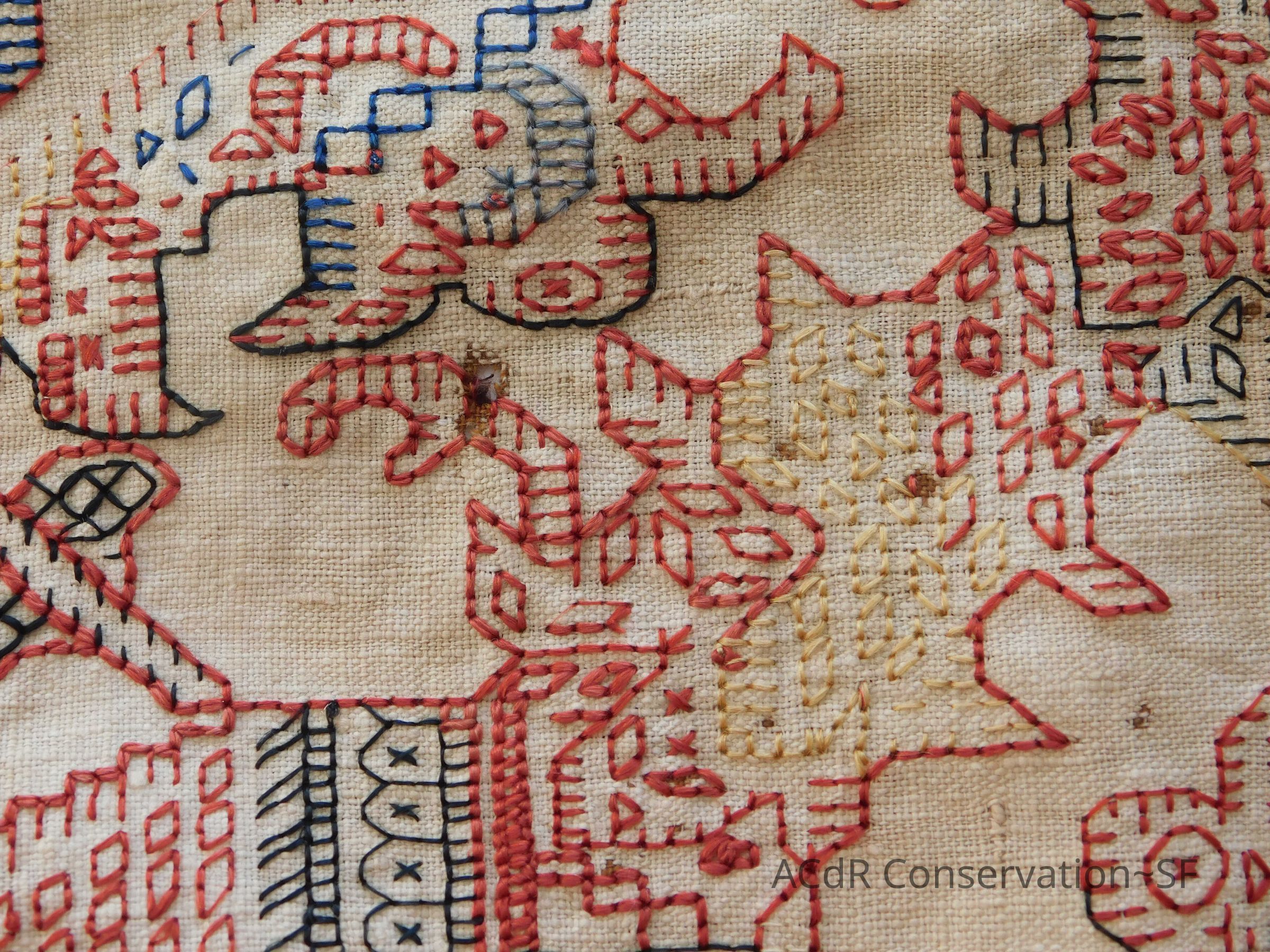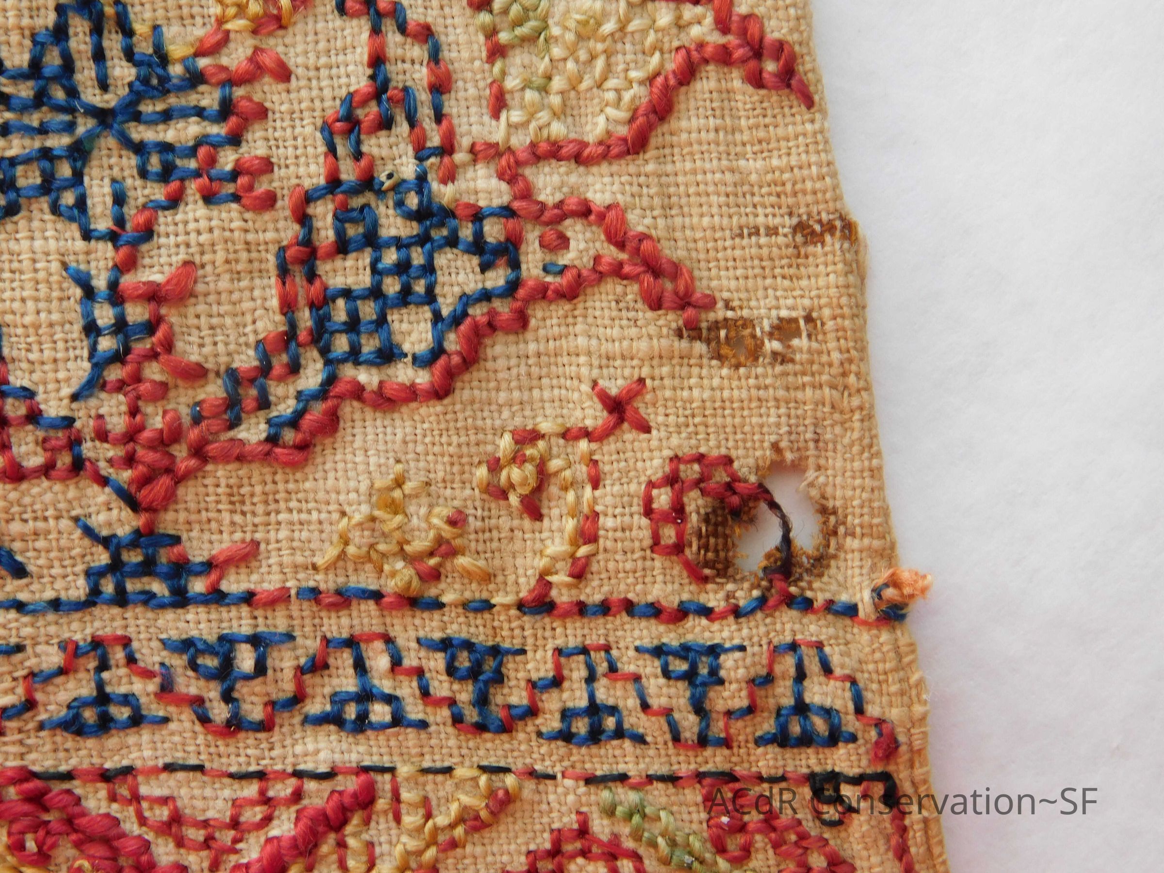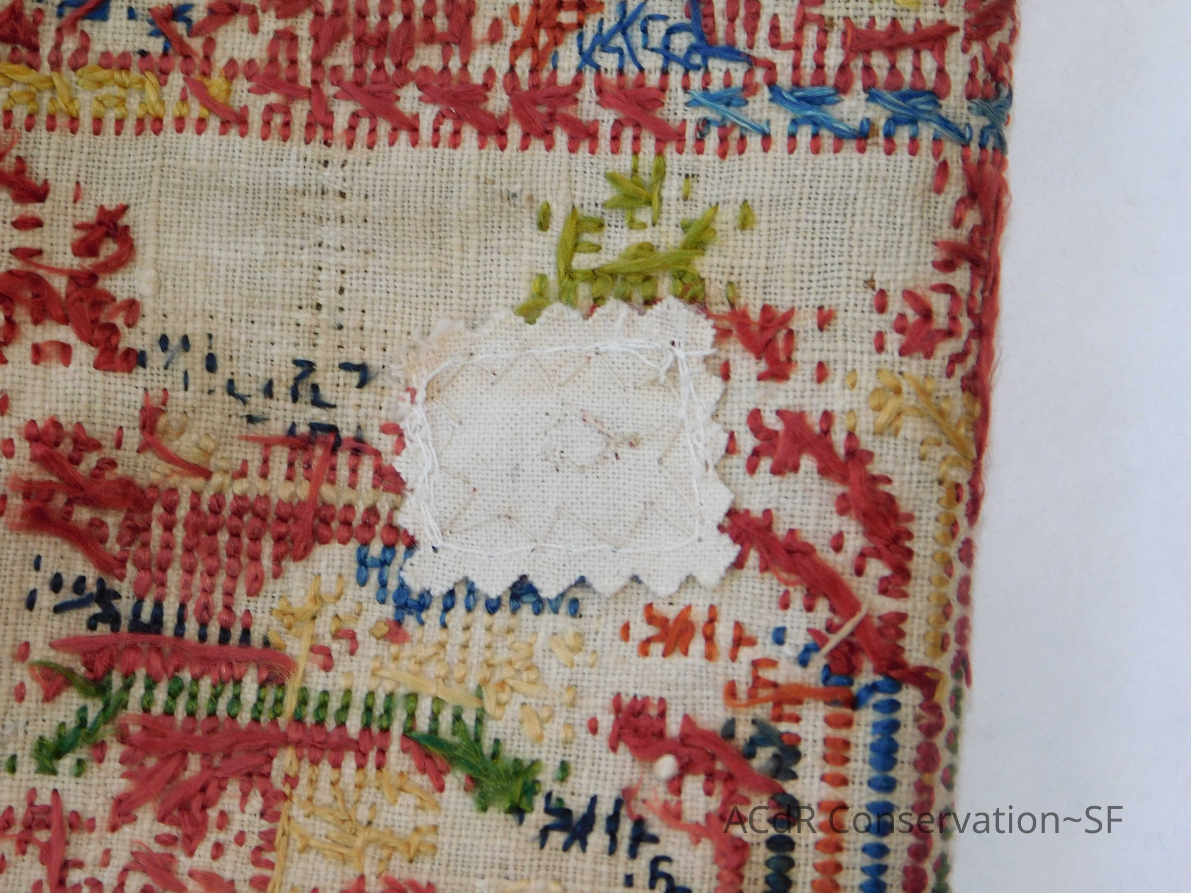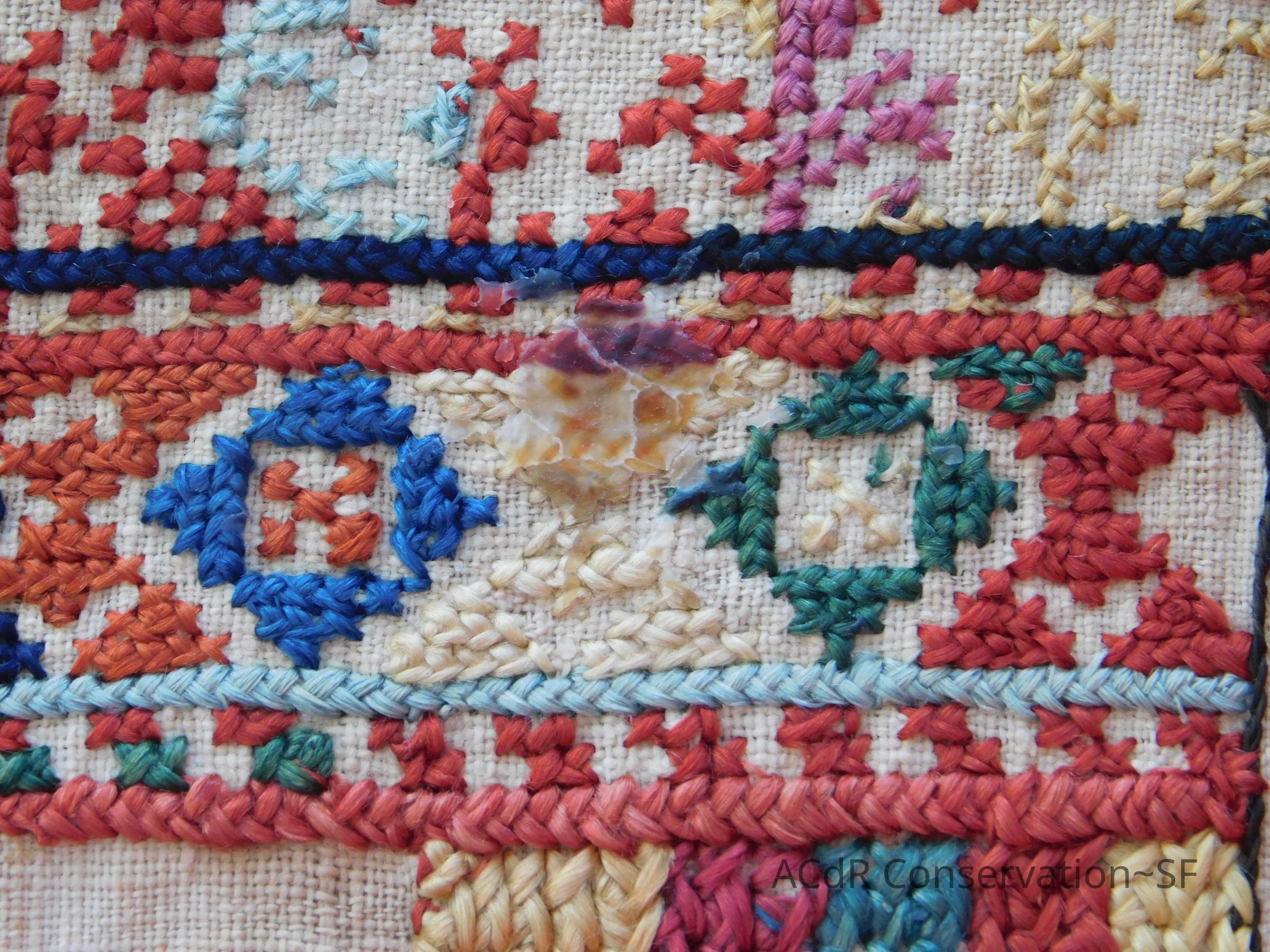 Staining throughout, some darker like splatters that have formed holes. Some stitching has broken and disintegrated due to either sun damage or abrasion. Colors faded. Wax and other encrustations attached to threads.