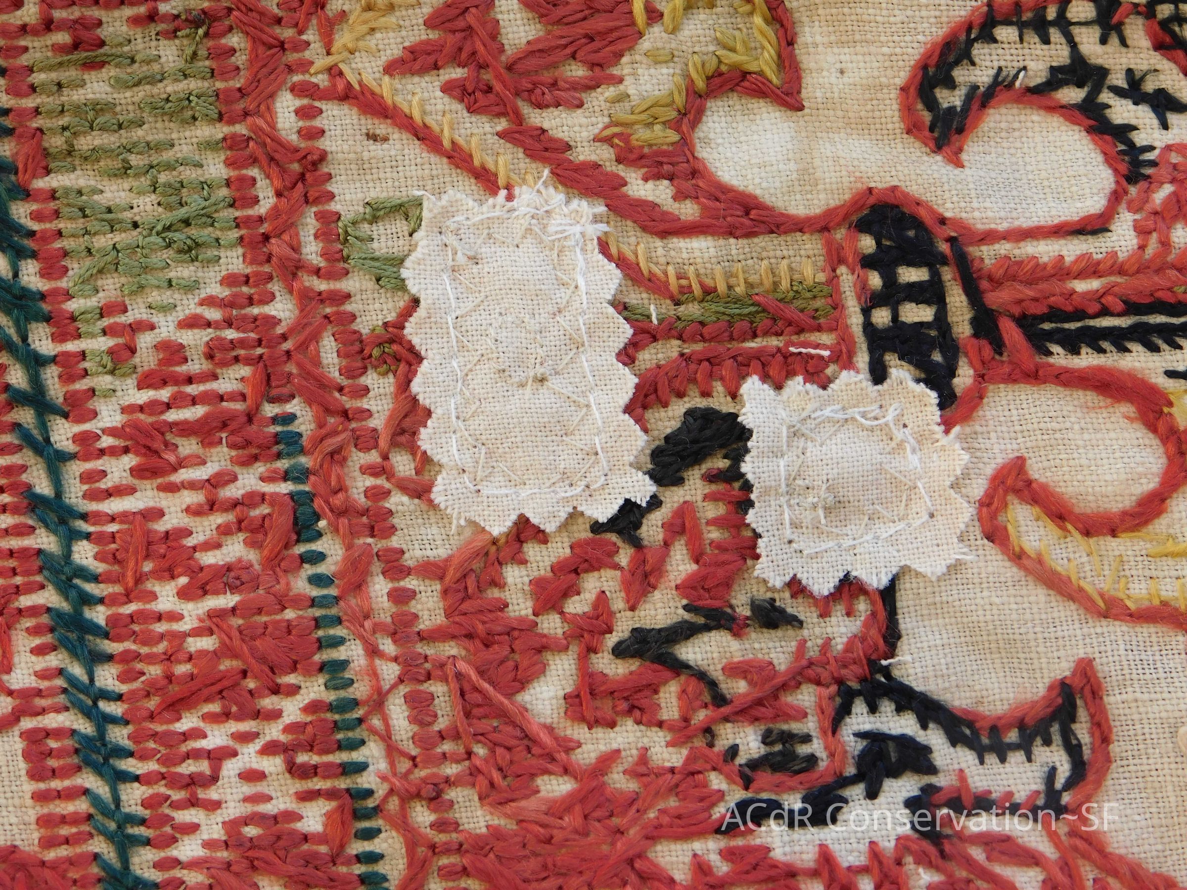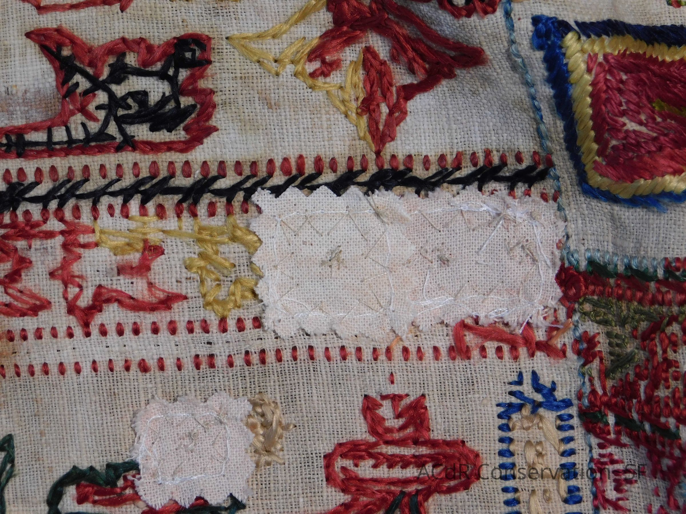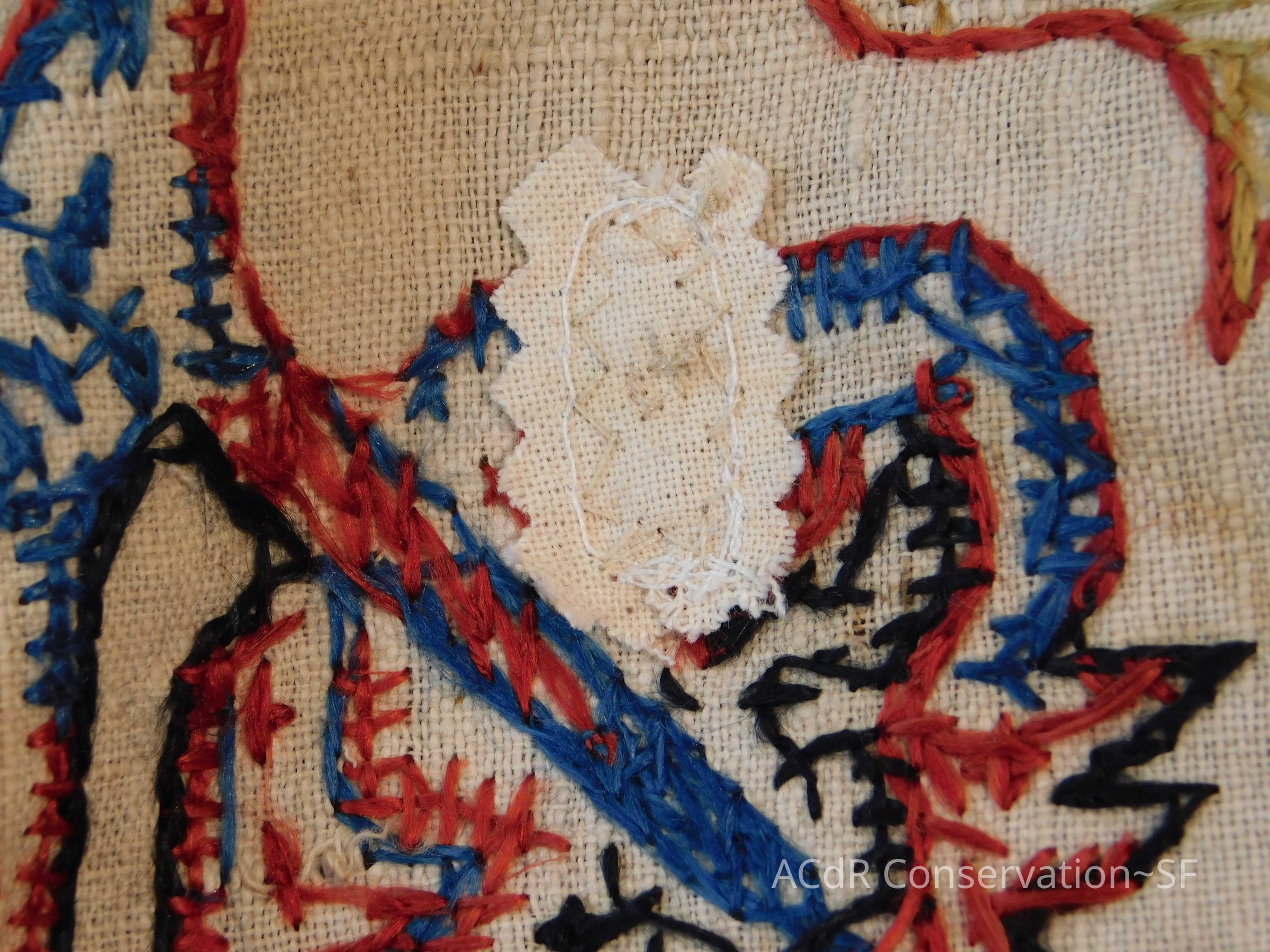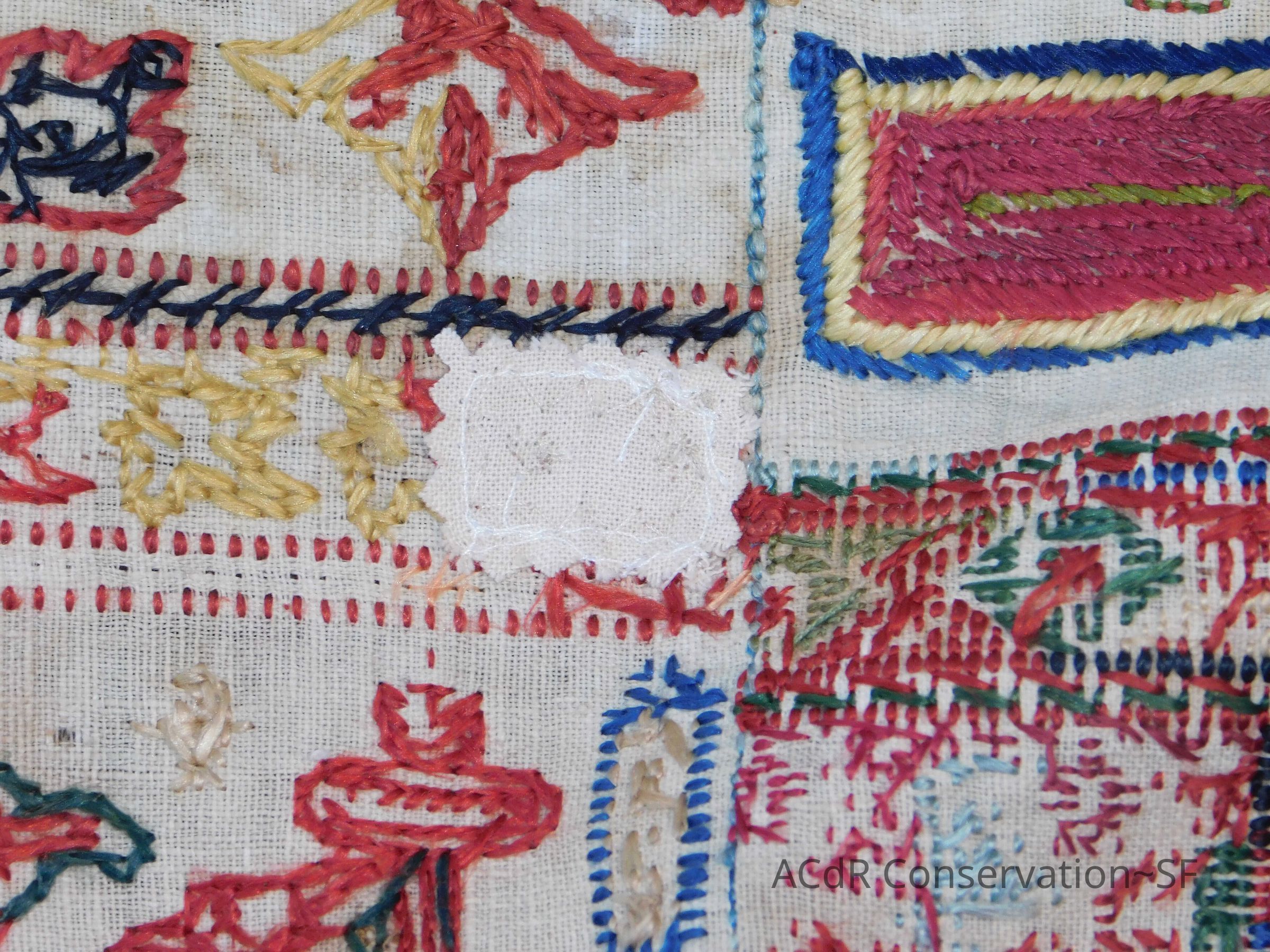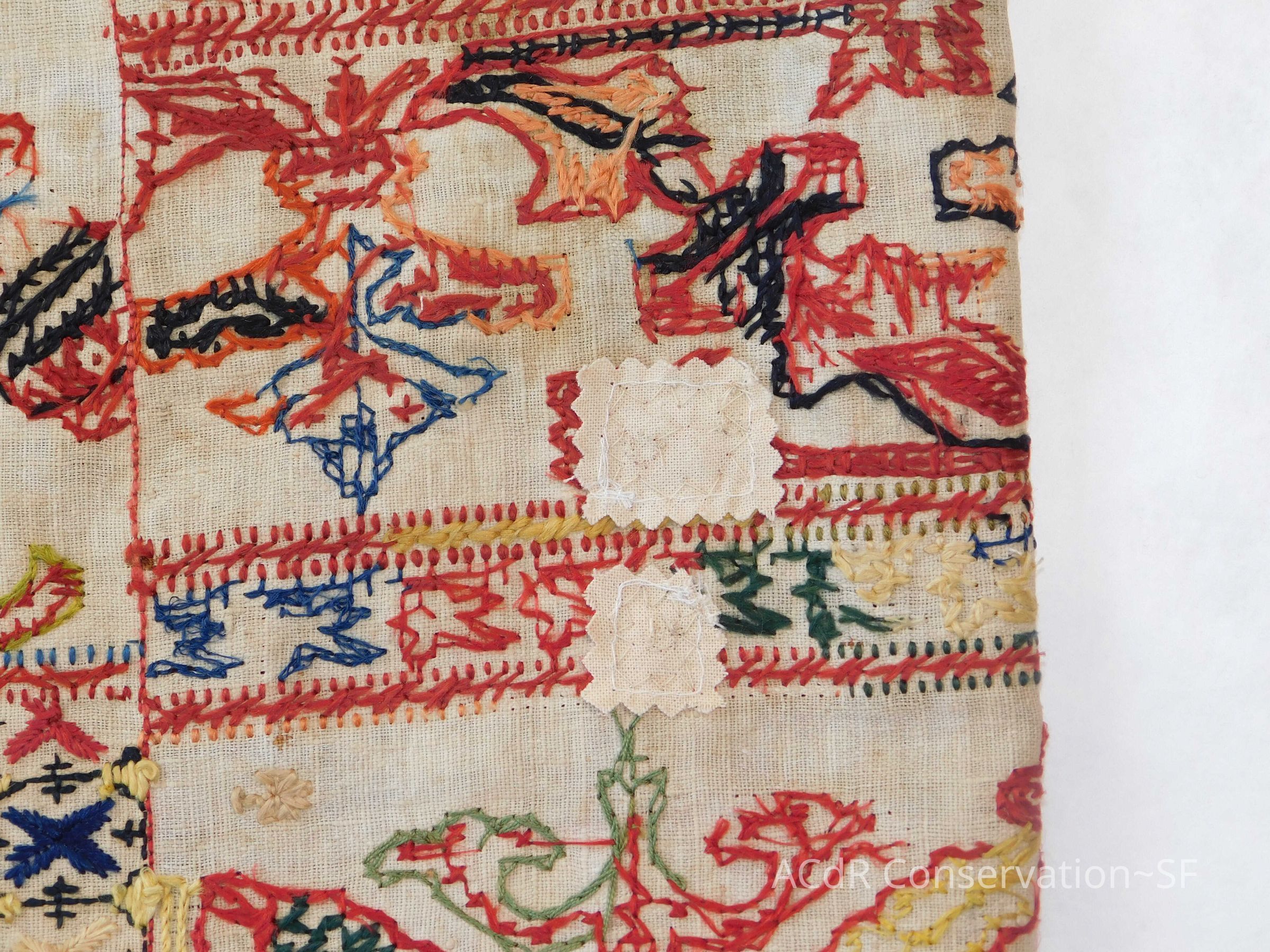 Staining throughout, some darker like splatters that have formed holes. Some stitching has broken and disintegrated due to either sun damage or abrasion. Colors faded. Wax and other encrustations attached to threads.