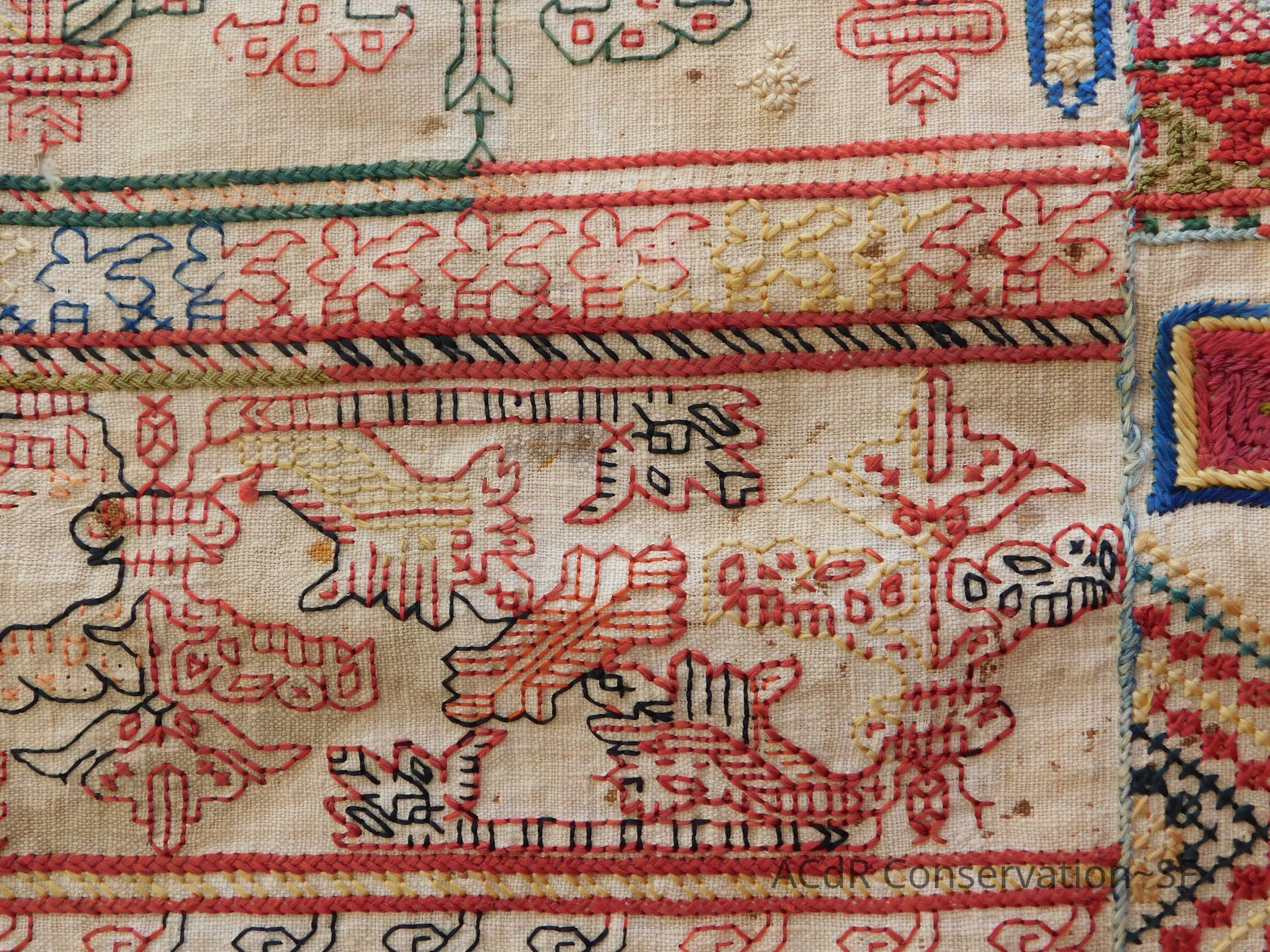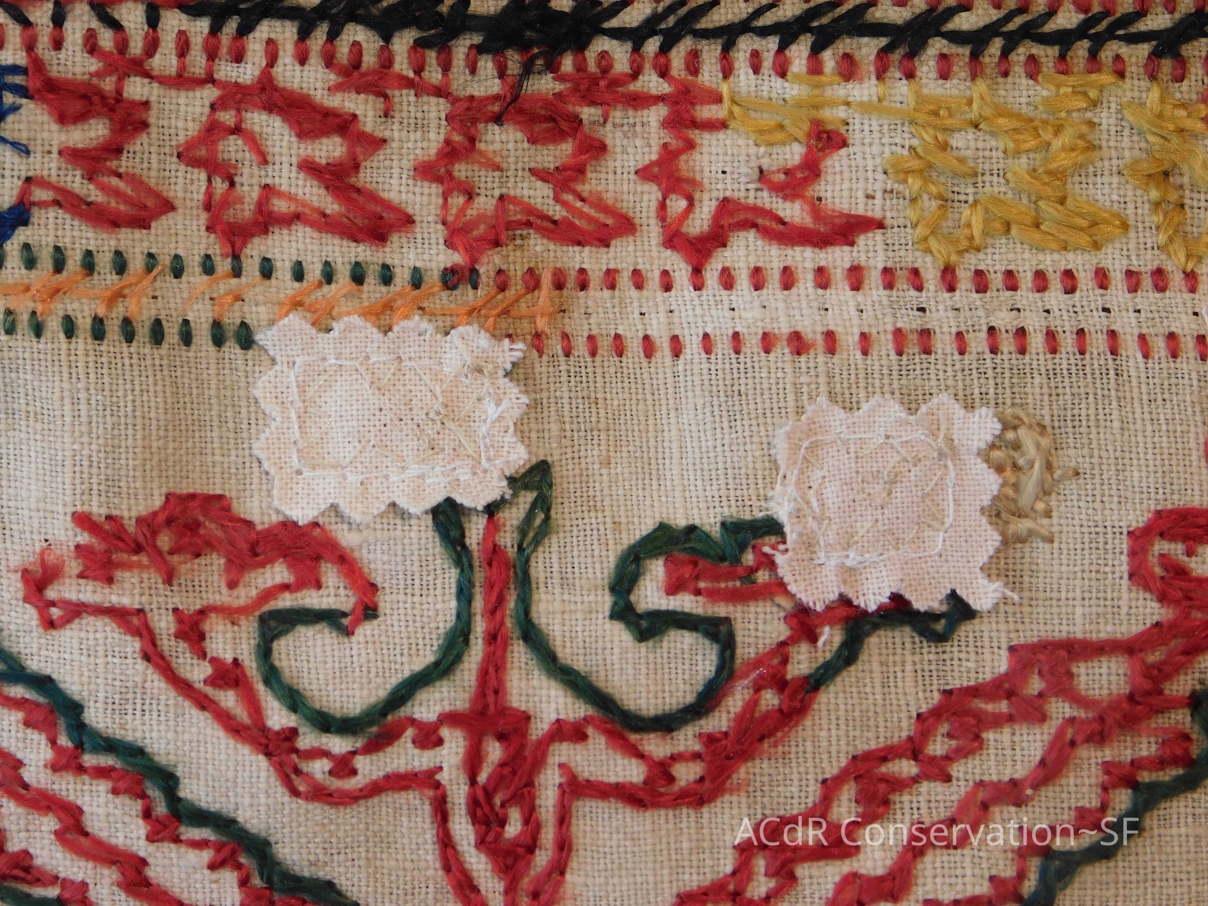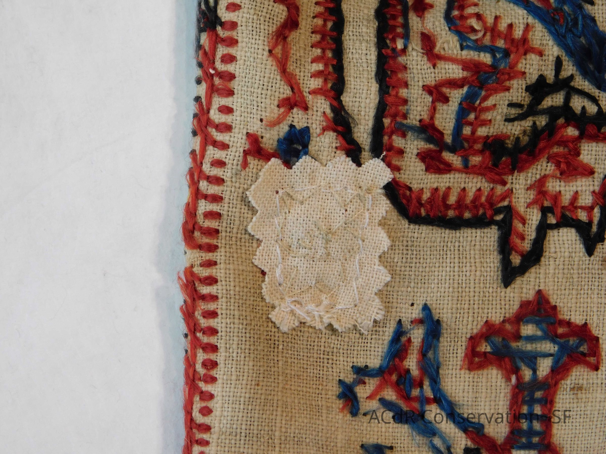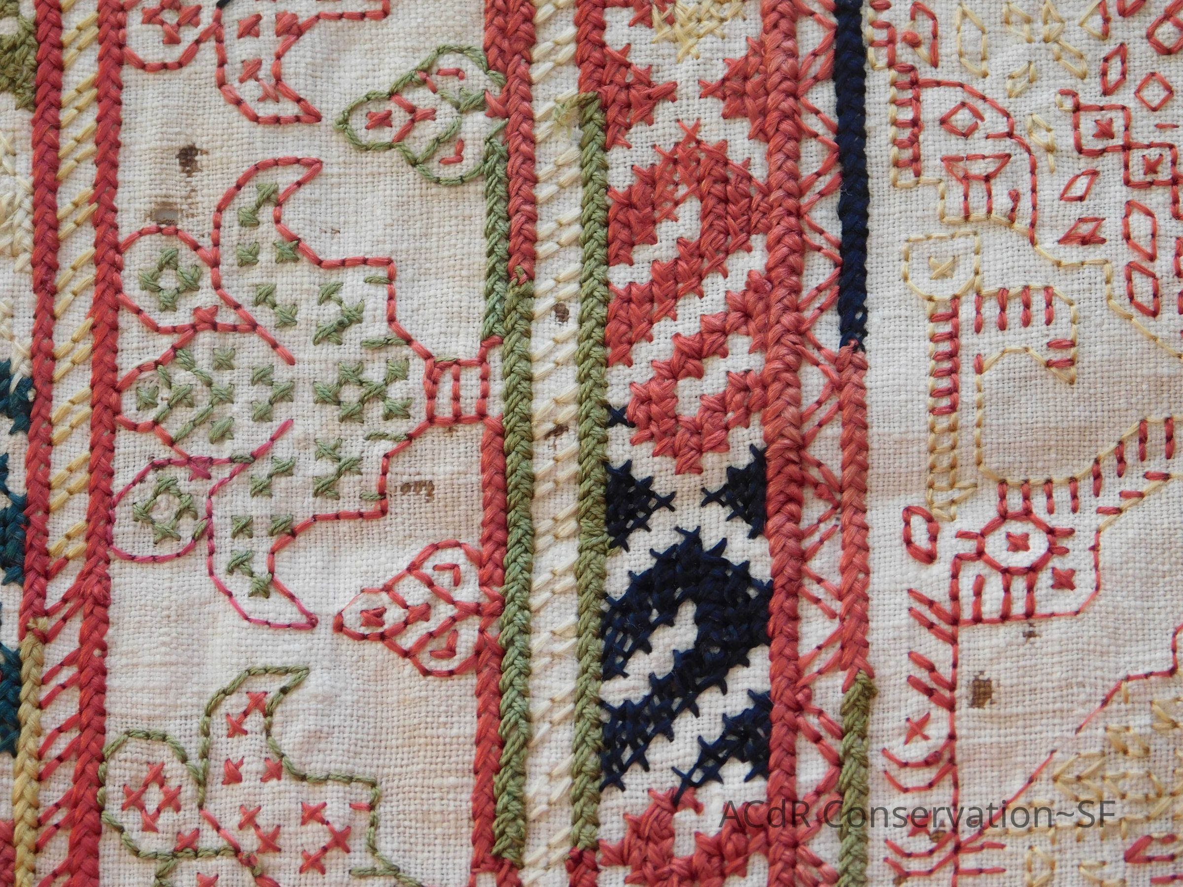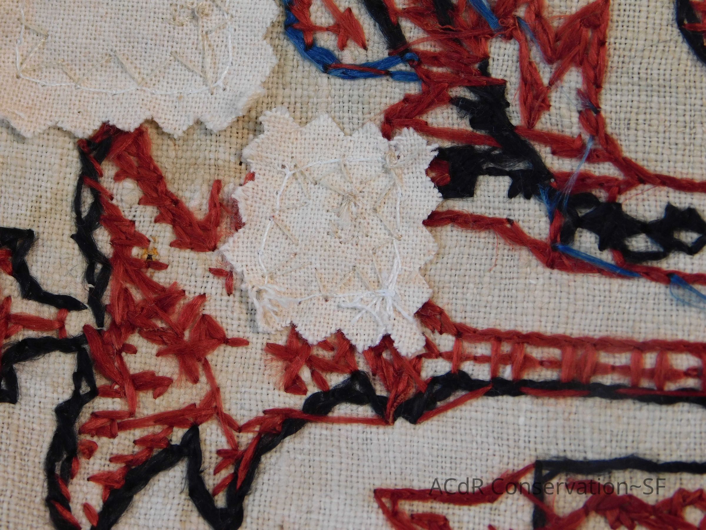 Staining throughout, some darker like splatters that have formed holes. Some stitching has broken and disintegrated due to either sun damage or abrasion. Colors faded. Wax and other encrustations attached to threads.