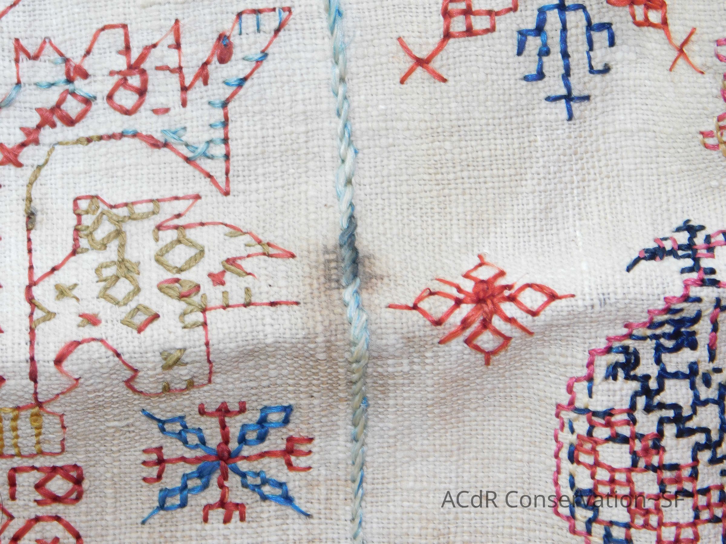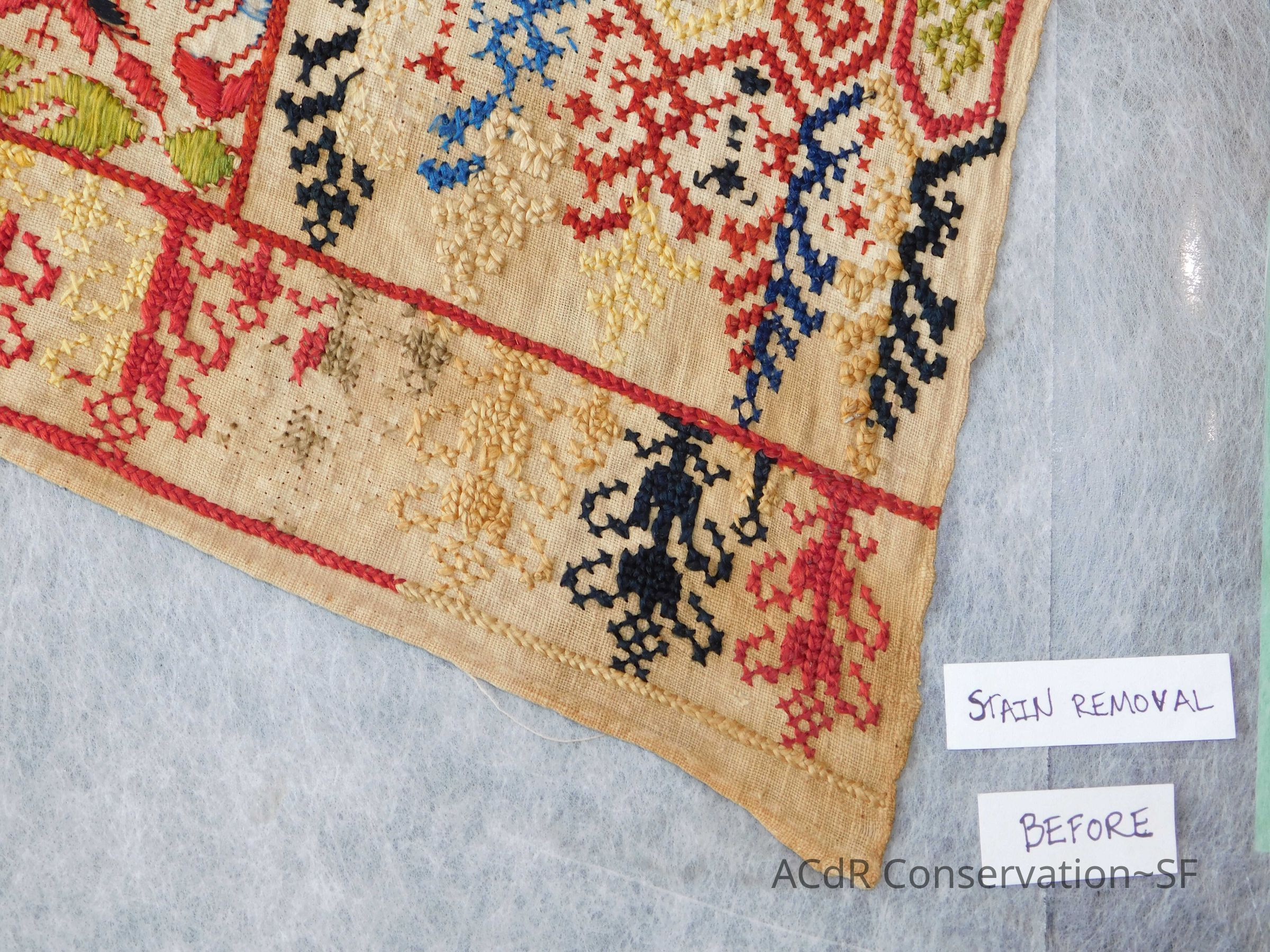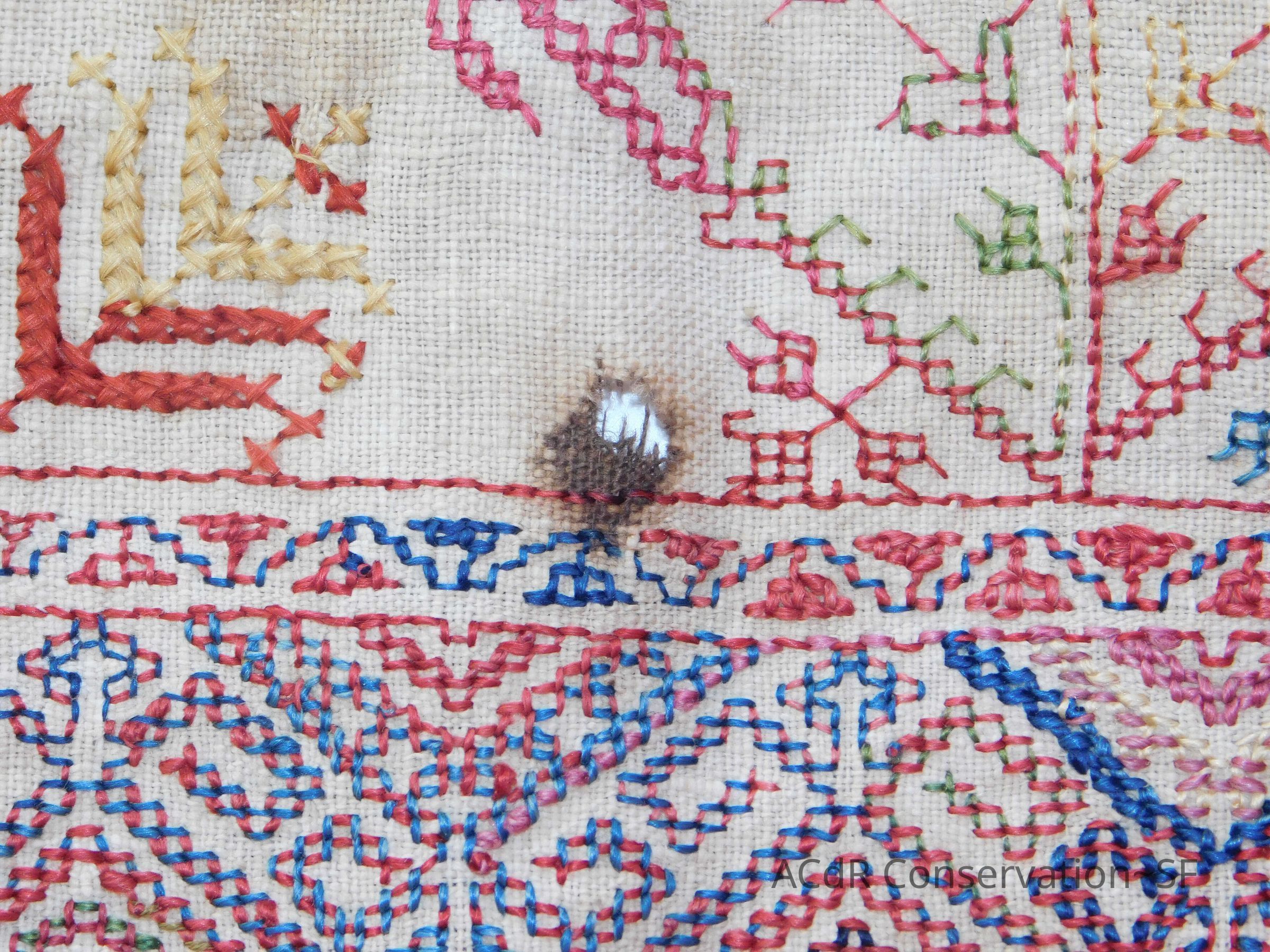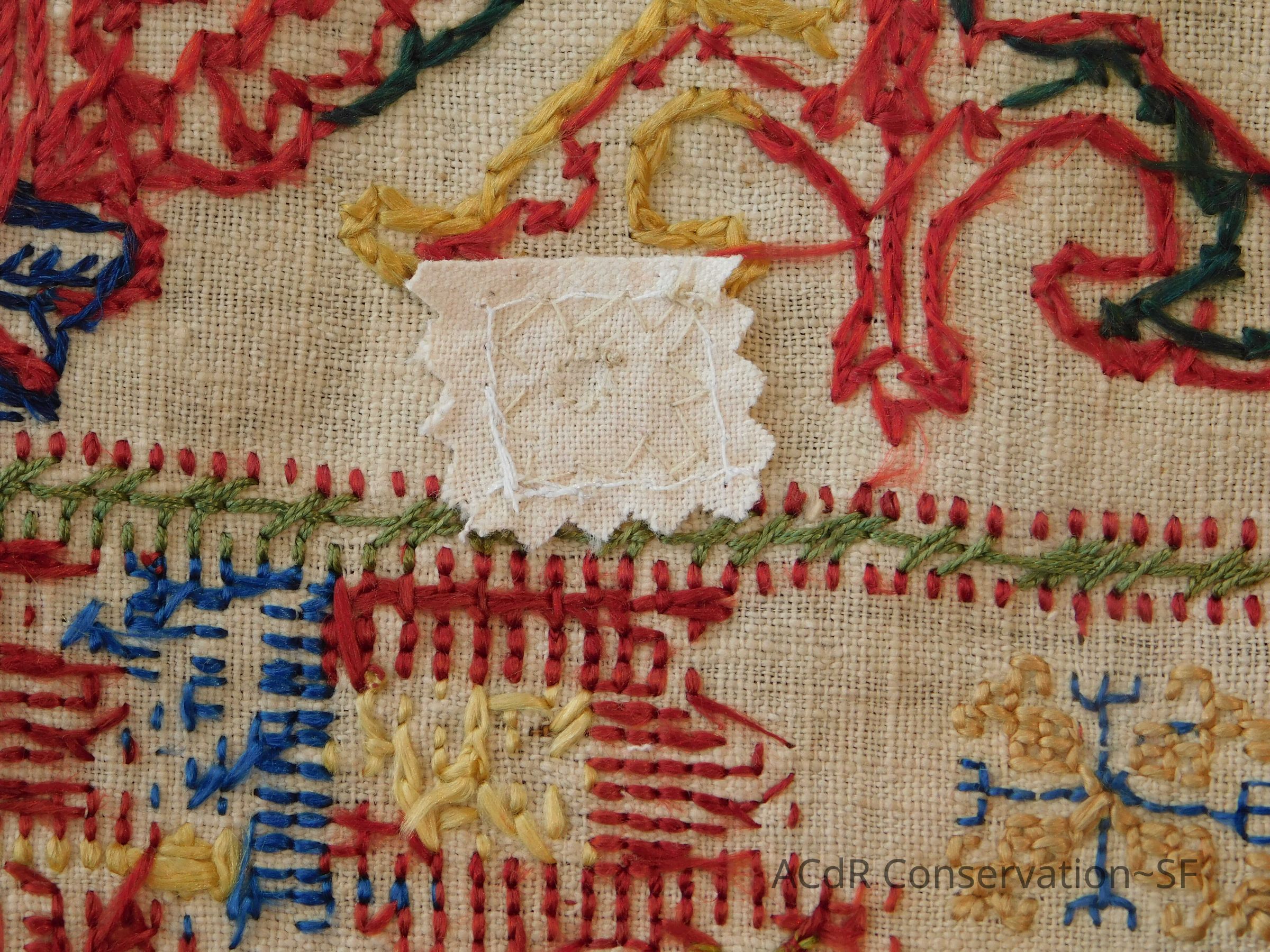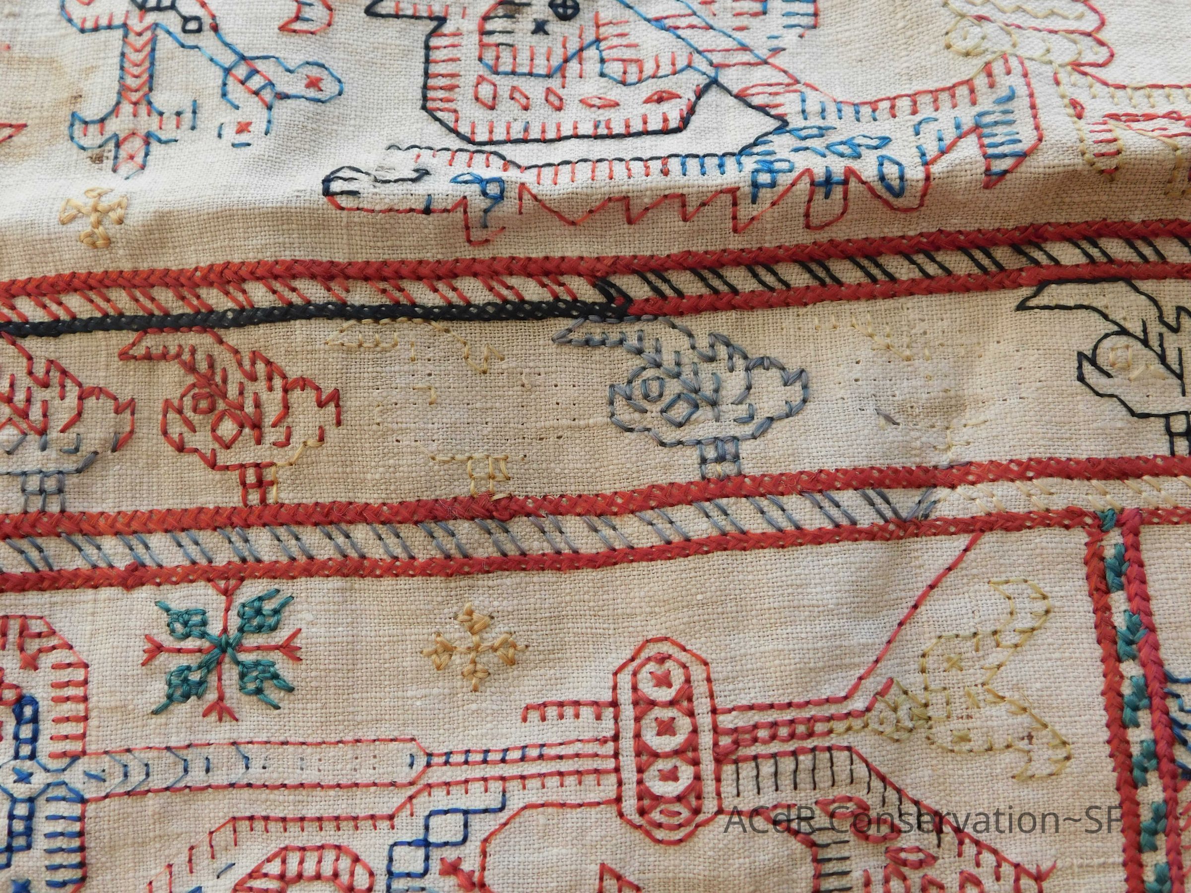 Staining throughout, some darker like splatters that have formed holes. Some stitching has broken and disintegrated due to either sun damage or abrasion. Colors faded. Wax and other encrustations attached to threads.
