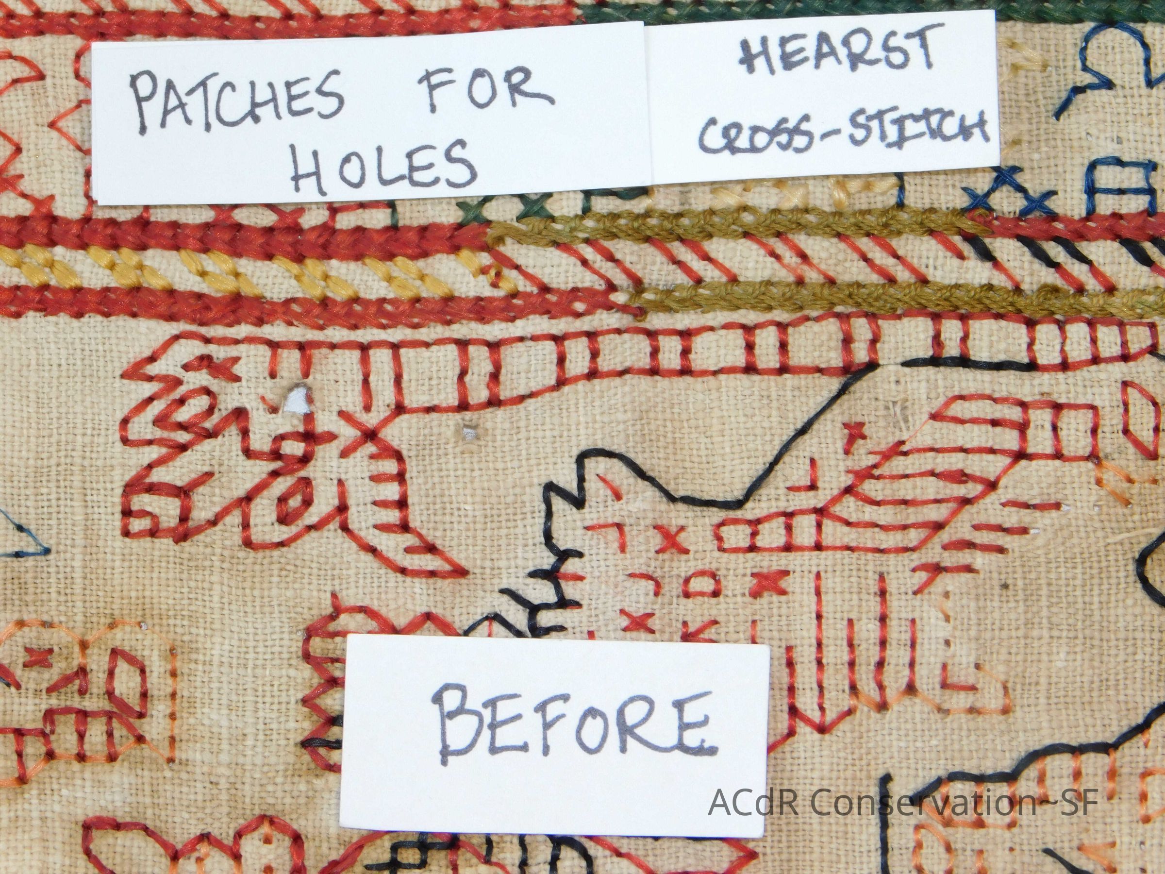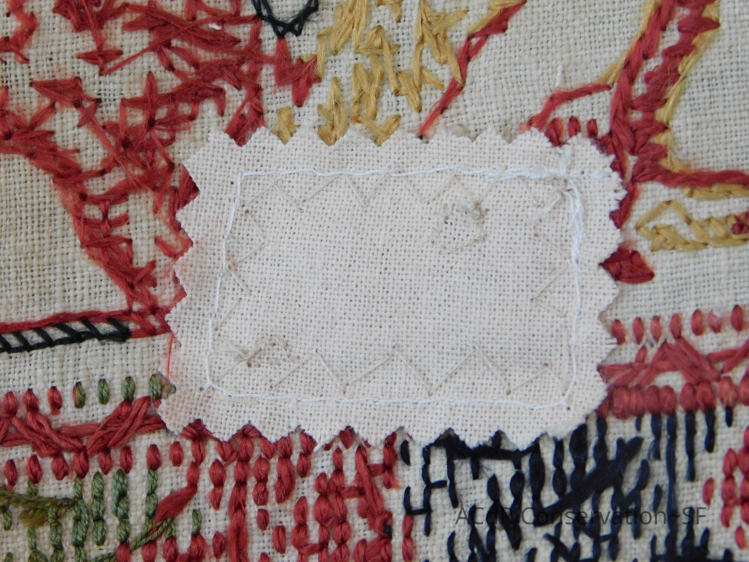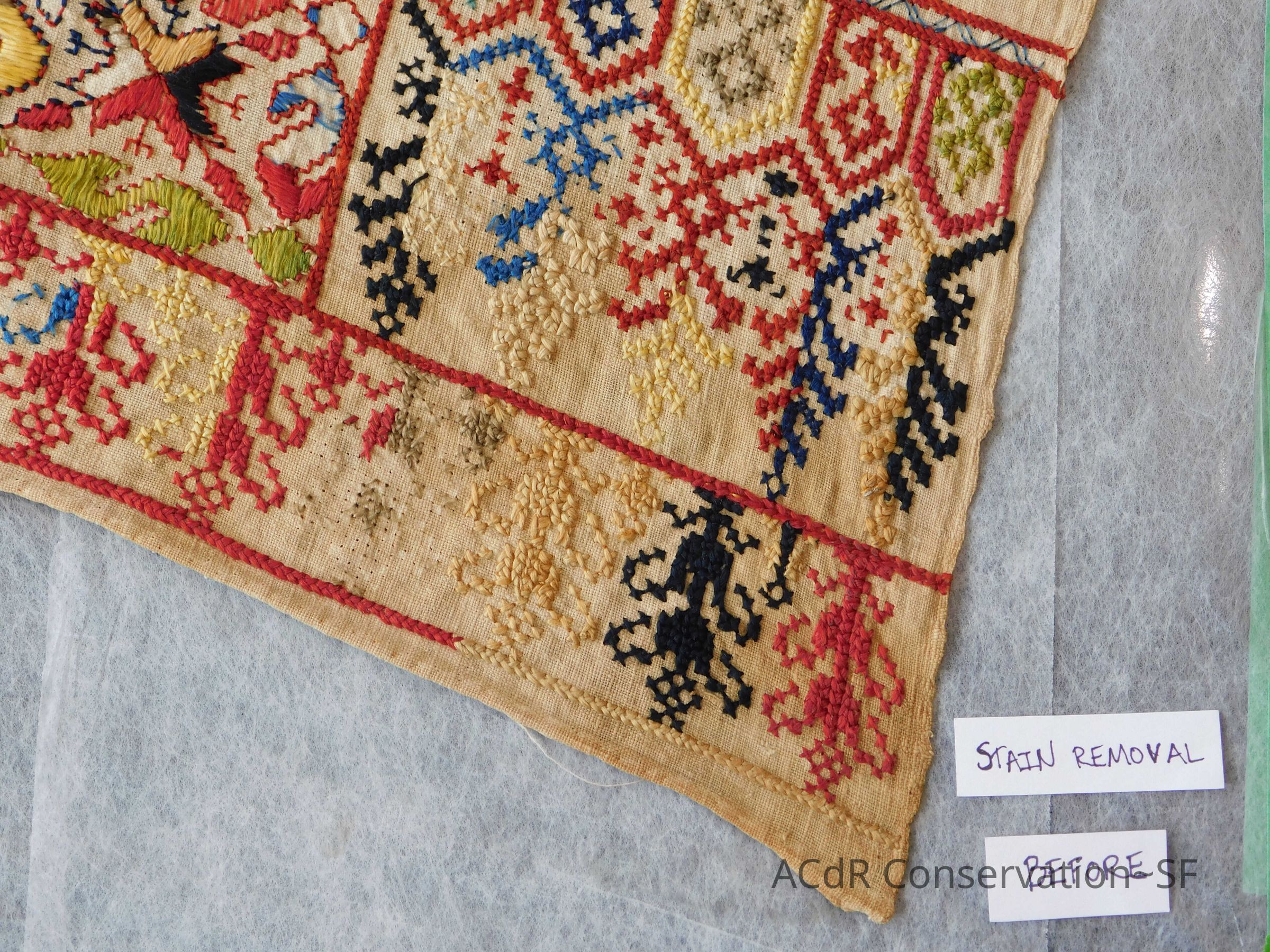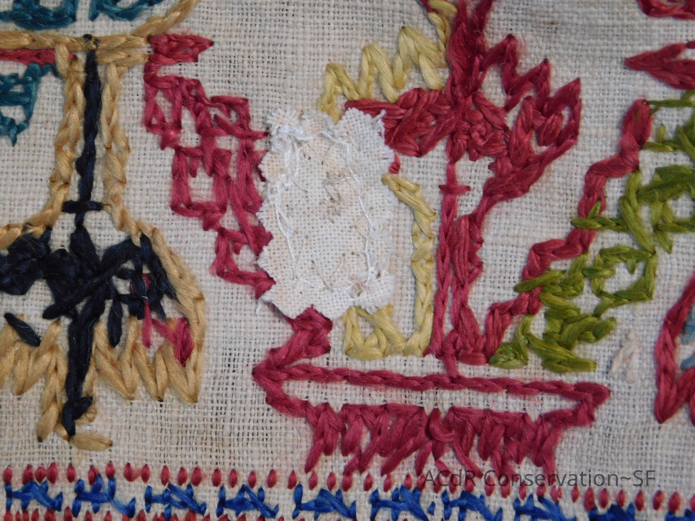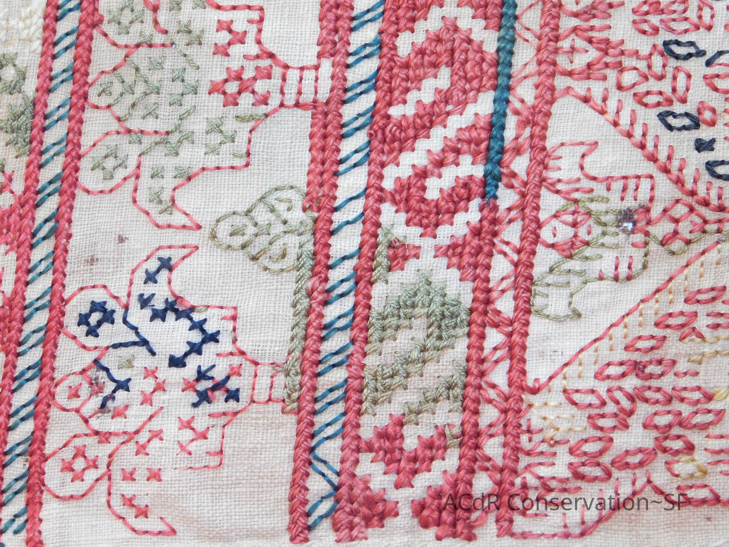 Staining throughout, some darker like splatters that have formed holes. Some stitching has broken and disintegrated due to either sun damage or abrasion. Colors faded. Wax and other encrustations attached to threads.