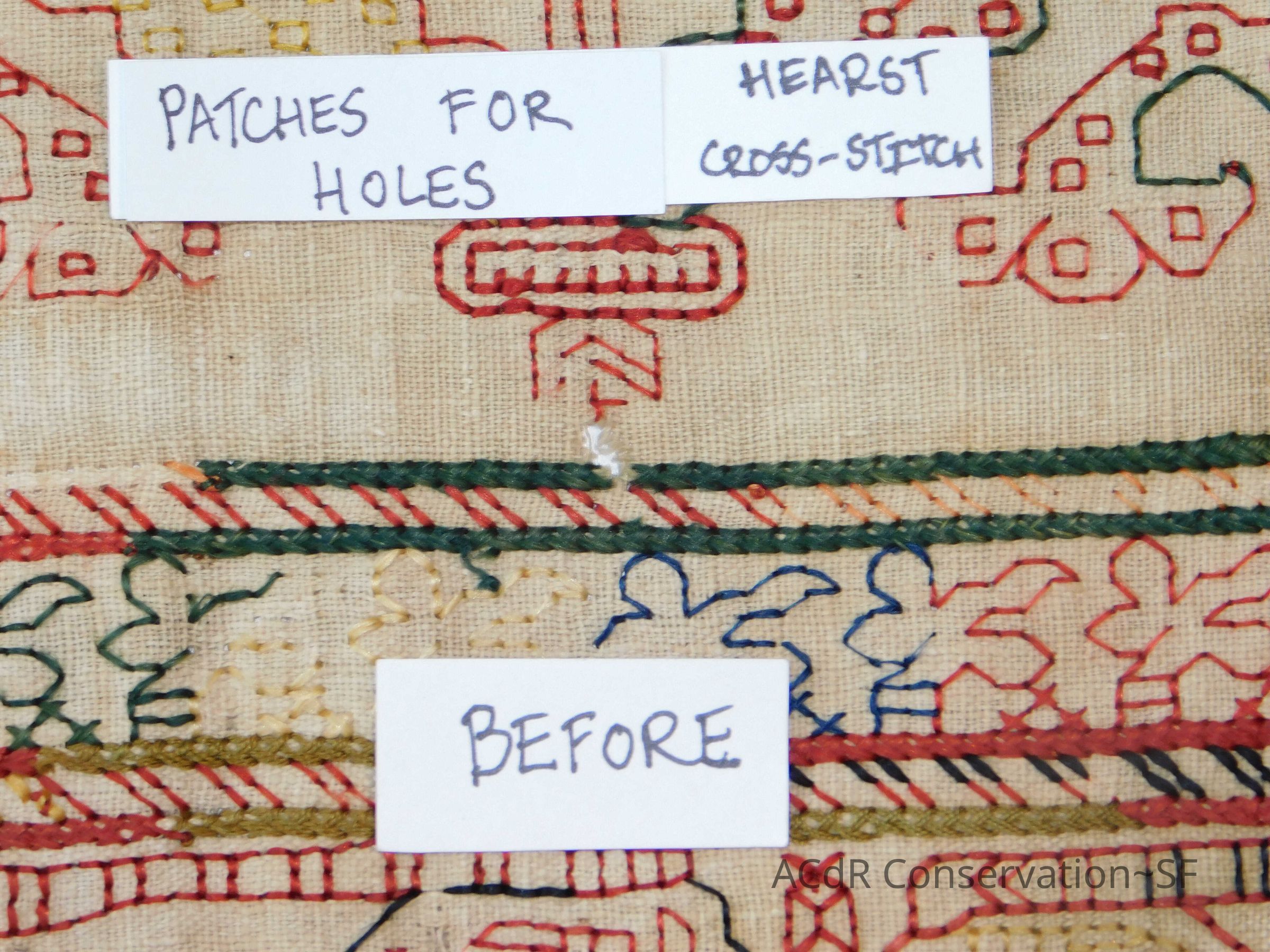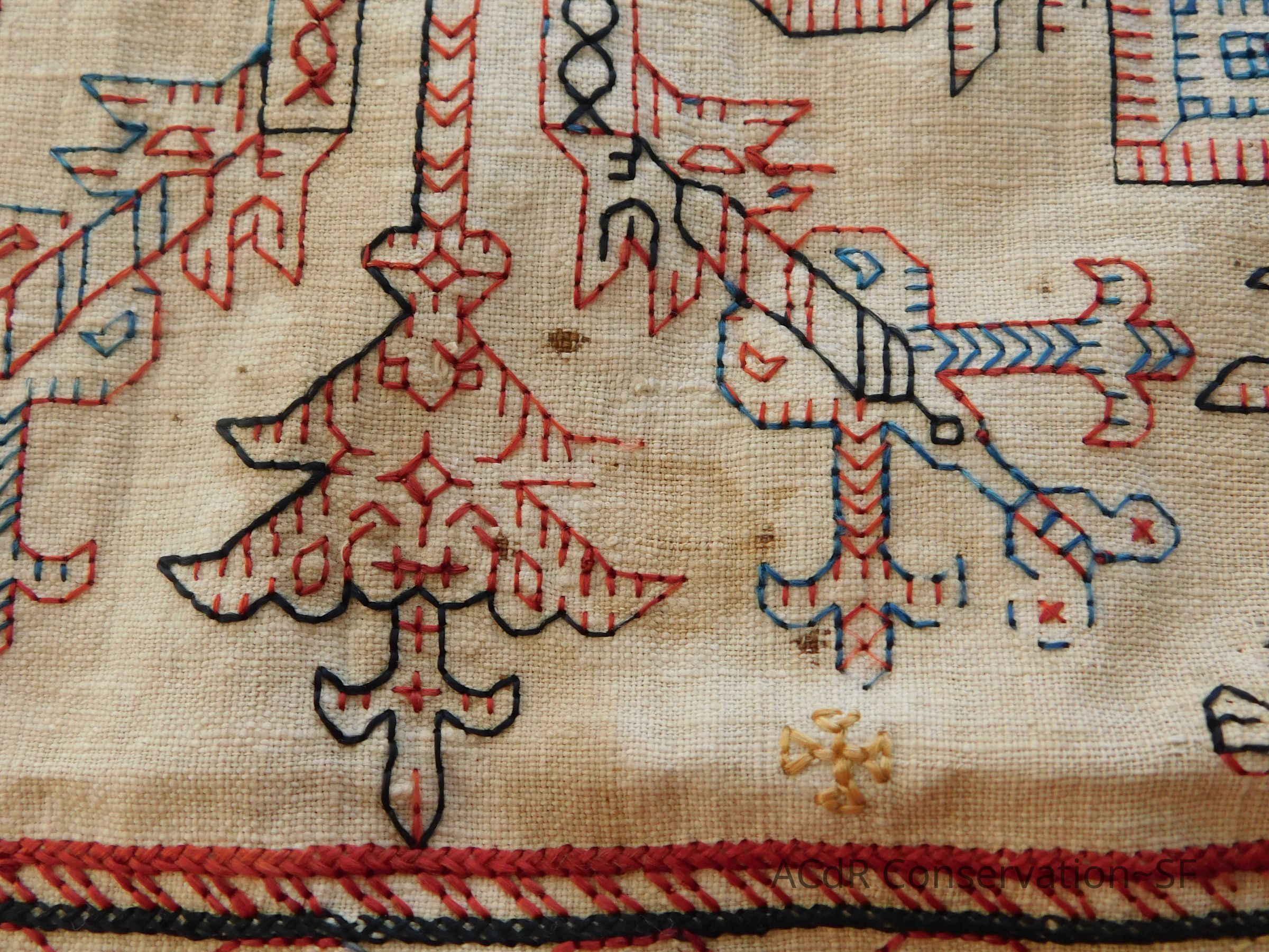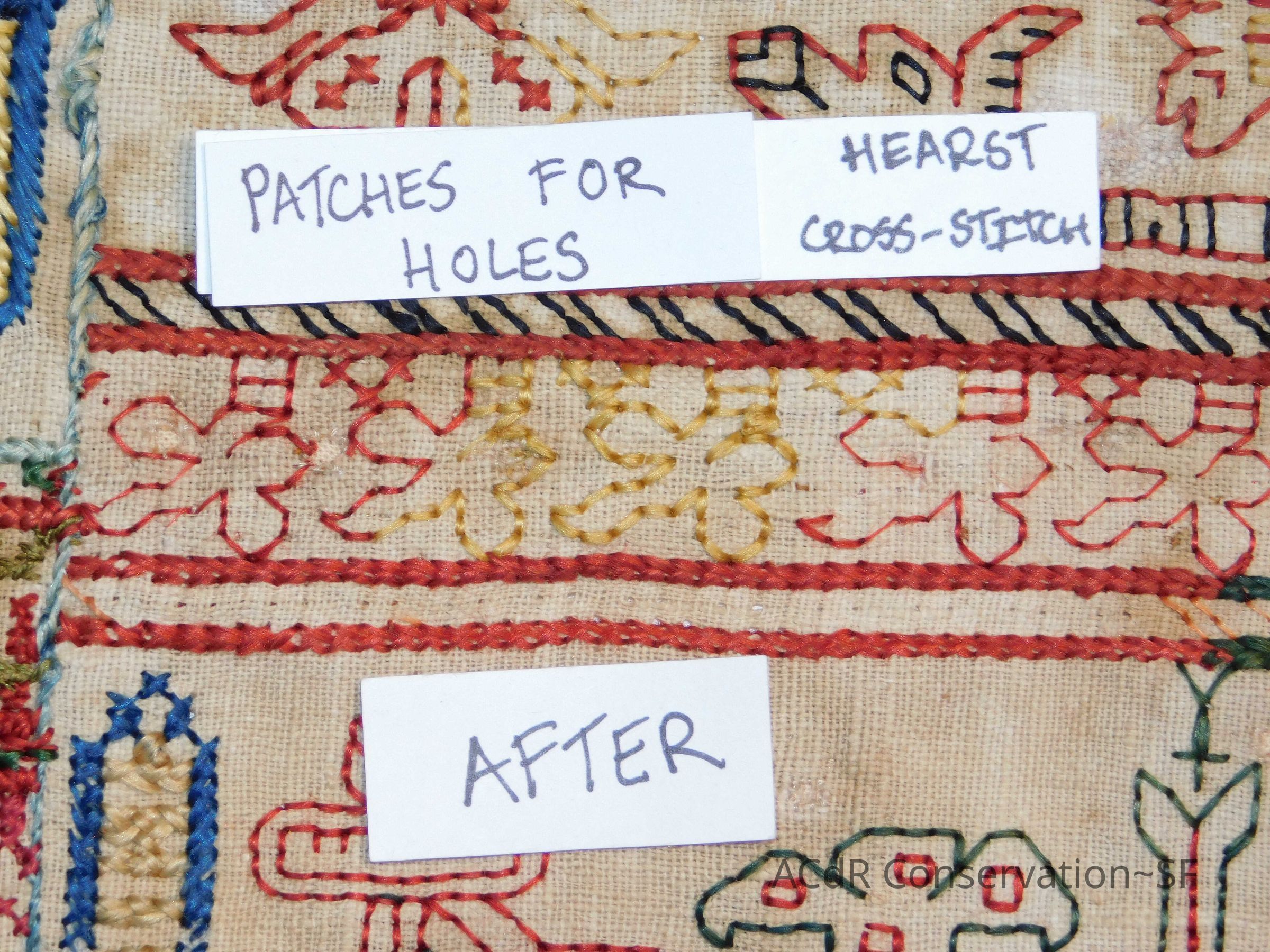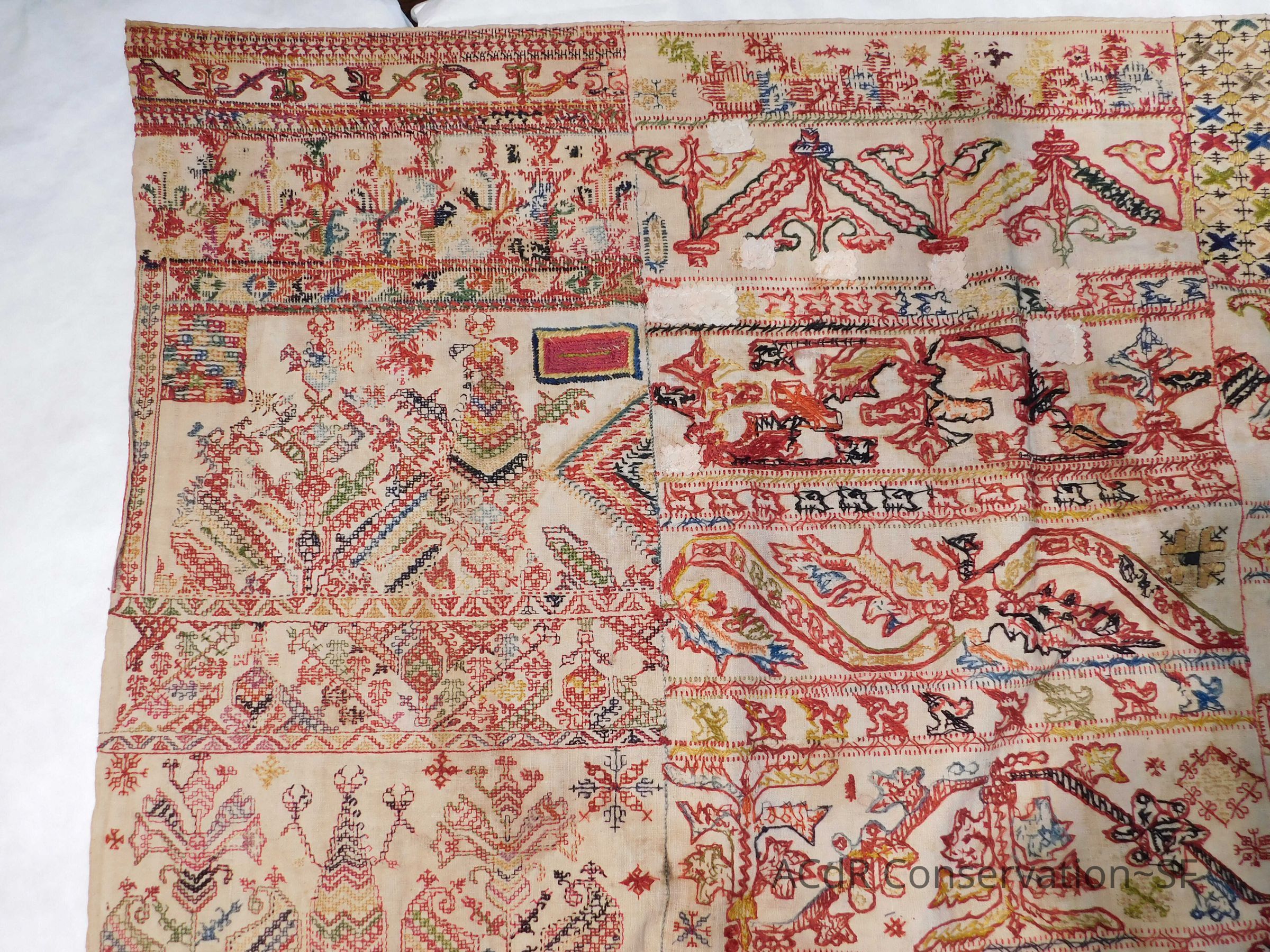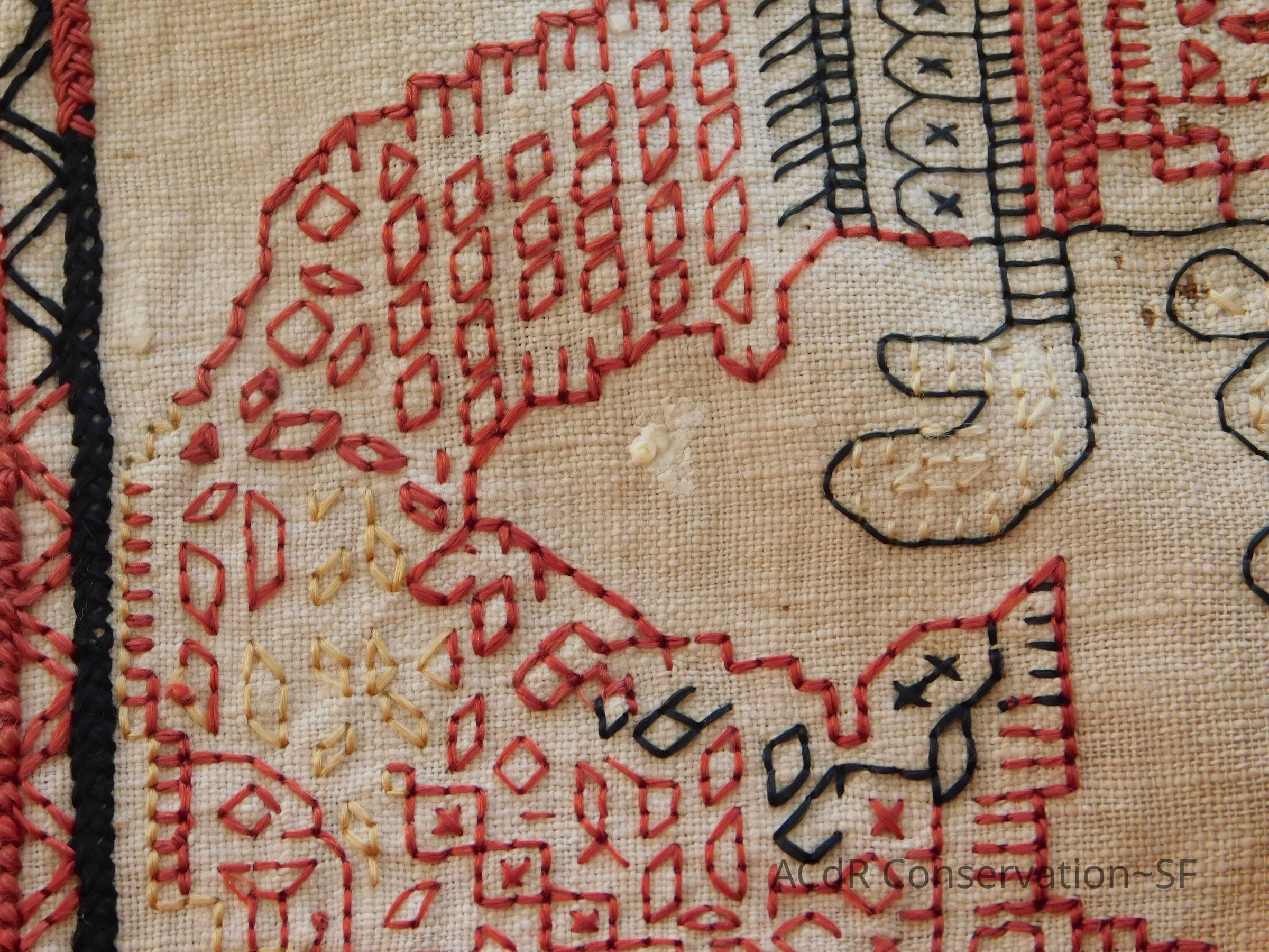 Staining throughout, some darker like splatters that have formed holes. Some stitching has broken and disintegrated due to either sun damage or abrasion. Colors faded. Wax and other encrustations attached to threads.
