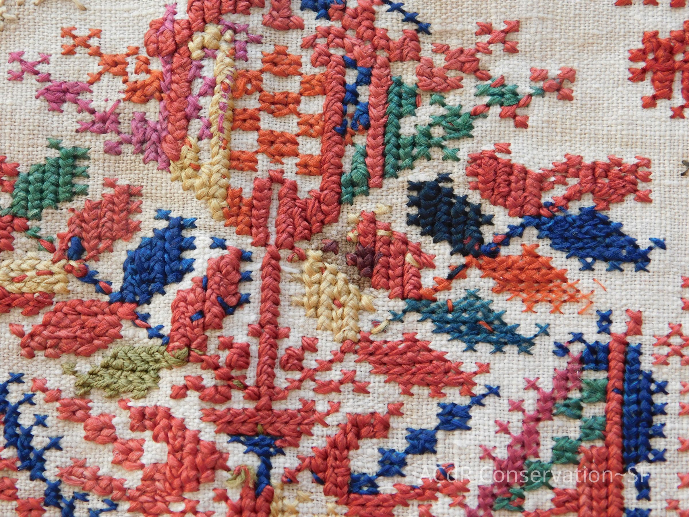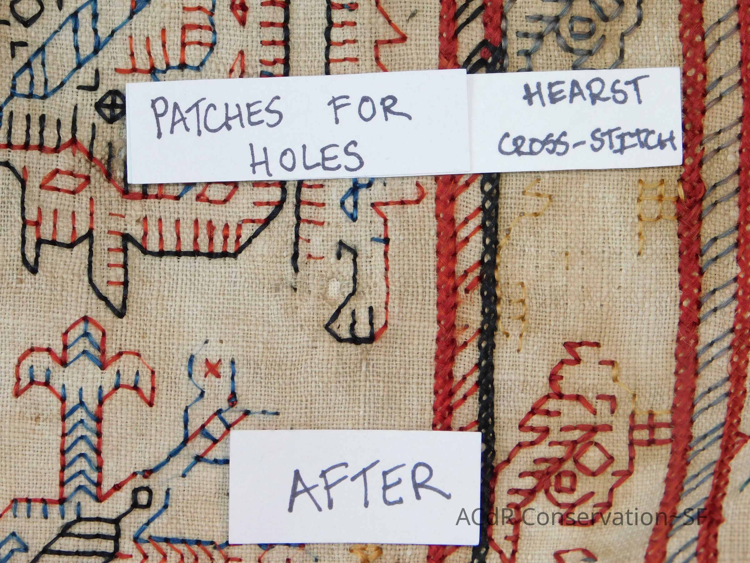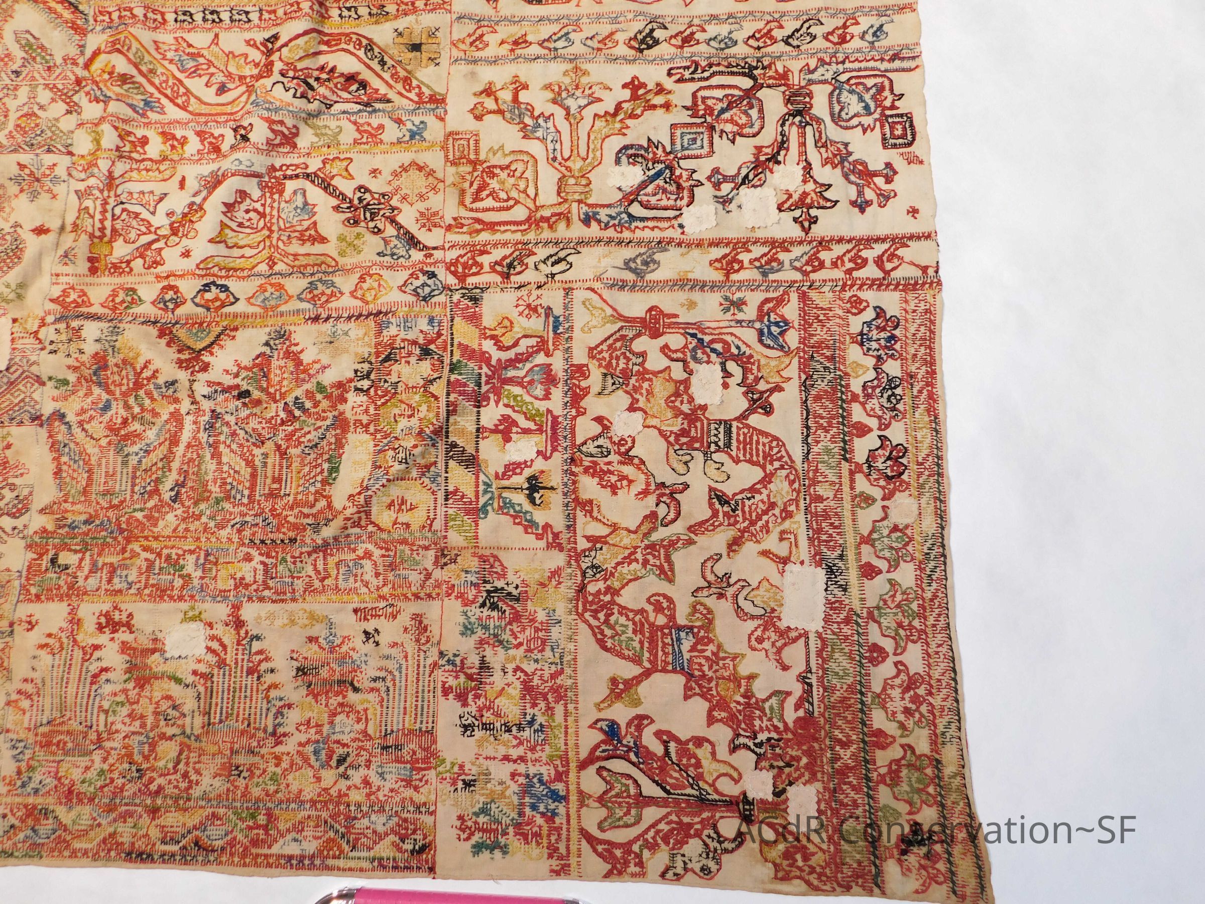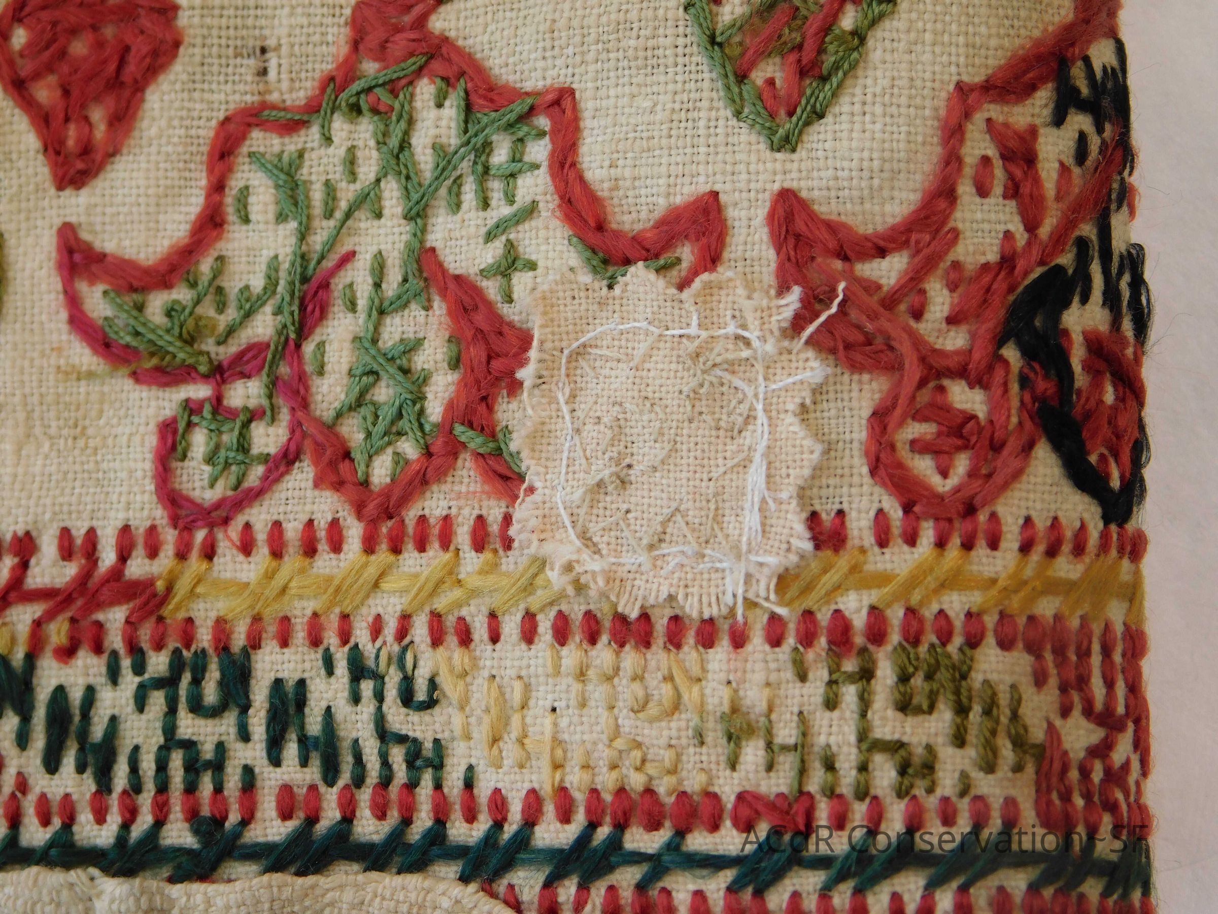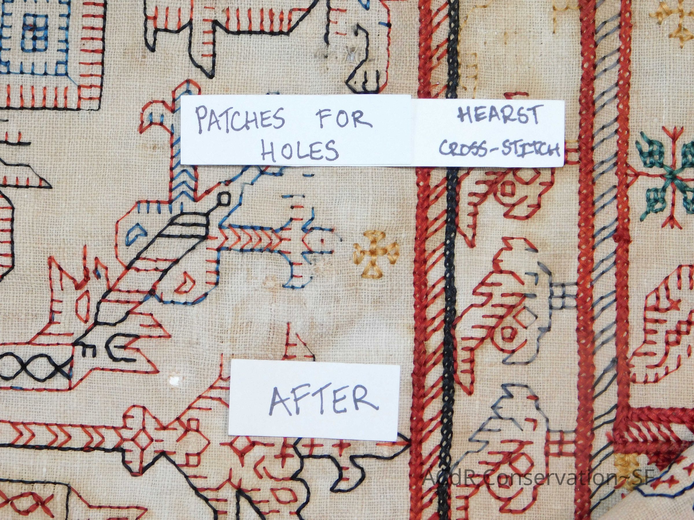 Staining throughout, some darker like splatters that have formed holes. Some stitching has broken and disintegrated due to either sun damage or abrasion. Colors faded. Wax and other encrustations attached to threads.