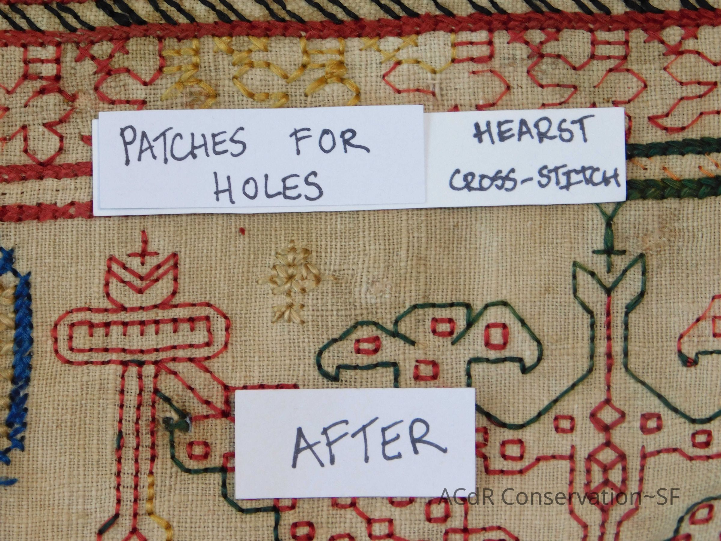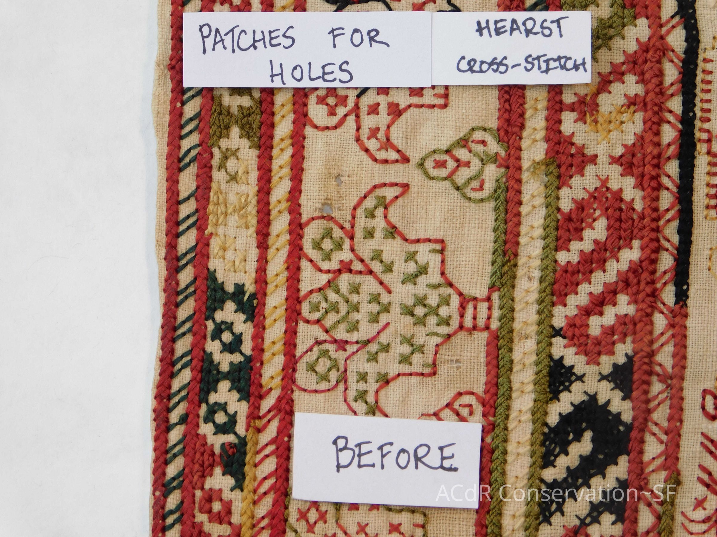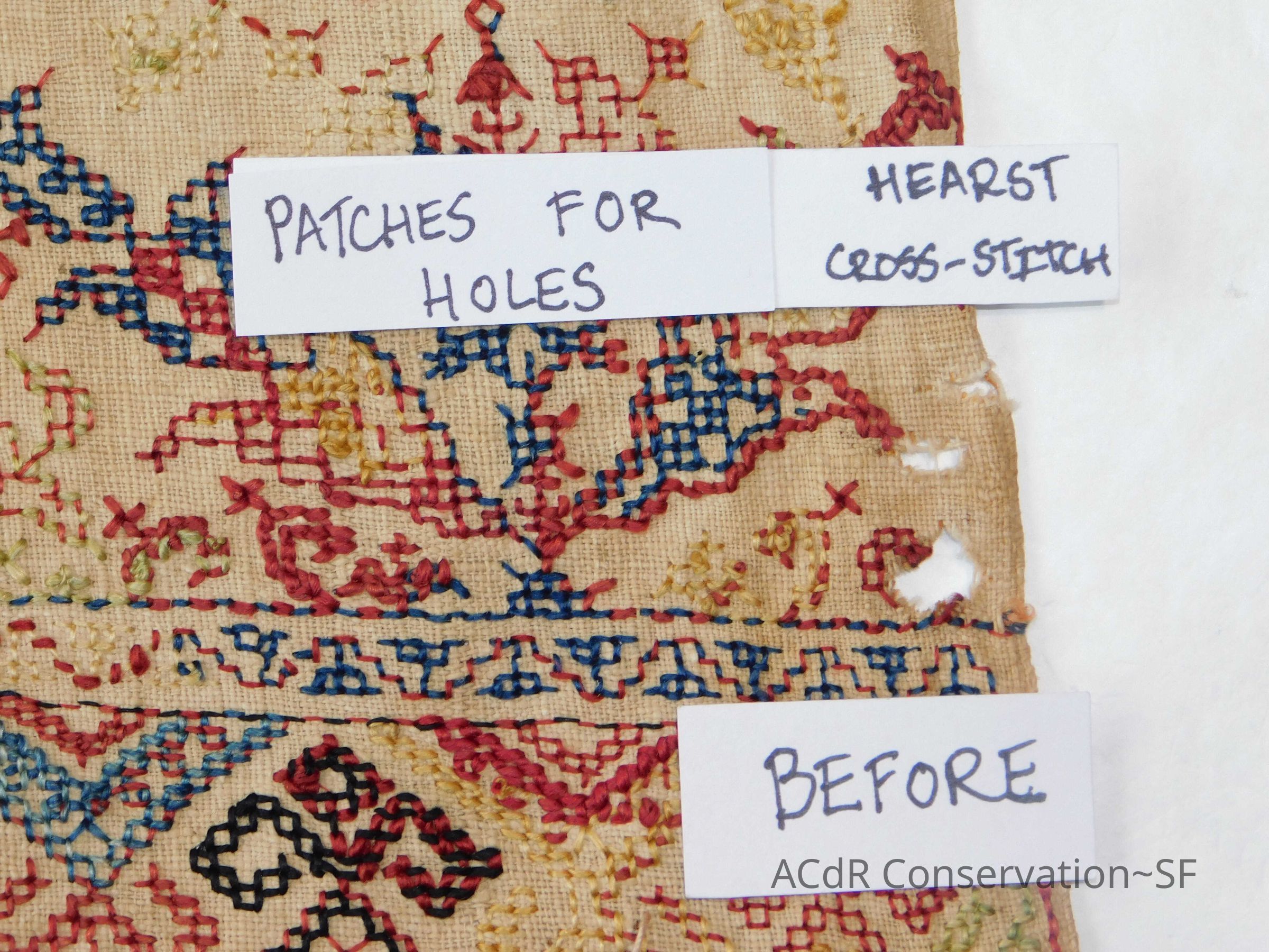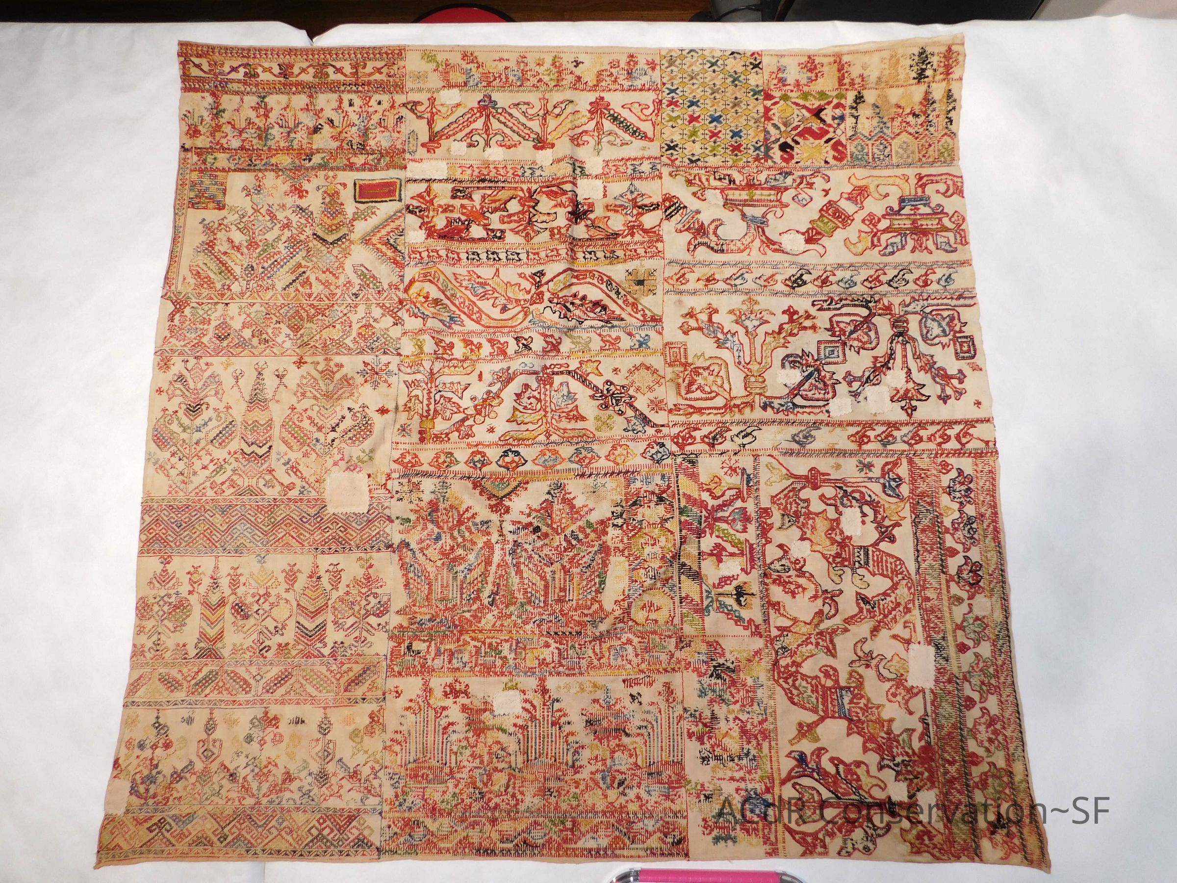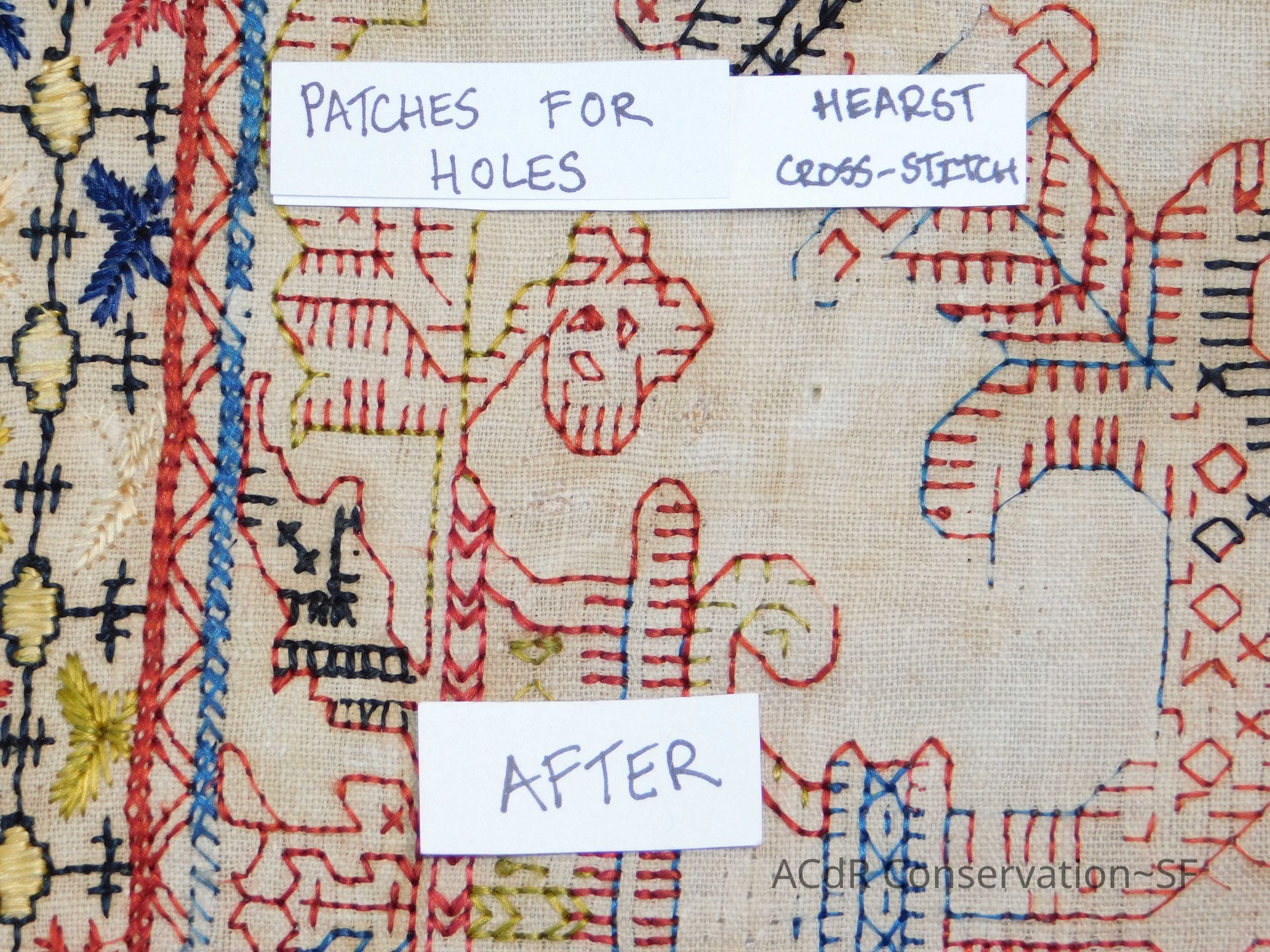 Staining throughout, some darker like splatters that have formed holes. Some stitching has broken and disintegrated due to either sun damage or abrasion. Colors faded. Wax and other encrustations attached to threads.