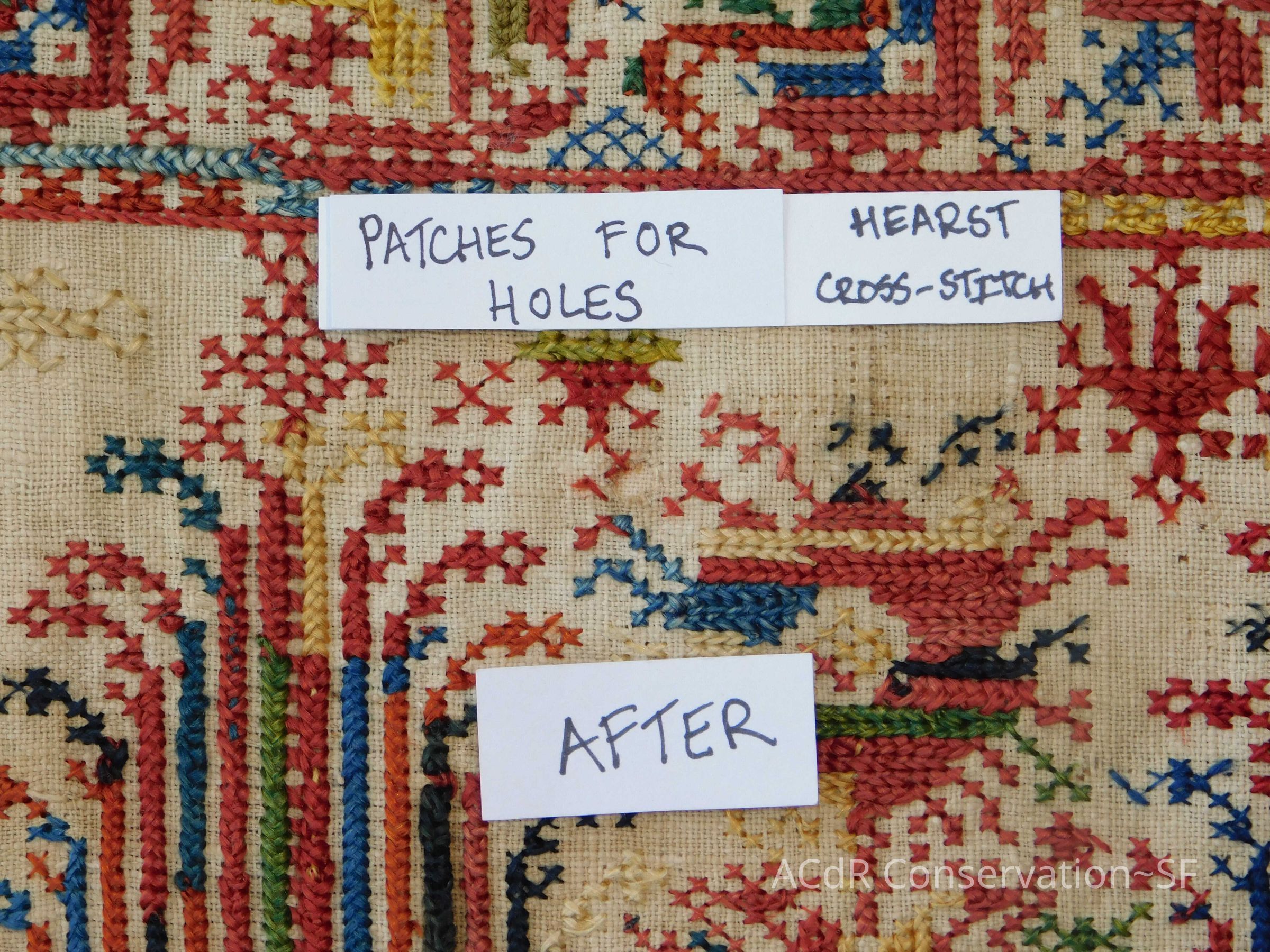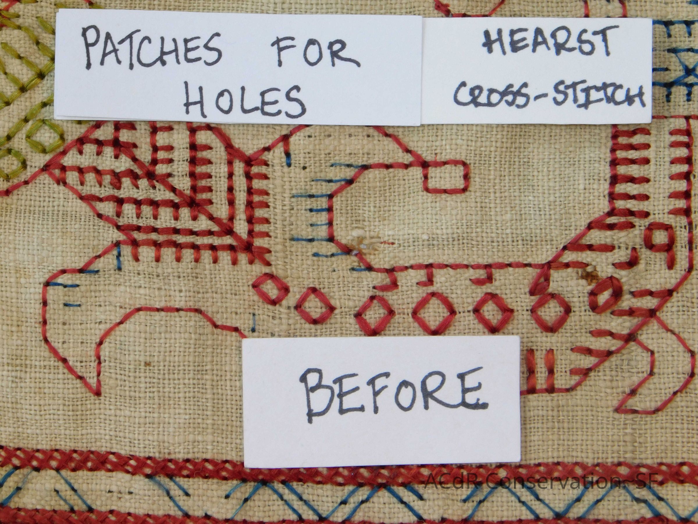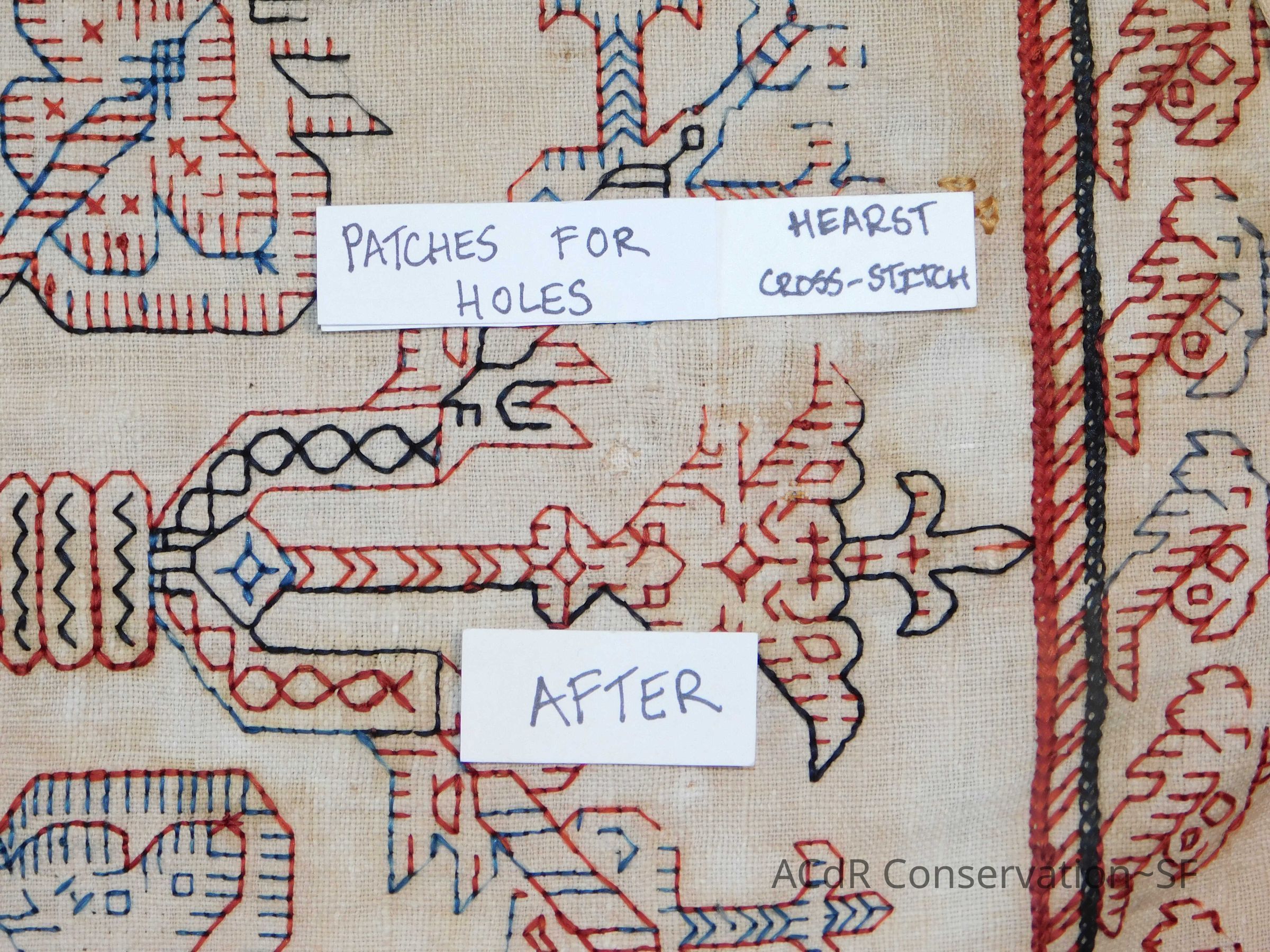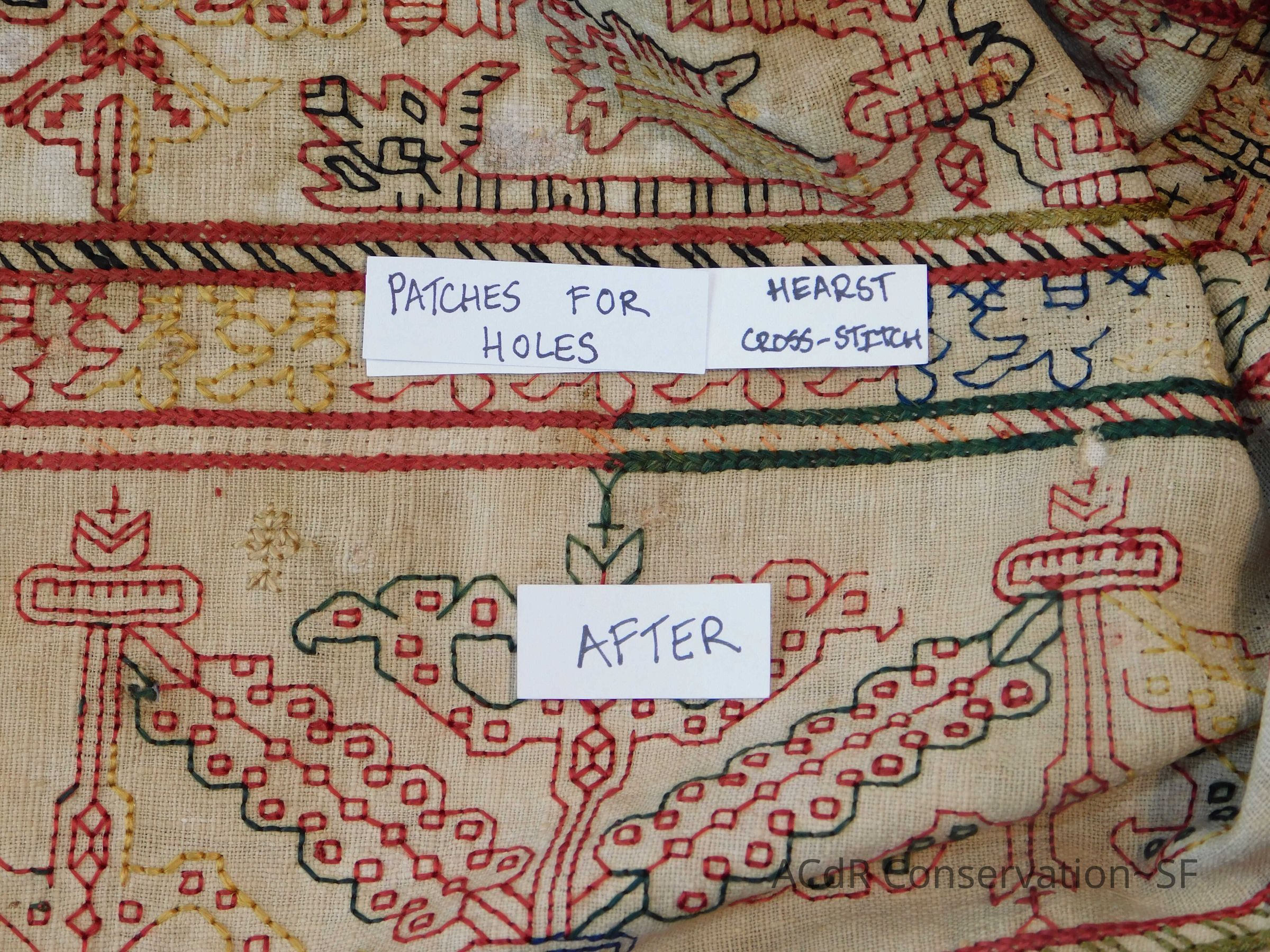 Staining throughout, some darker like splatters that have formed holes. Some stitching has broken and disintegrated due to either sun damage or abrasion. Colors faded. Wax and other encrustations attached to threads.