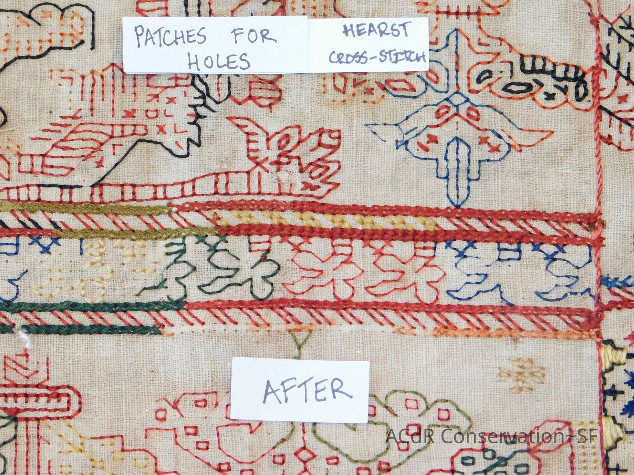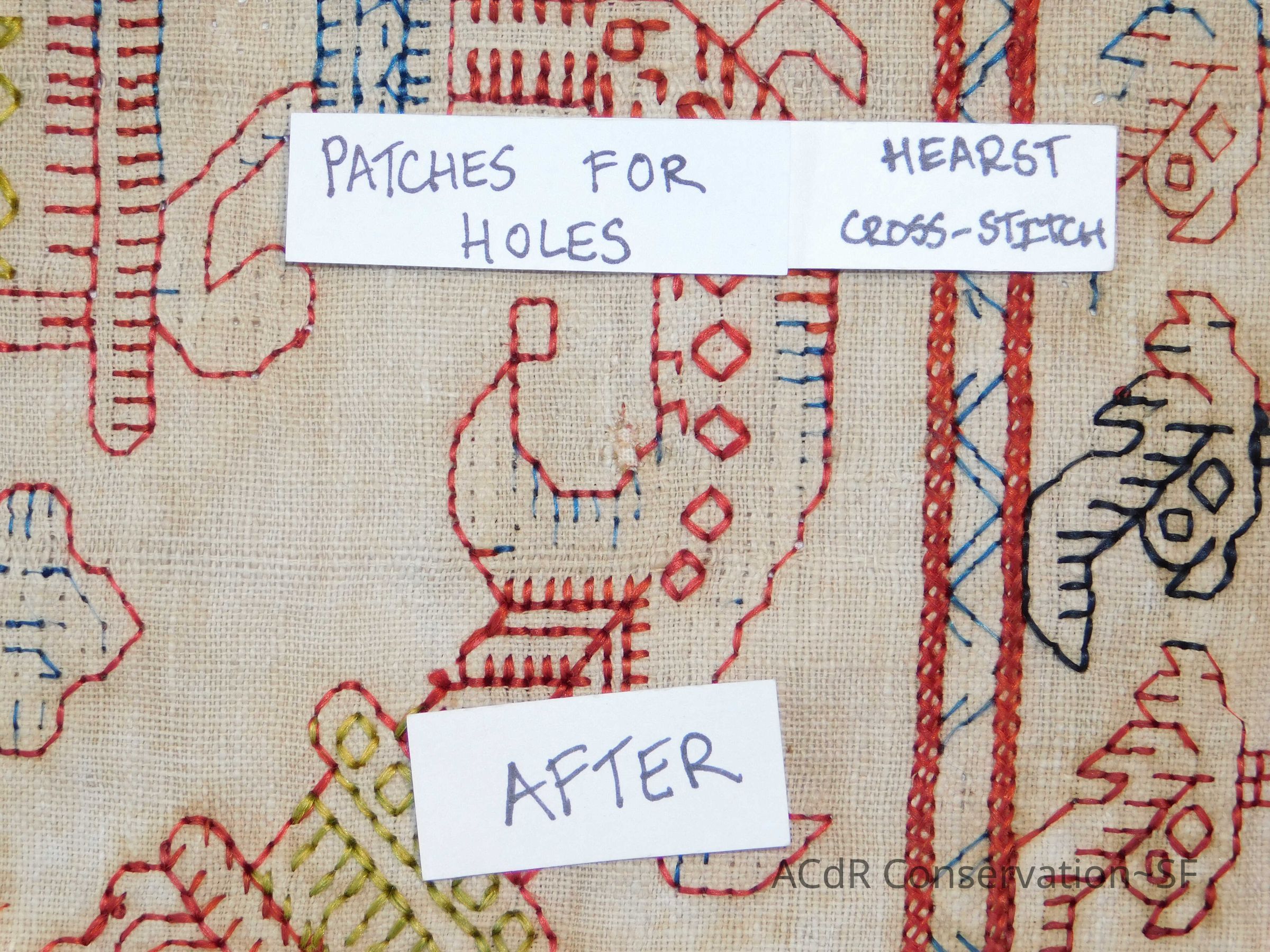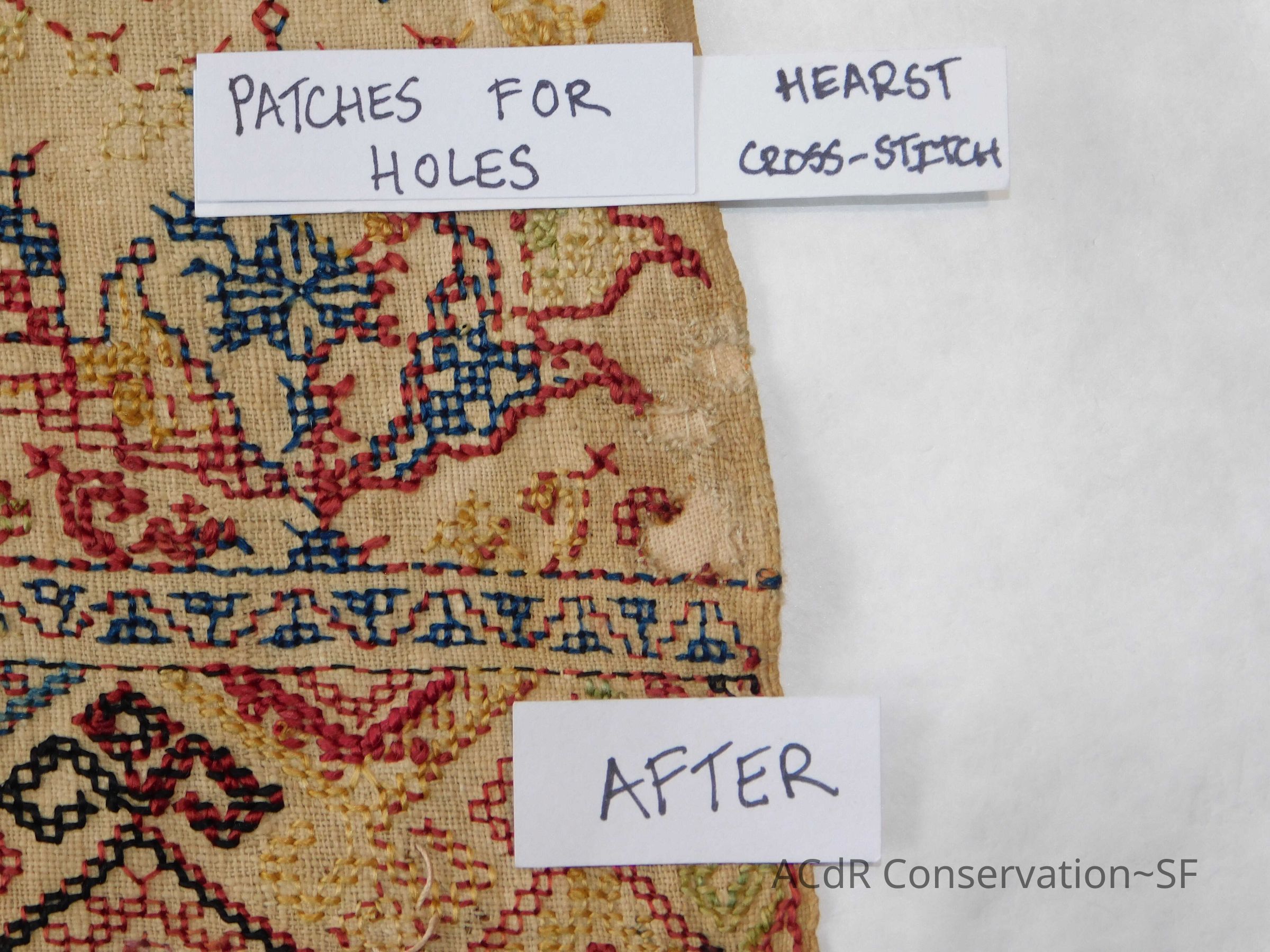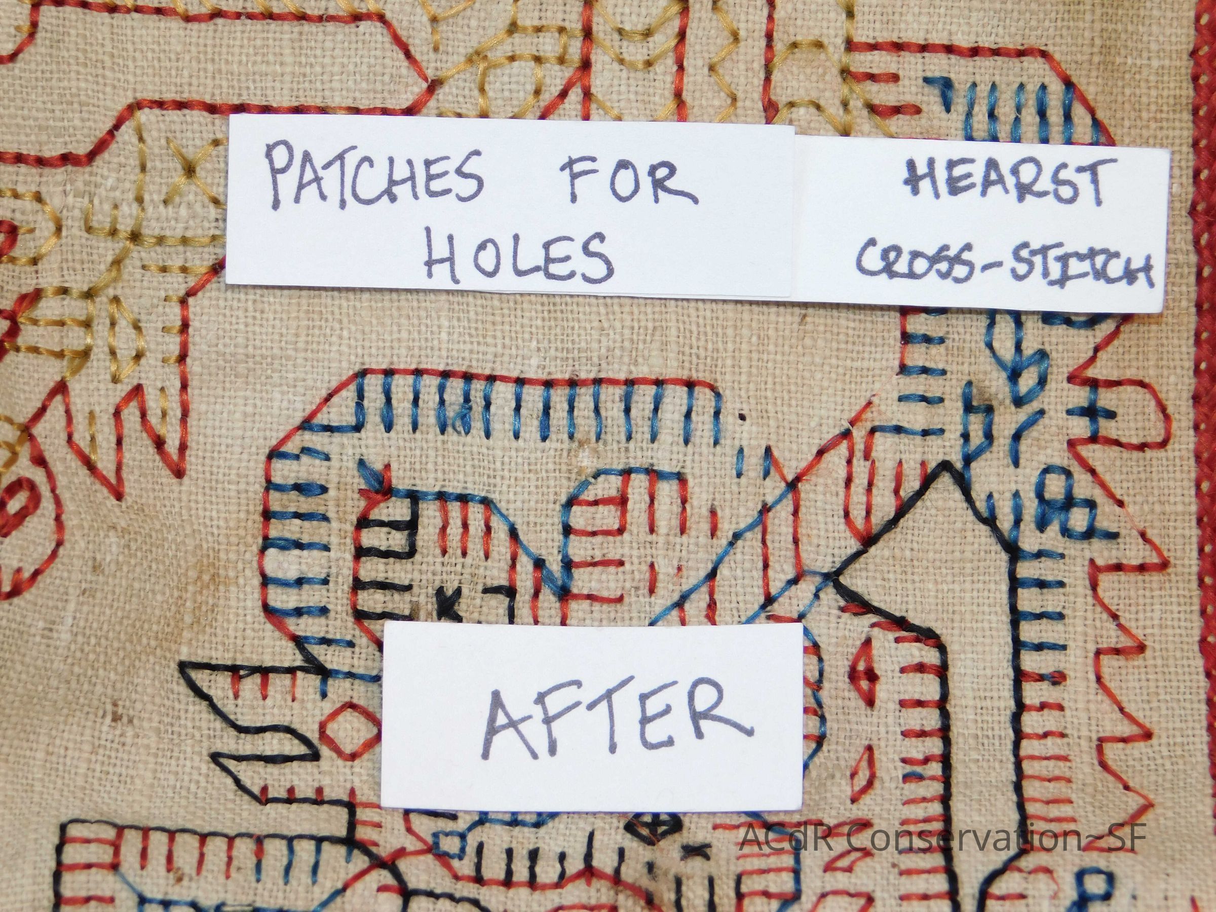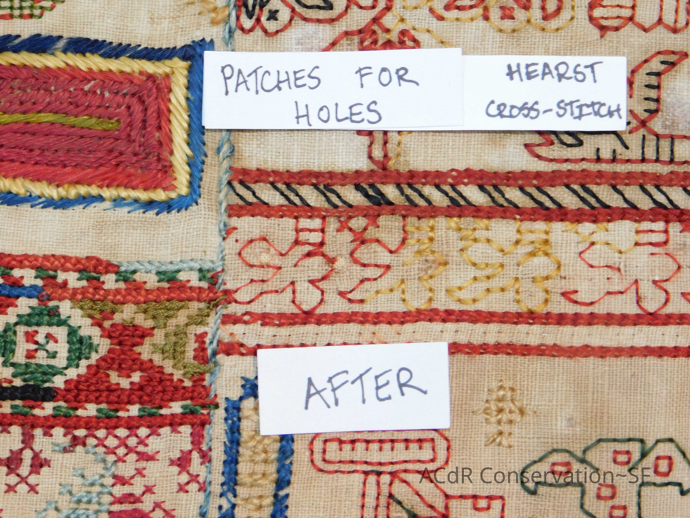 Staining throughout, some darker like splatters that have formed holes. Some stitching has broken and disintegrated due to either sun damage or abrasion. Colors faded. Wax and other encrustations attached to threads.