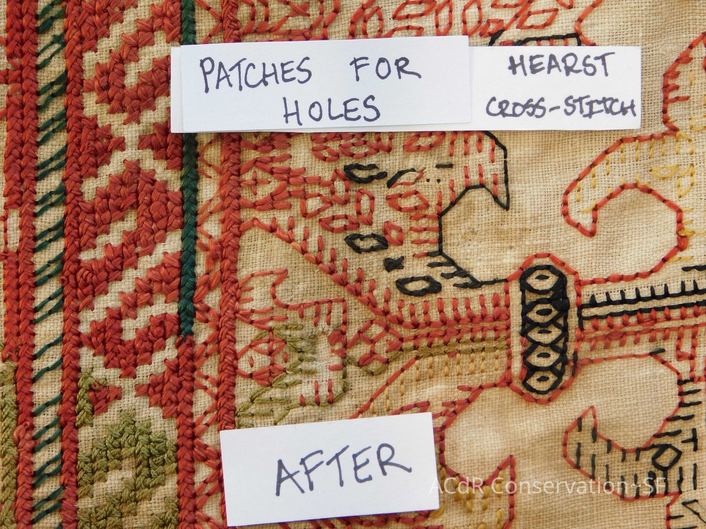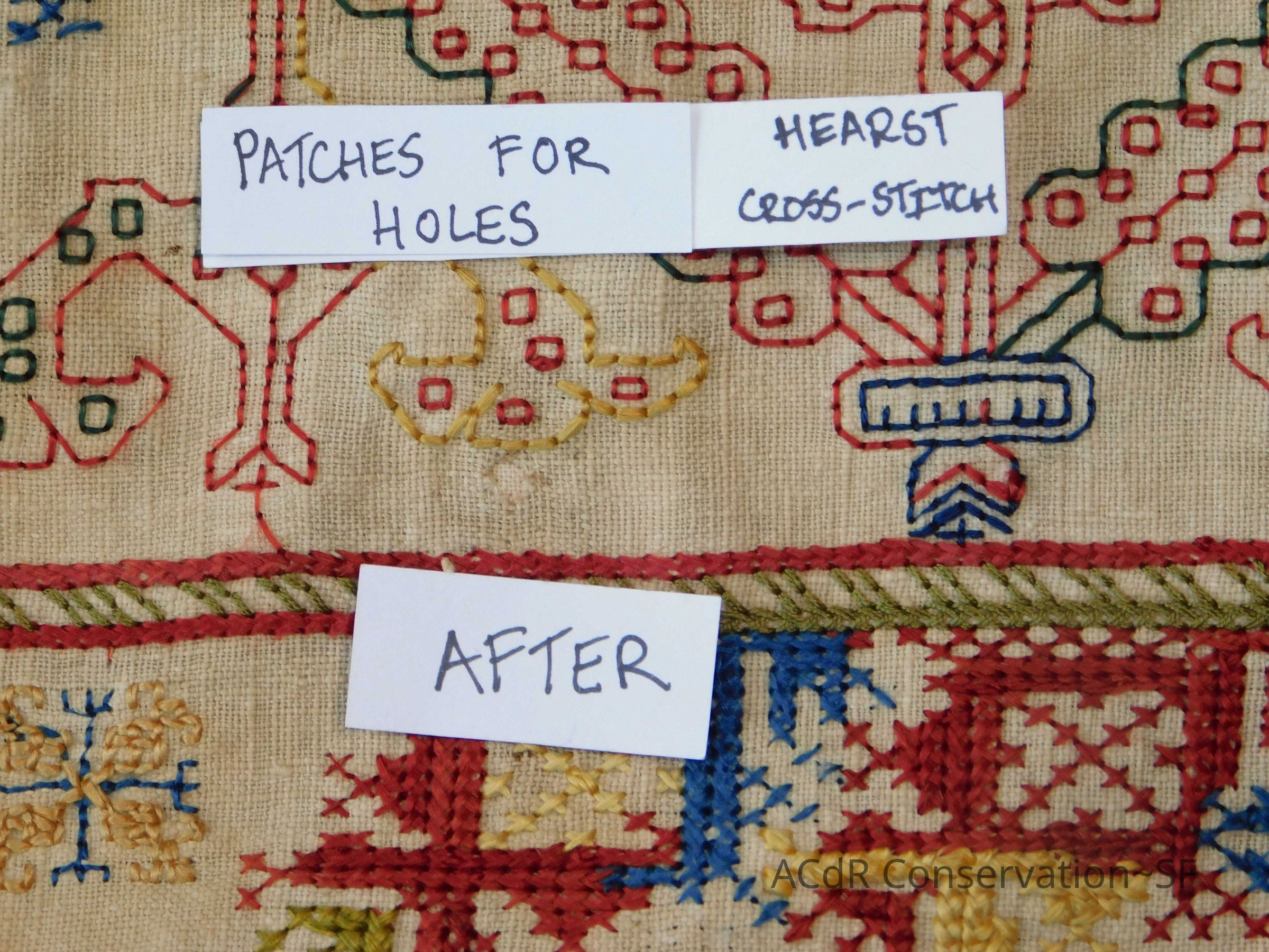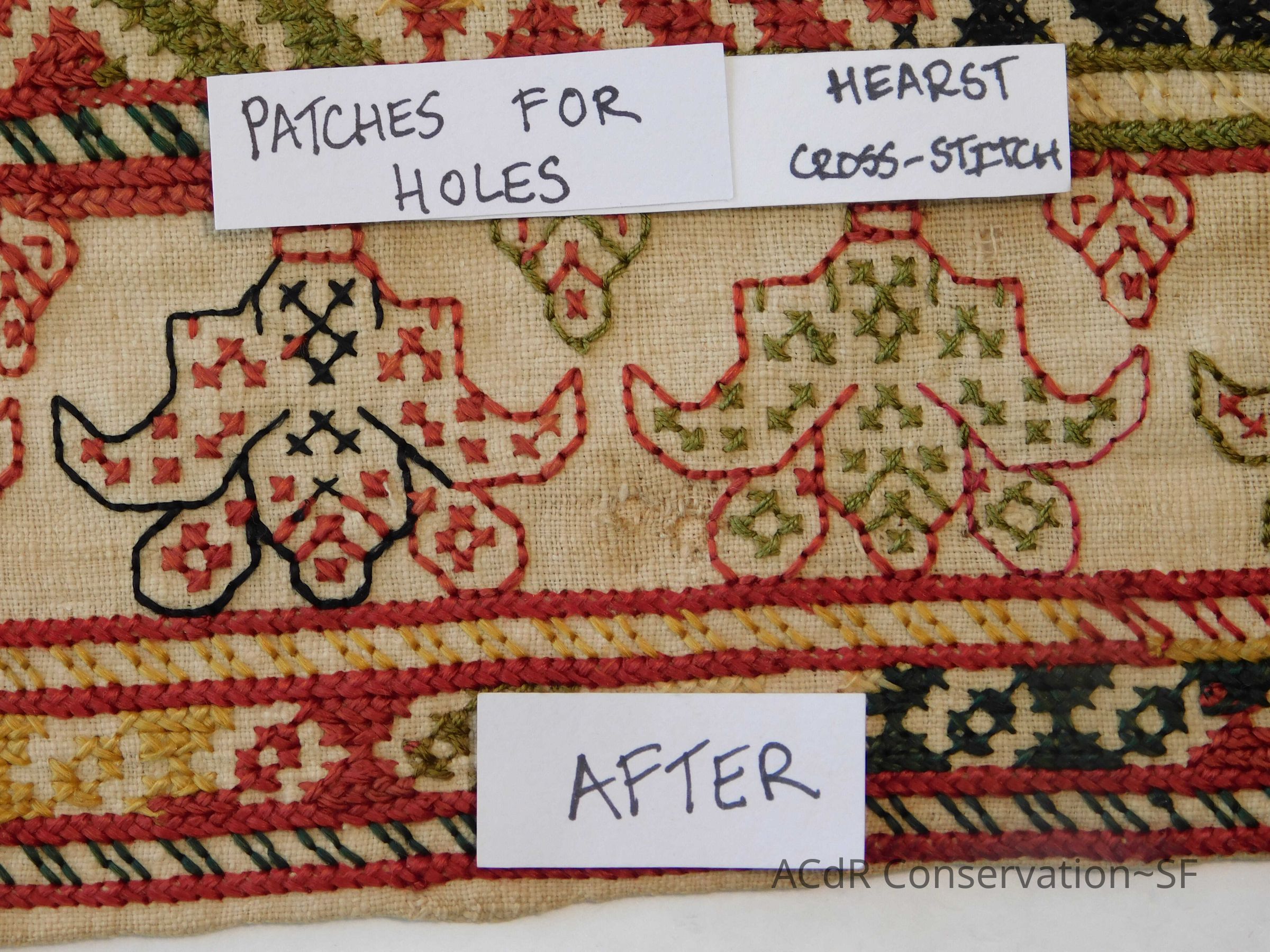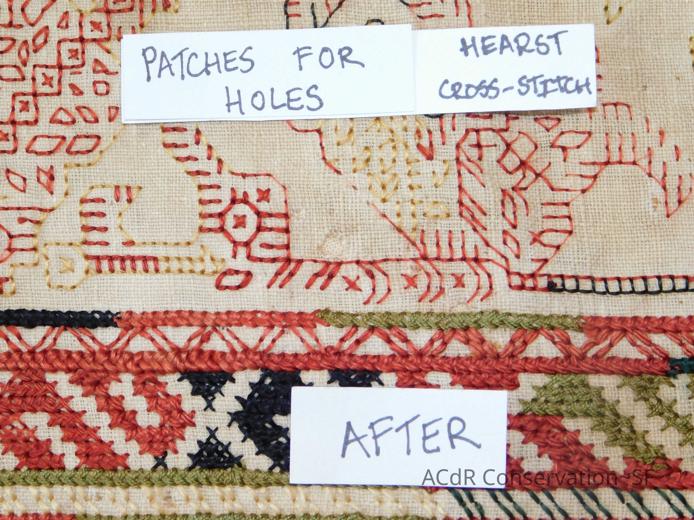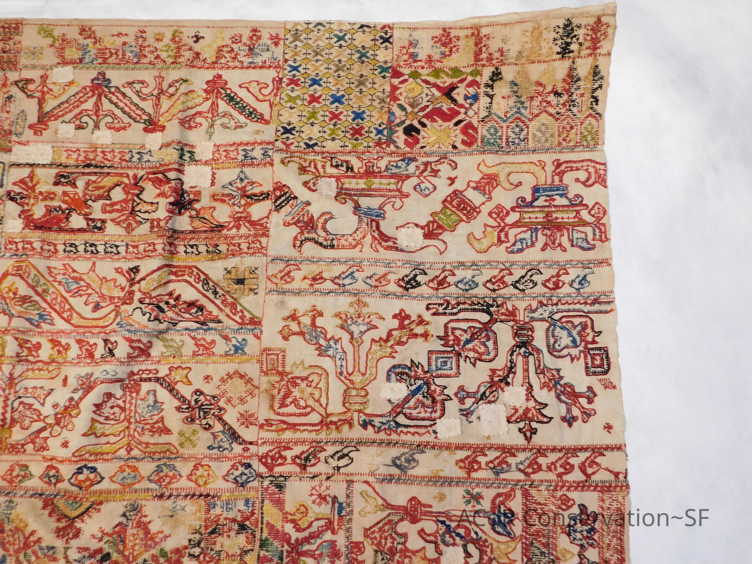 Staining throughout, some darker like splatters that have formed holes. Some stitching has broken and disintegrated due to either sun damage or abrasion. Colors faded. Wax and other encrustations attached to threads.