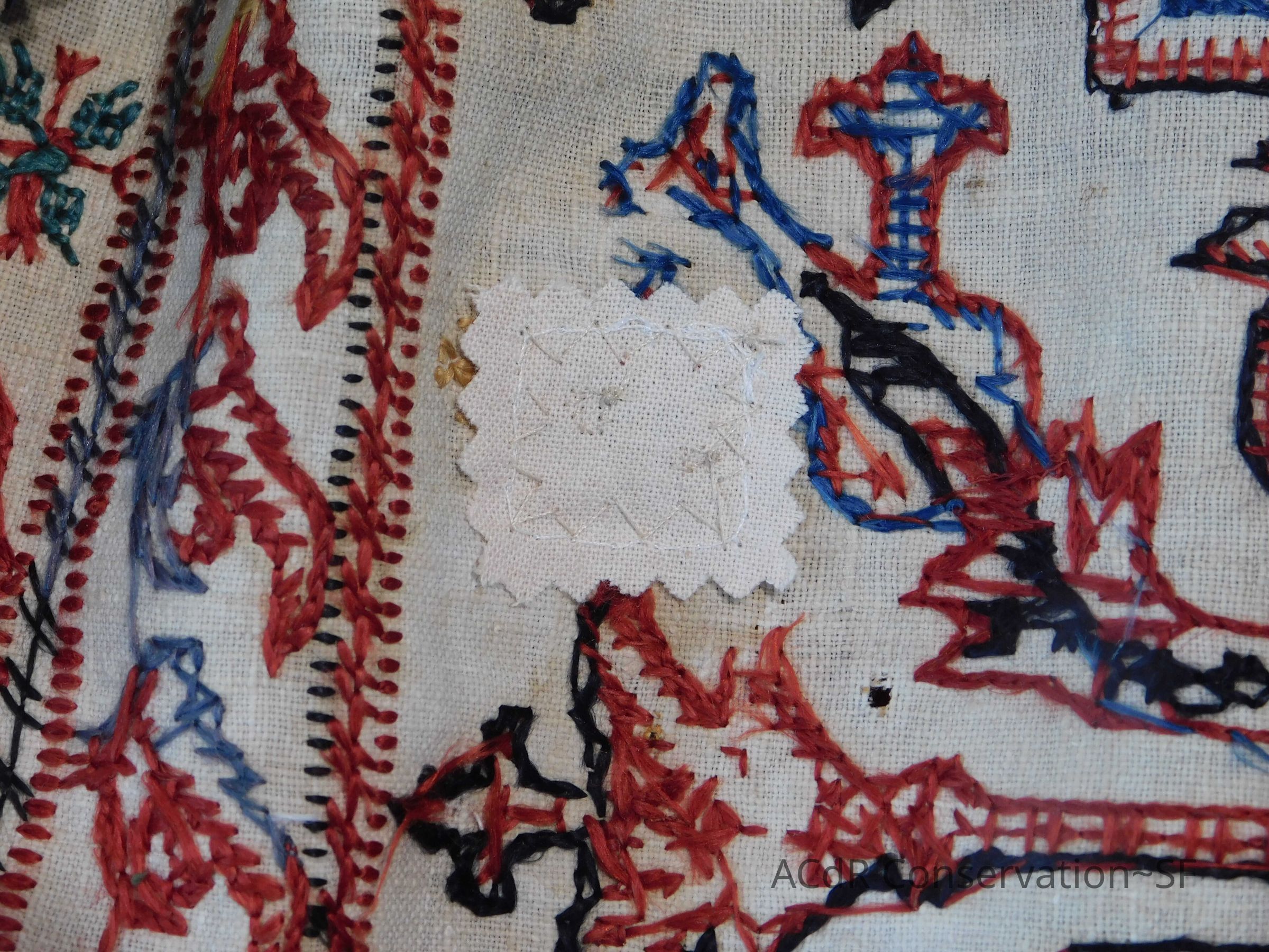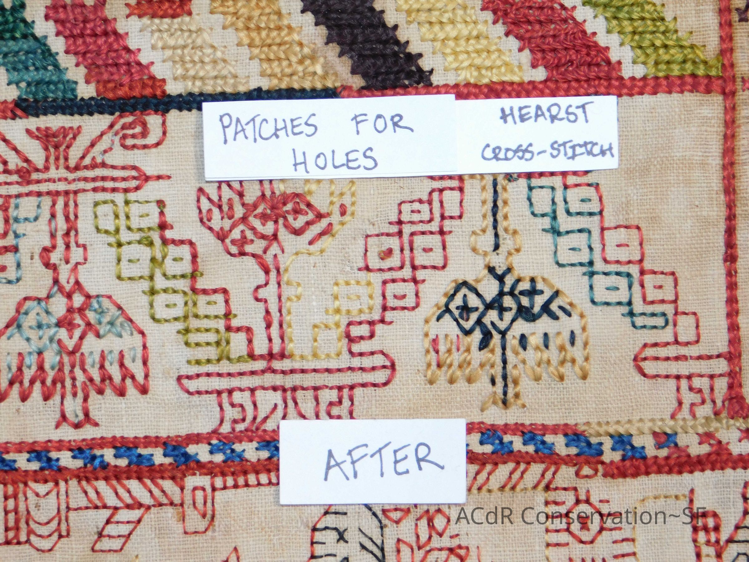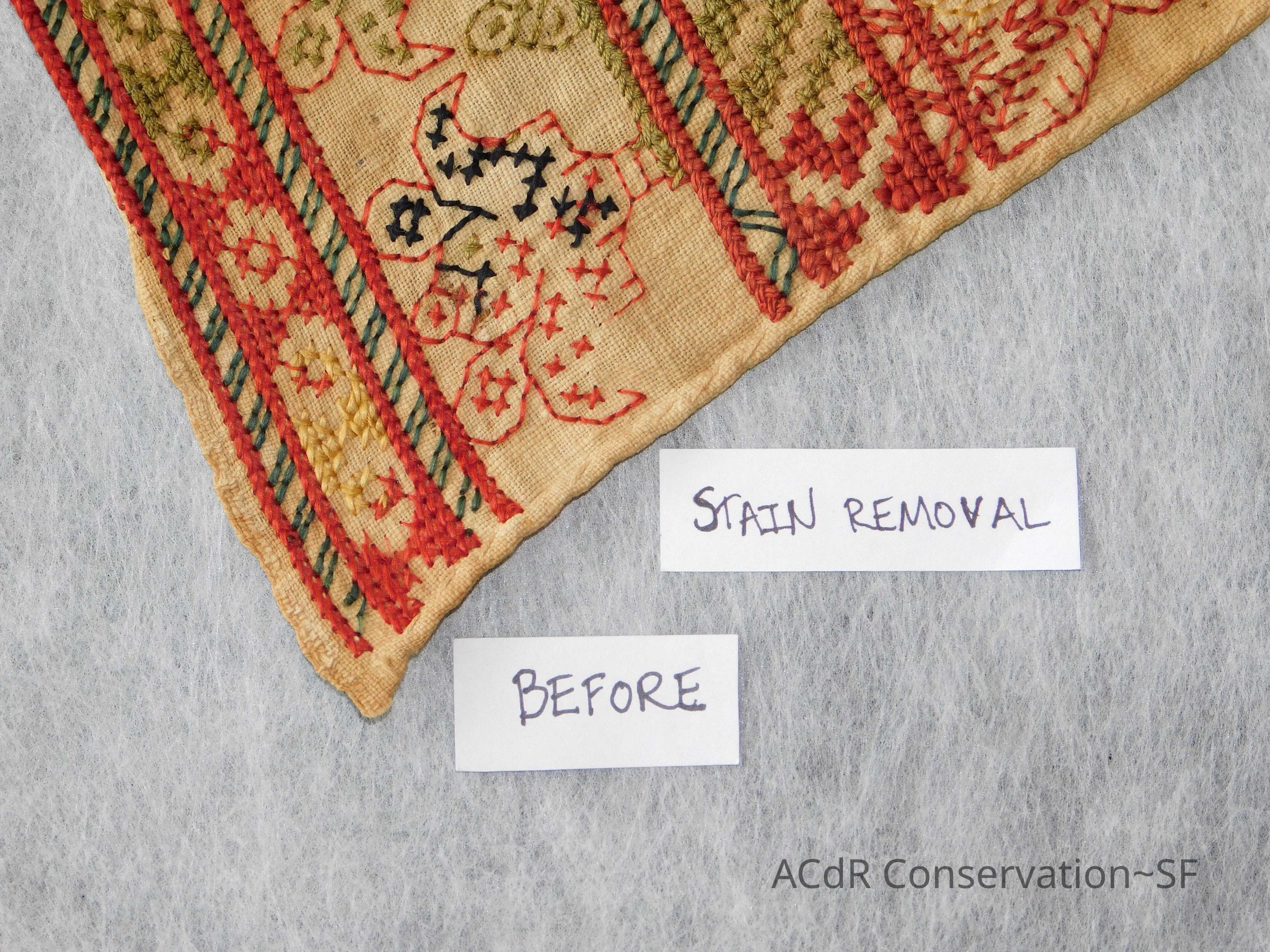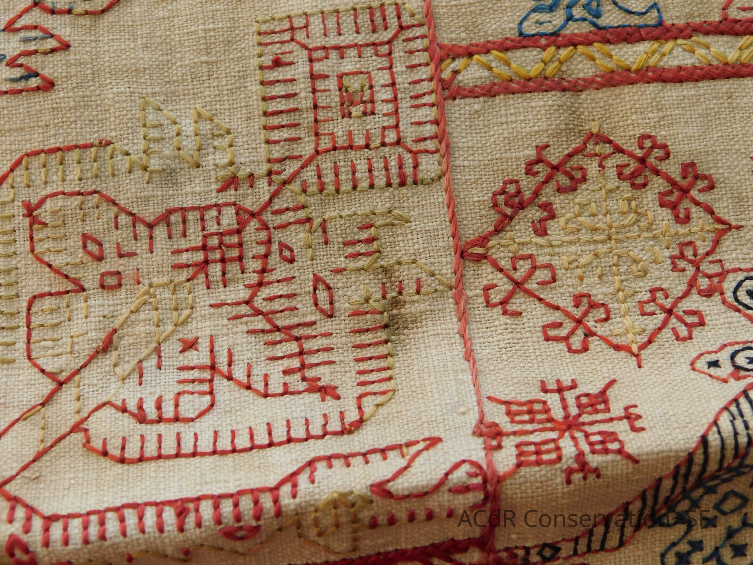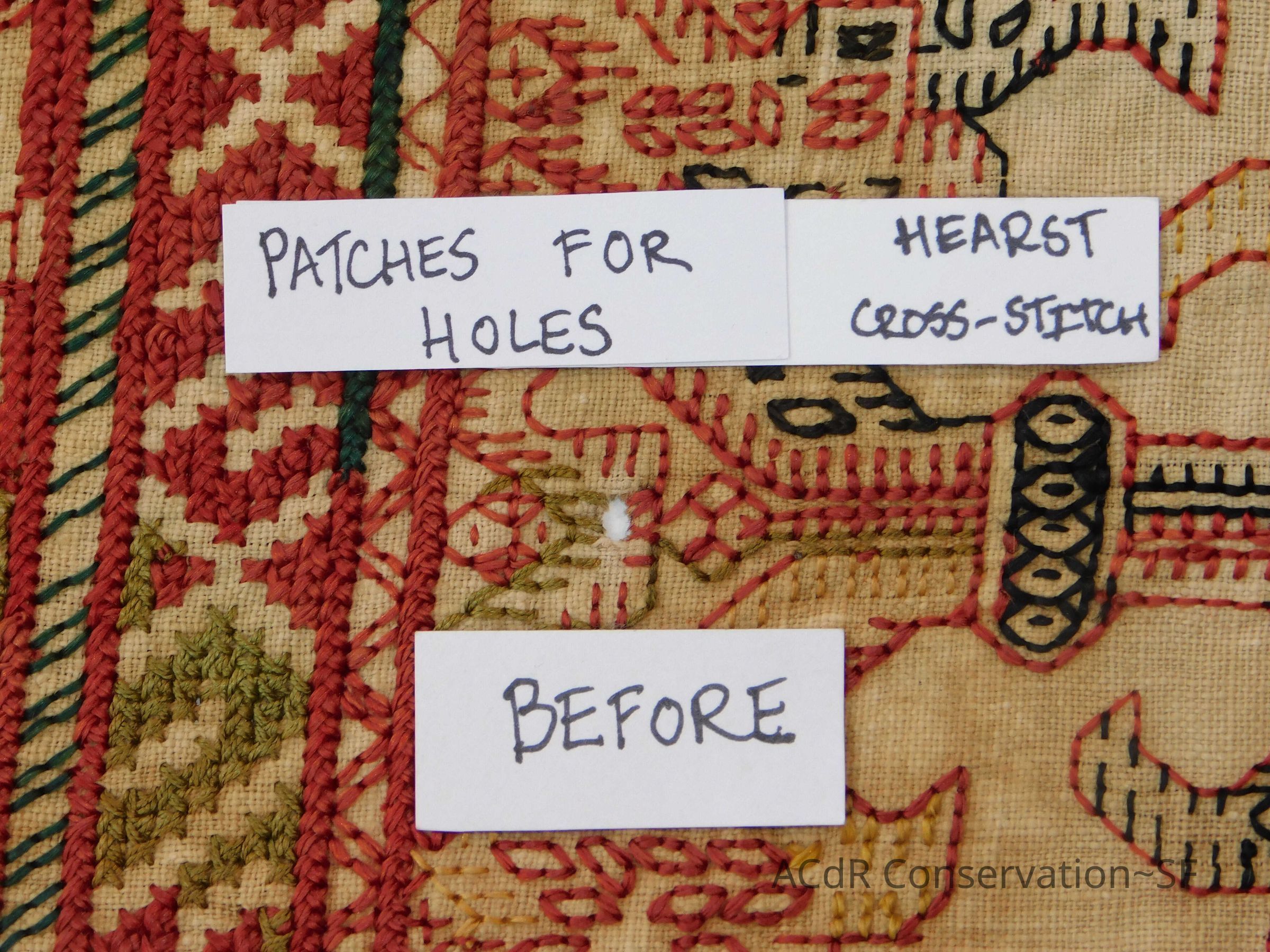 Staining throughout, some darker like splatters that have formed holes. Some stitching has broken and disintegrated due to either sun damage or abrasion. Colors faded. Wax and other encrustations attached to threads.