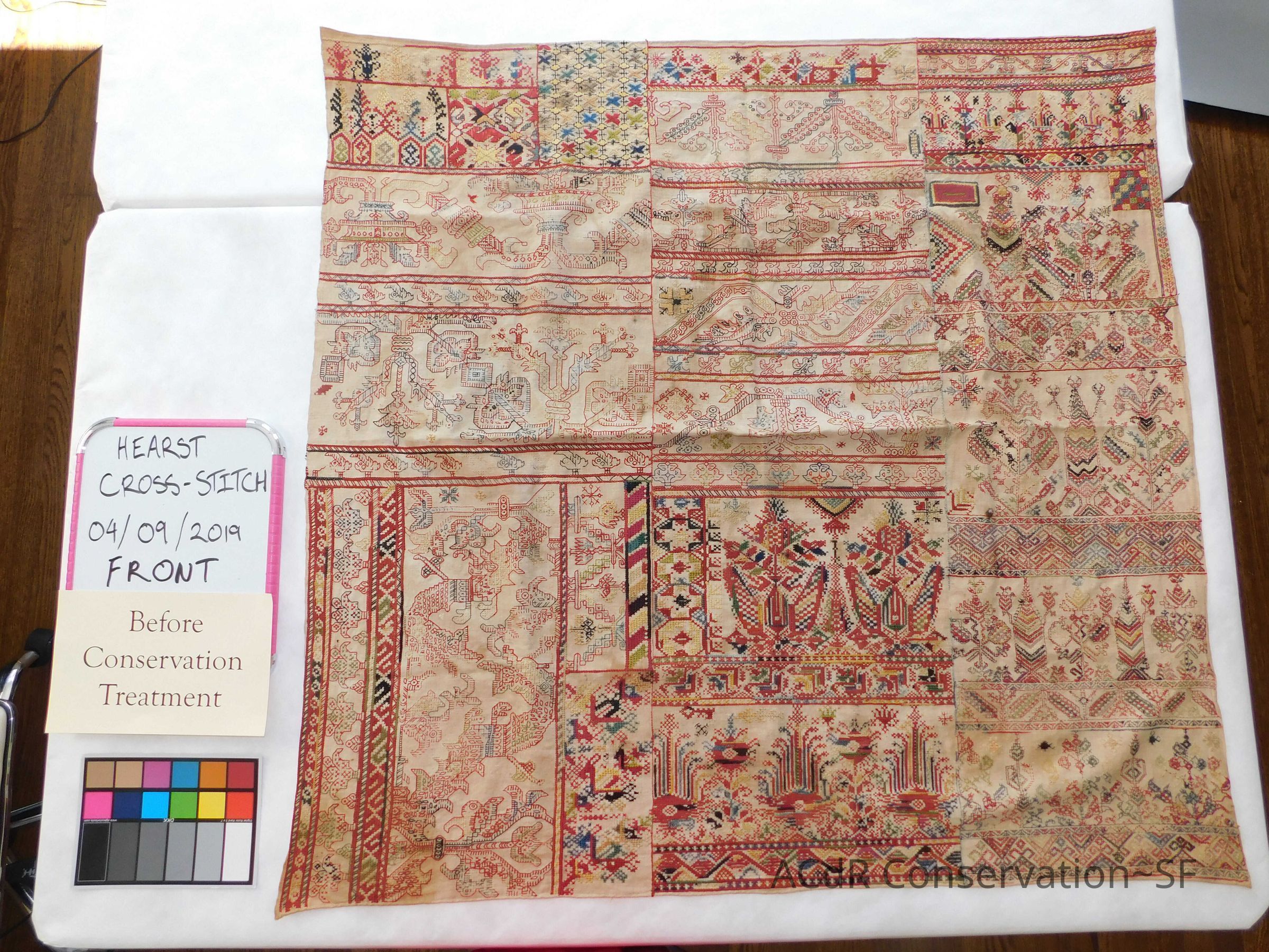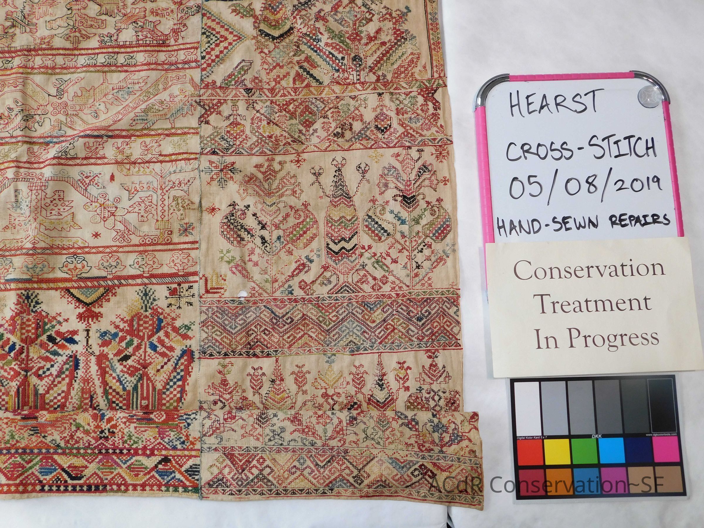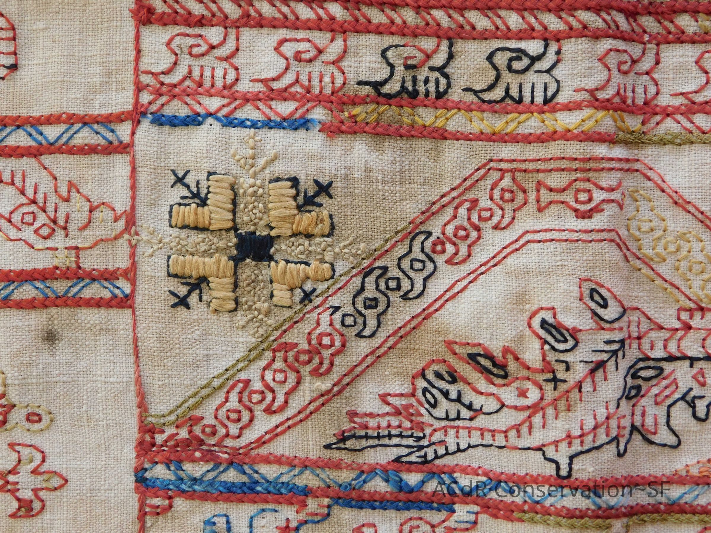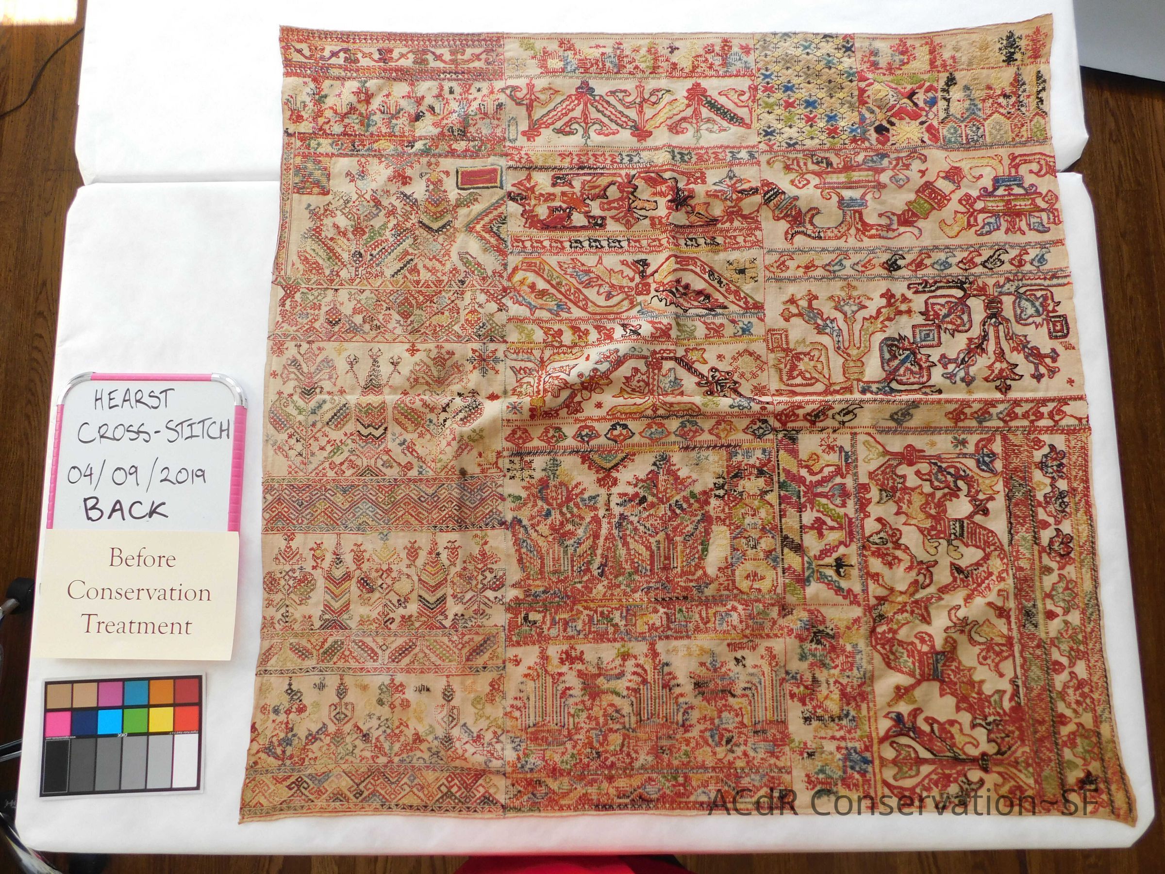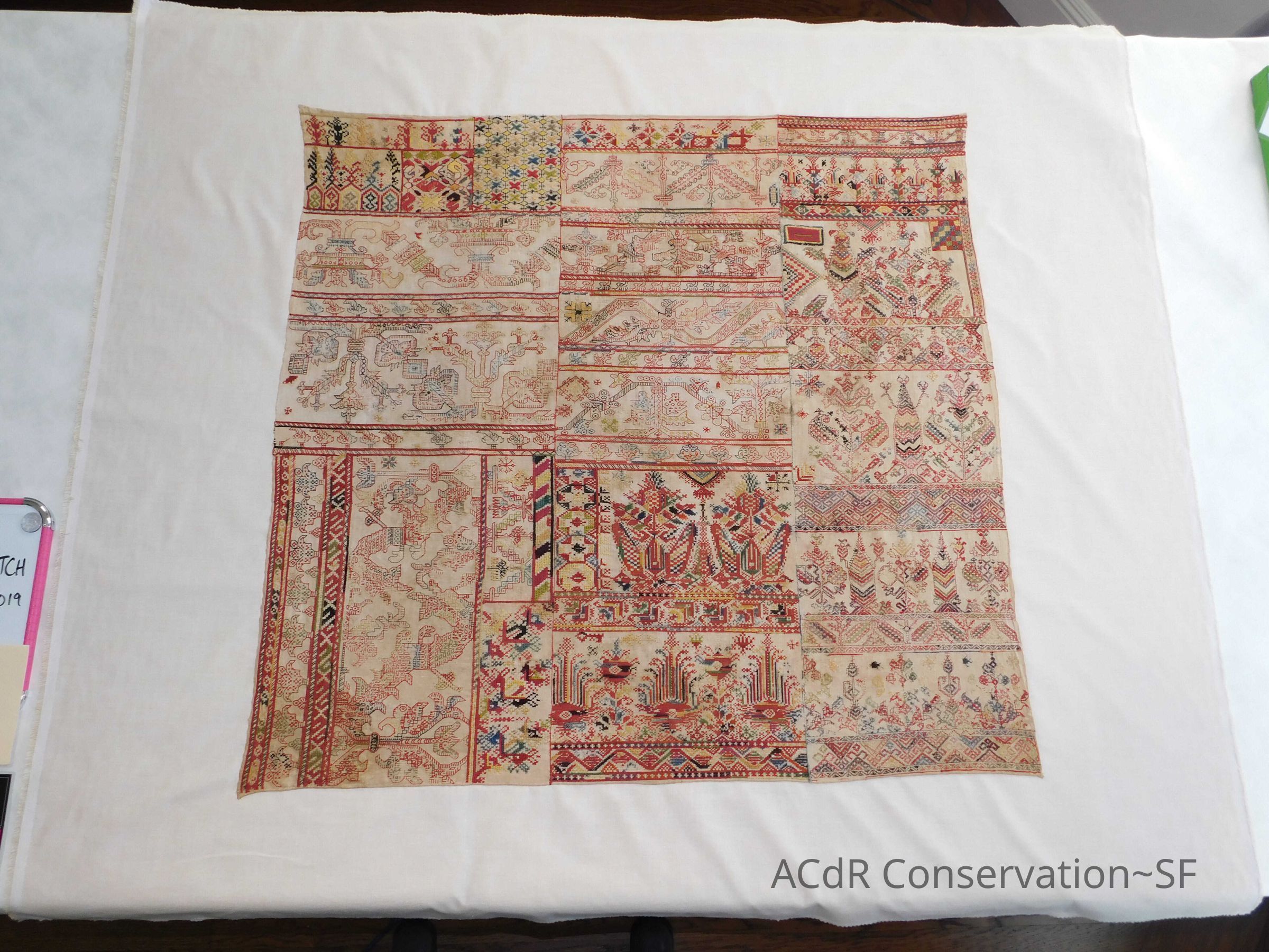 Staining throughout, some darker like splatters that have formed holes. Some stitching has broken and disintegrated due to either sun damage or abrasion. Colors faded. Wax and other encrustations attached to threads.