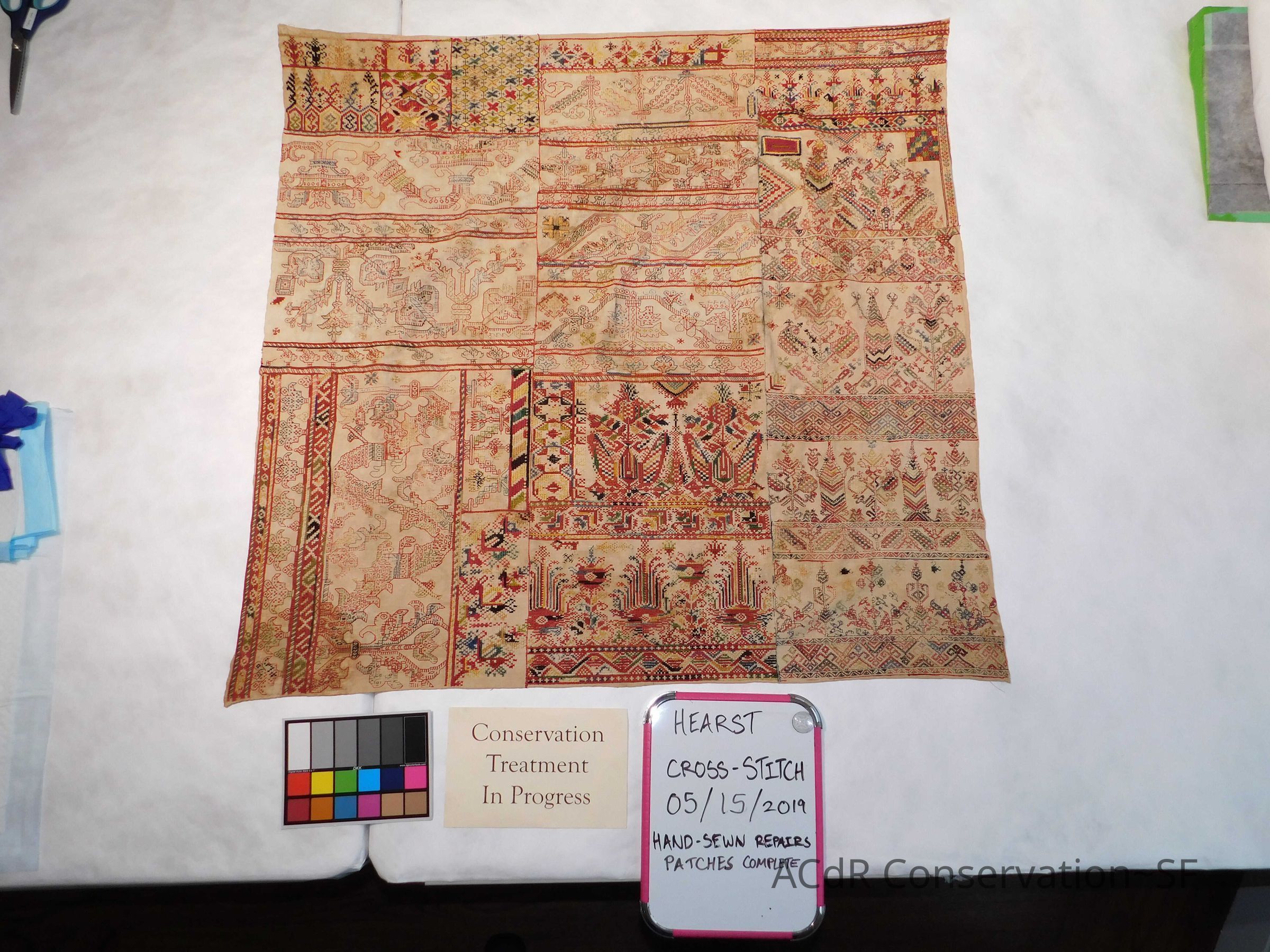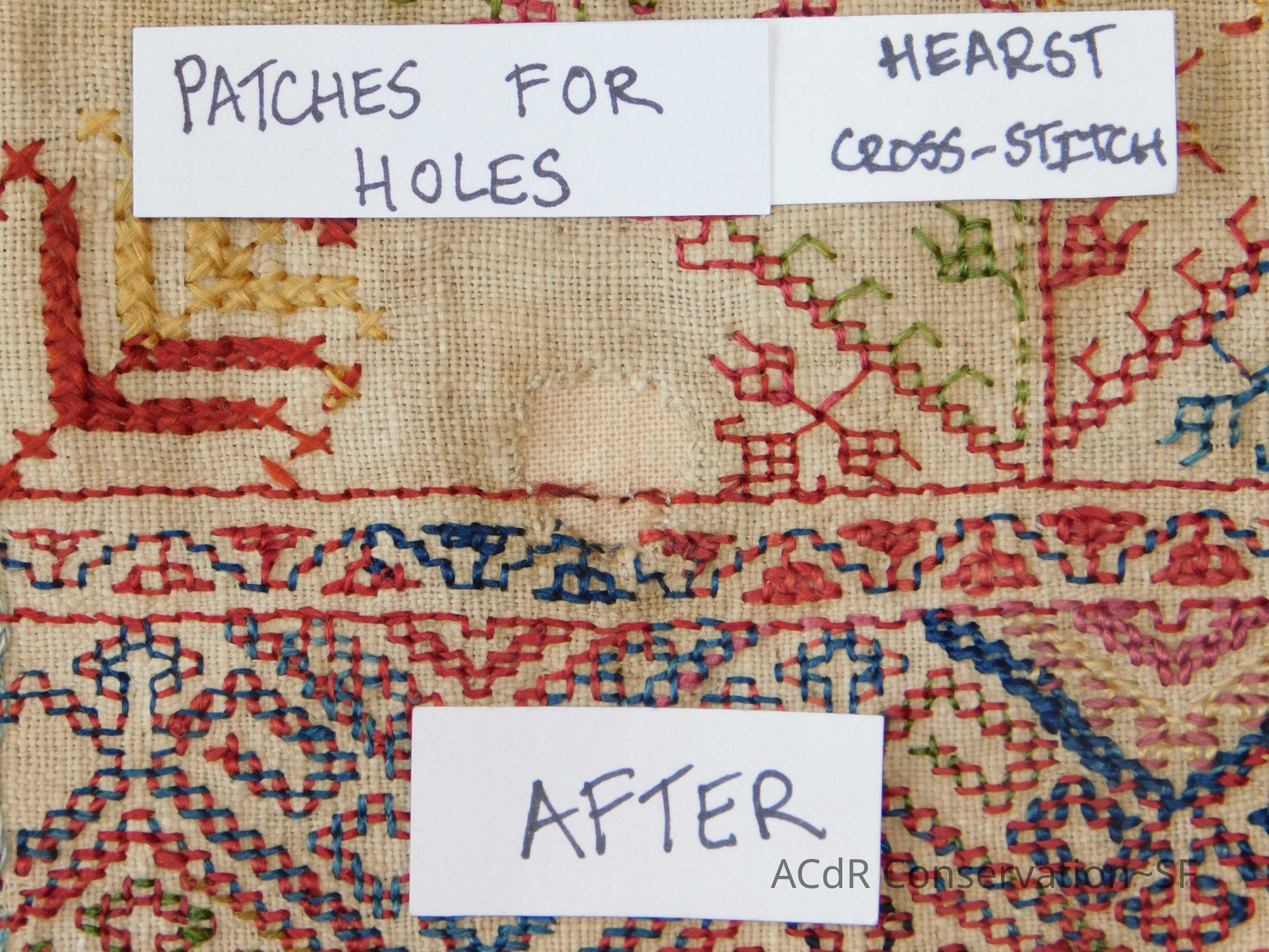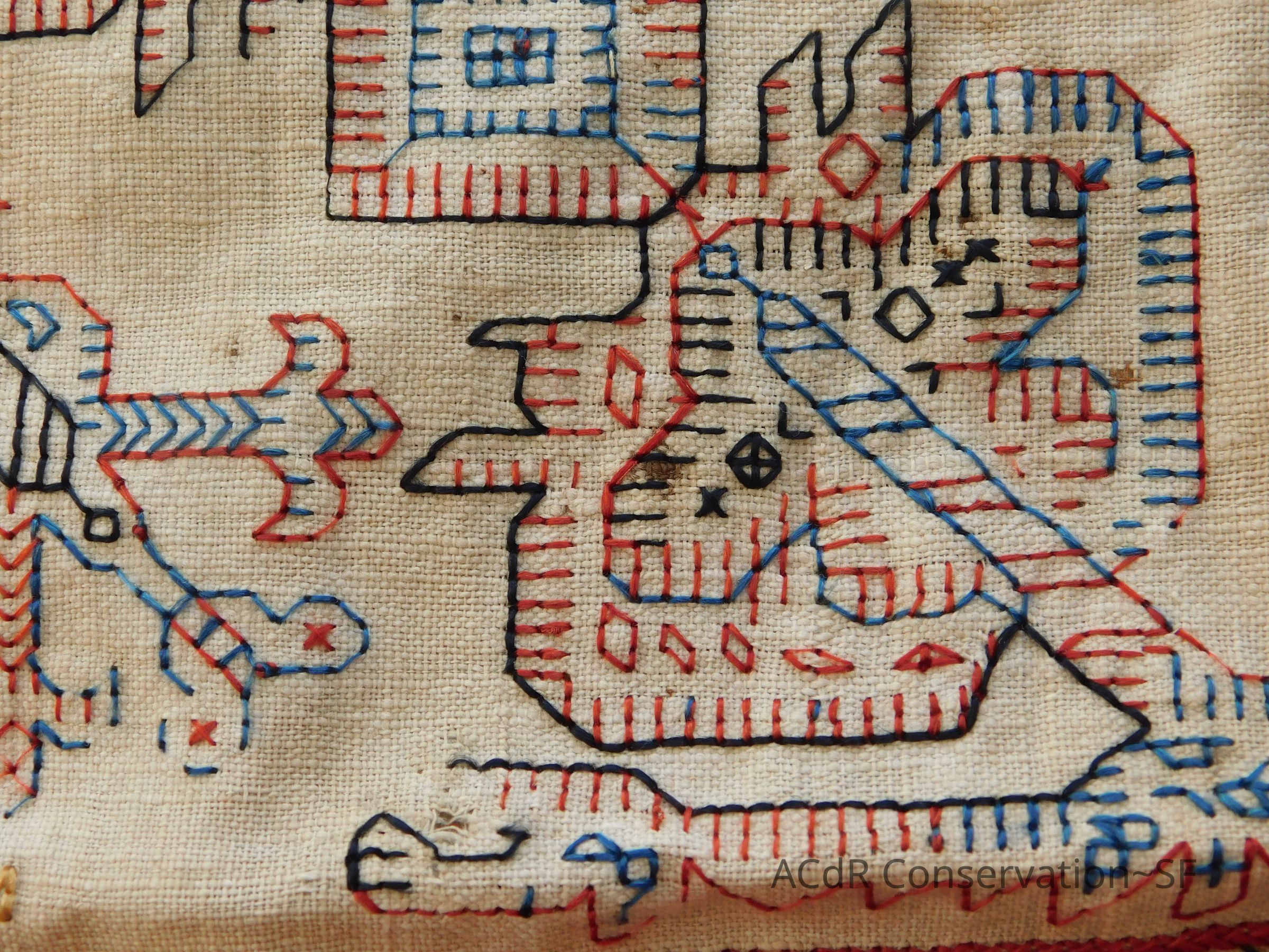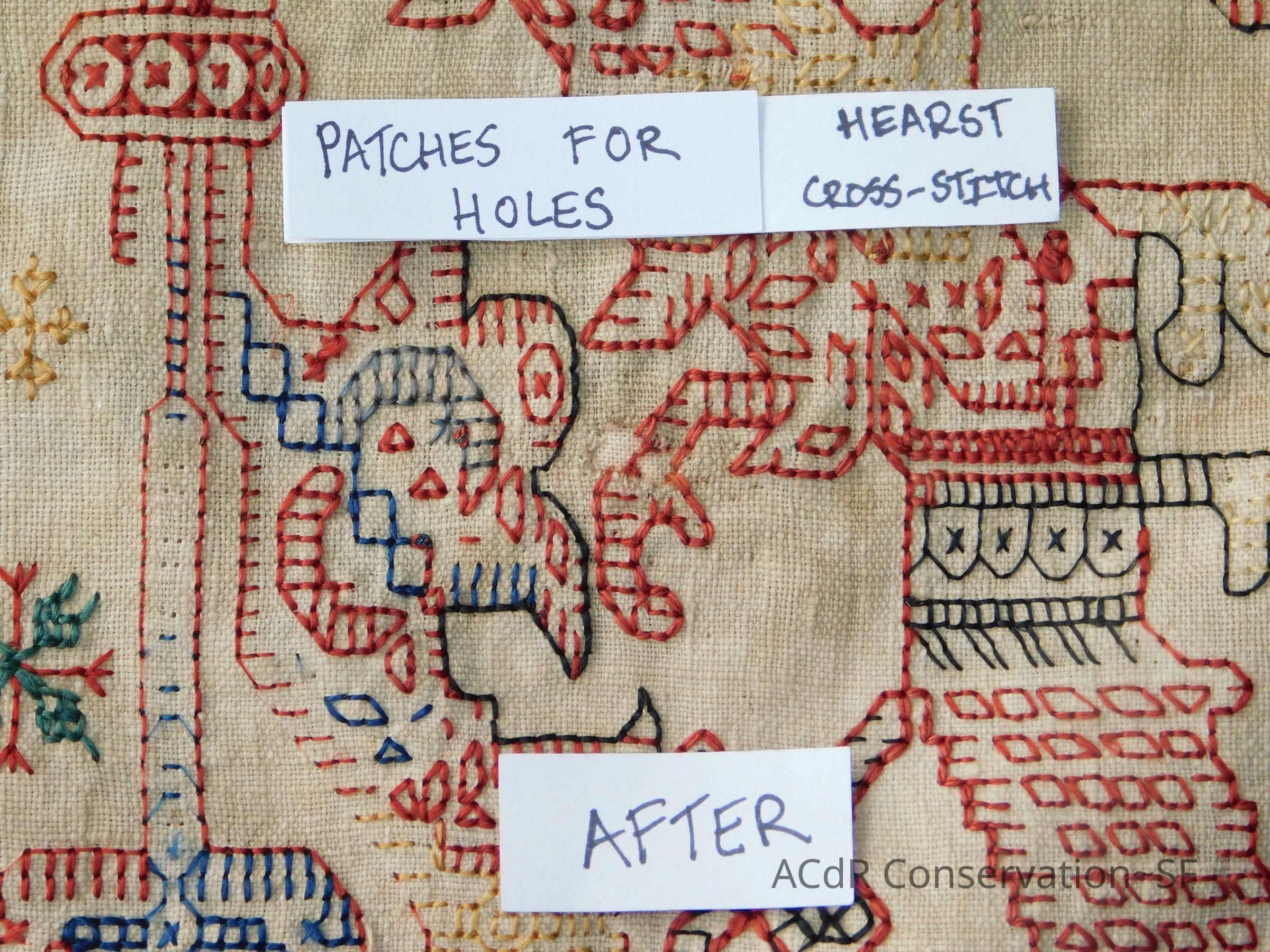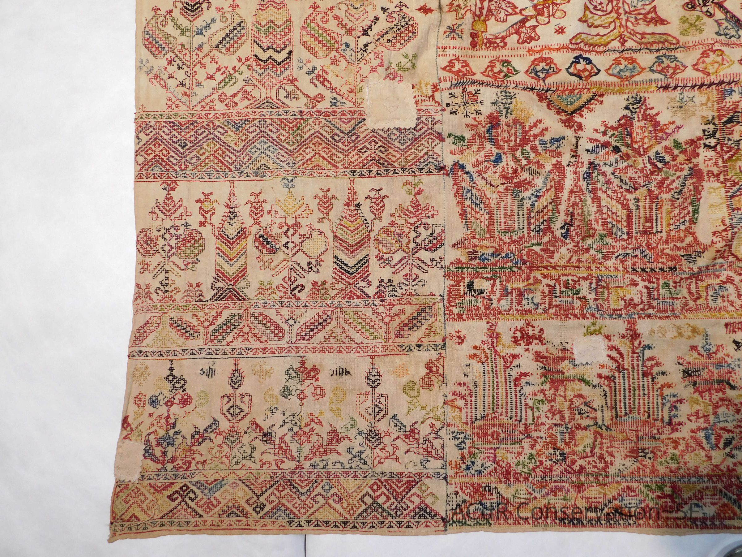 Staining throughout, some darker like splatters that have formed holes. Some stitching has broken and disintegrated due to either sun damage or abrasion. Colors faded. Wax and other encrustations attached to threads.