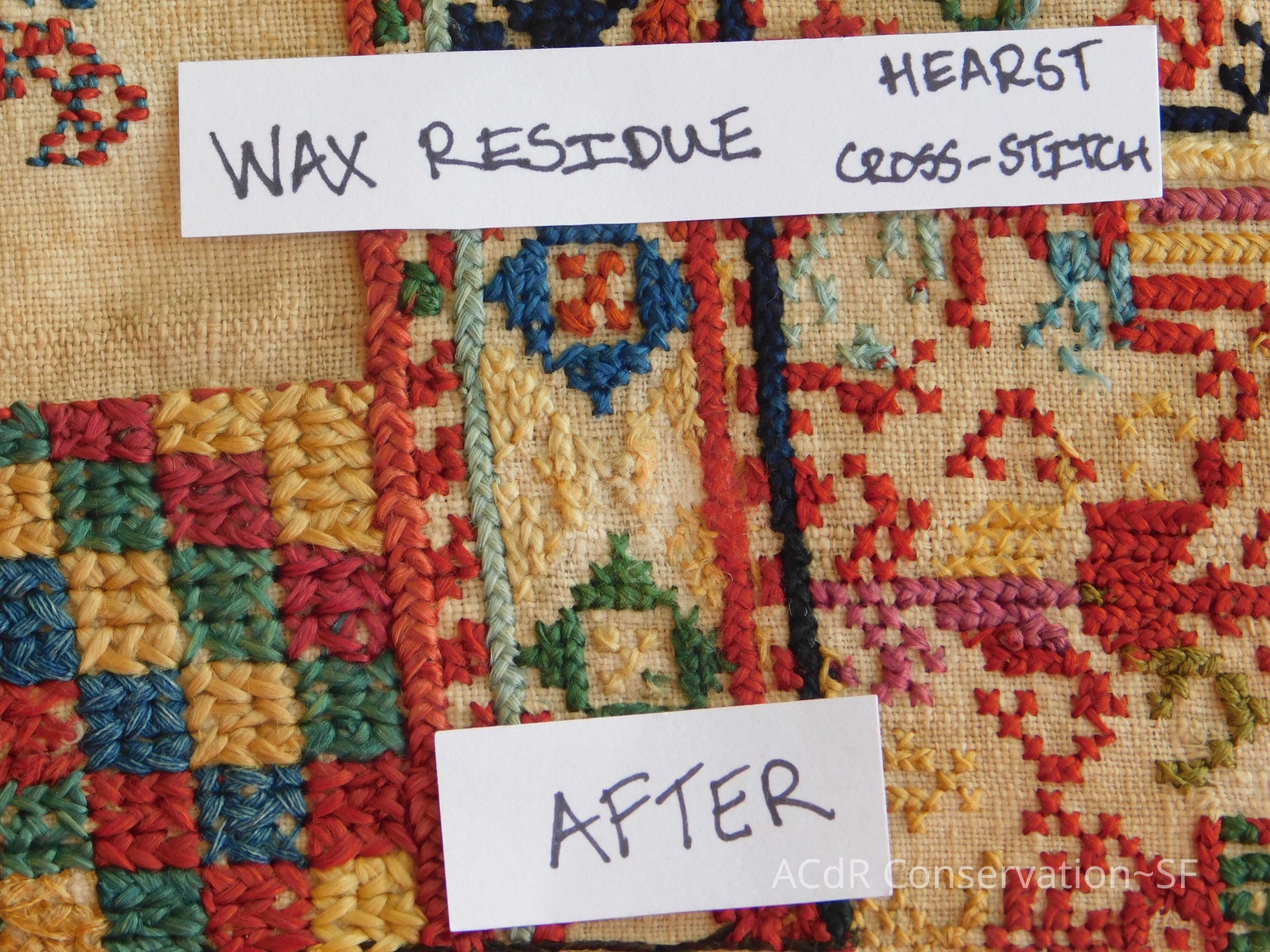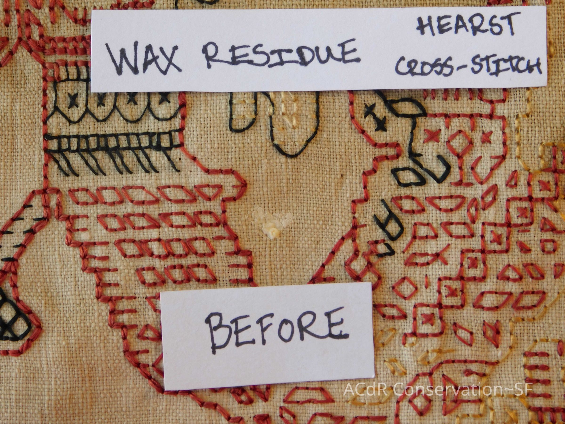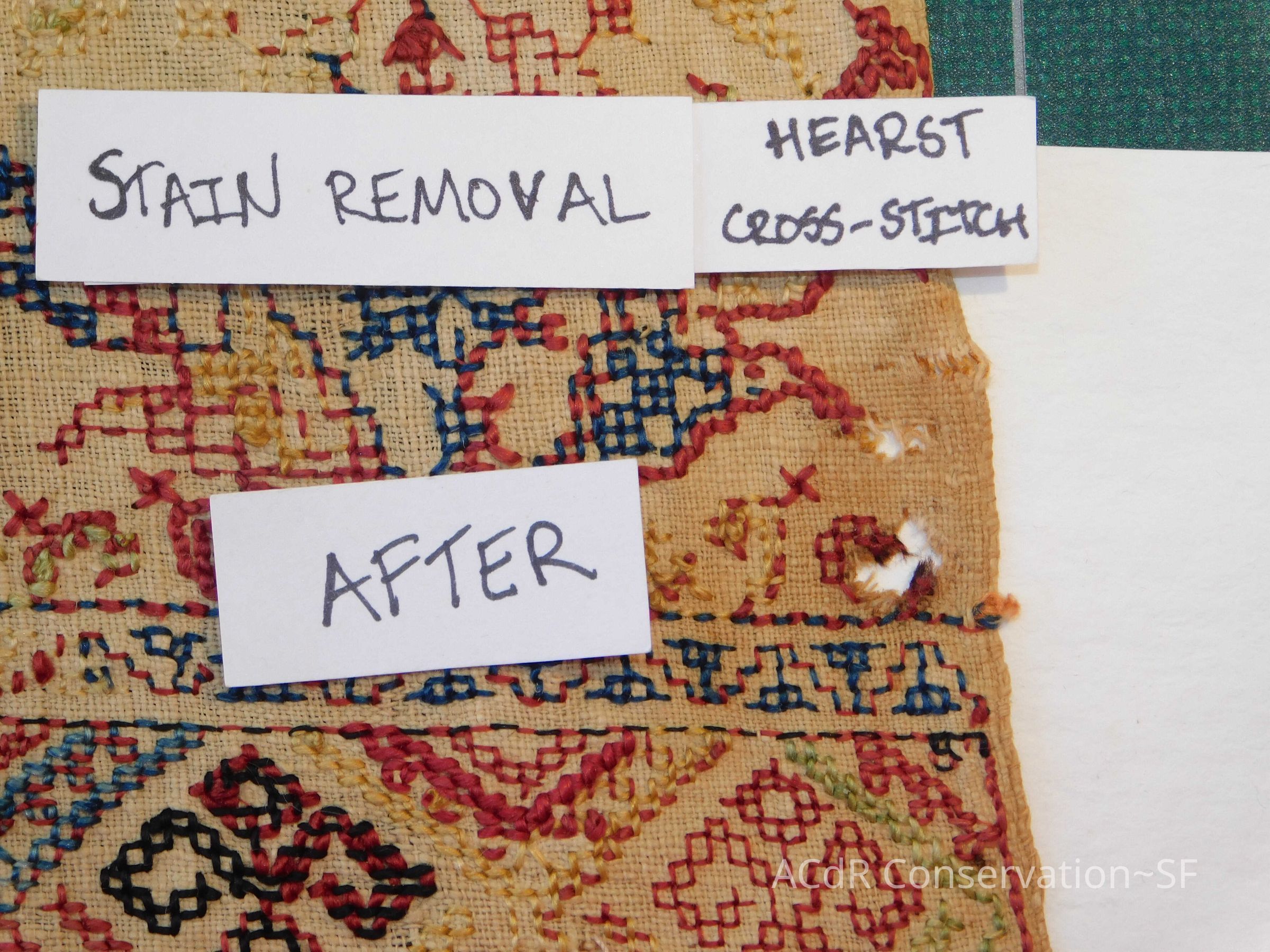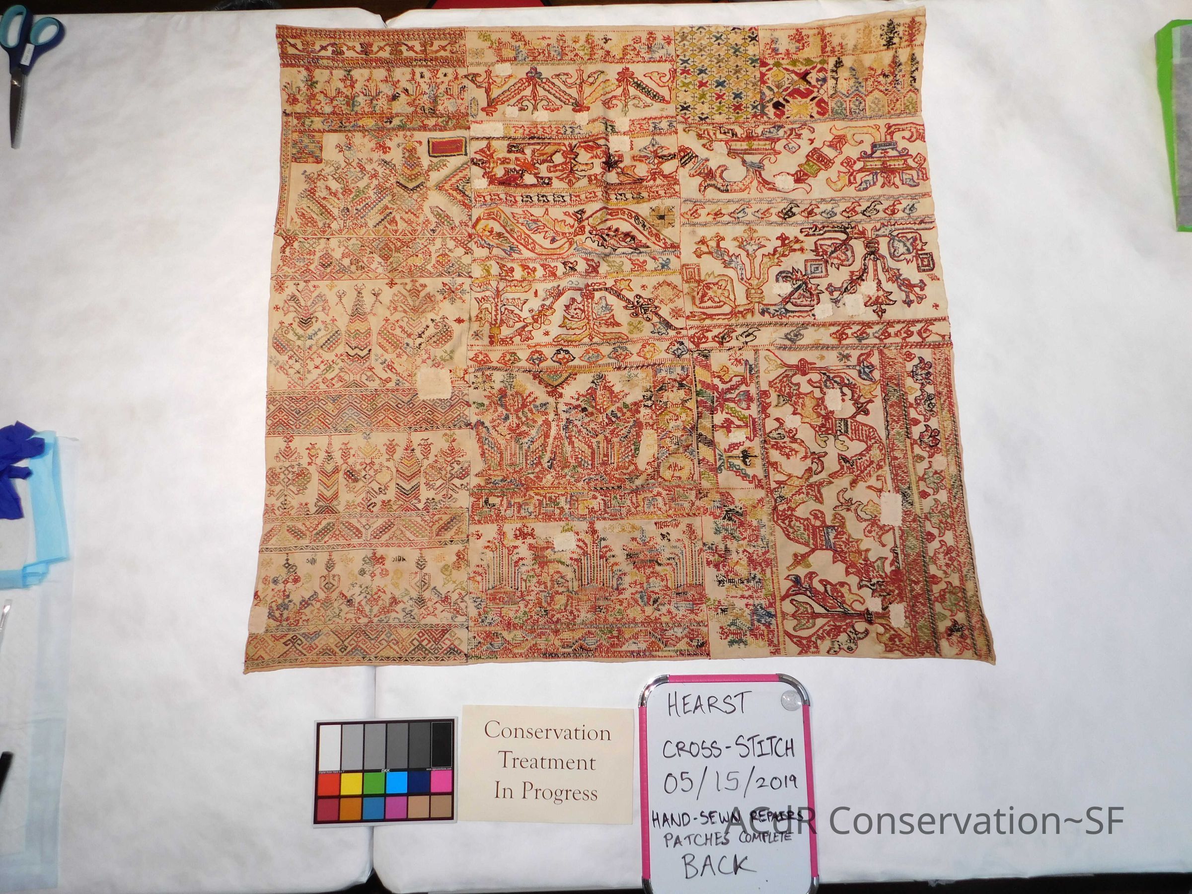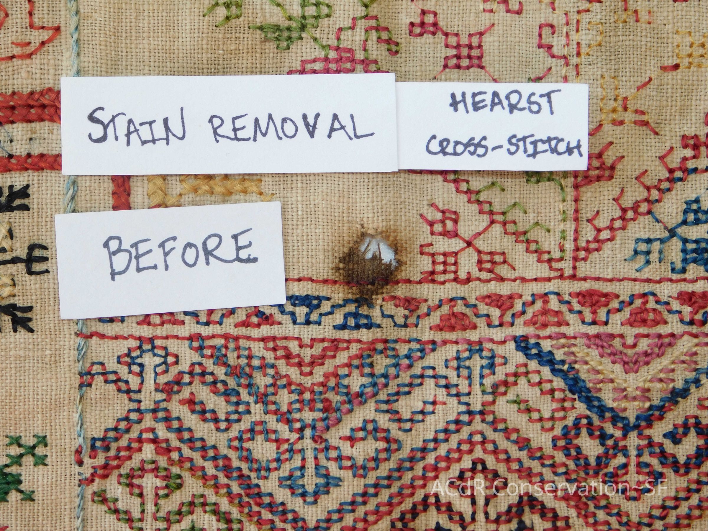 Staining throughout, some darker like splatters that have formed holes. Some stitching has broken and disintegrated due to either sun damage or abrasion. Colors faded. Wax and other encrustations attached to threads.